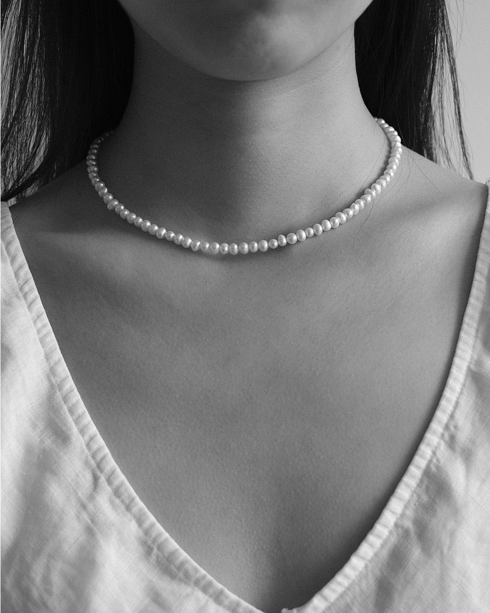 クラシックな小ぶりサイズのハンドメイド淡水パールネックレスです。