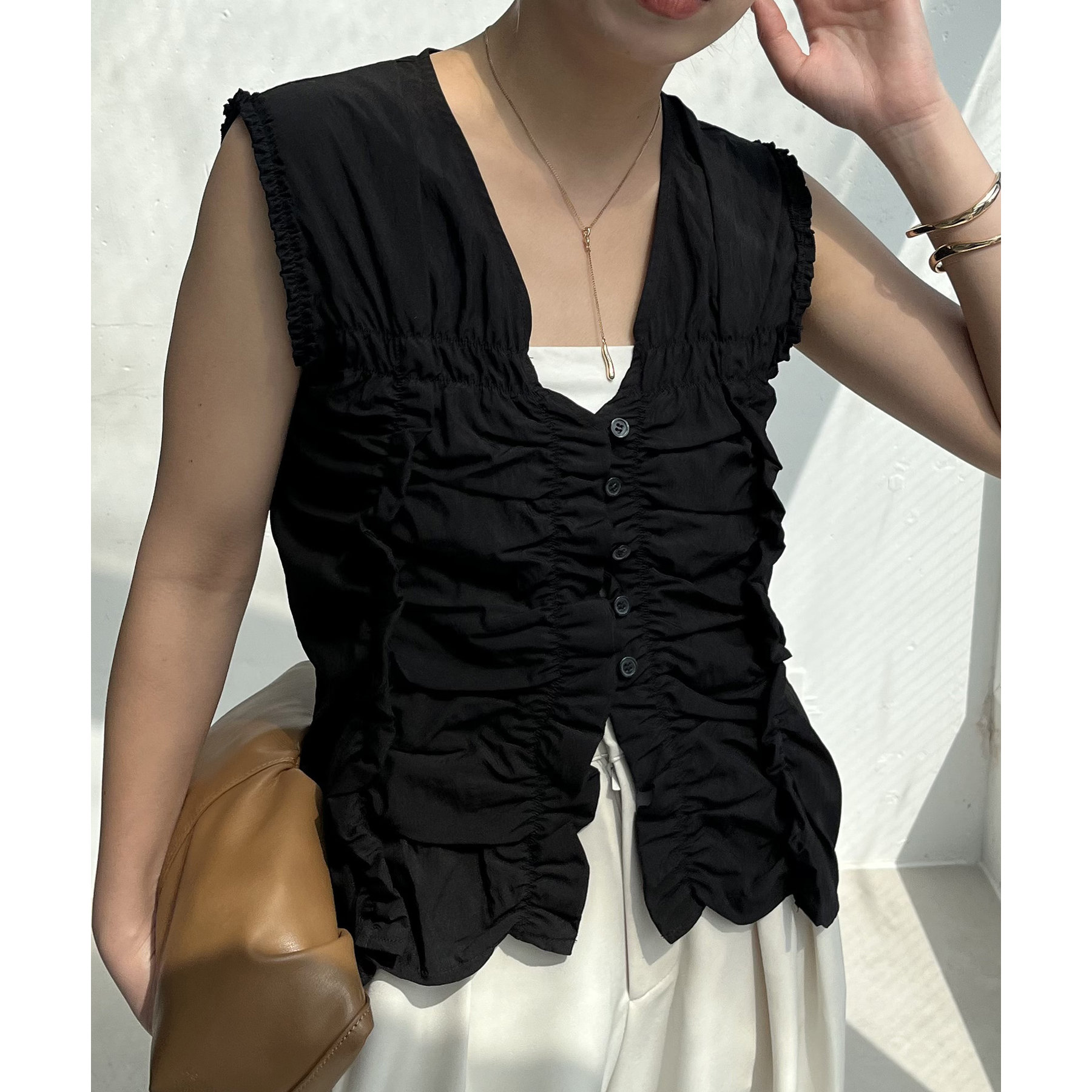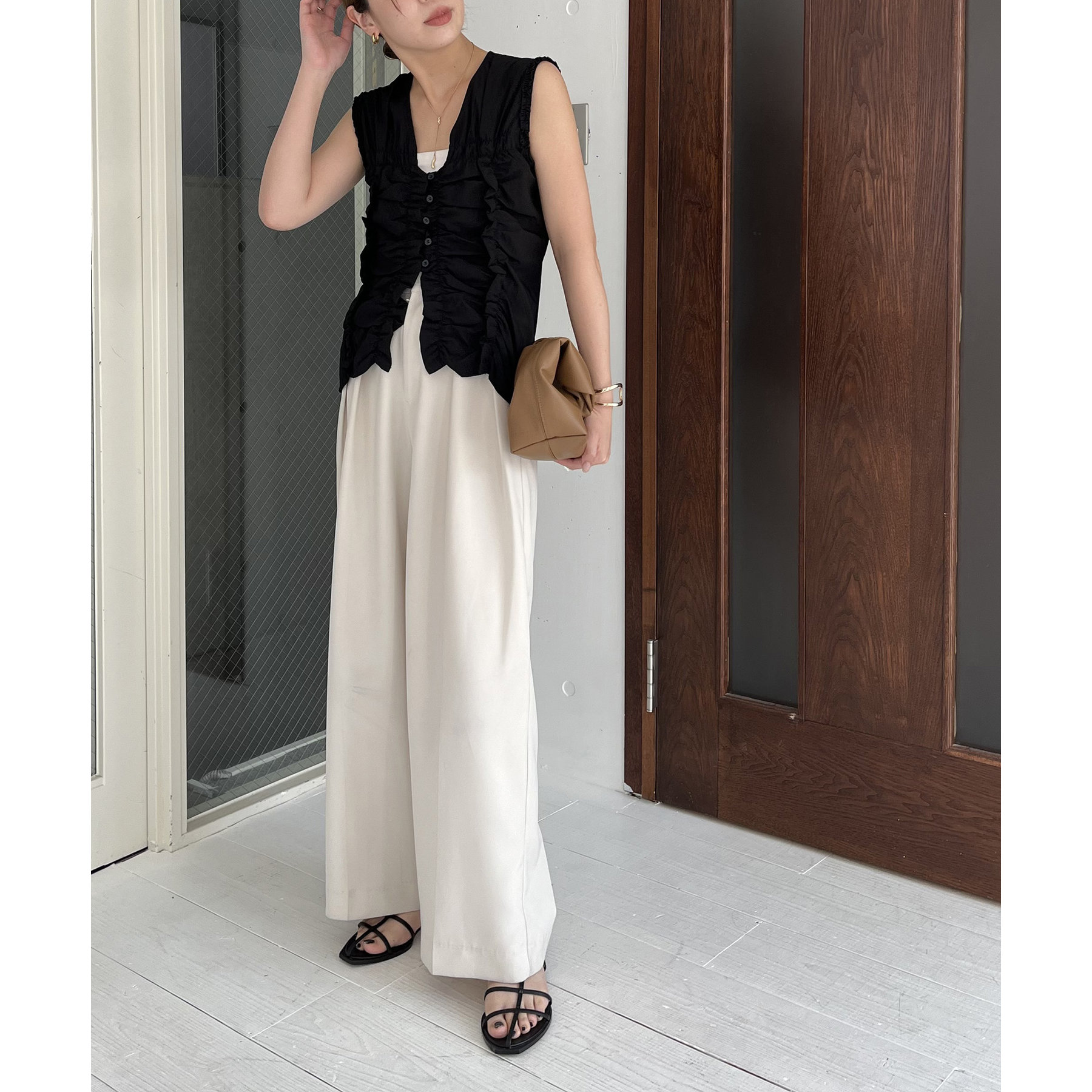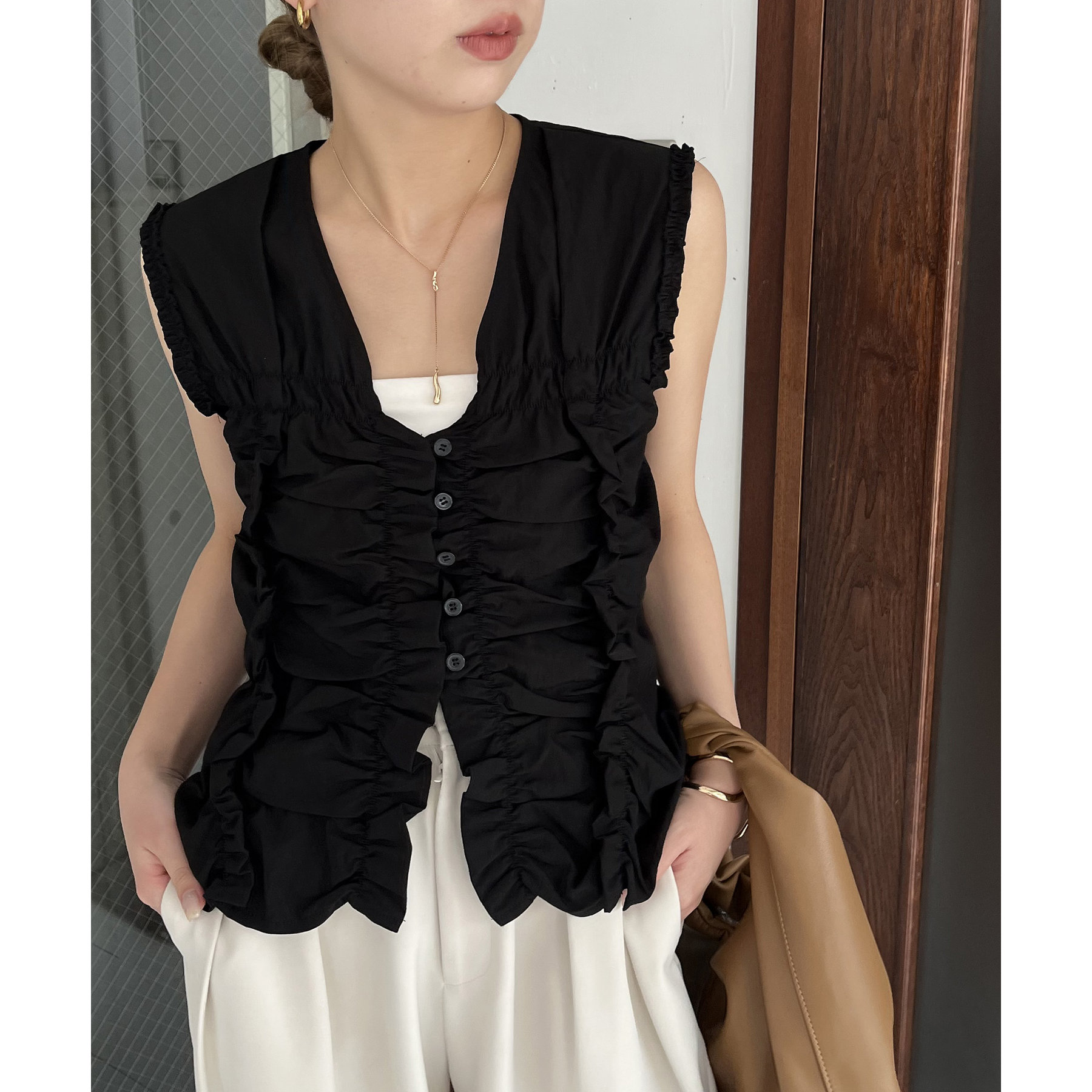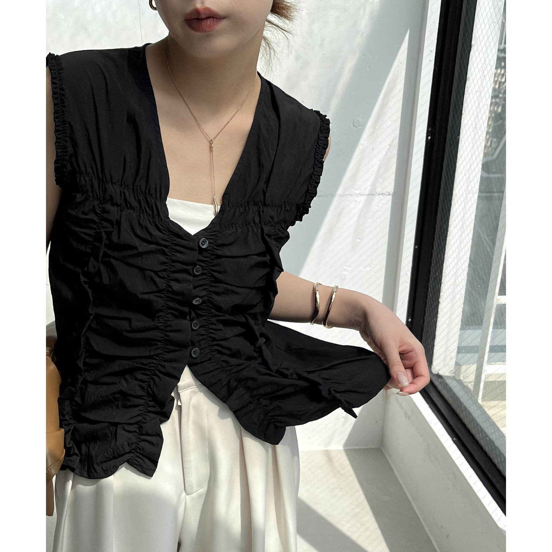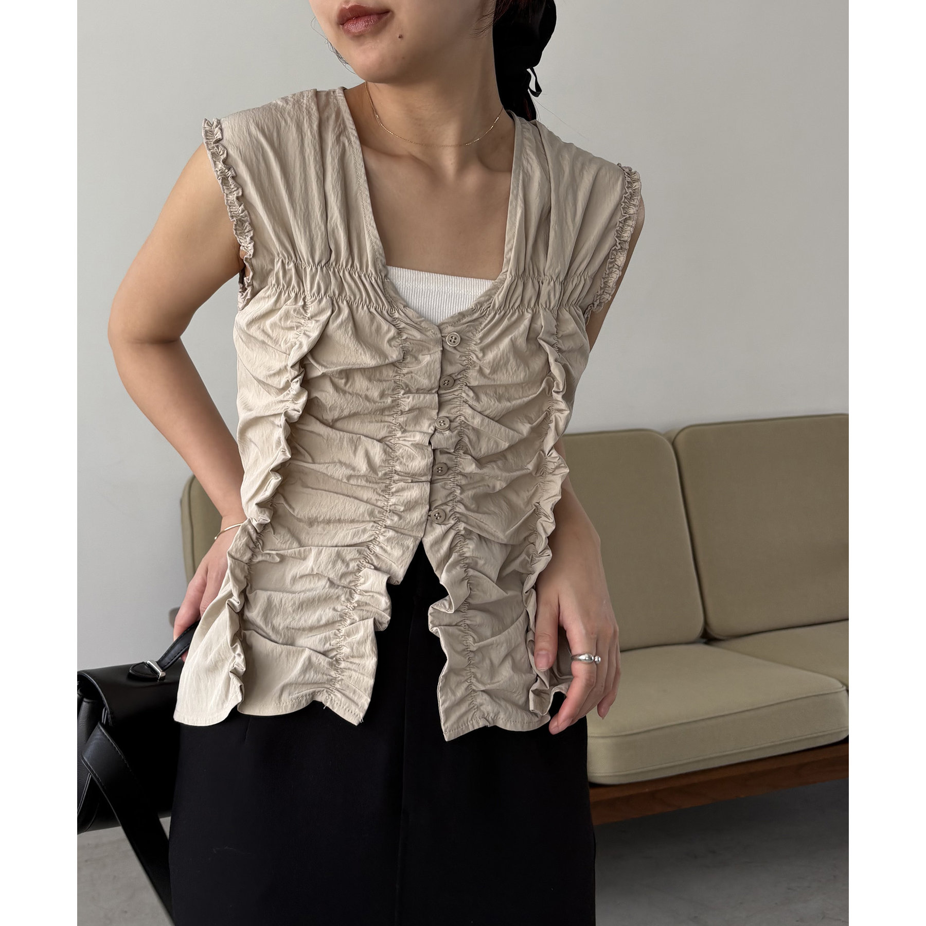 前面にたっぷりと入ったギャザーデザインがこなれ感をプラス
