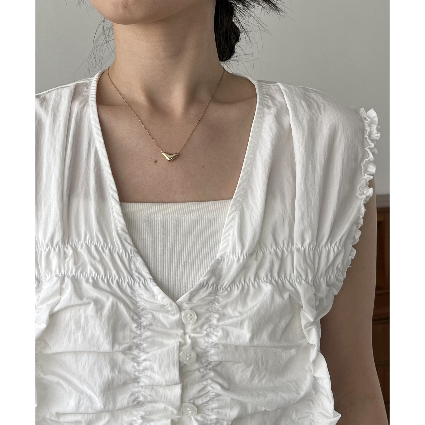 ・深めのVネックで顔周りはすっきりとした印象に