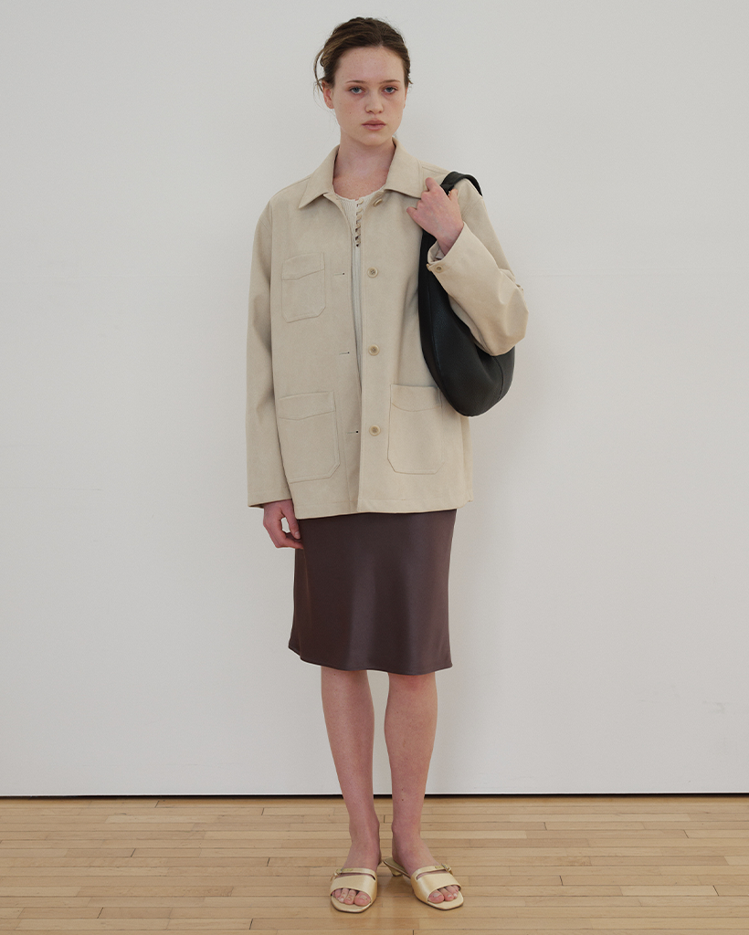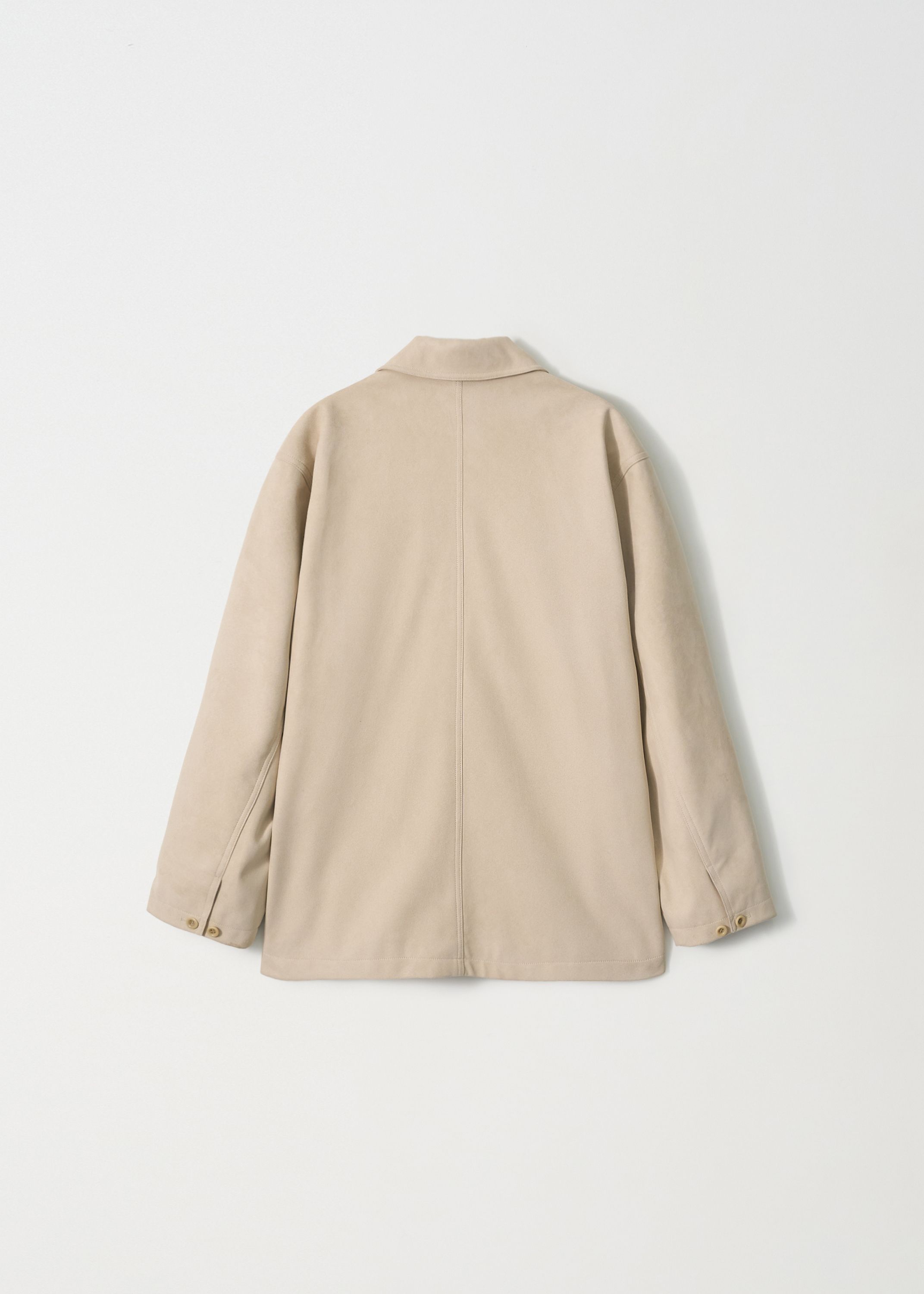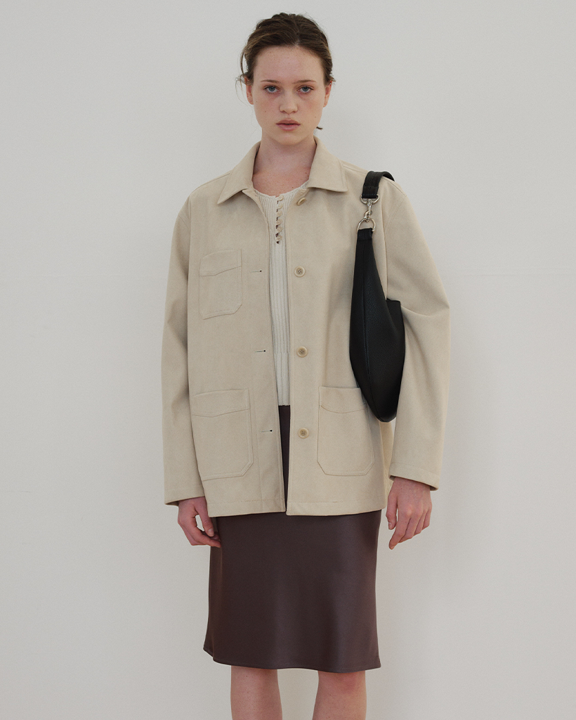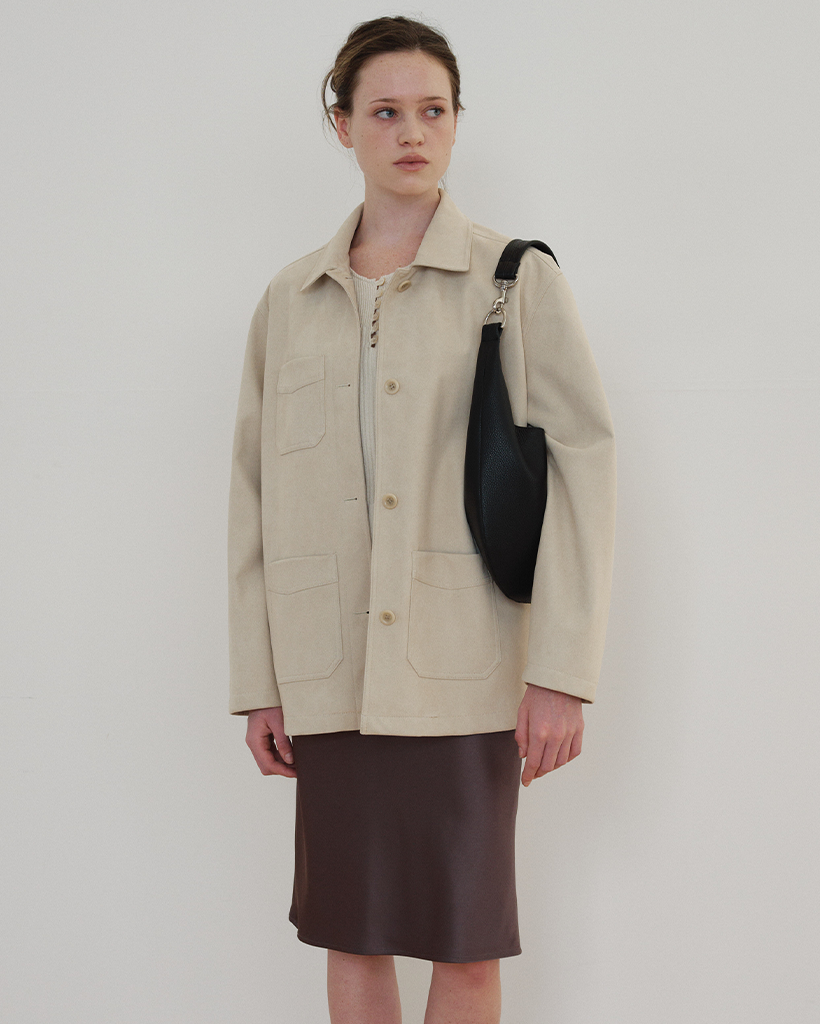 しっかりとした組織感とほのかな光沢が際立つ、日本産スエード素材で仕立てたユーティリティジャケットです。上品なテクスチャーと柔らかなタッチが調和し、季節の変わり目に単体アウターとして着やすい程よい厚みです。