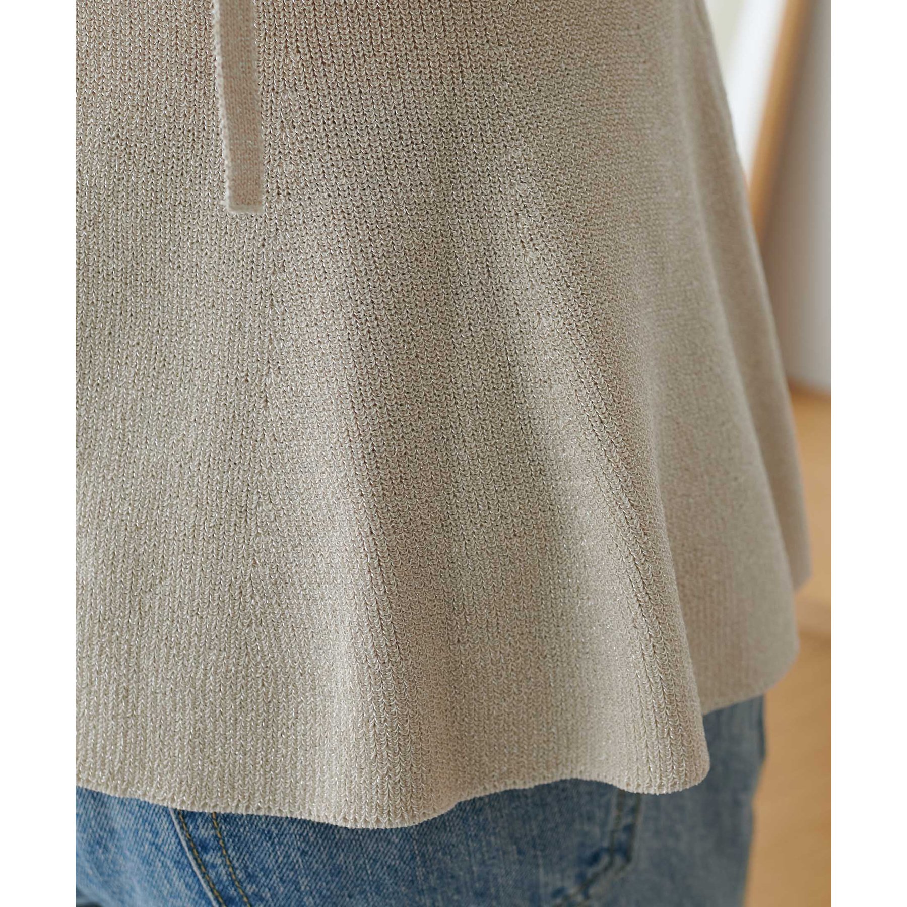 ・159cmスタッフ(Fサイズ着用):気になる腰回りを隠せるのも嬉しいポイントです。程よくラメが施されているのでトレンド感もあります♪