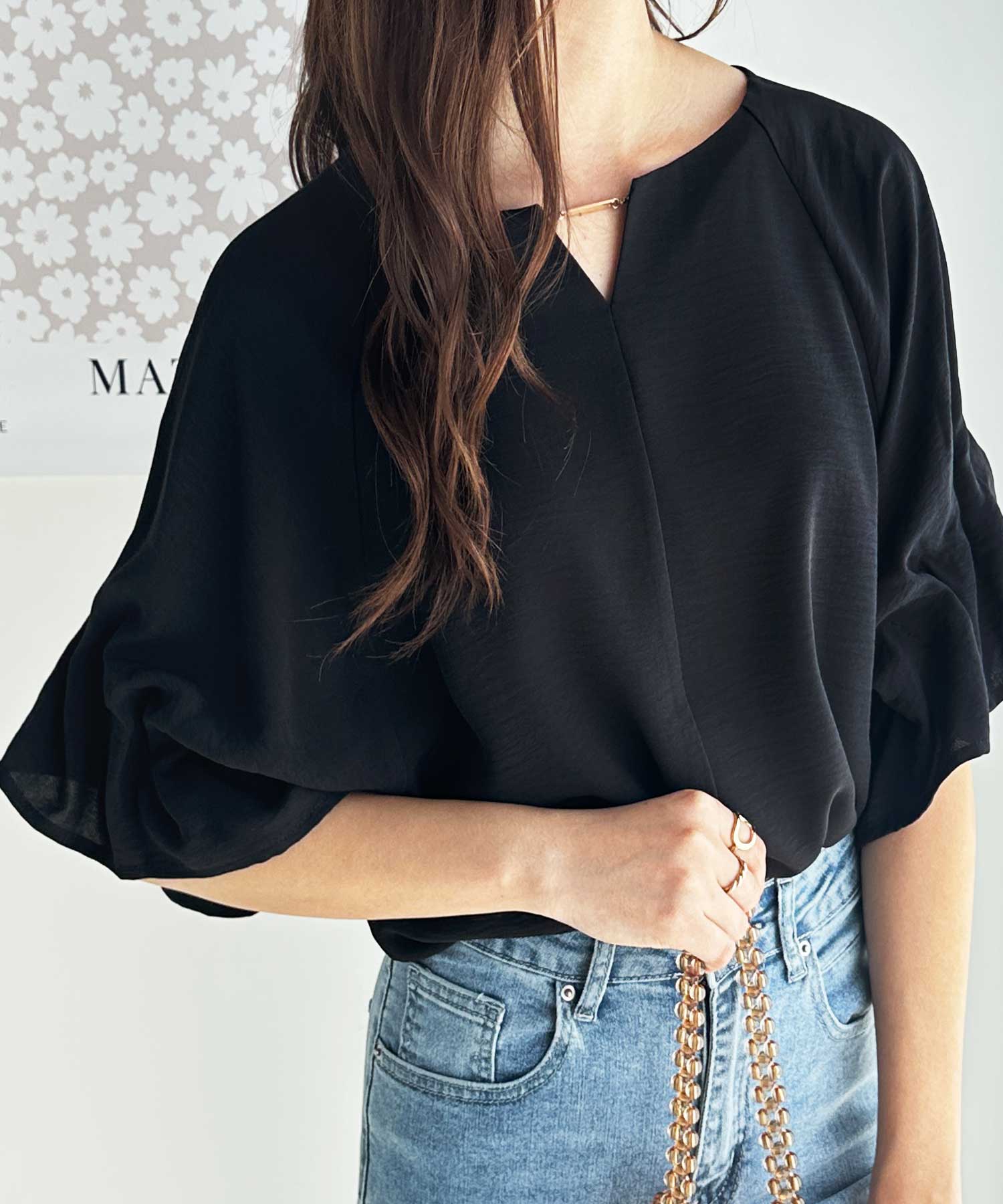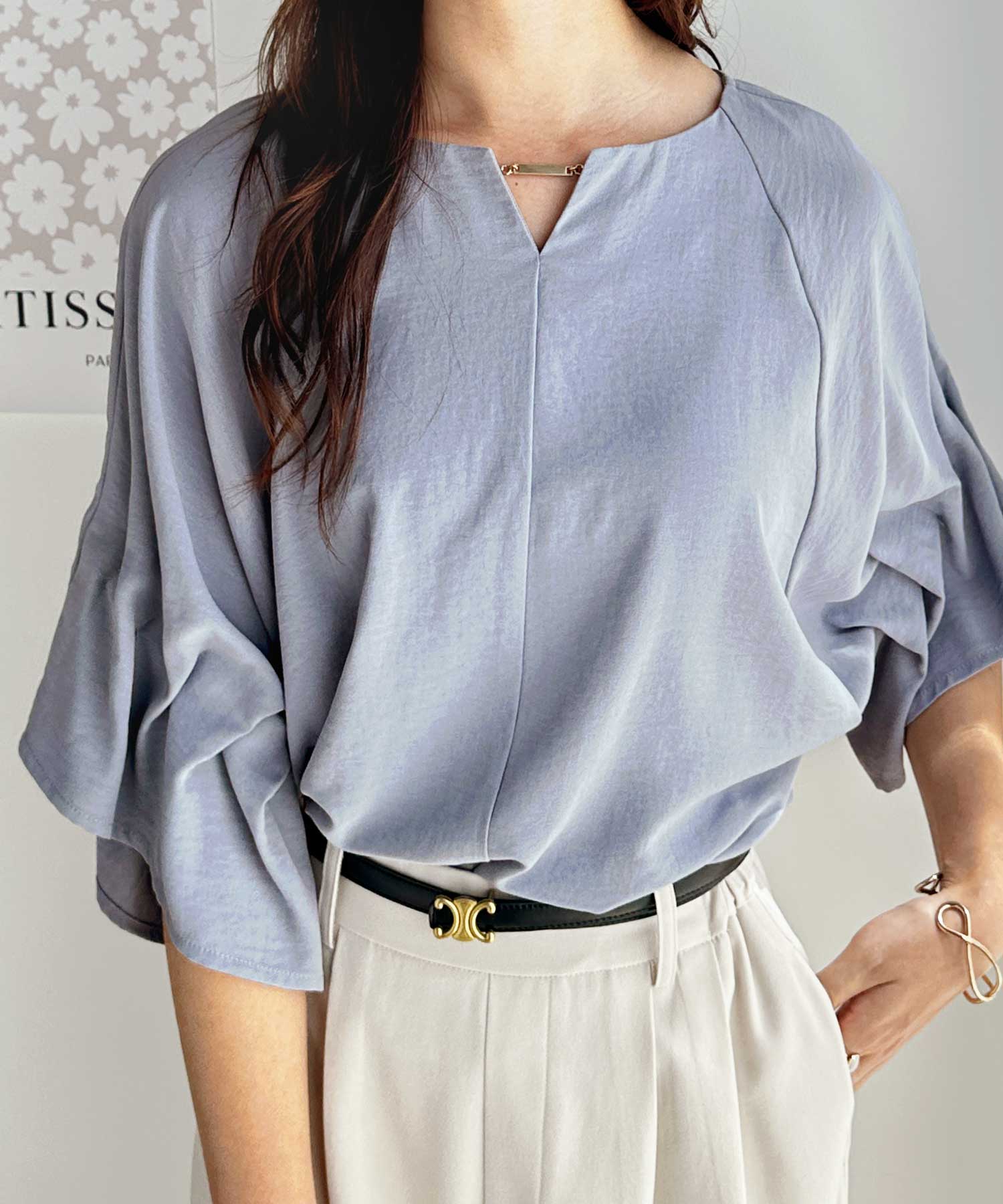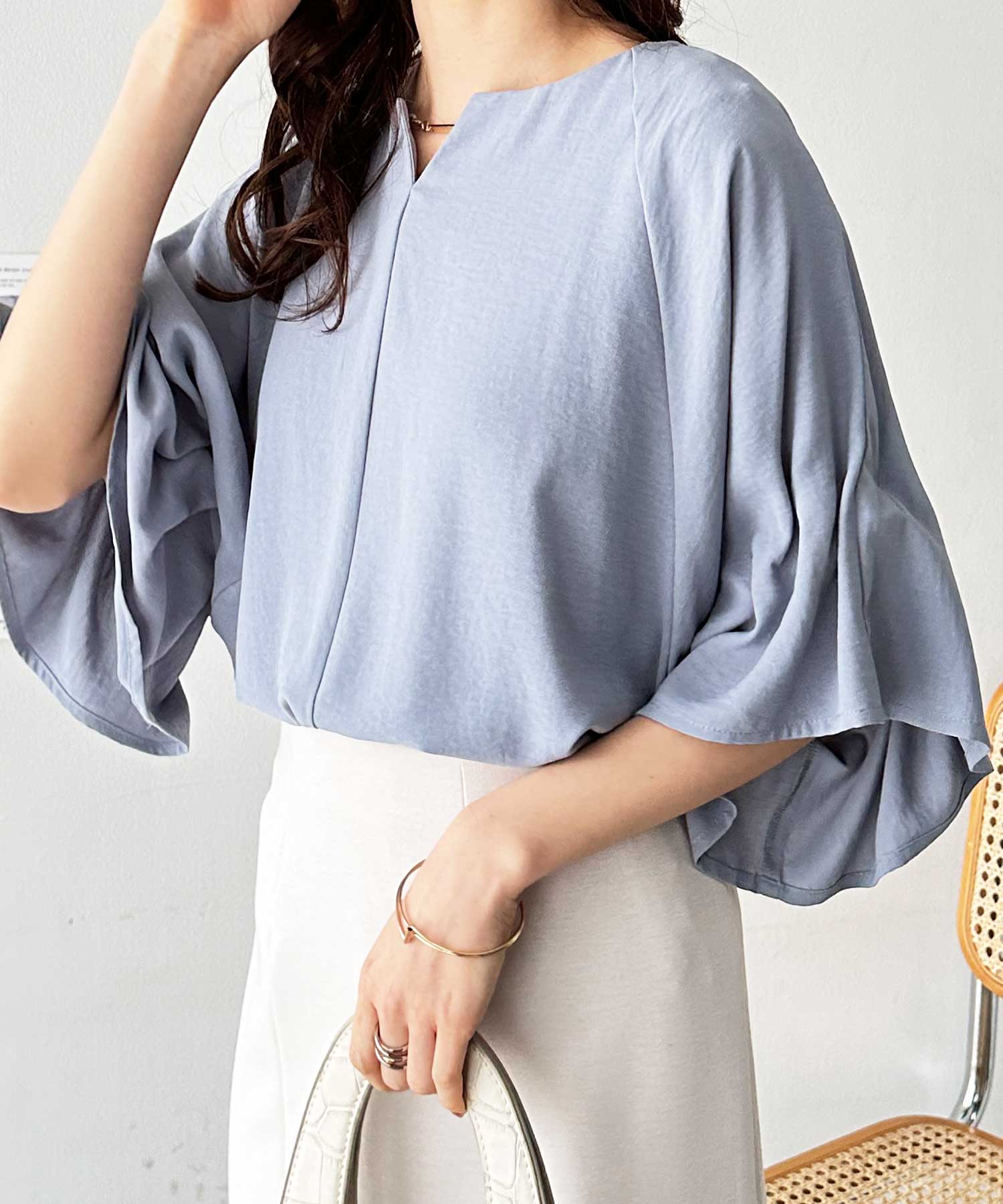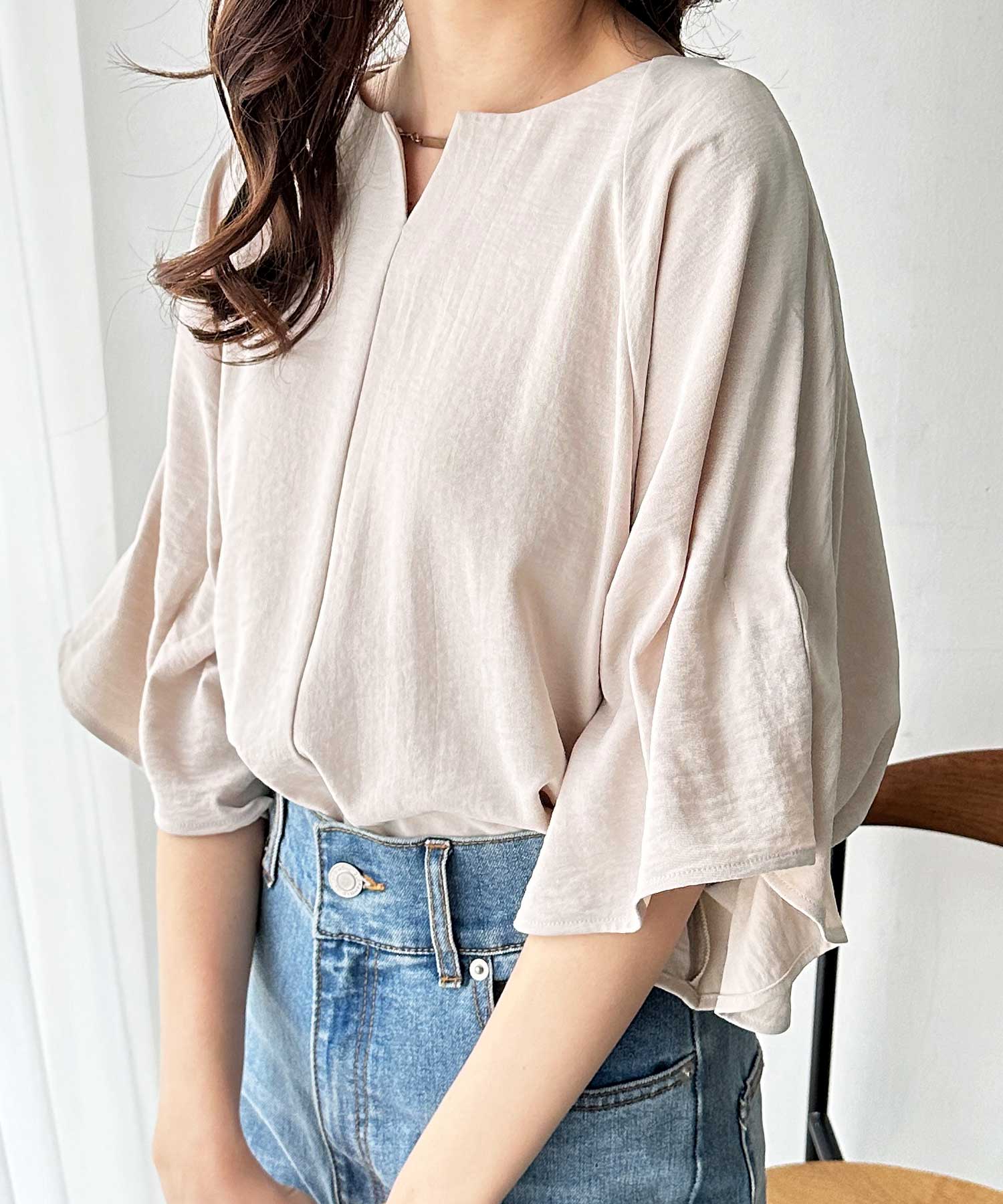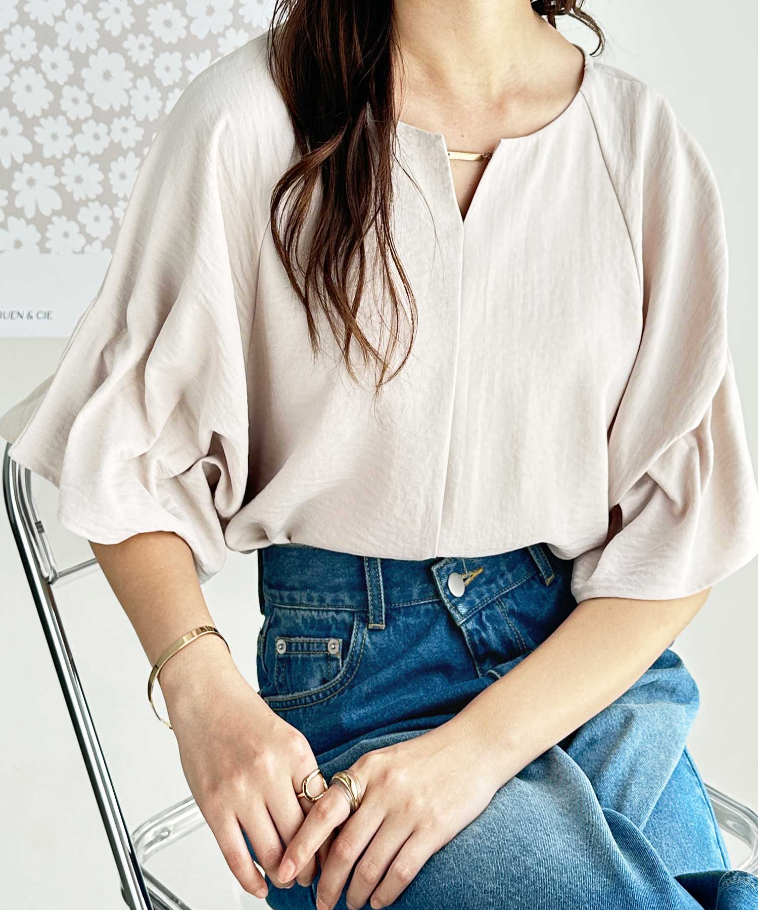 3WAYゴールドプレート袖ボリュームタックドルマンブラウス