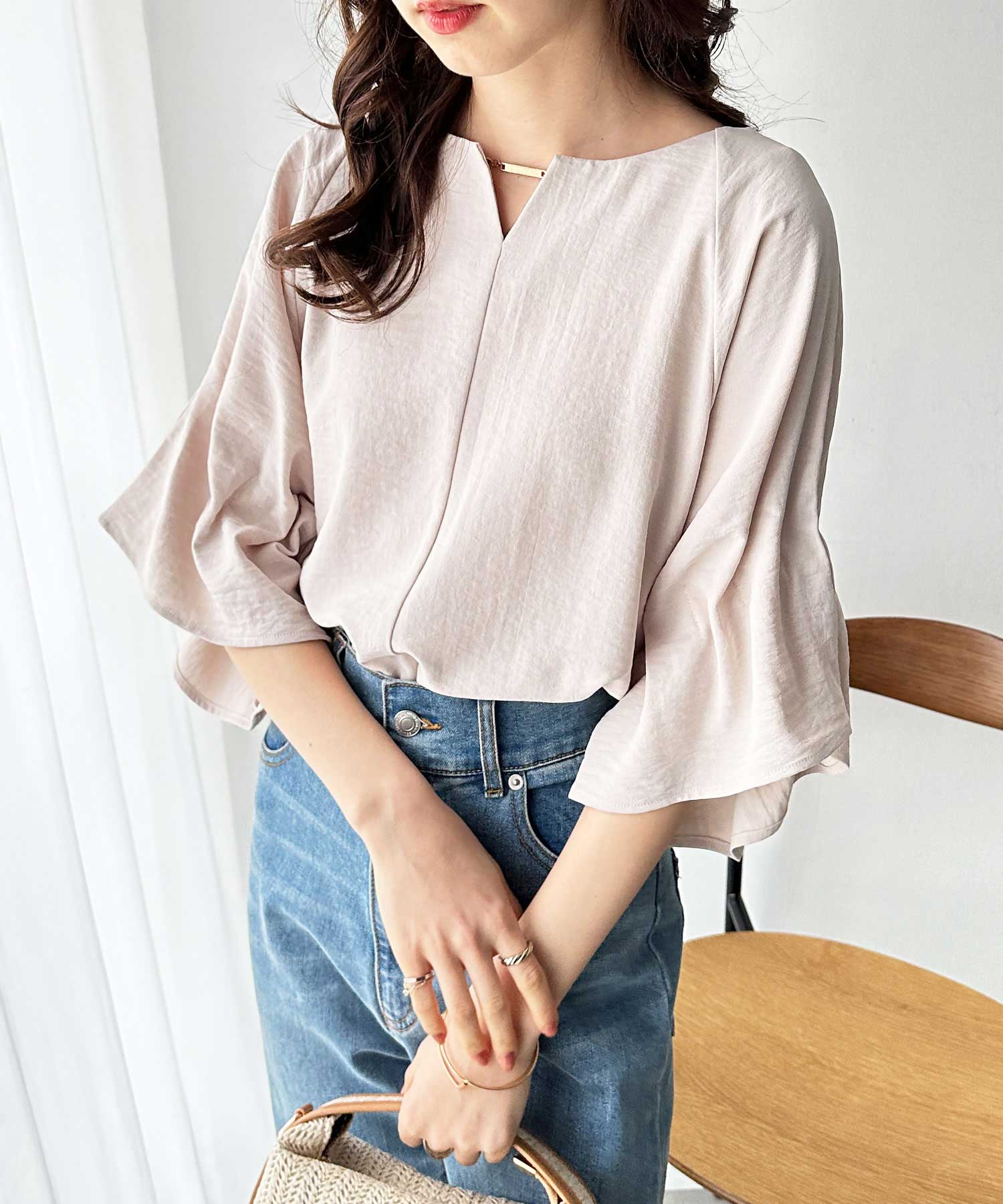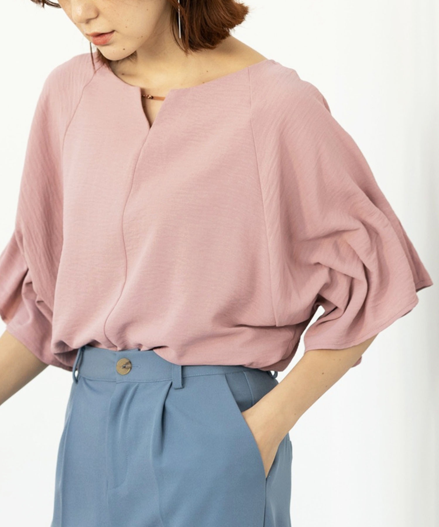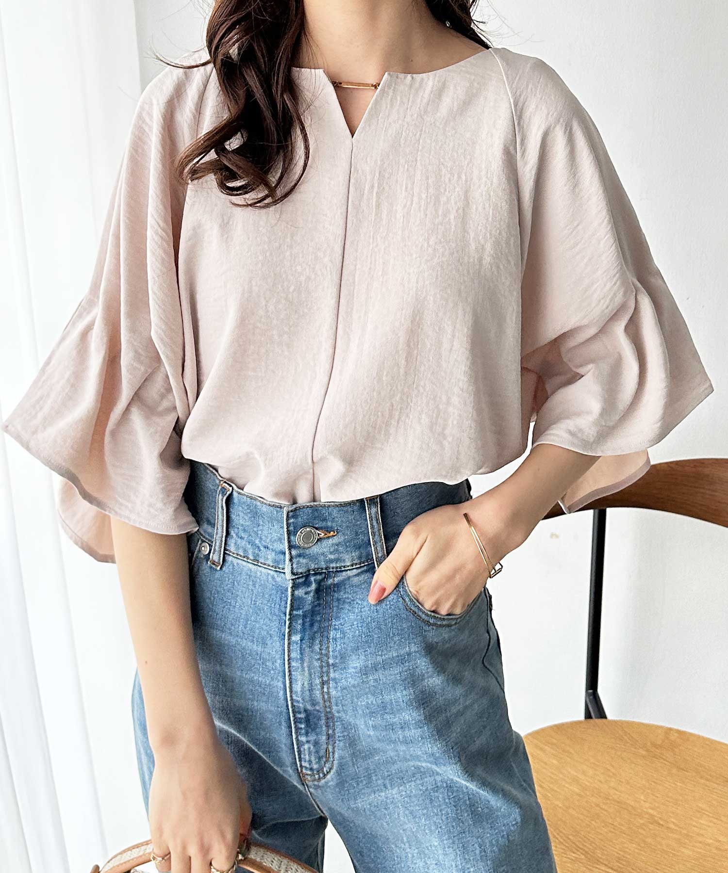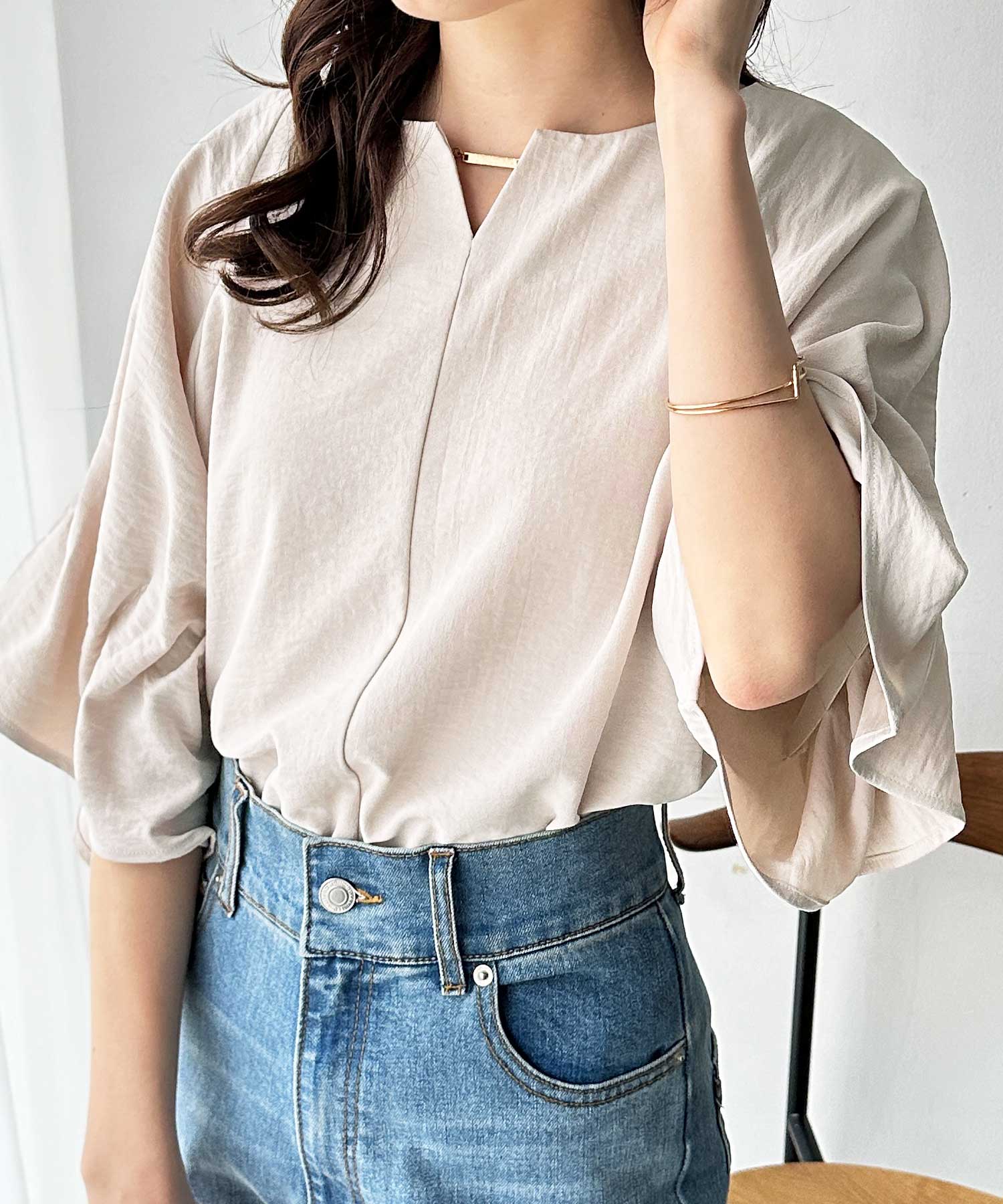 3WAYゴールドプレート袖ボリュームタックドルマンブラウス