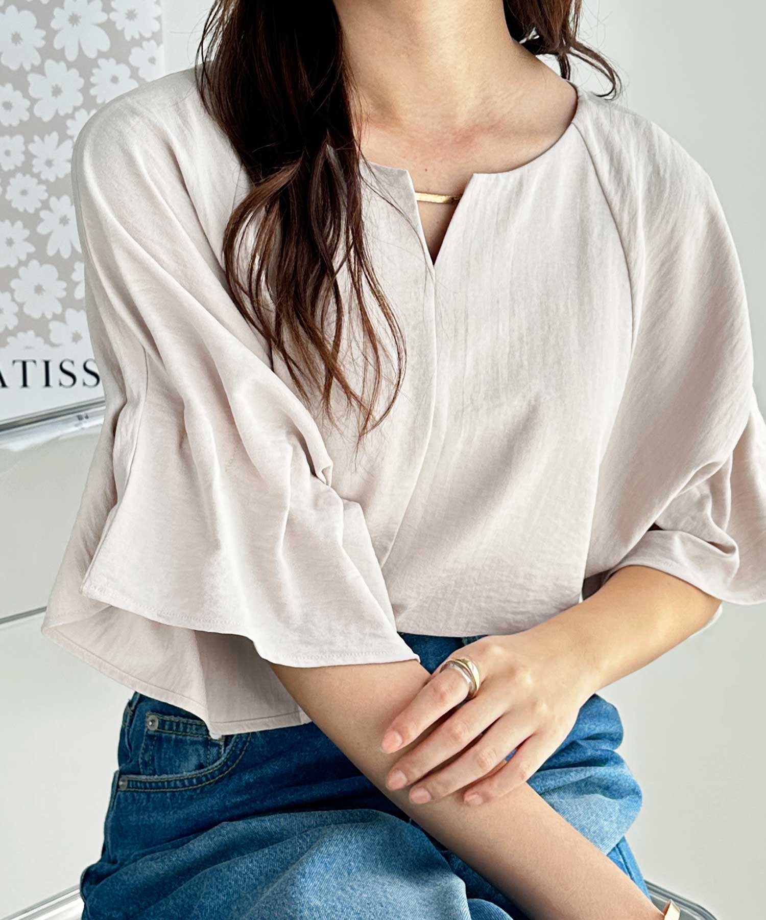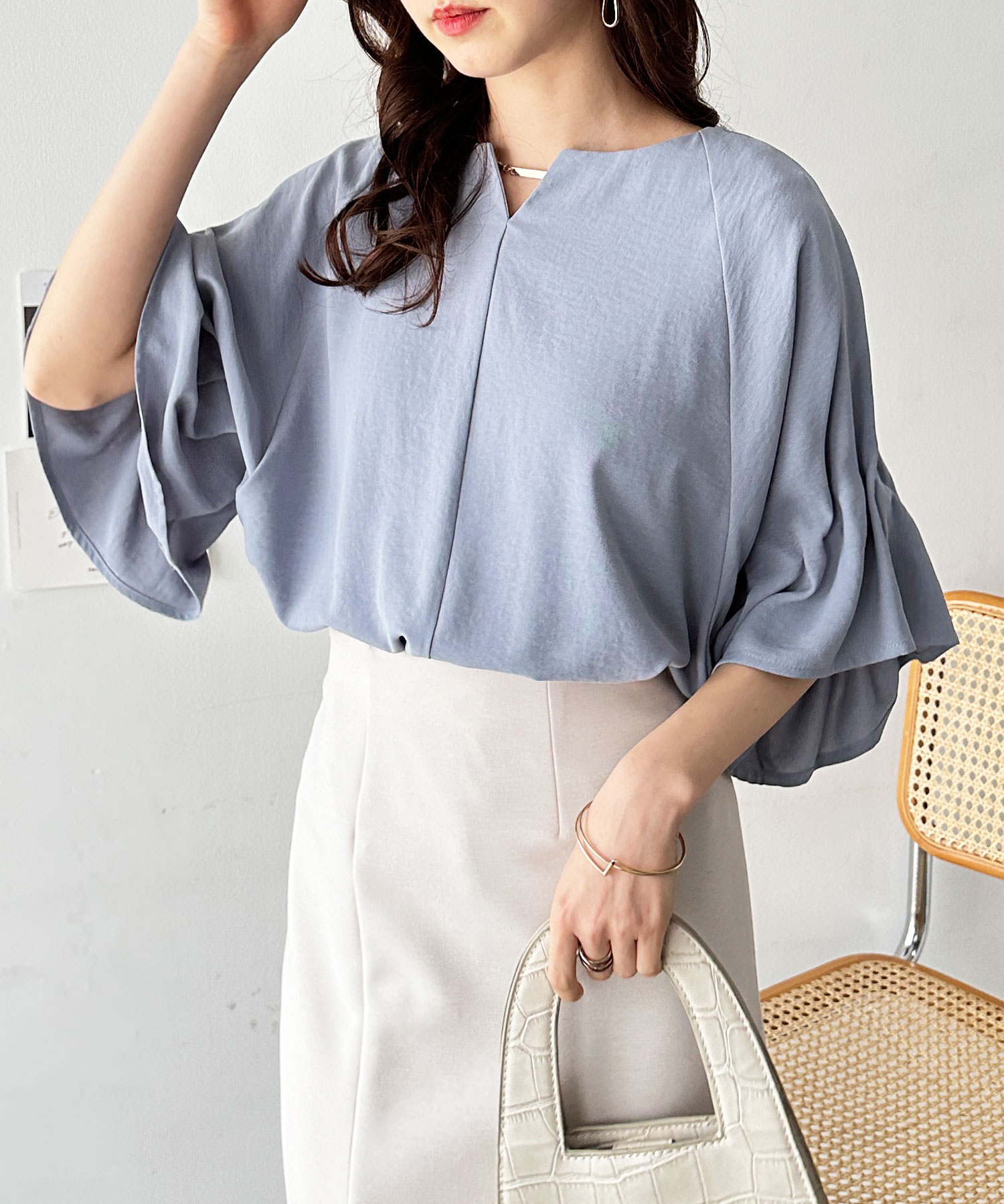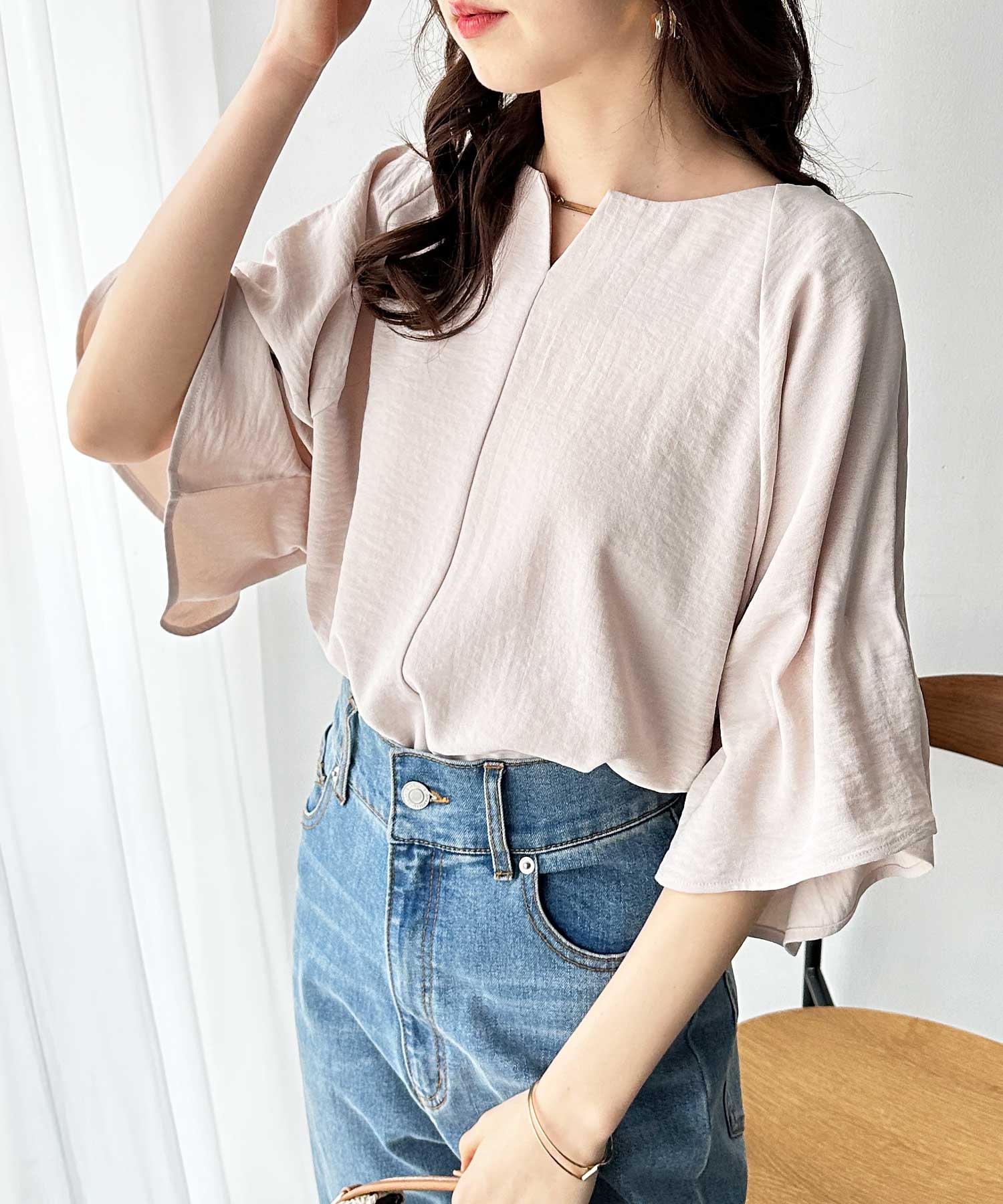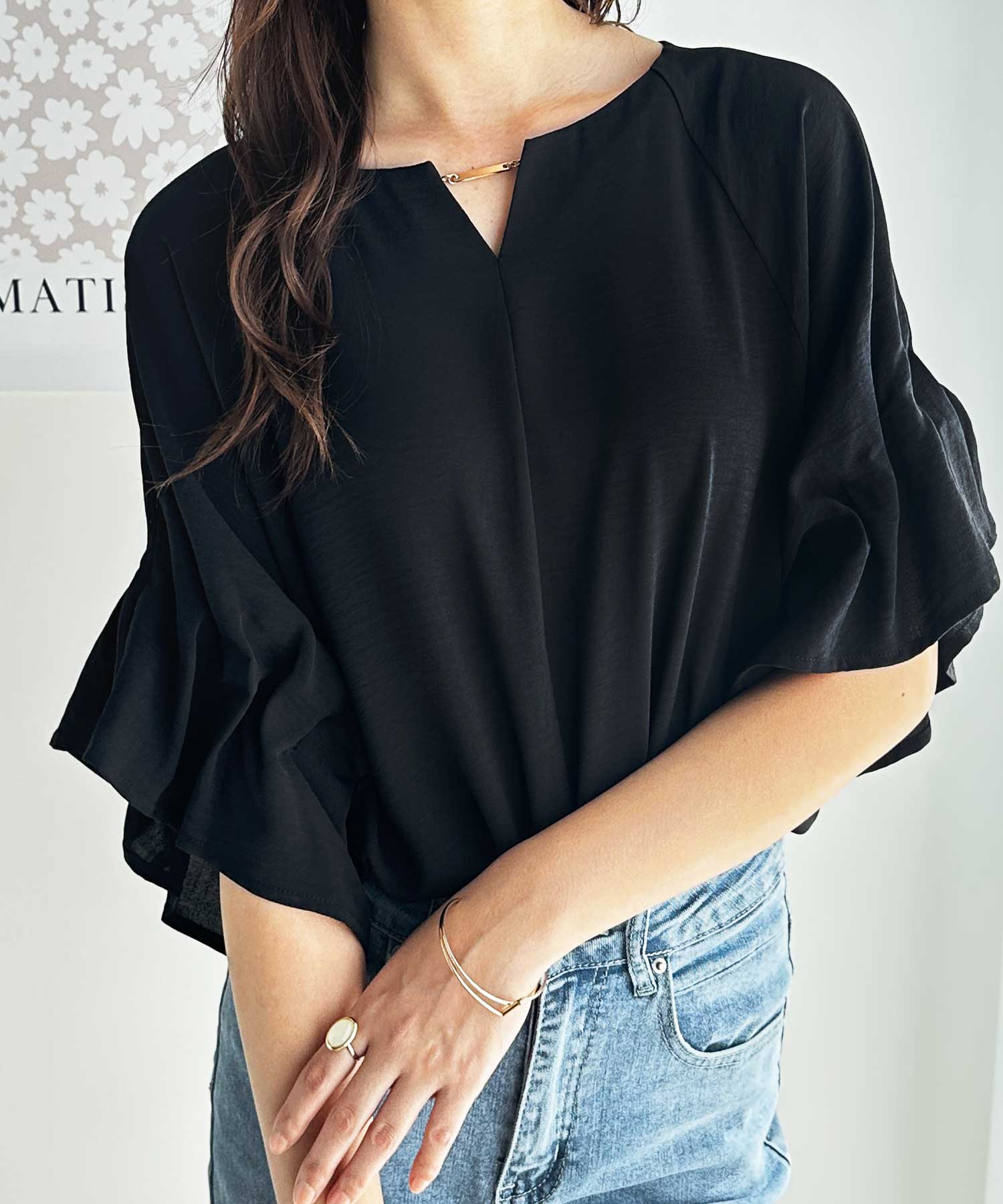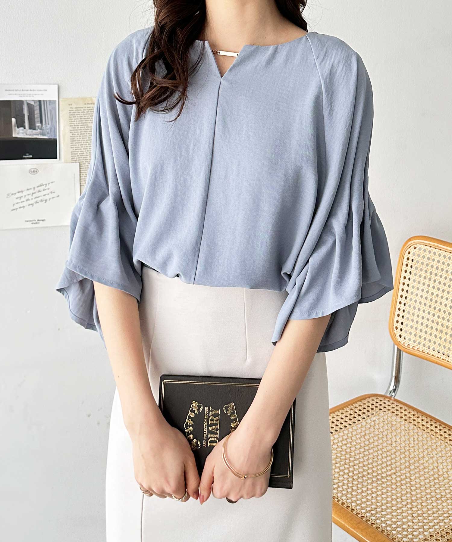 3WAYゴールドプレート袖ボリュームタックドルマンブラウス