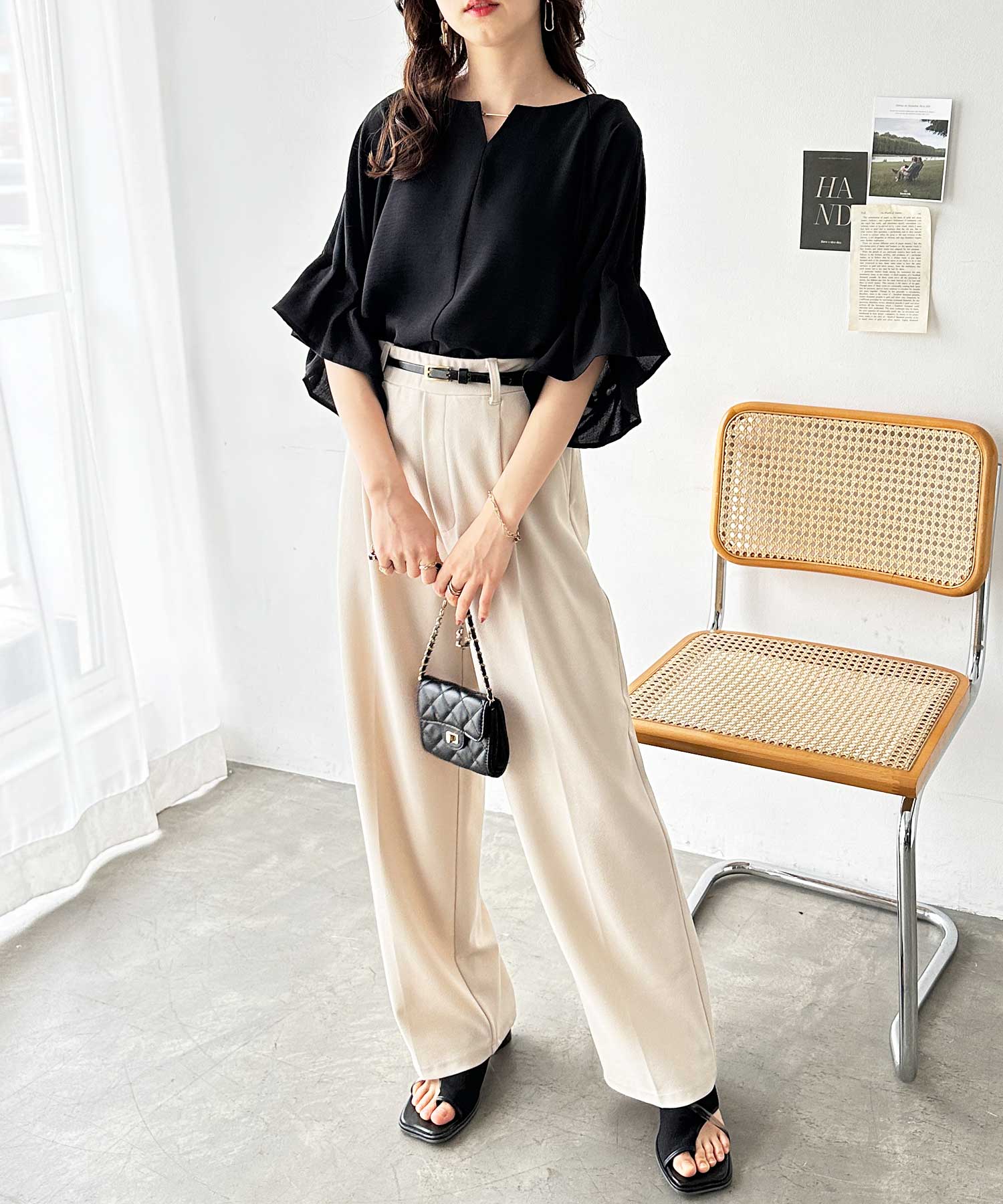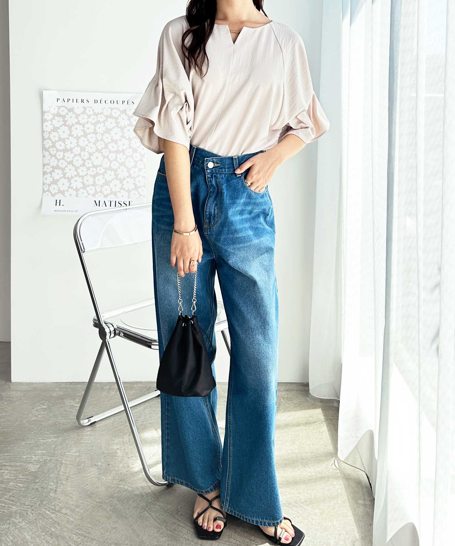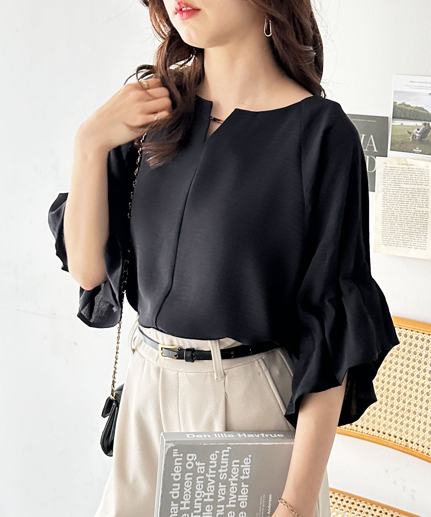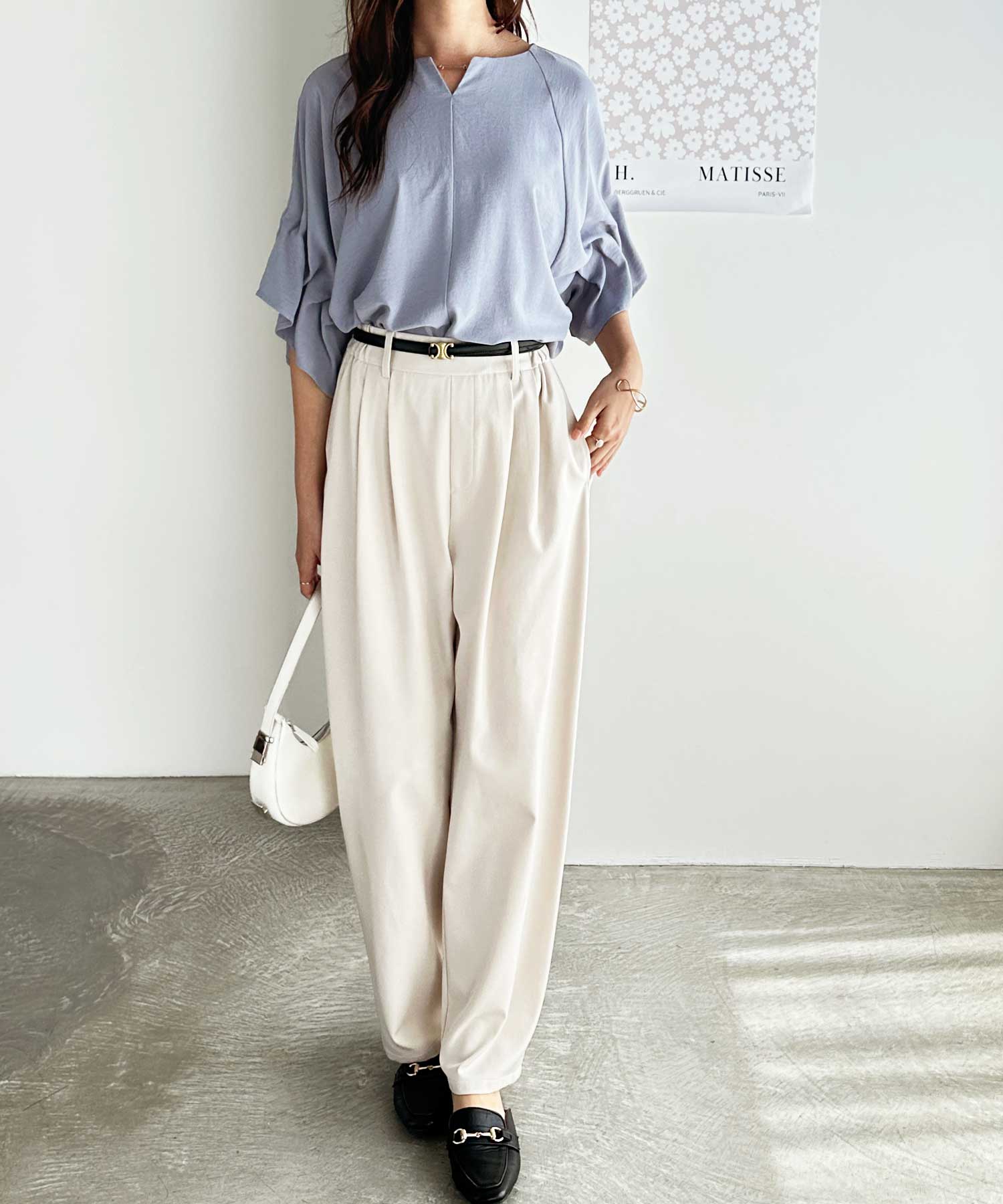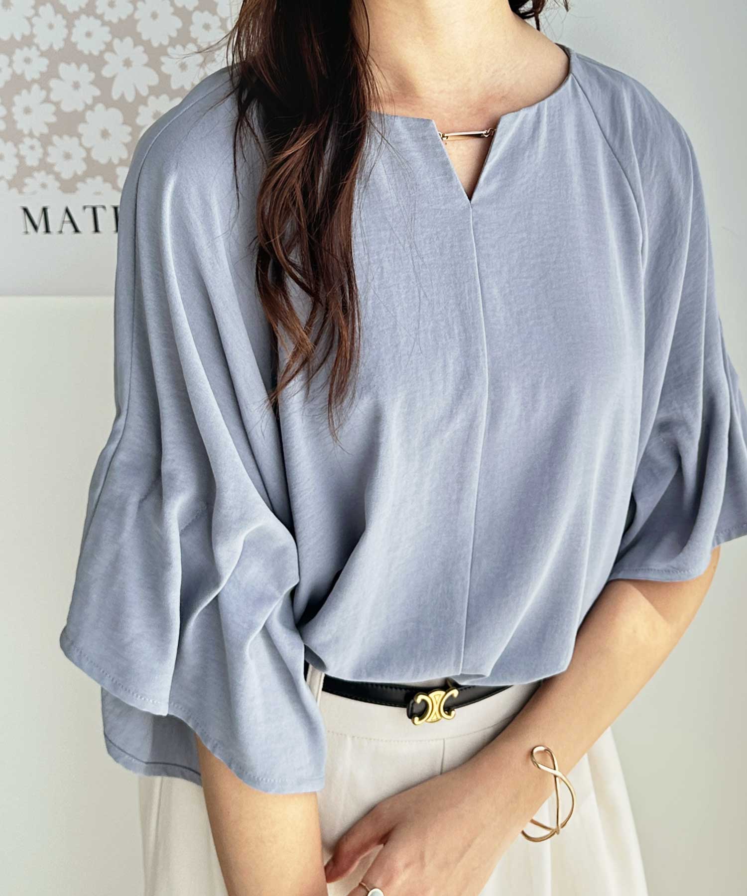 ボリュームスリーブとゴールド金具が華やかな印象のブラウス。