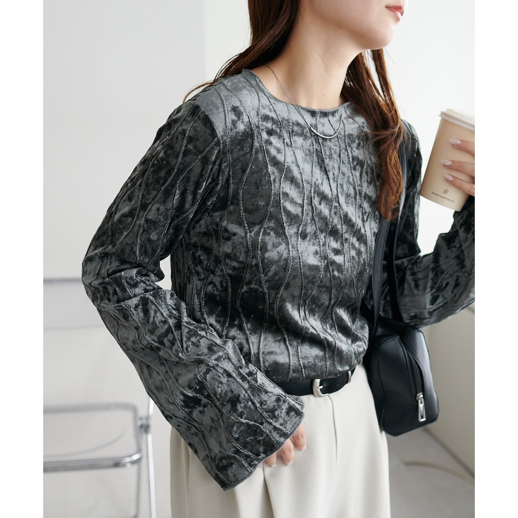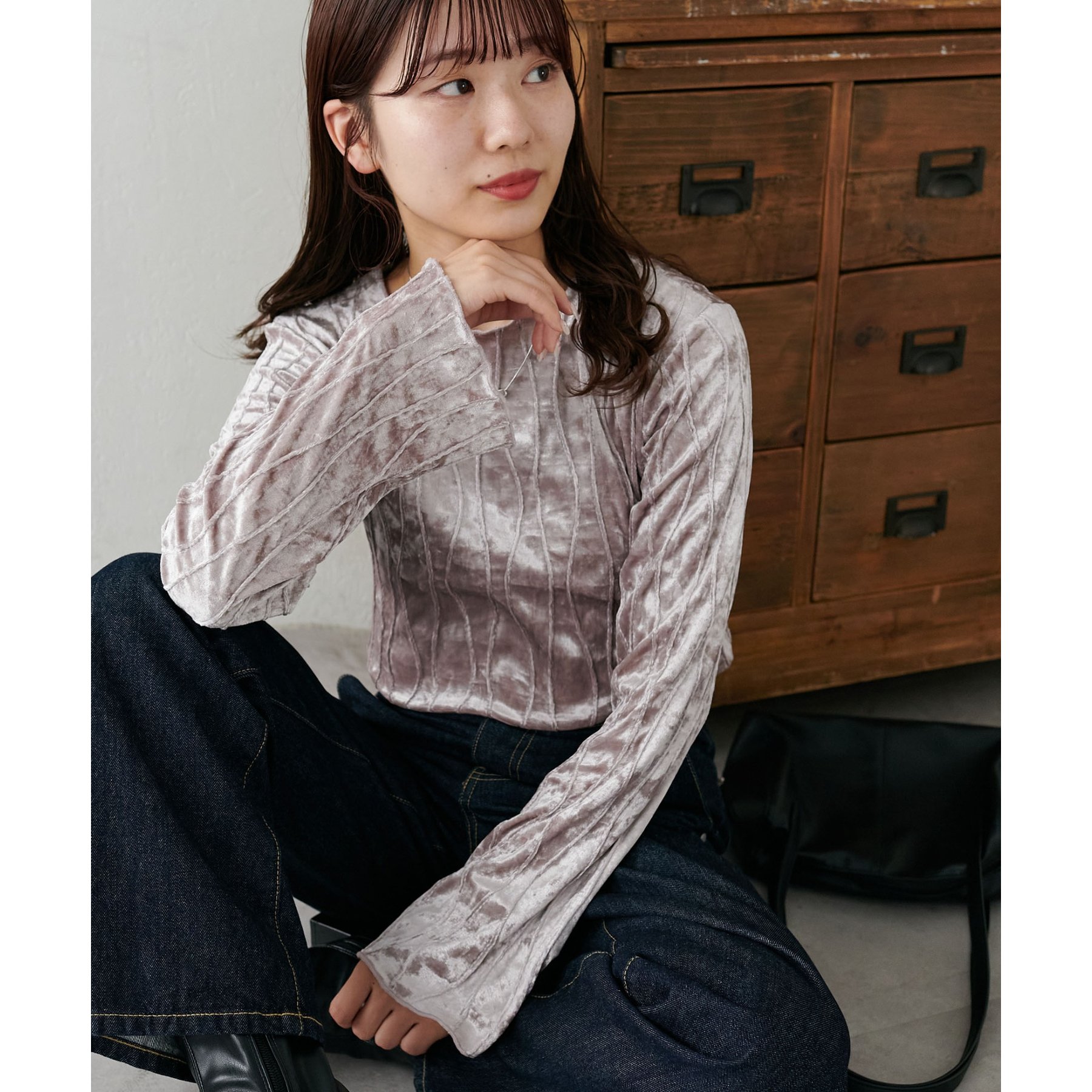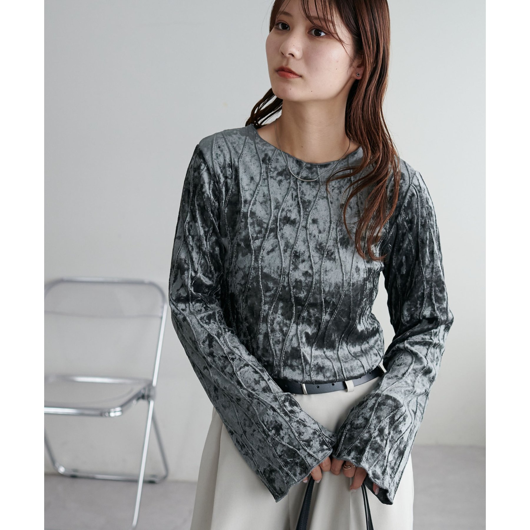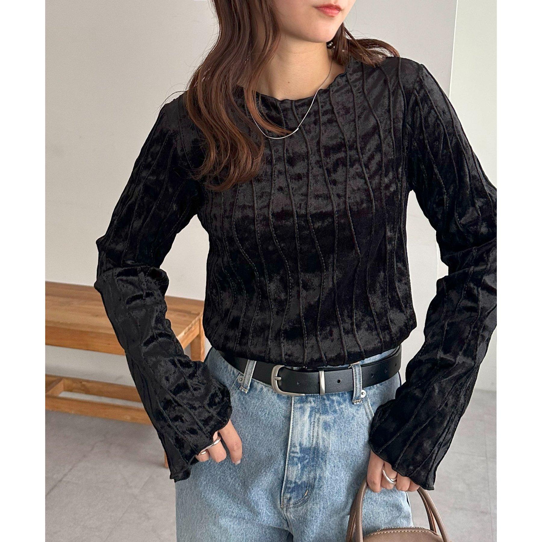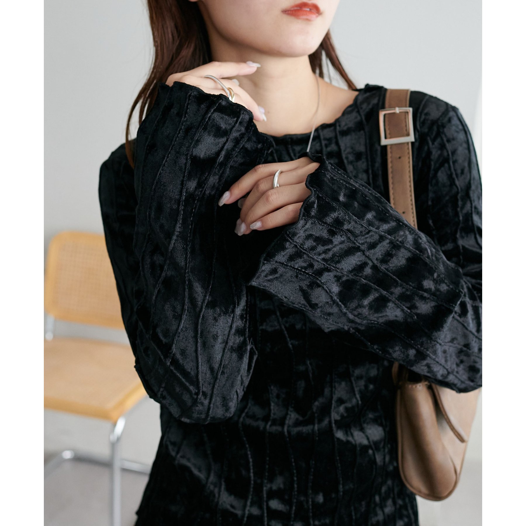 155cmスタッフ:縦のなみなみデザインが程よく立体感を出してくれて、一枚で華やかに見えます。ベロア生地が柔らかくて肌触りが良く、袖のフレア感も可愛いです♡