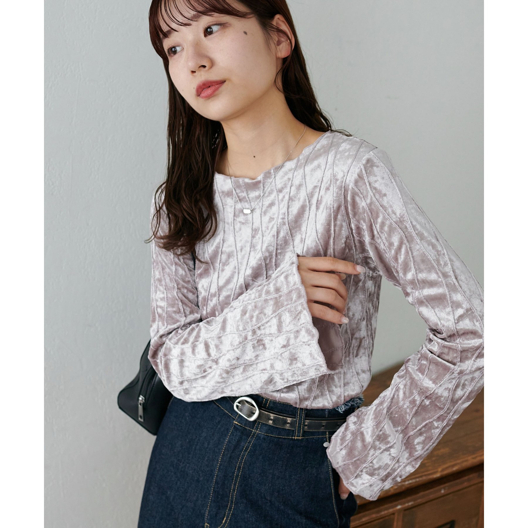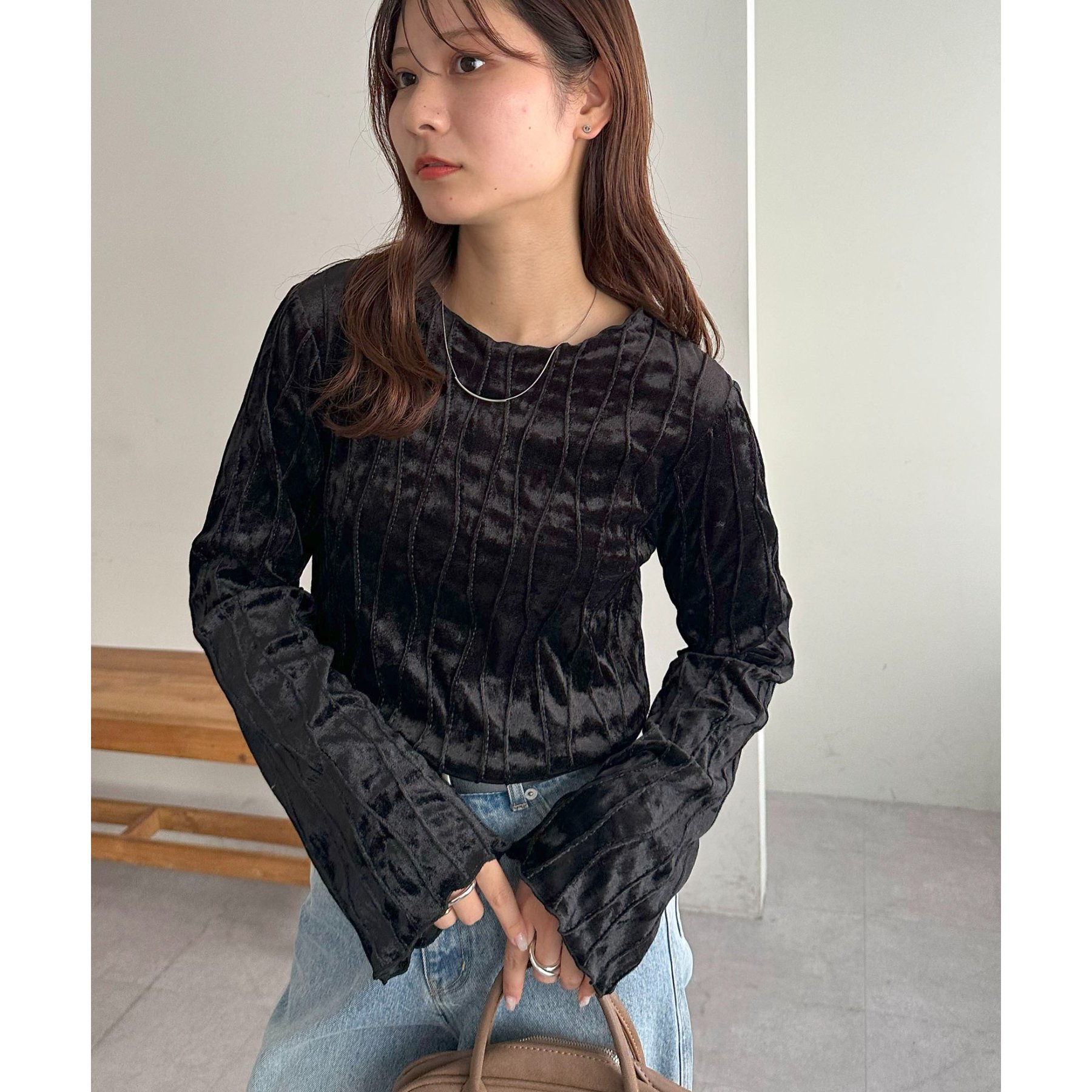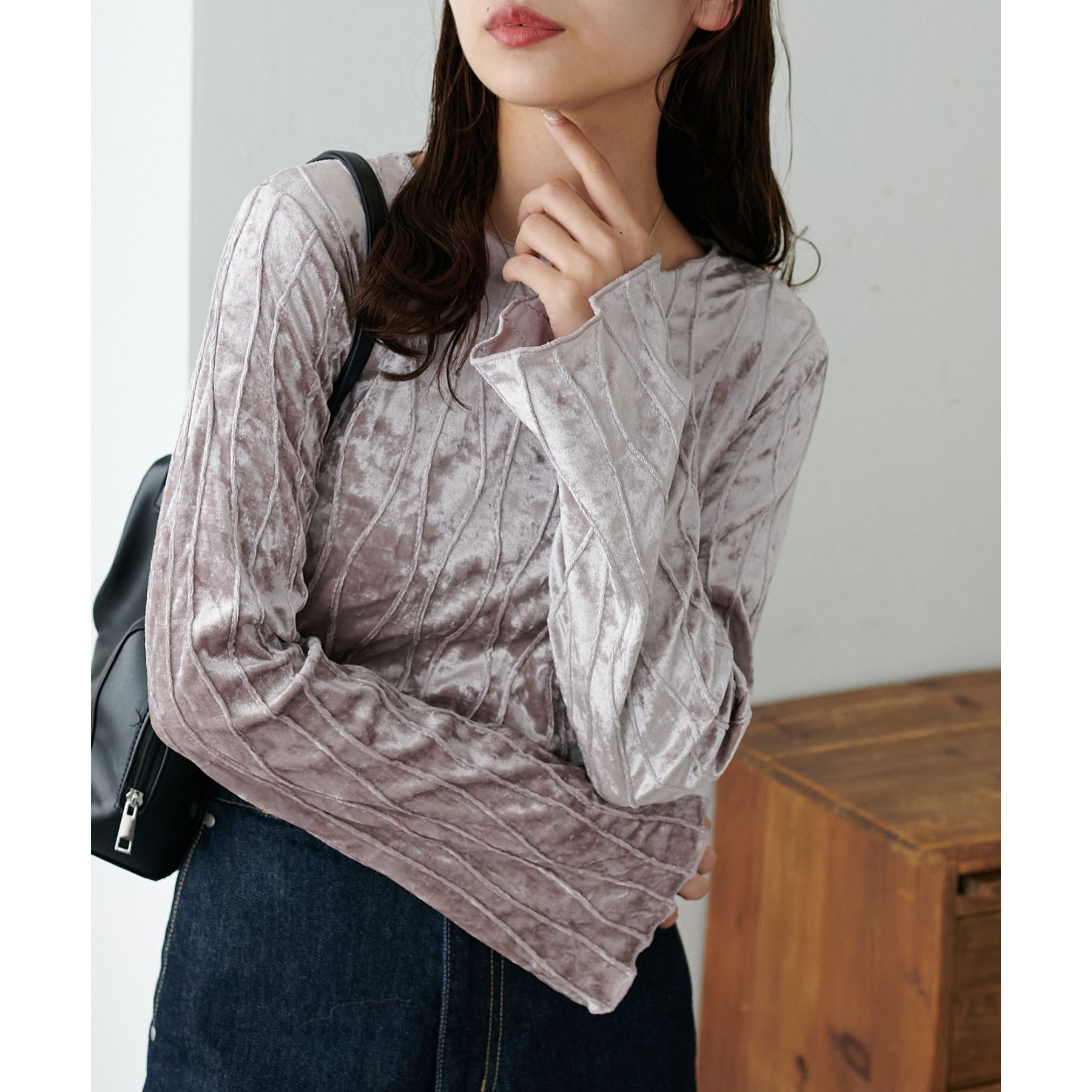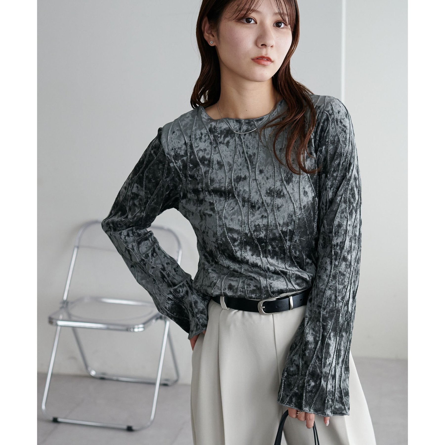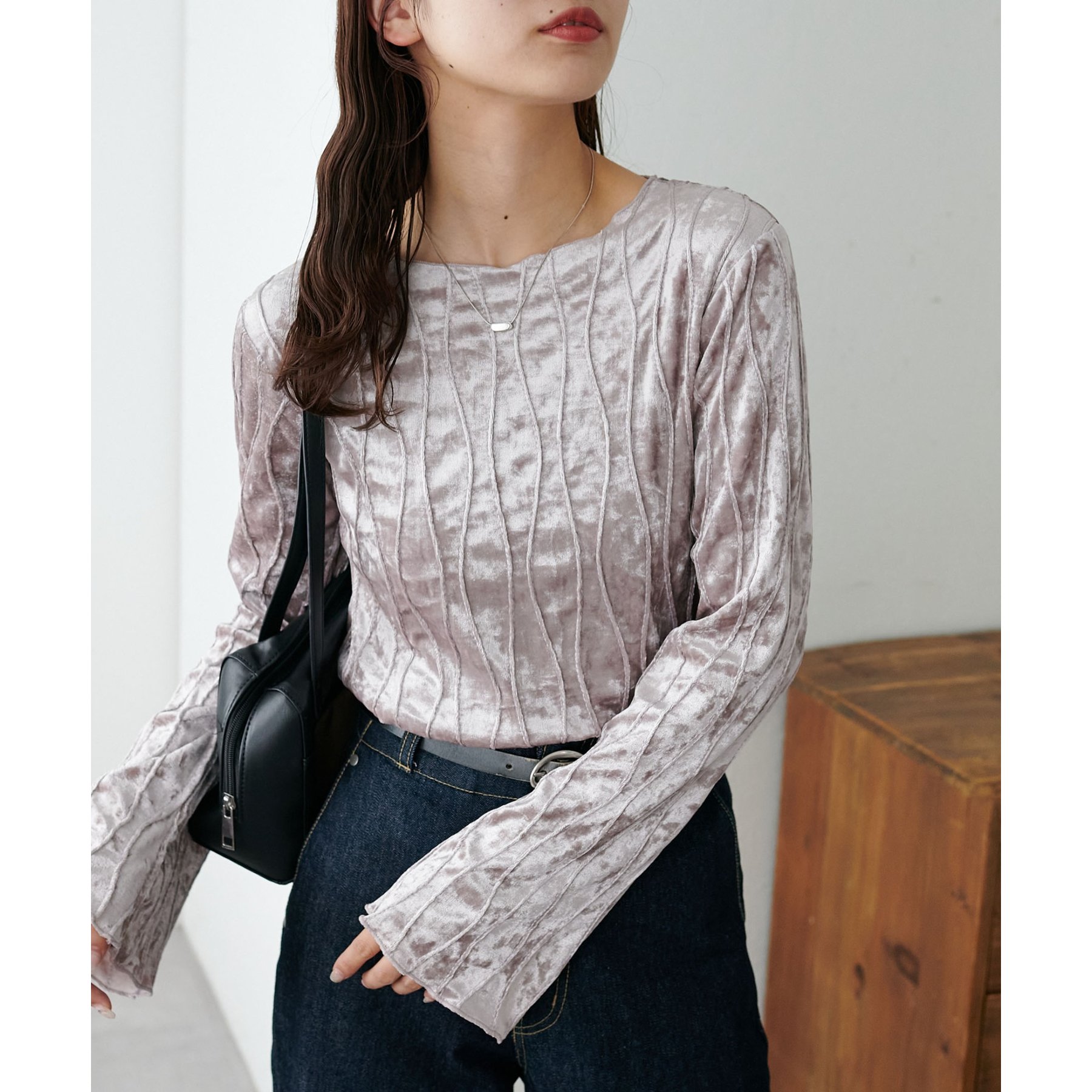 155cmスタッフ:縦のなみなみデザインが程よく立体感を出してくれて、一枚で華やかに見えます。ベロア生地が柔らかくて肌触りが良く、袖のフレア感も可愛いです♡