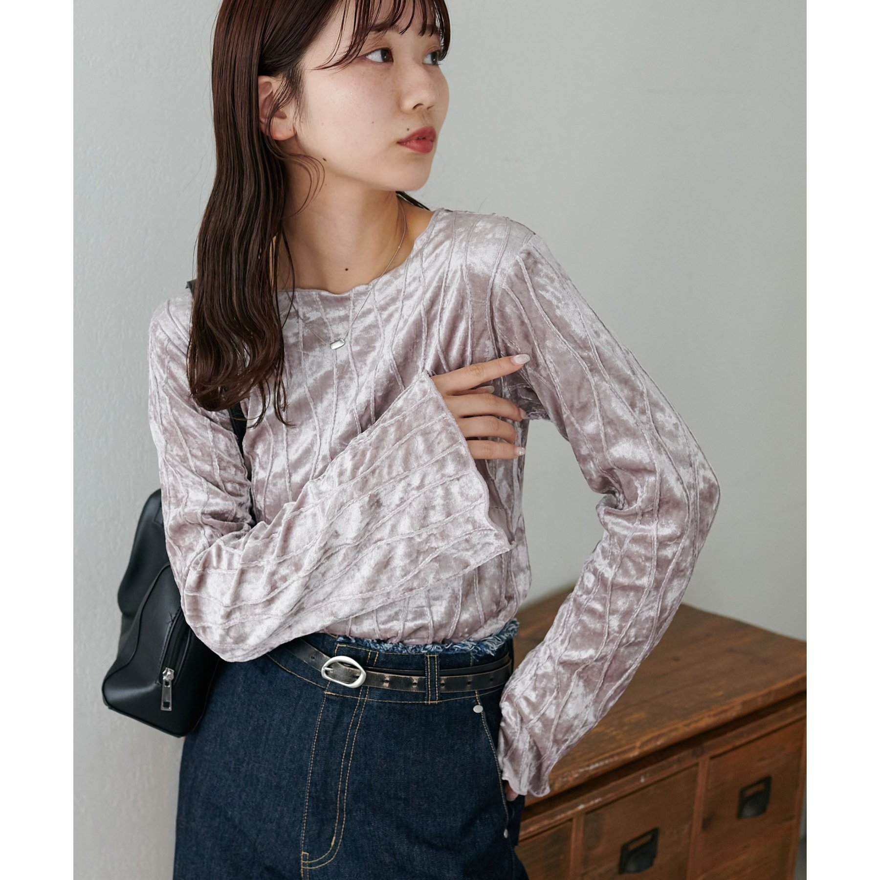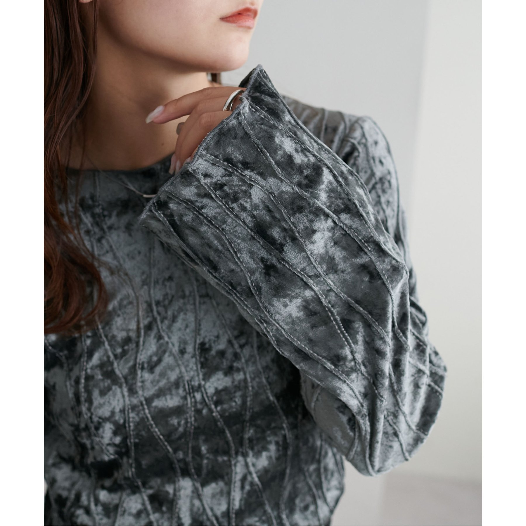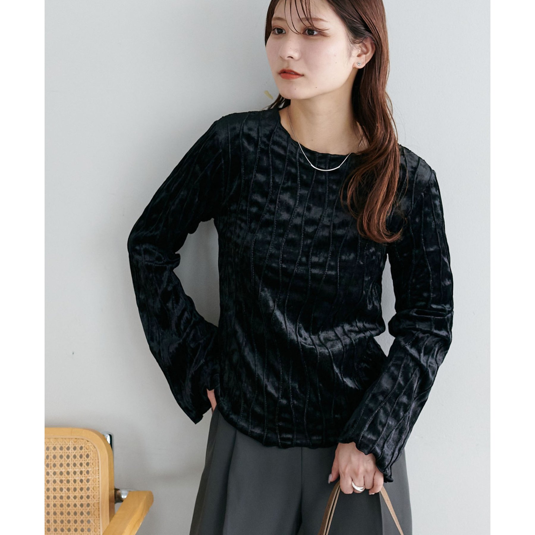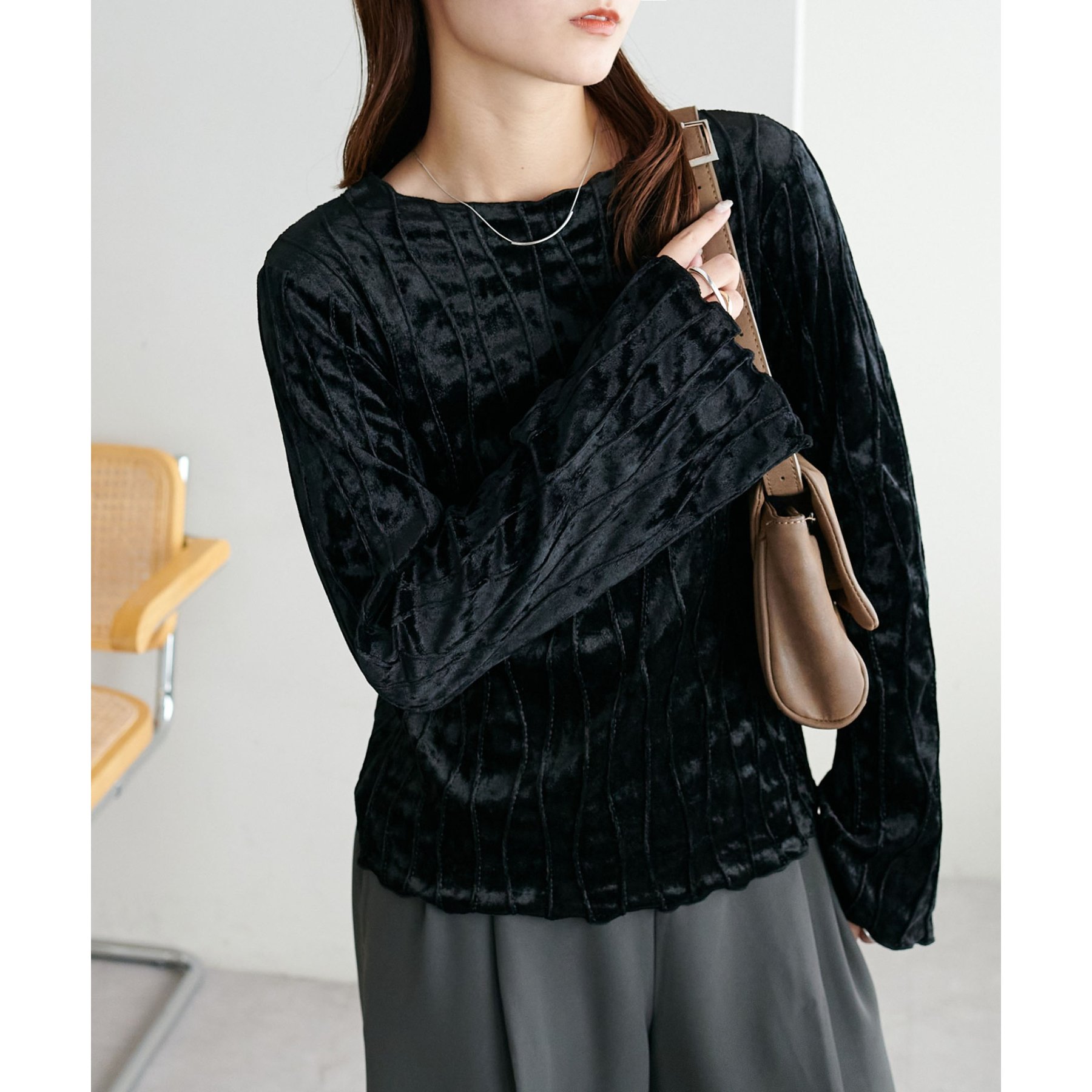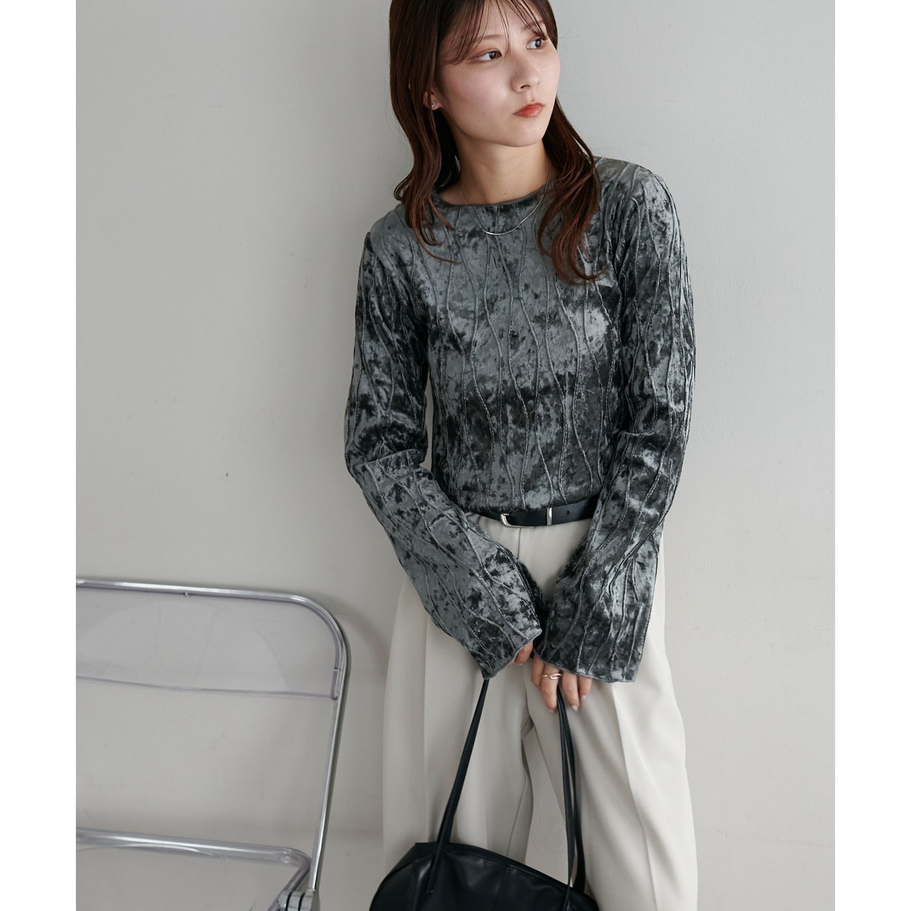 155cmスタッフ:縦のなみなみデザインが程よく立体感を出してくれて、一枚で華やかに見えます。ベロア生地が柔らかくて肌触りが良く、袖のフレア感も可愛いです♡