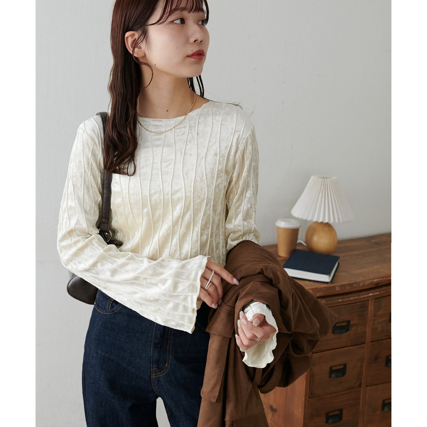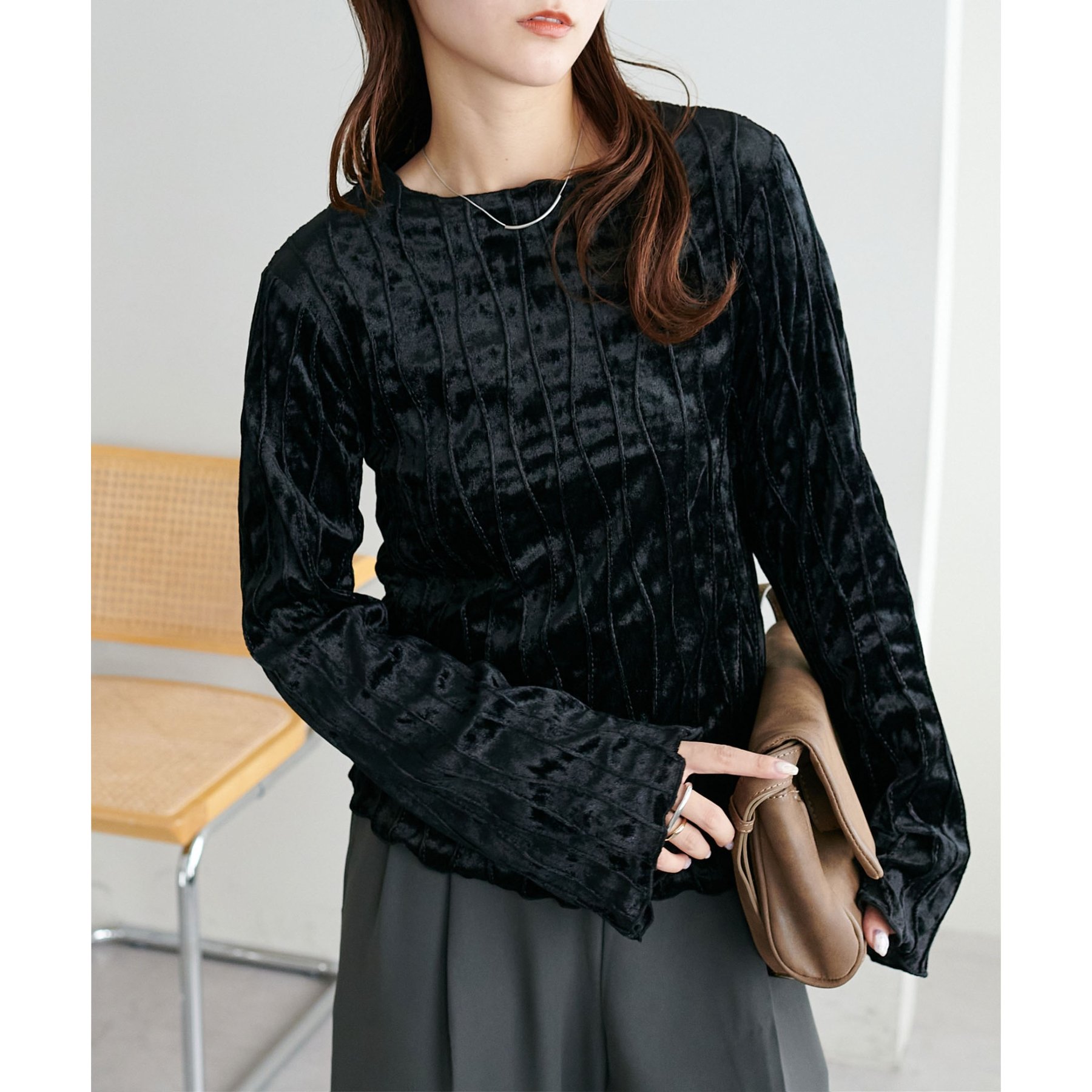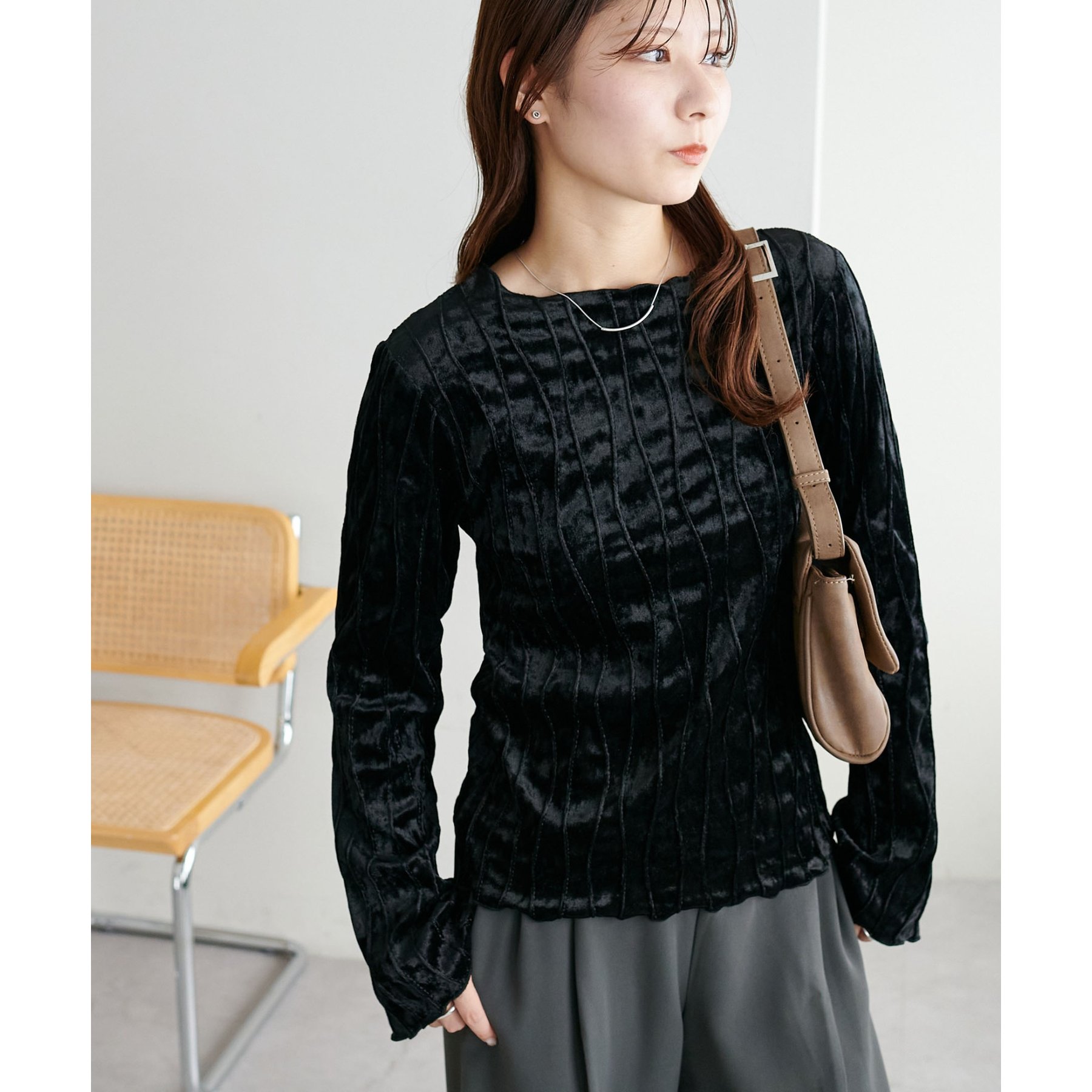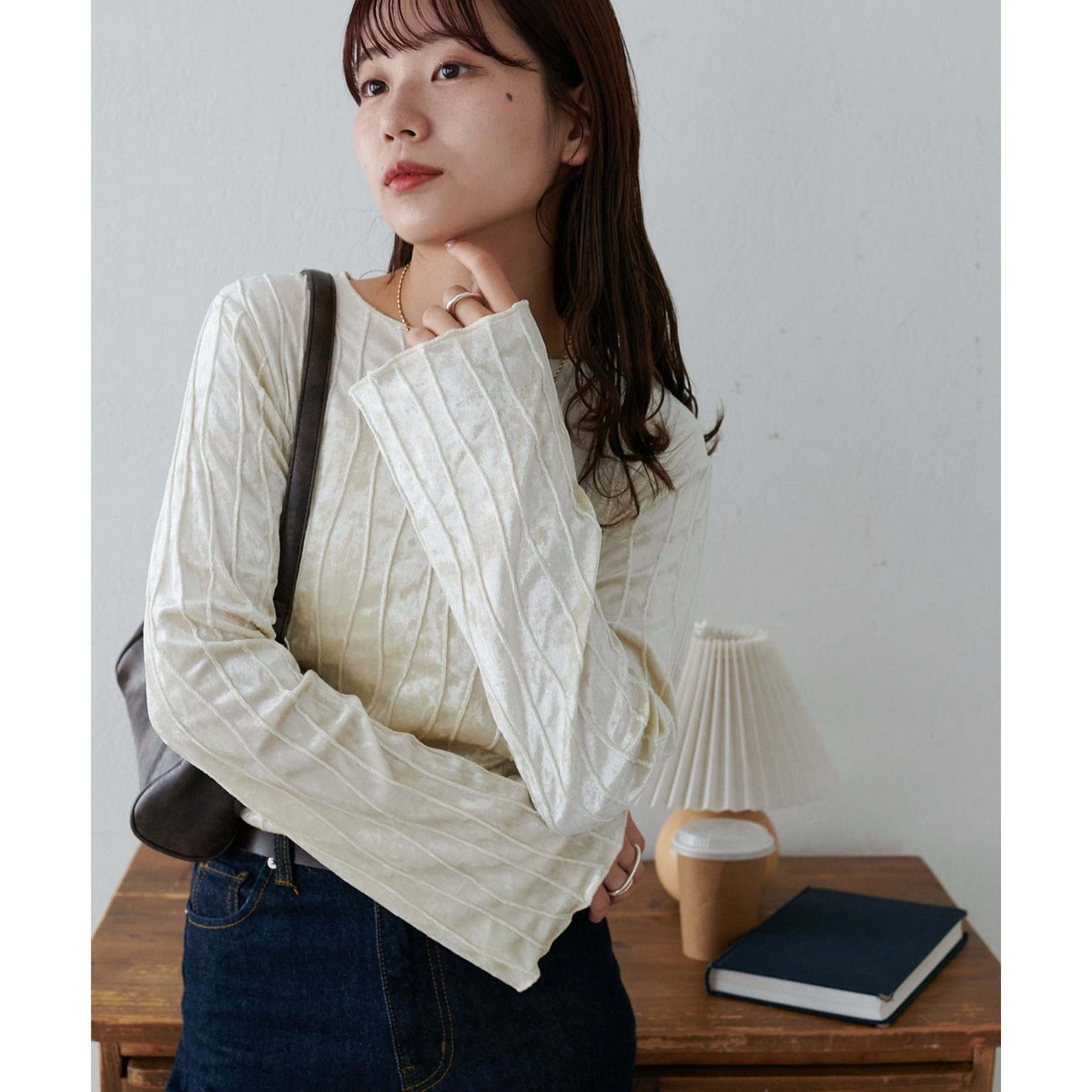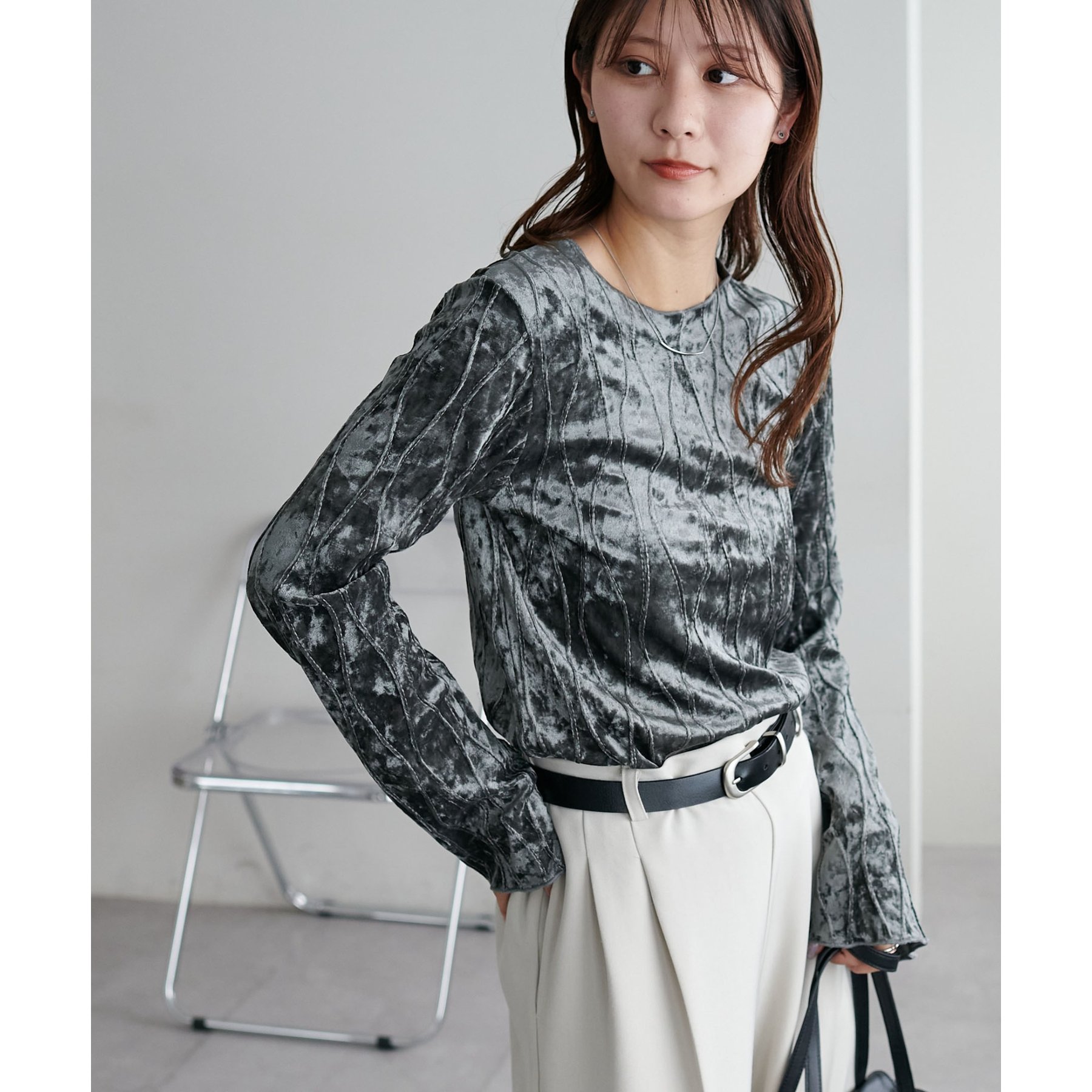 155cmスタッフ:縦のなみなみデザインが程よく立体感を出してくれて、一枚で華やかに見えます。ベロア生地が柔らかくて肌触りが良く、袖のフレア感も可愛いです♡