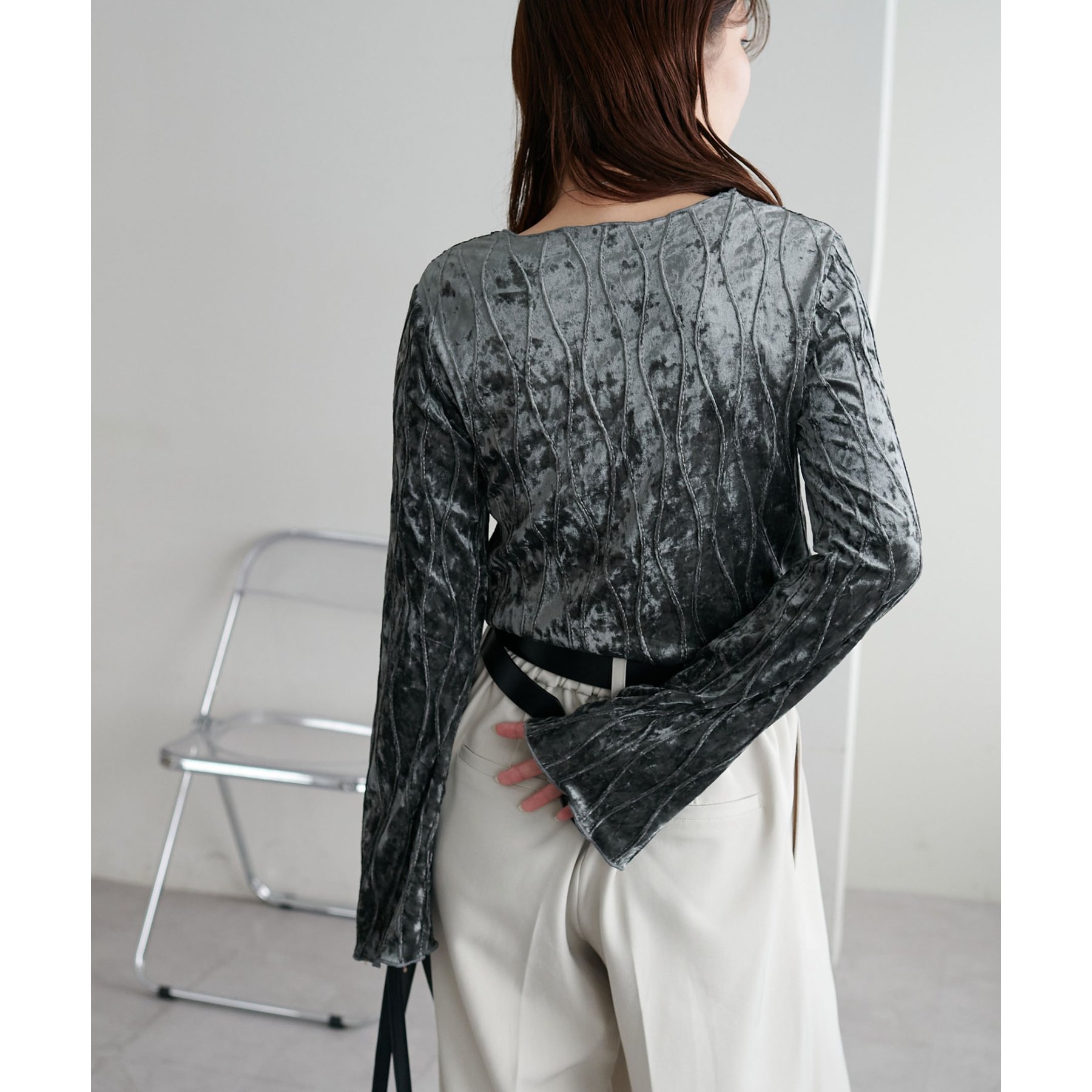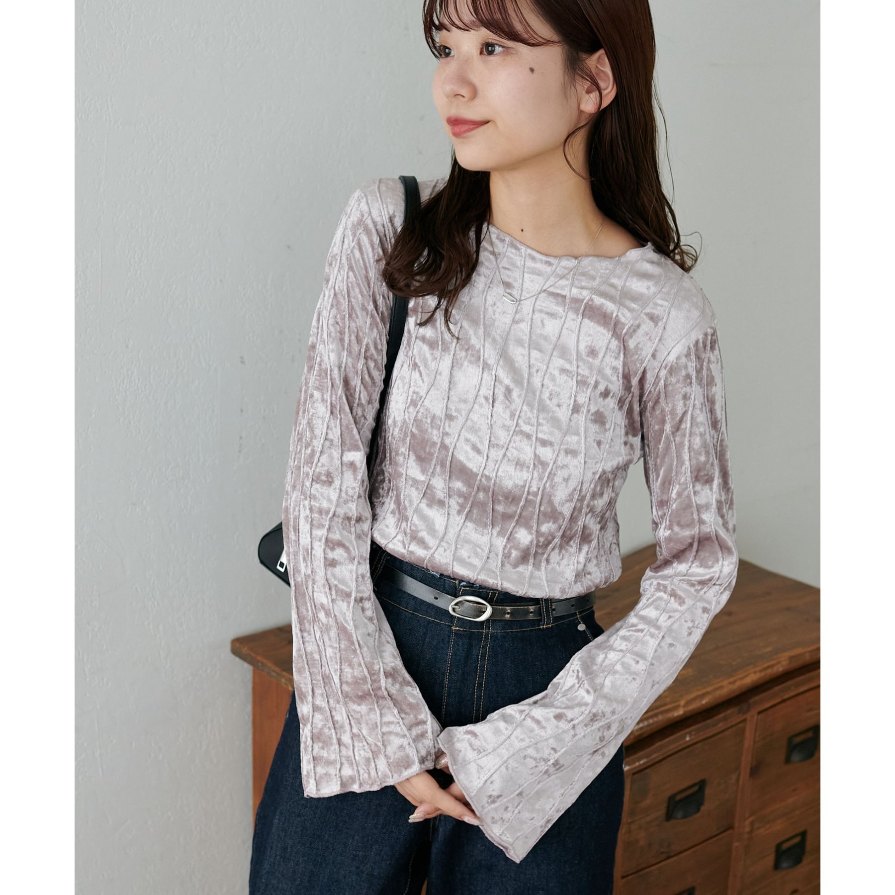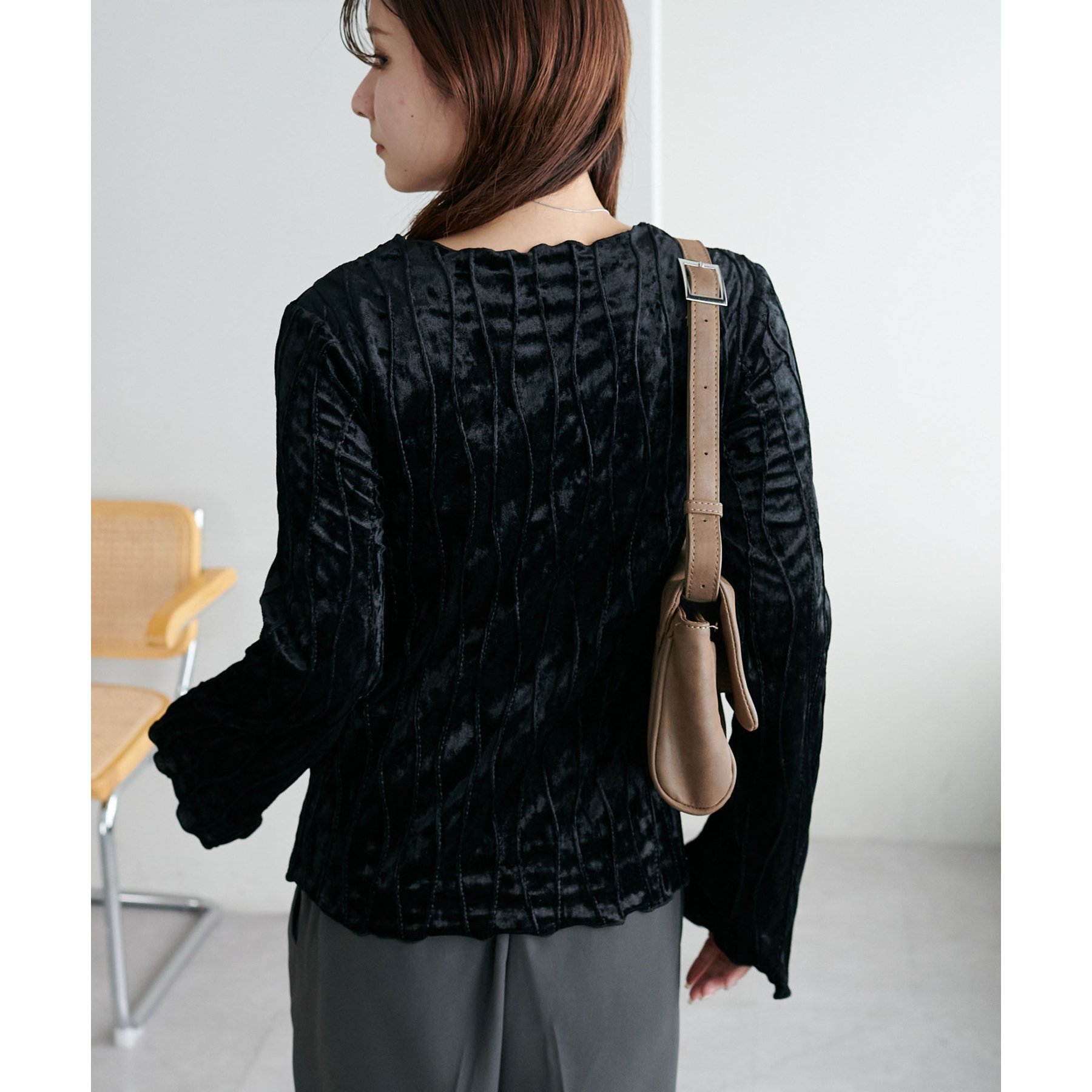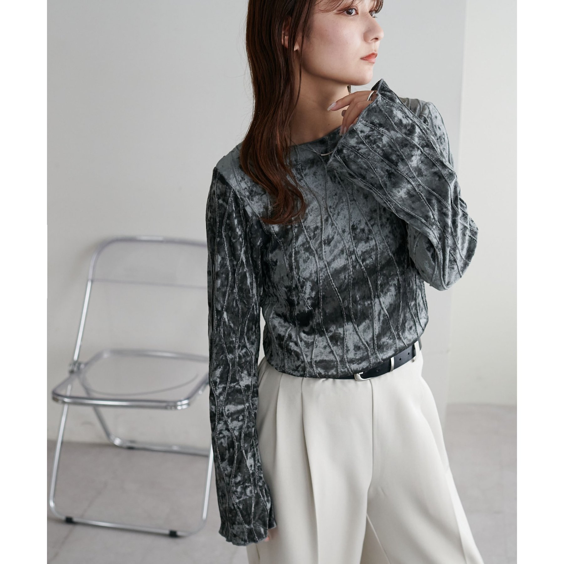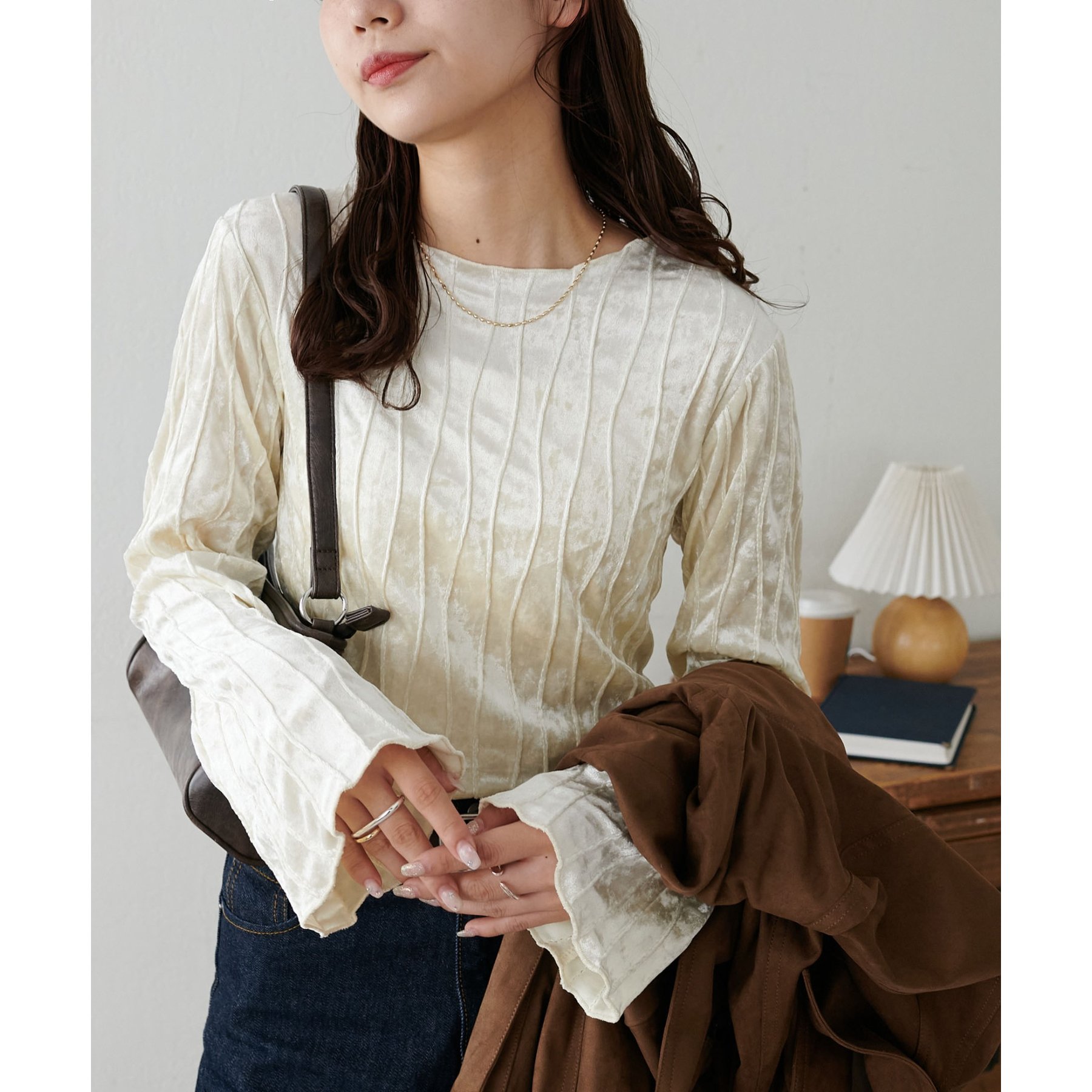 155cmスタッフ:縦のなみなみデザインが程よく立体感を出してくれて、一枚で華やかに見えます。ベロア生地が柔らかくて肌触りが良く、袖のフレア感も可愛いです♡