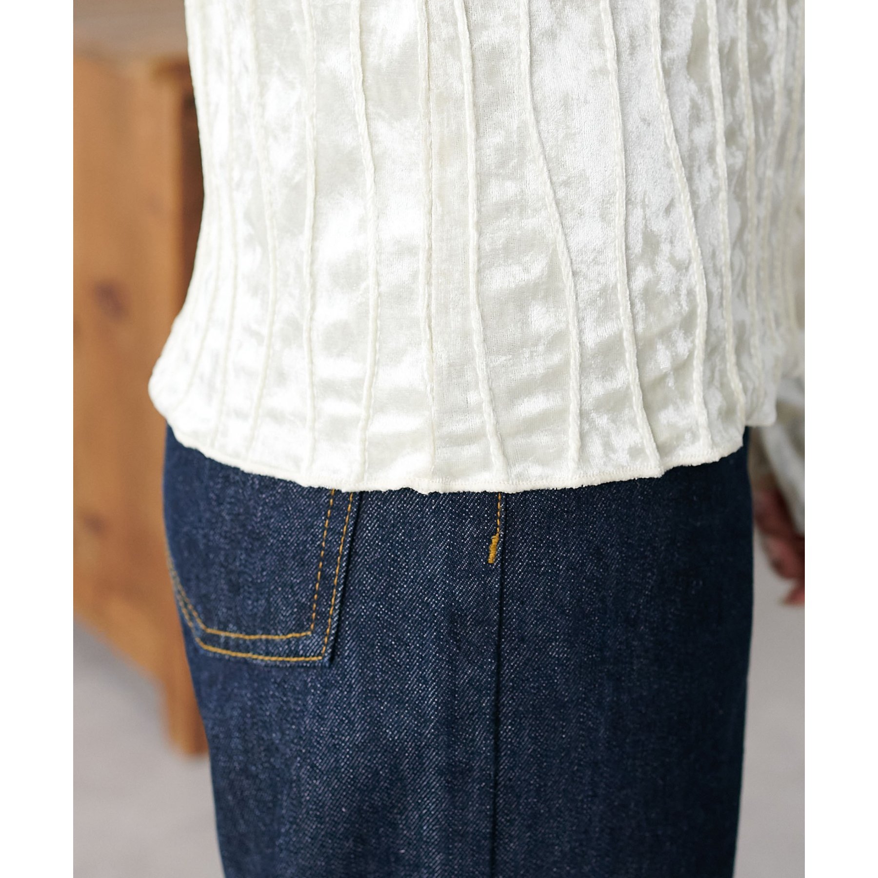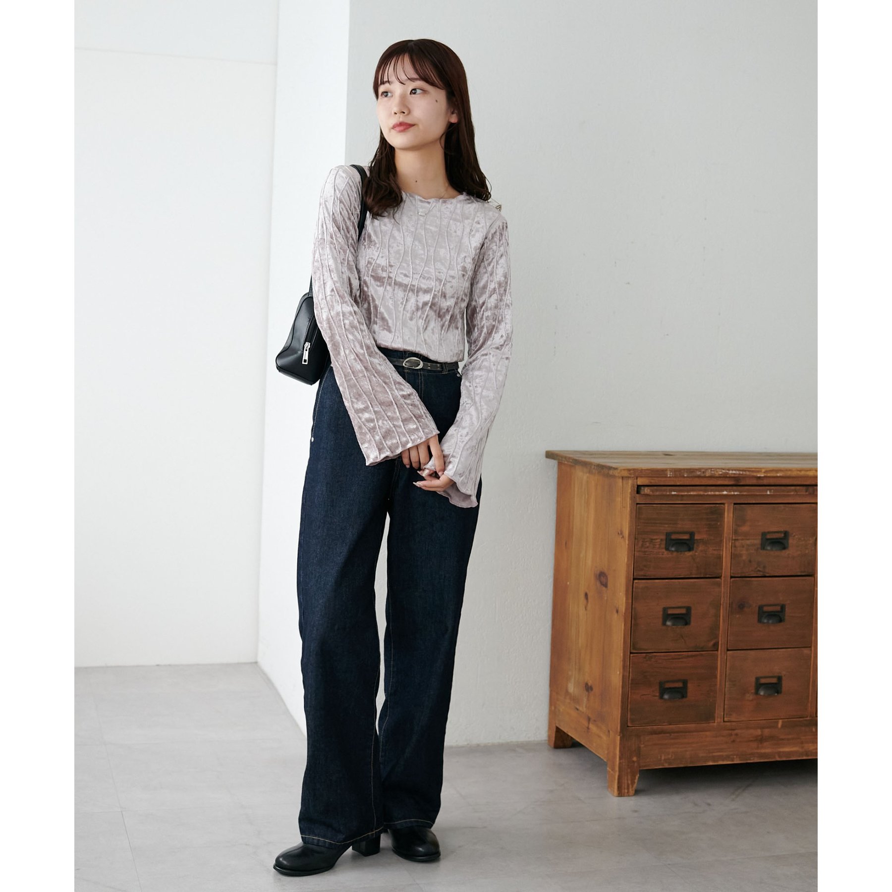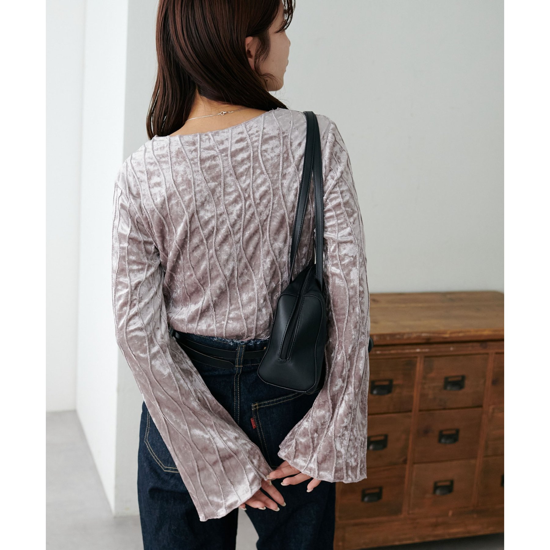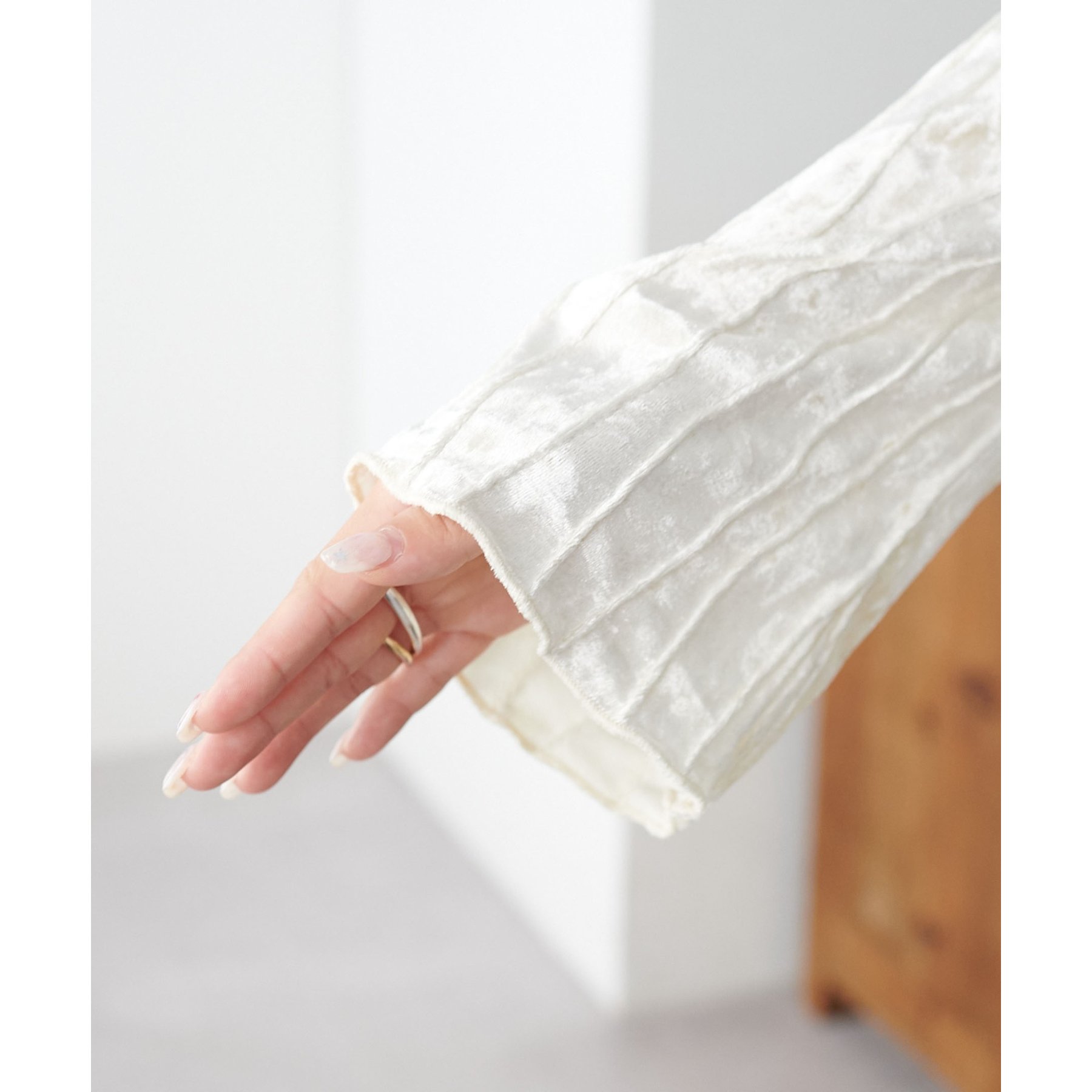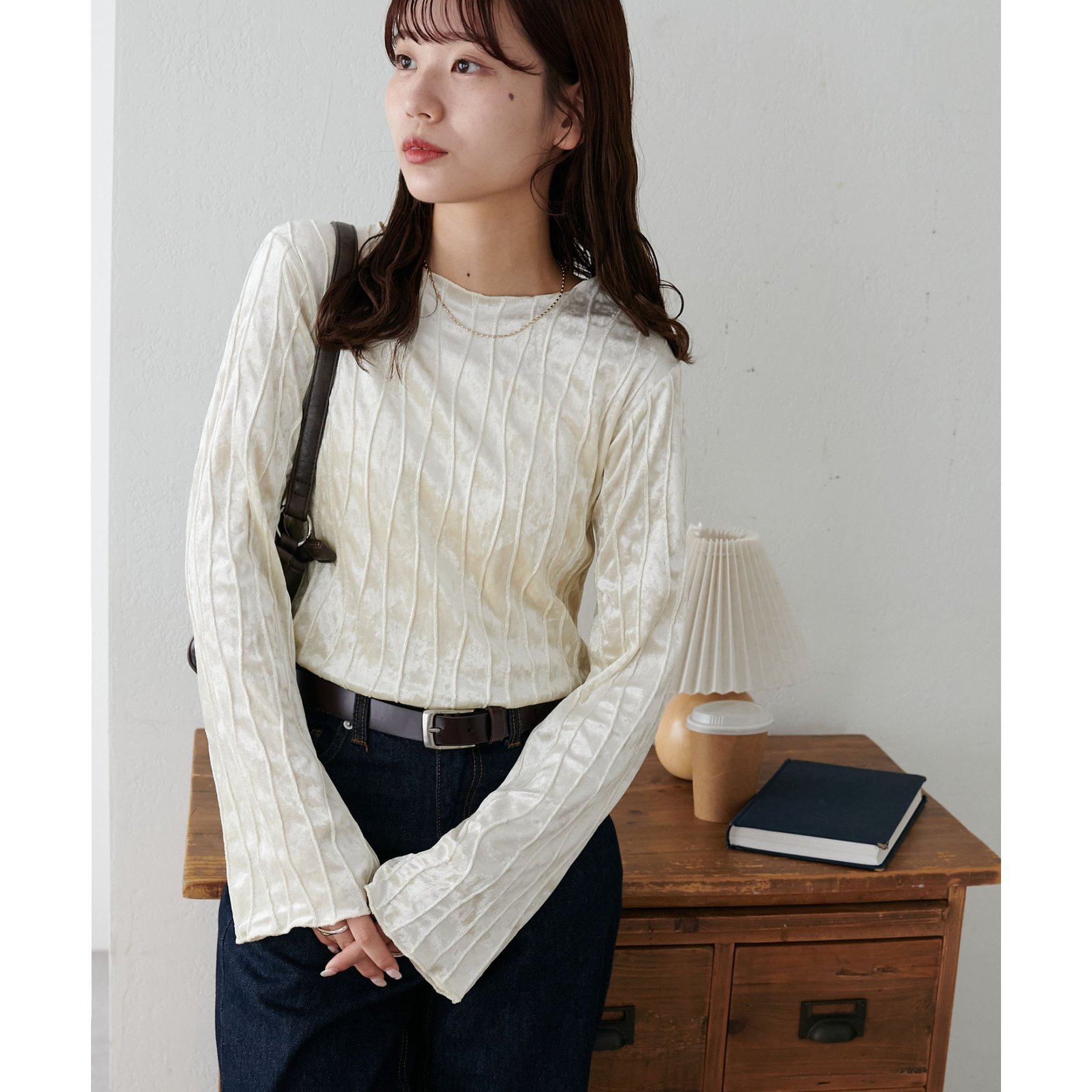 155cmスタッフ:縦のなみなみデザインが程よく立体感を出してくれて、一枚で華やかに見えます。ベロア生地が柔らかくて肌触りが良く、袖のフレア感も可愛いです♡