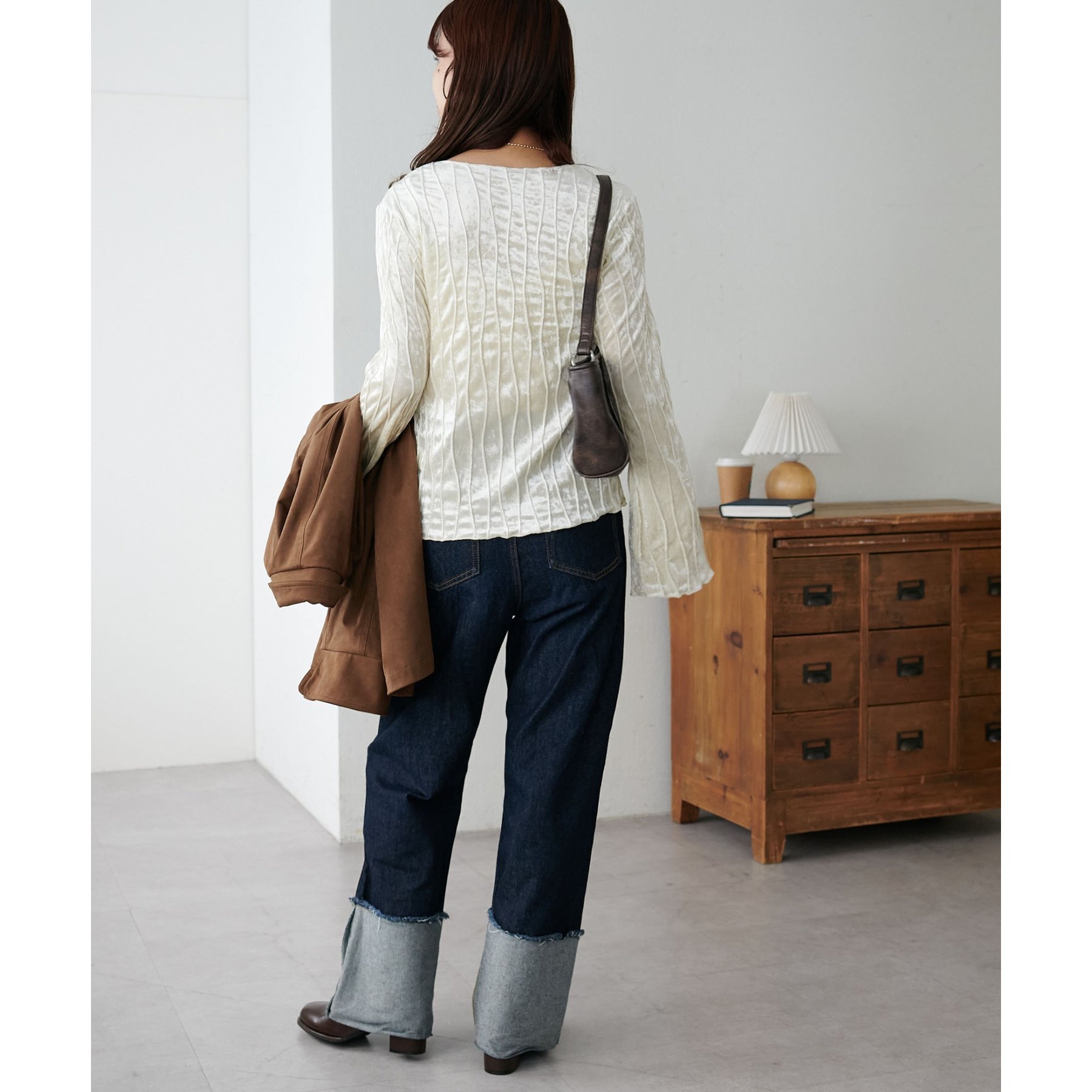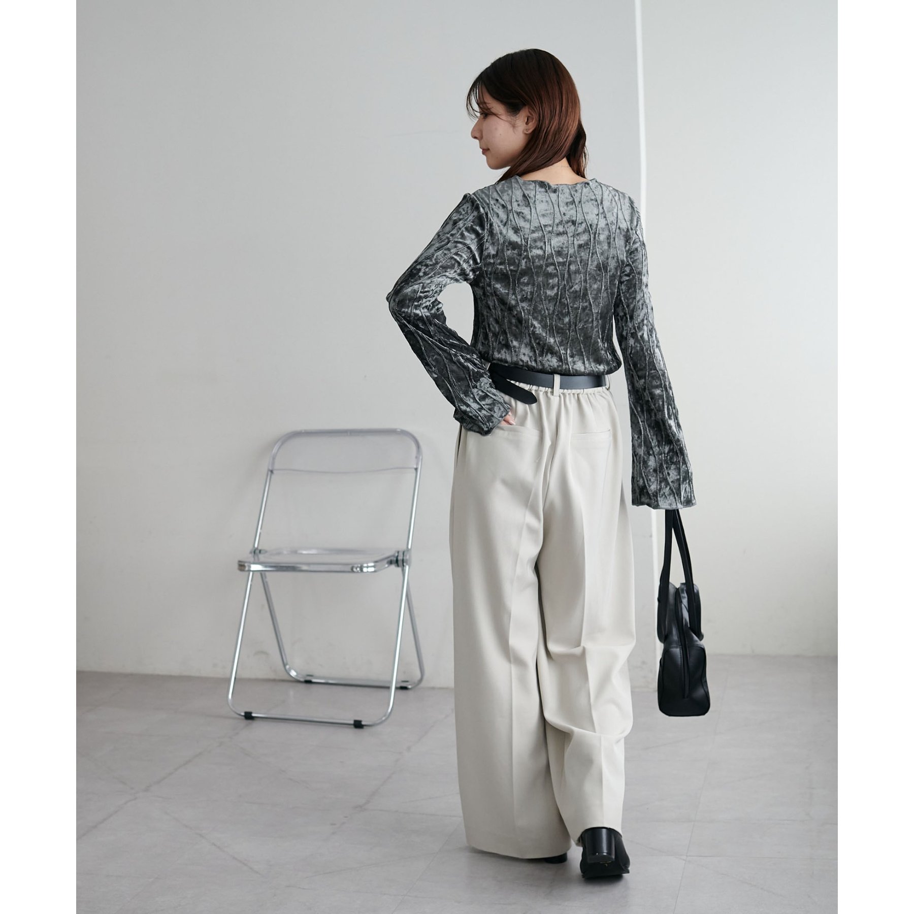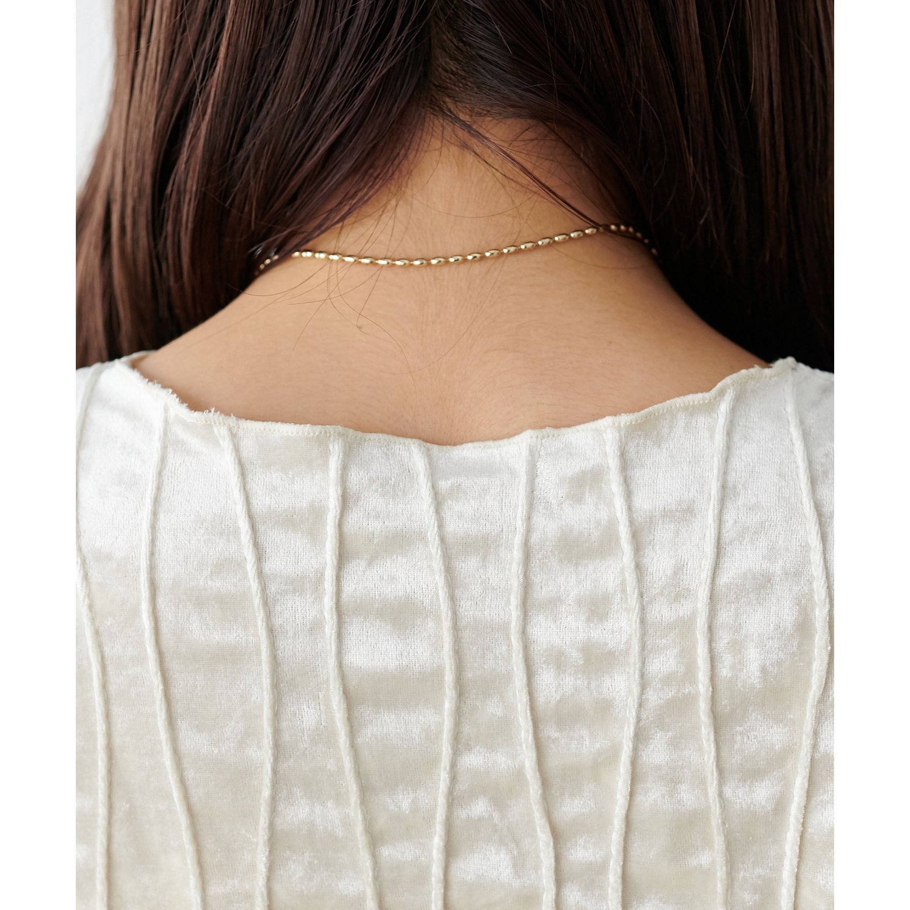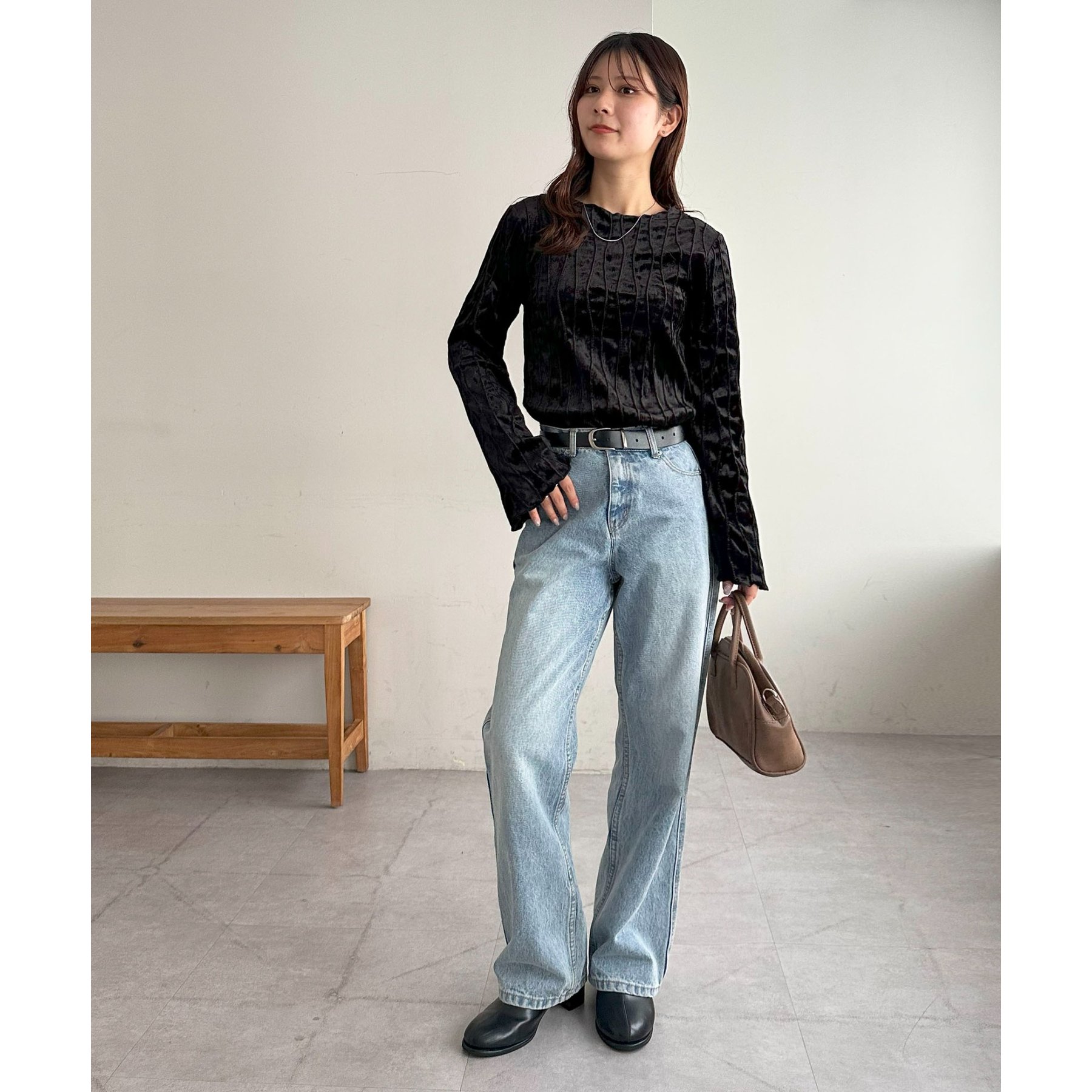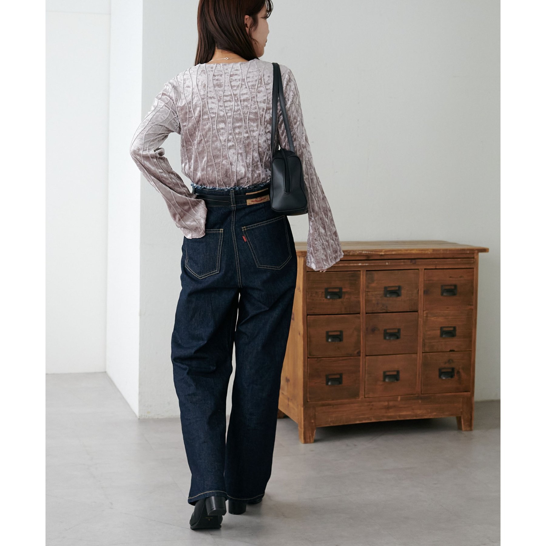 155cmスタッフ:縦のなみなみデザインが程よく立体感を出してくれて、一枚で華やかに見えます。ベロア生地が柔らかくて肌触りが良く、袖のフレア感も可愛いです♡