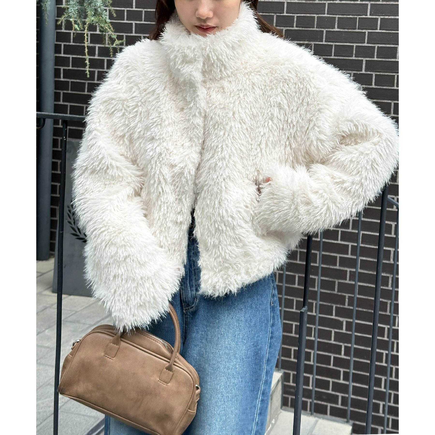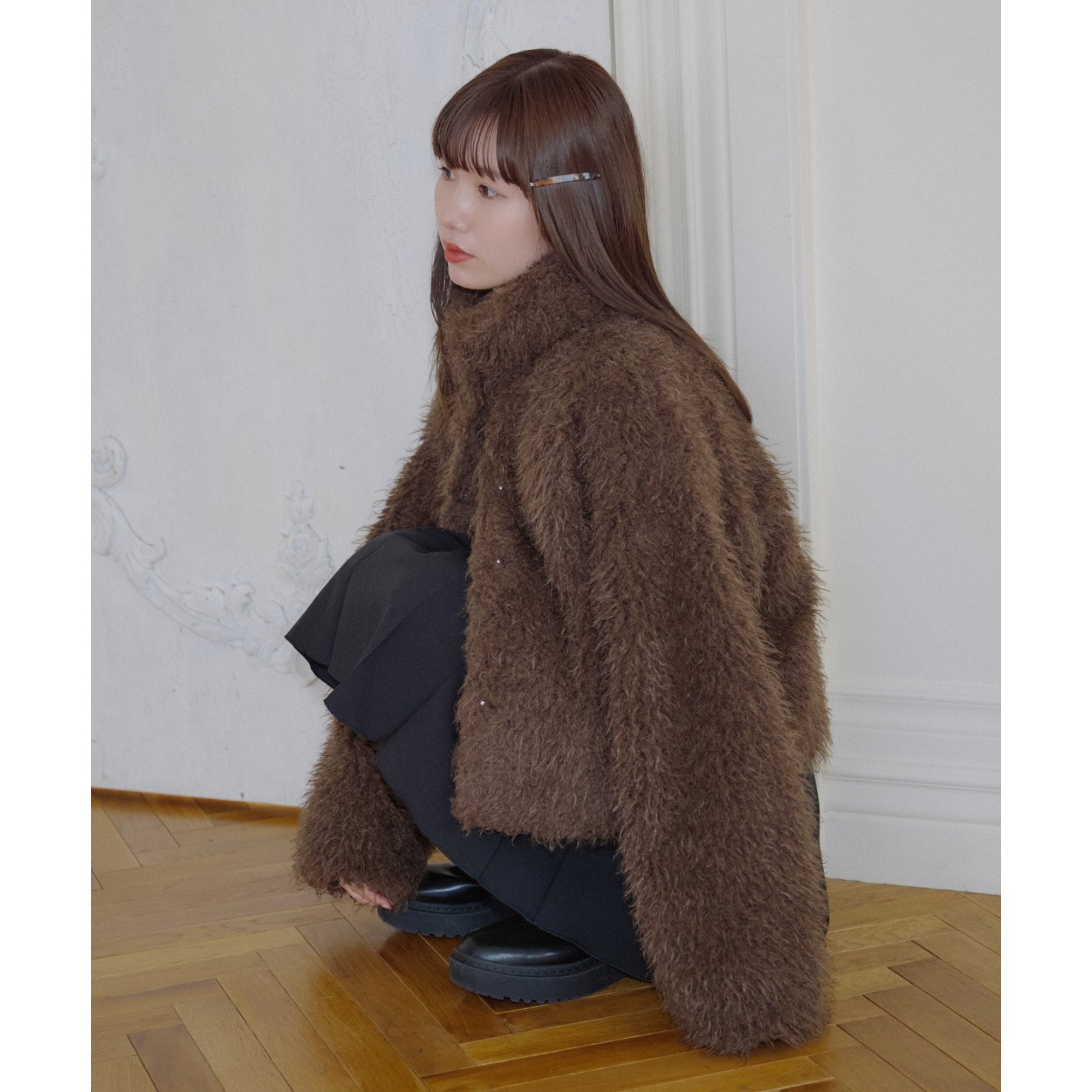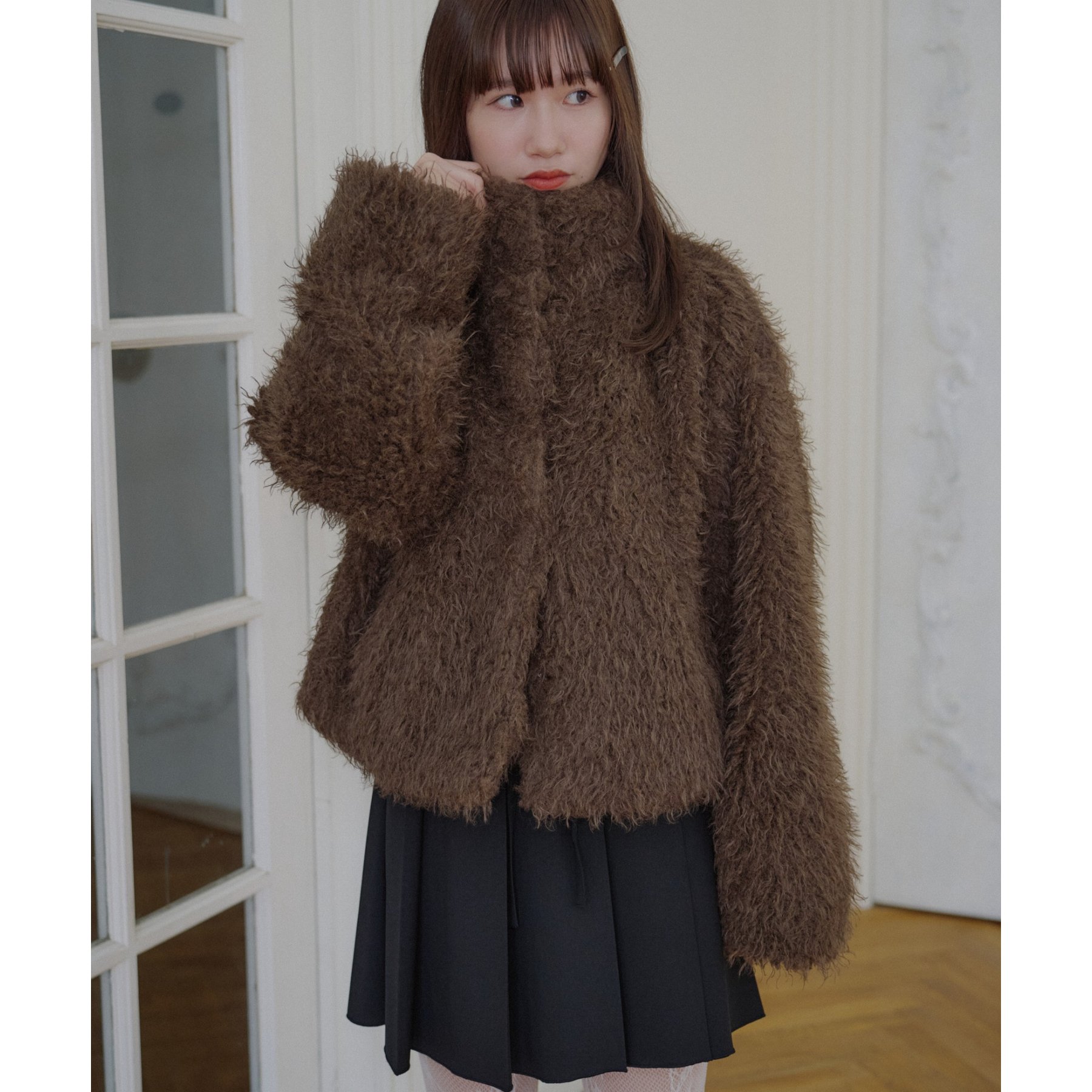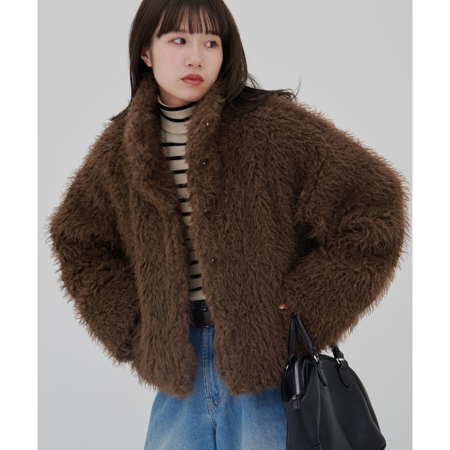 ブラウンはカーリーファー素材で、より立体感のある風合いに。