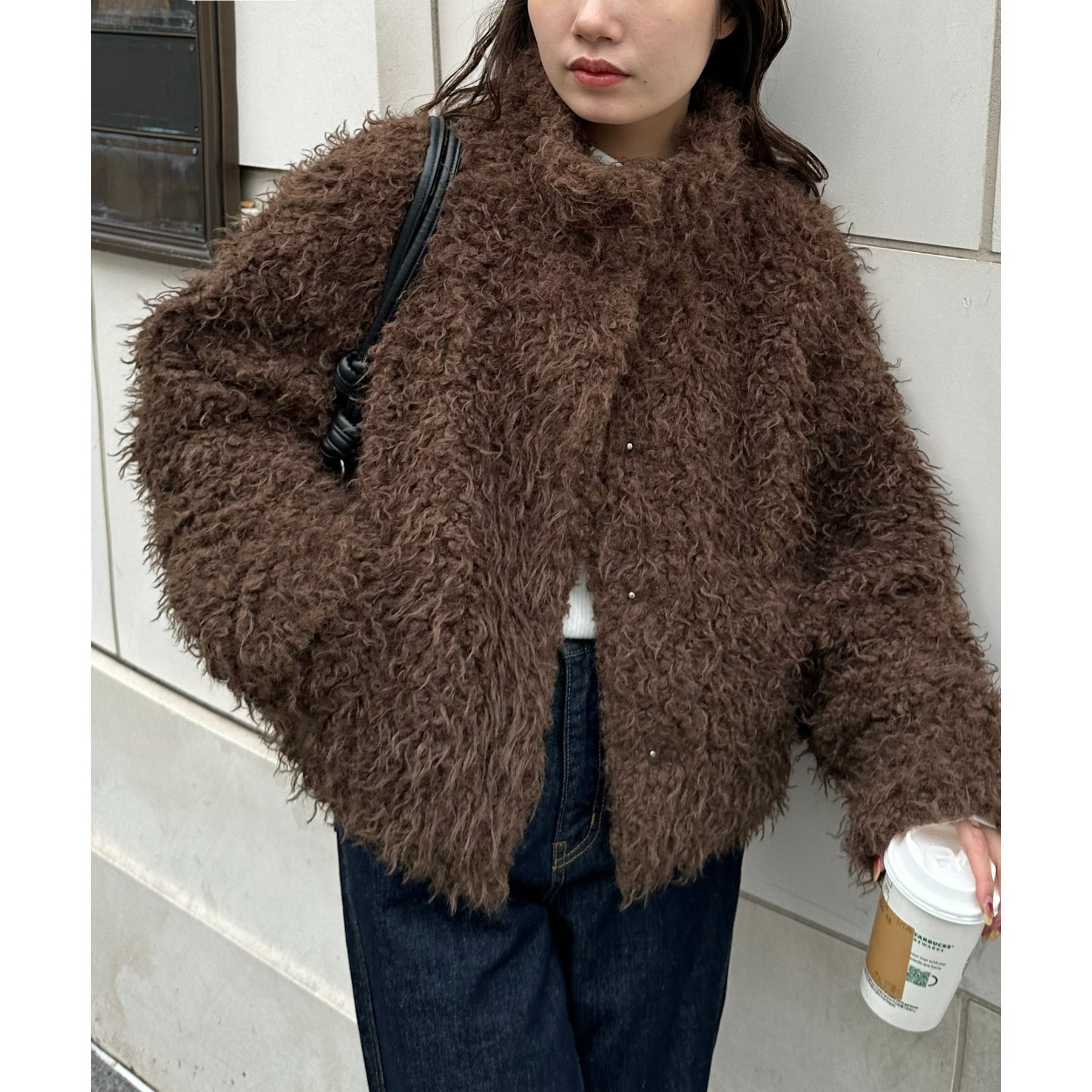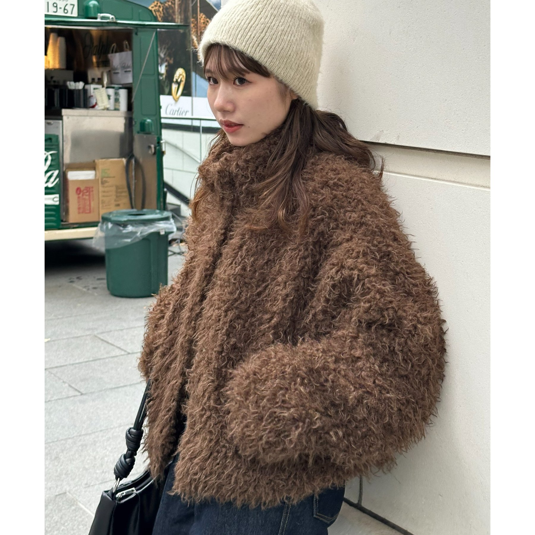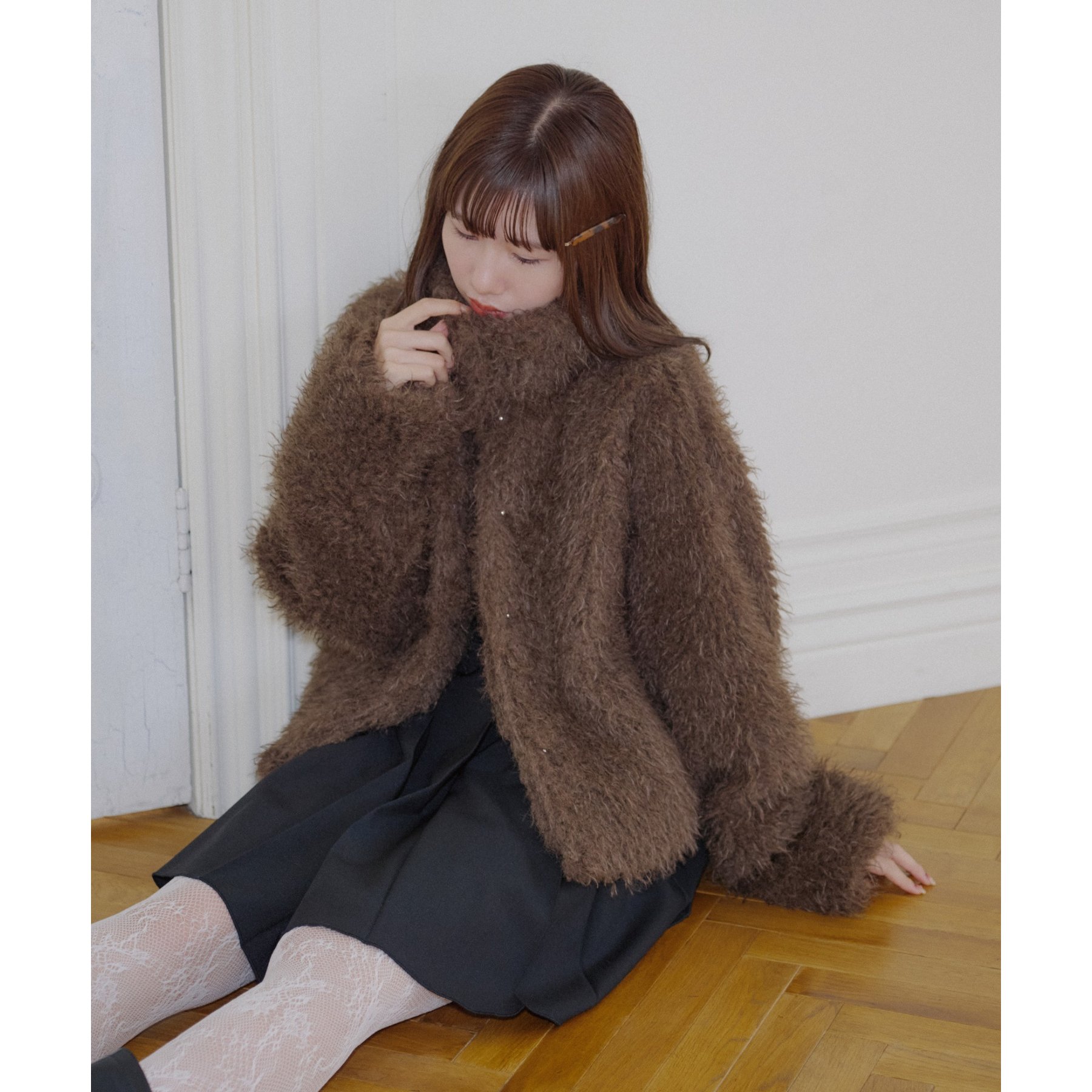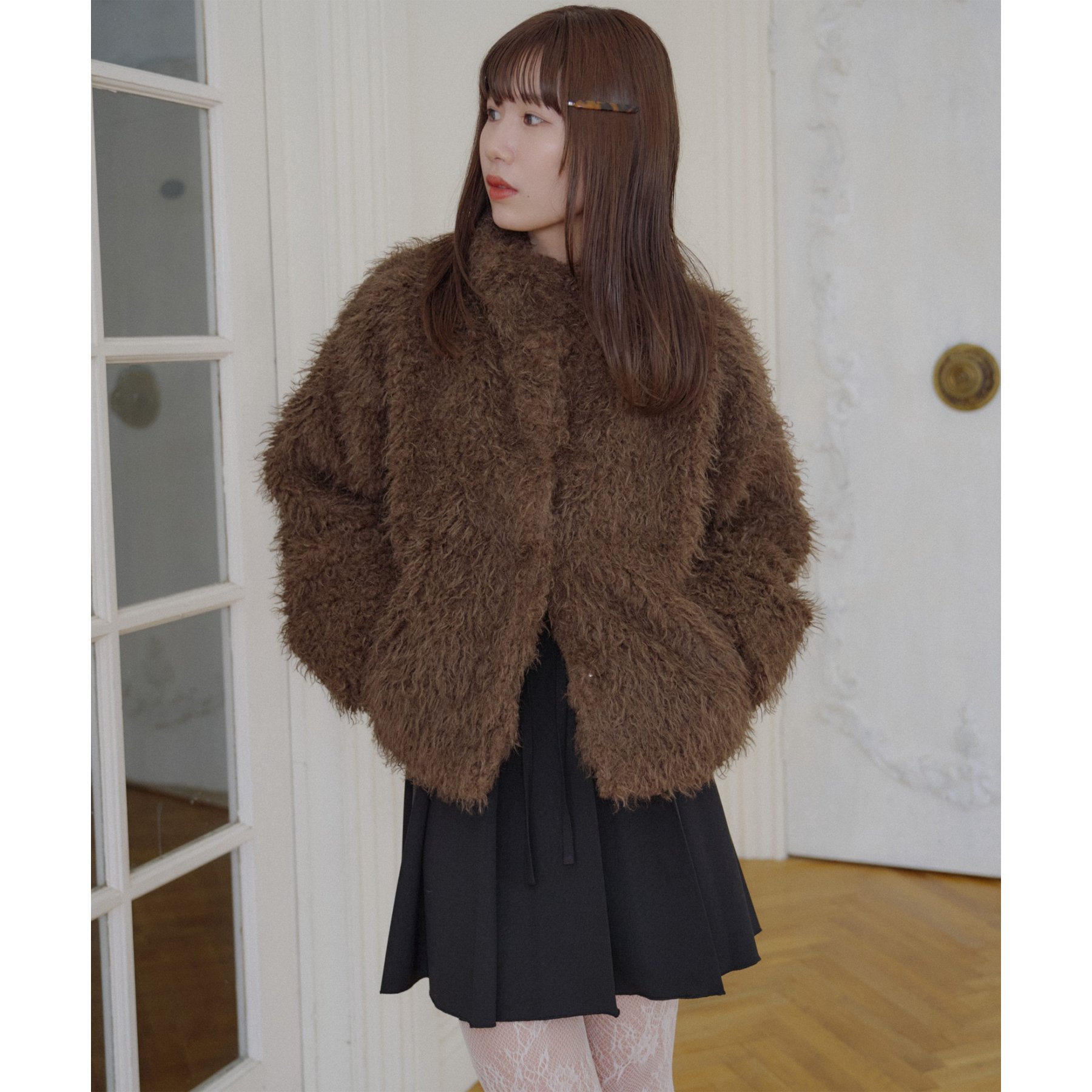 ブラウンはカーリーファー素材で、より立体感のある風合いに。