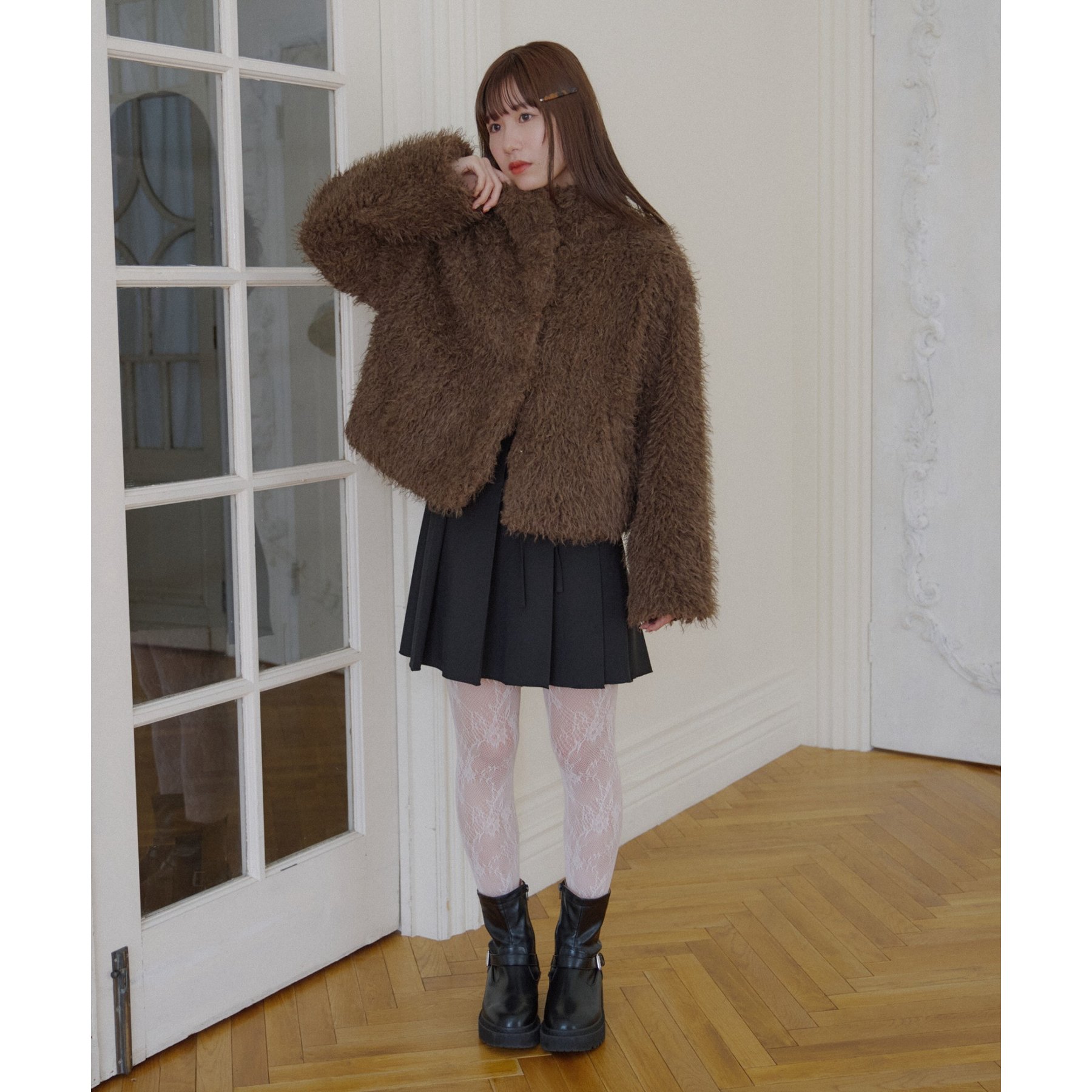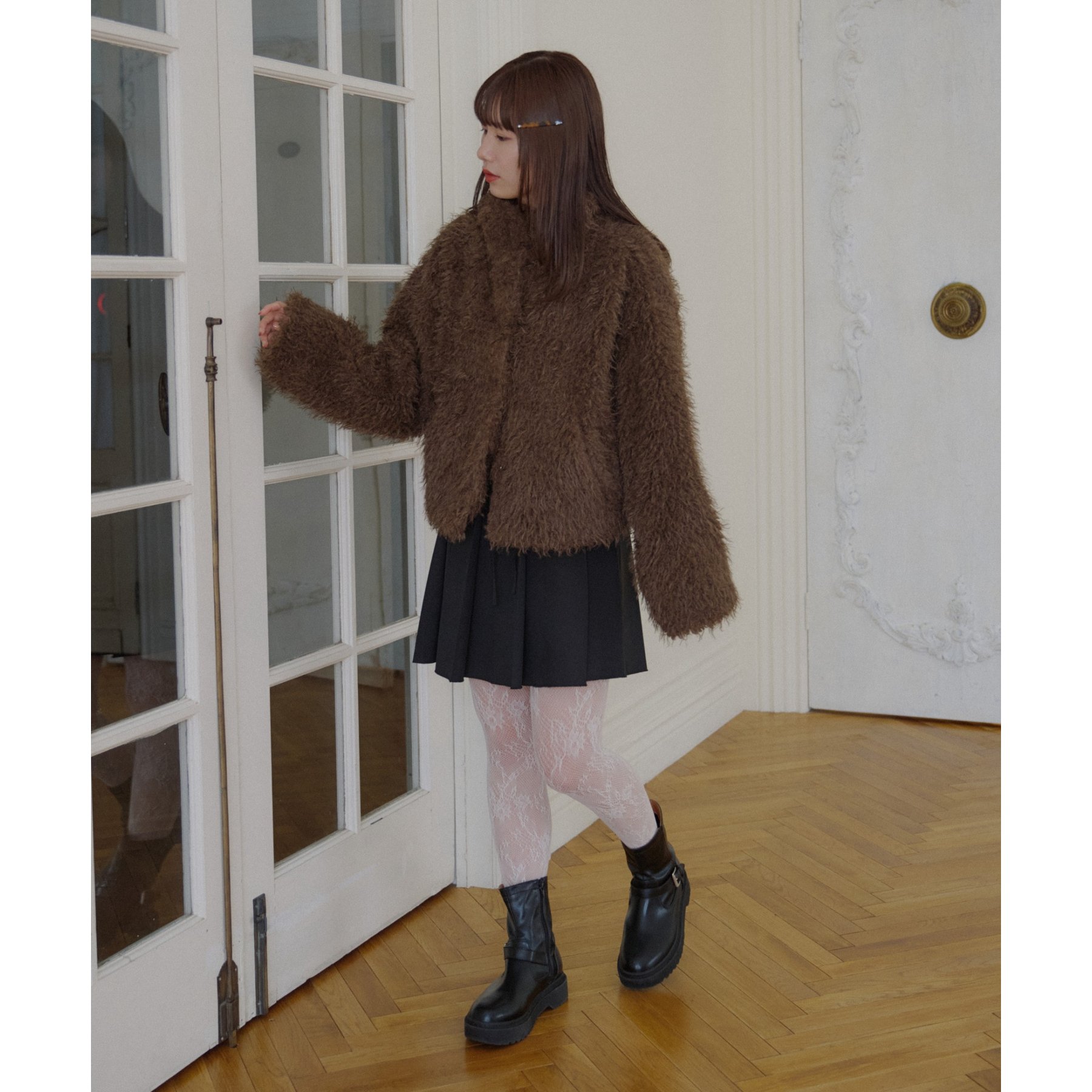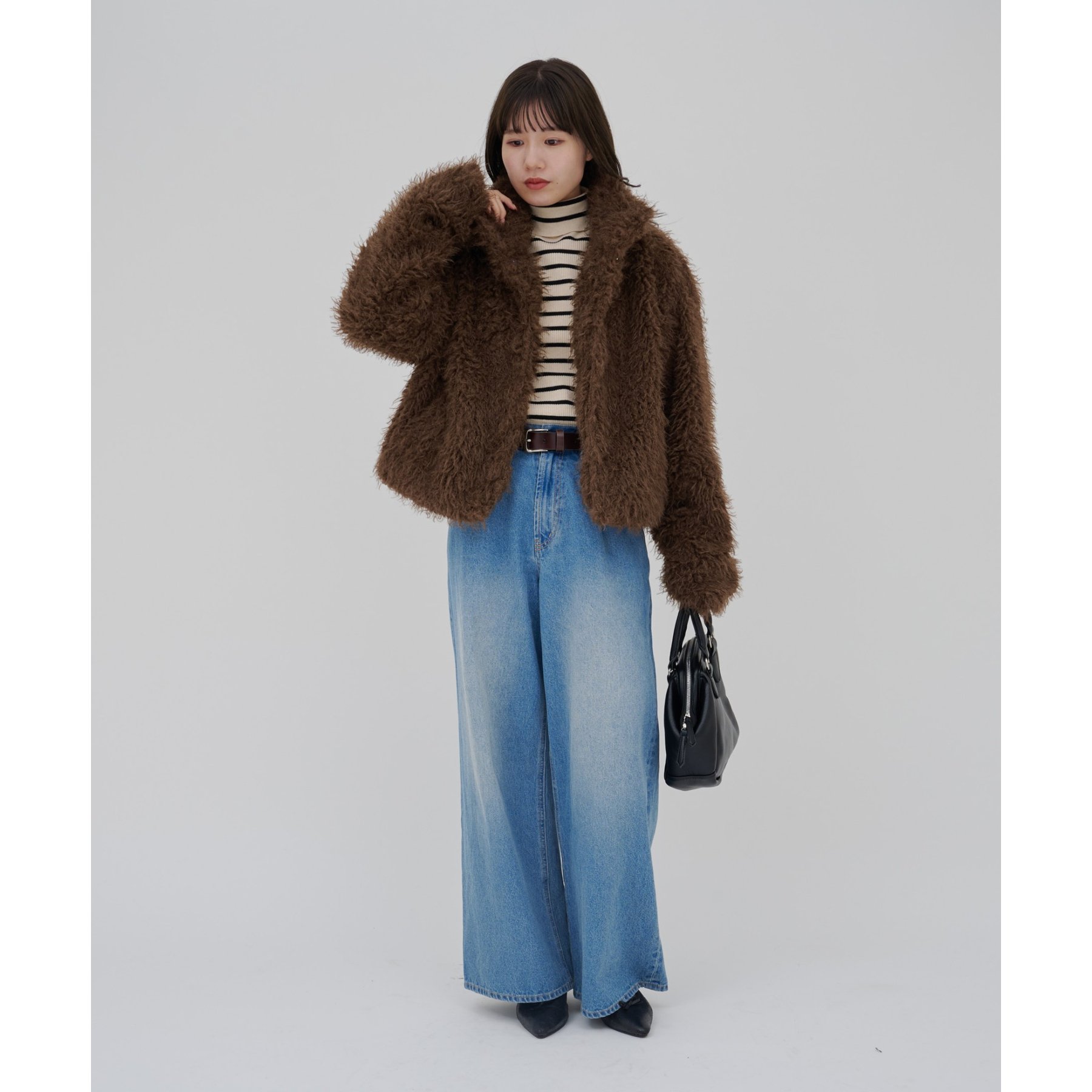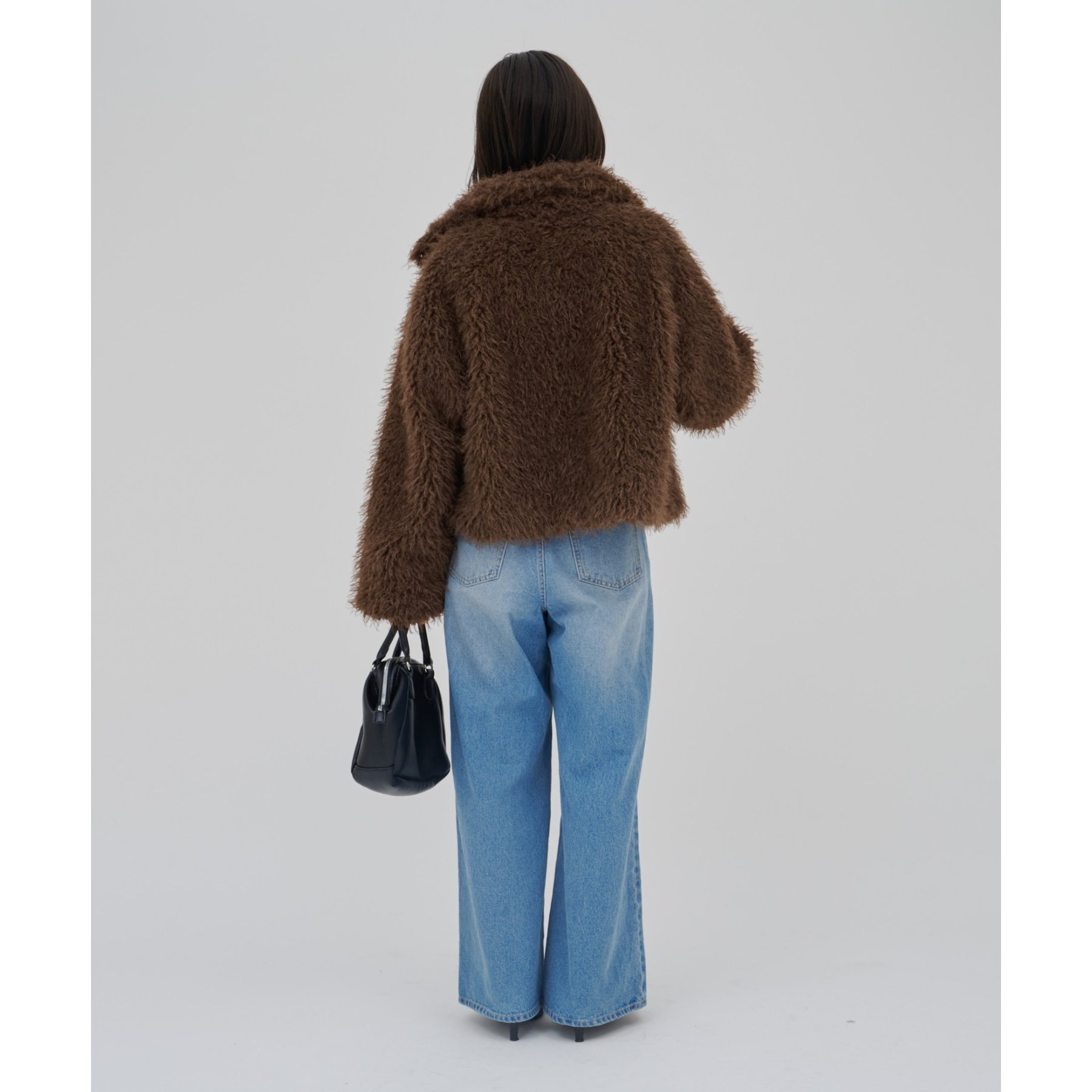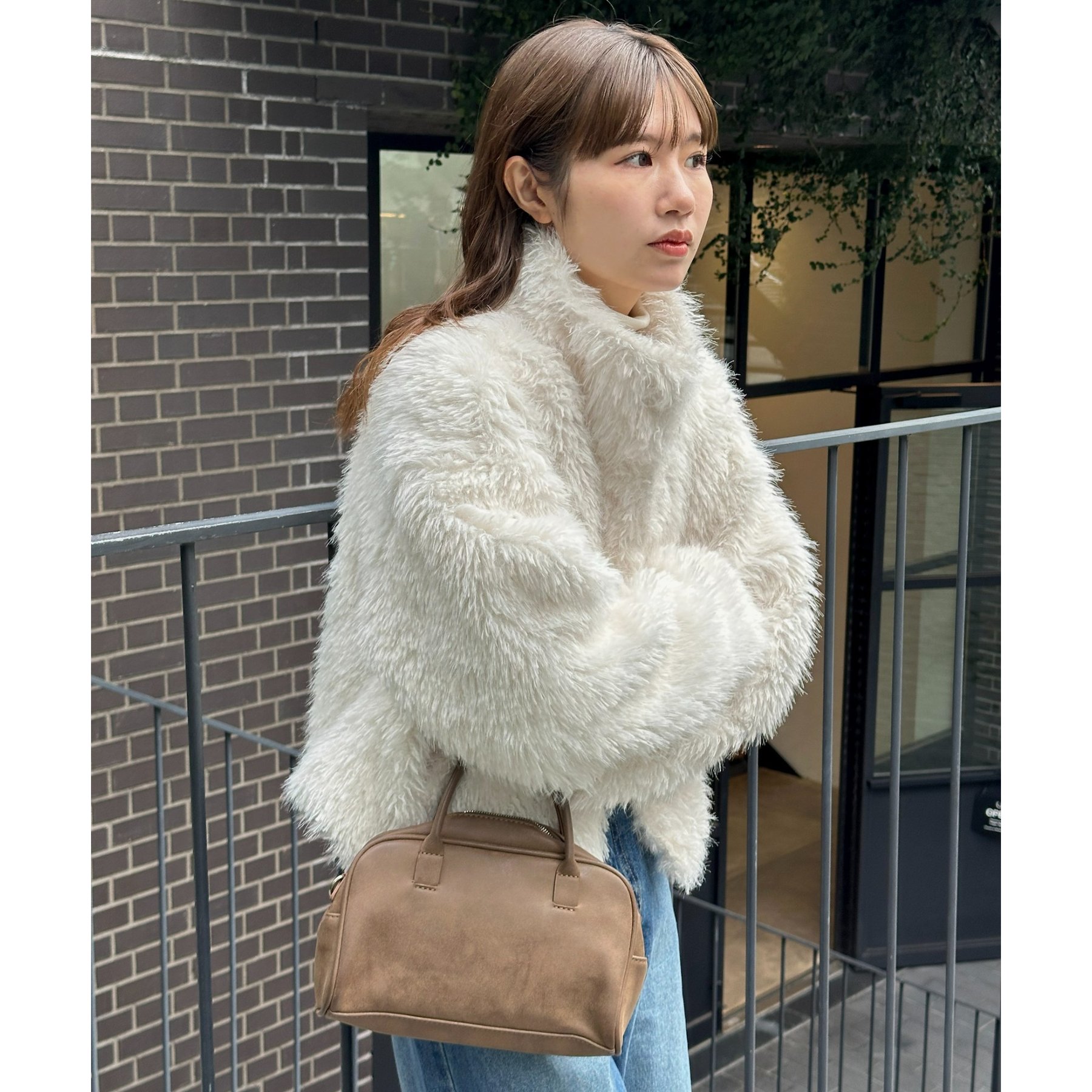 ブラウンはカーリーファー素材で、より立体感のある風合いに。