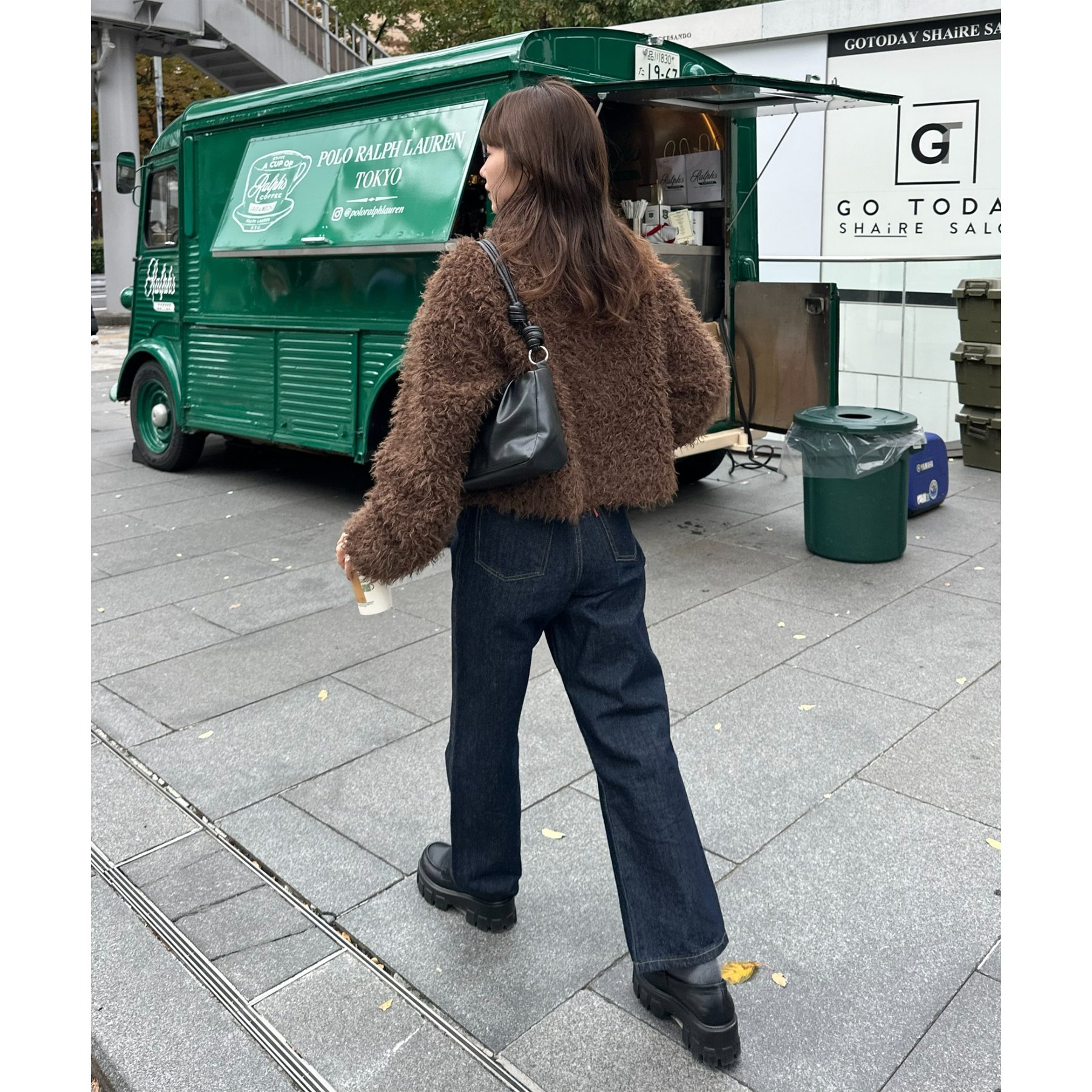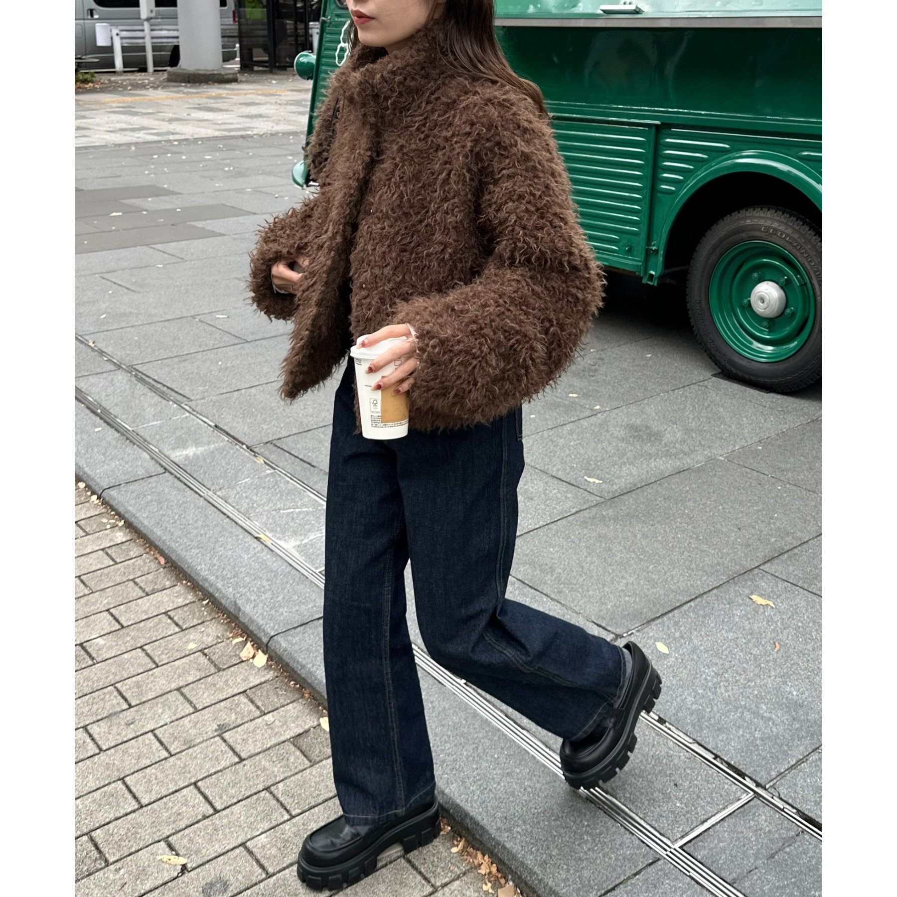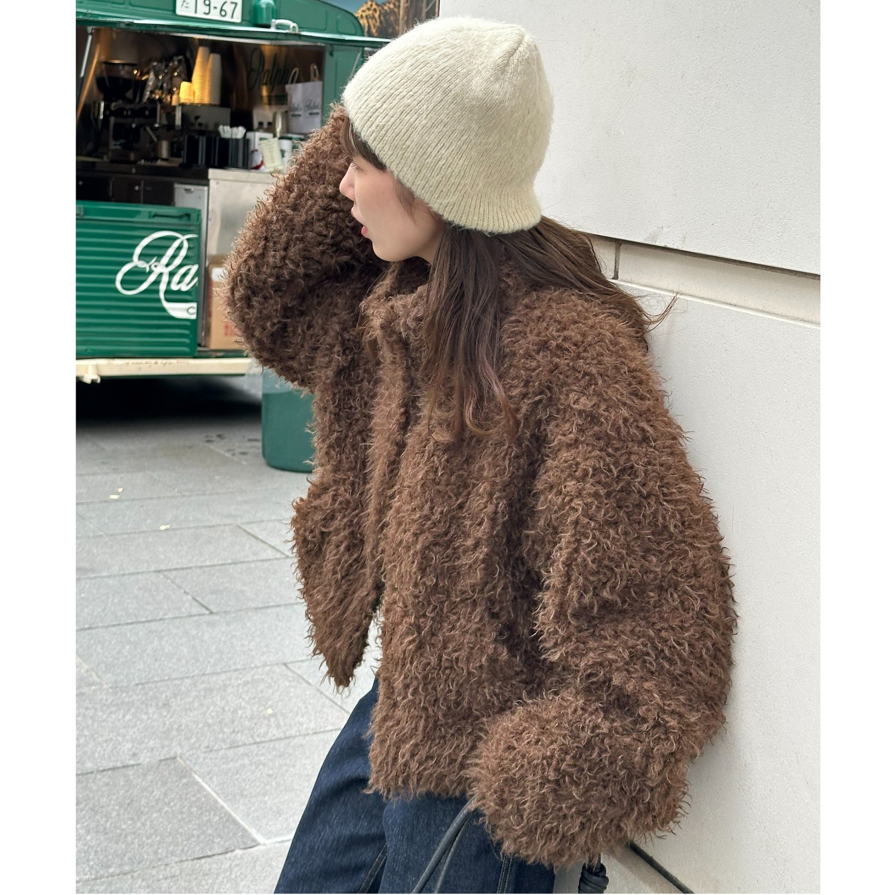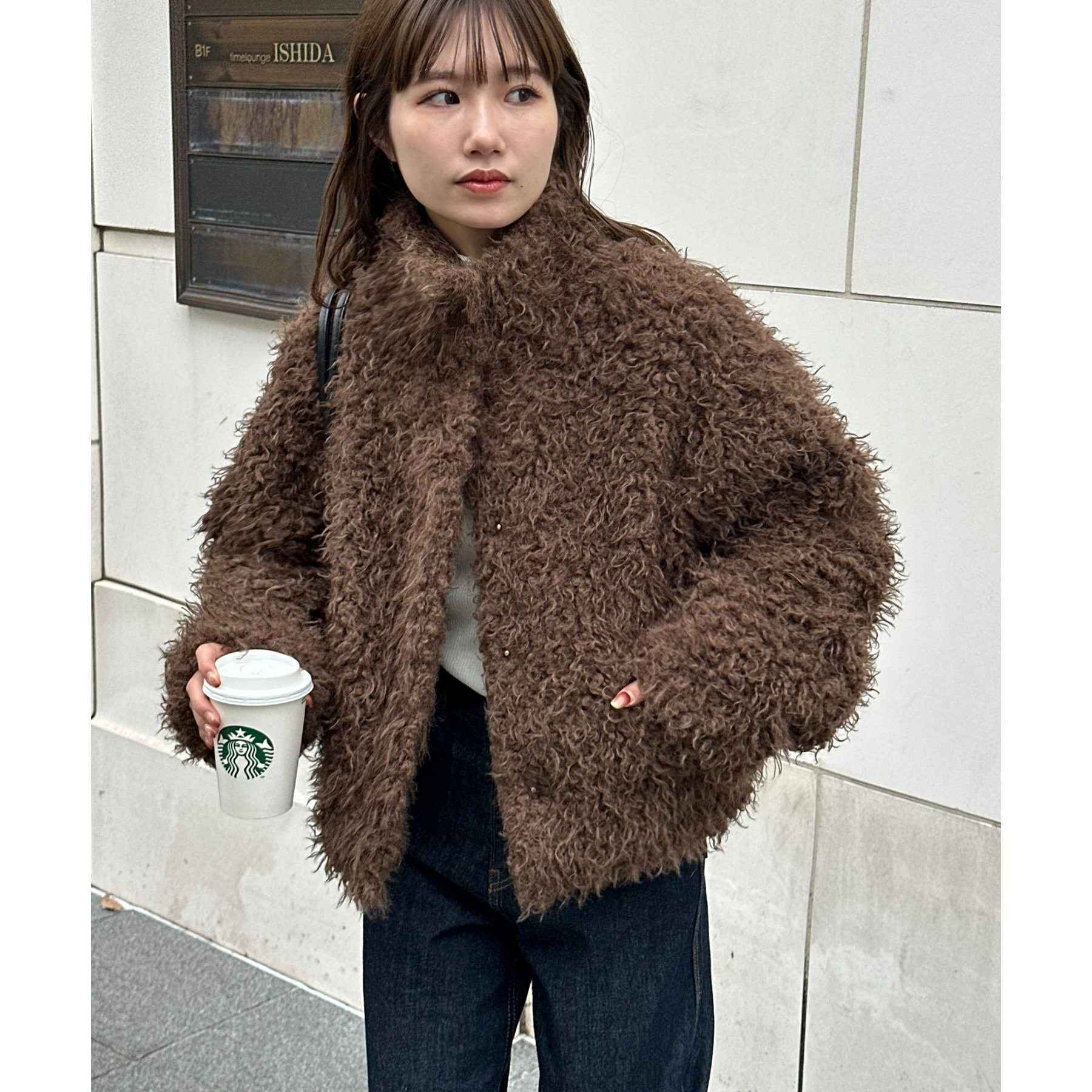 ブラウンはカーリーファー素材で、より立体感のある風合いに。