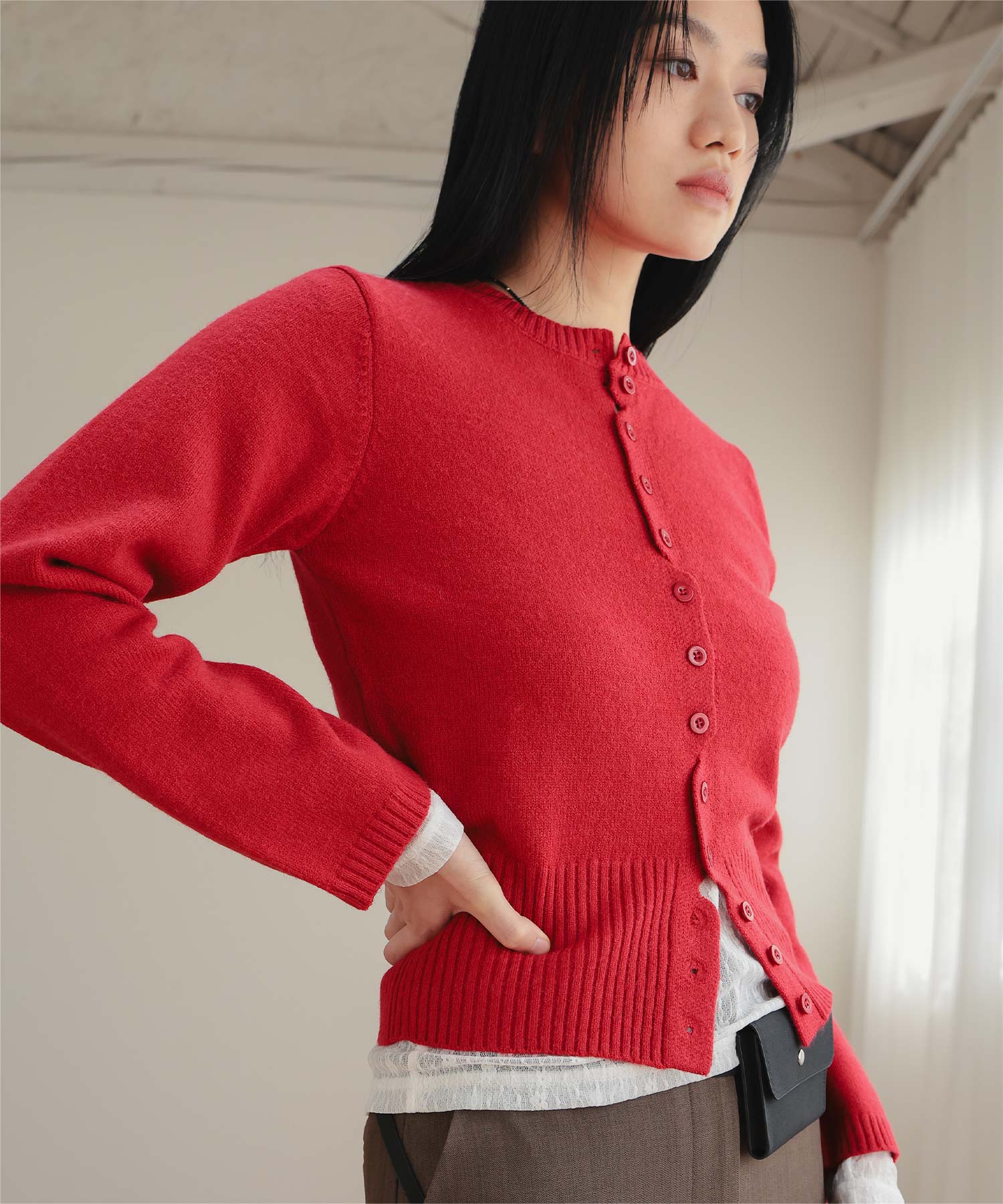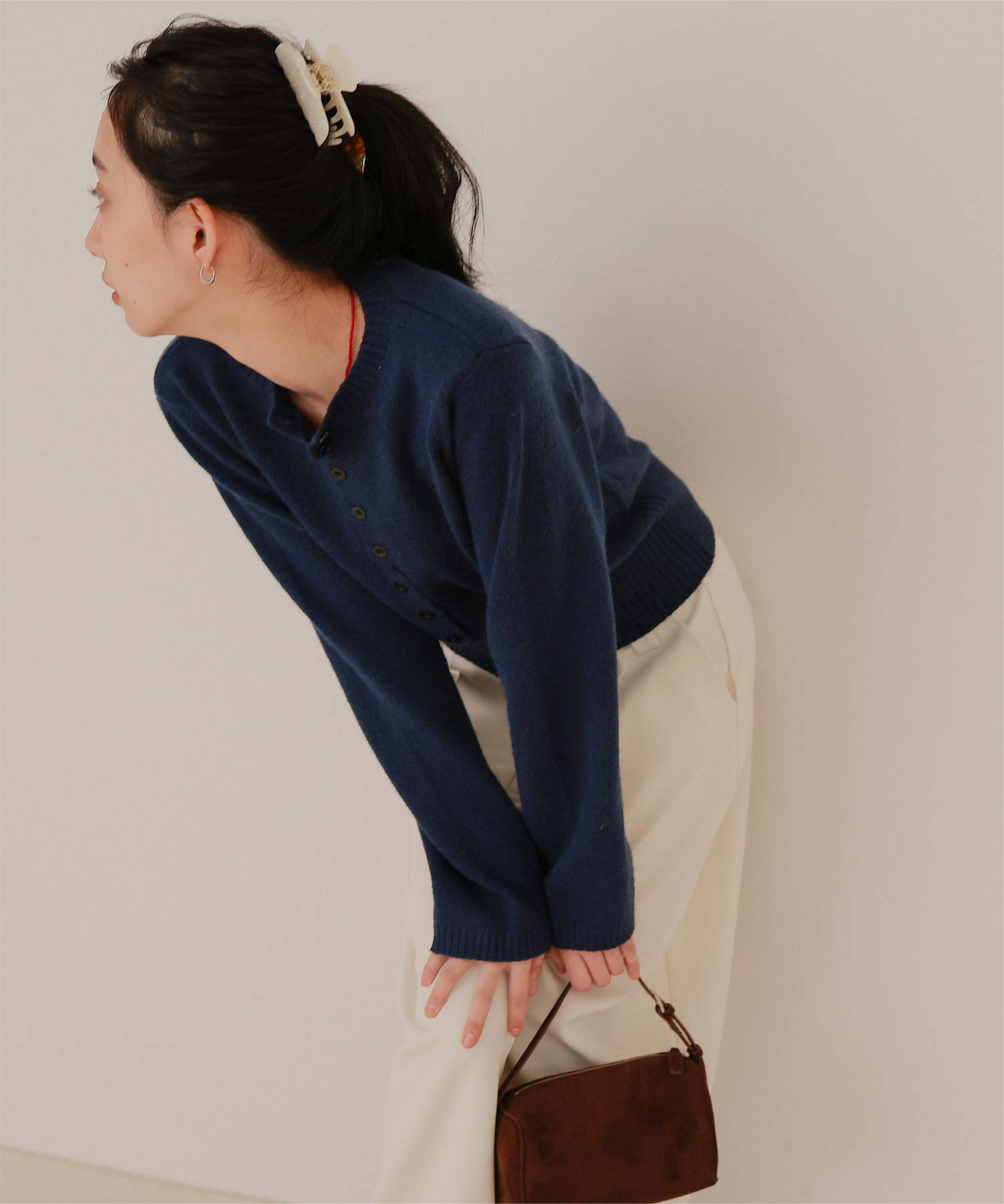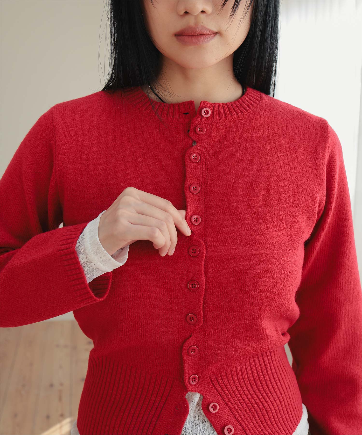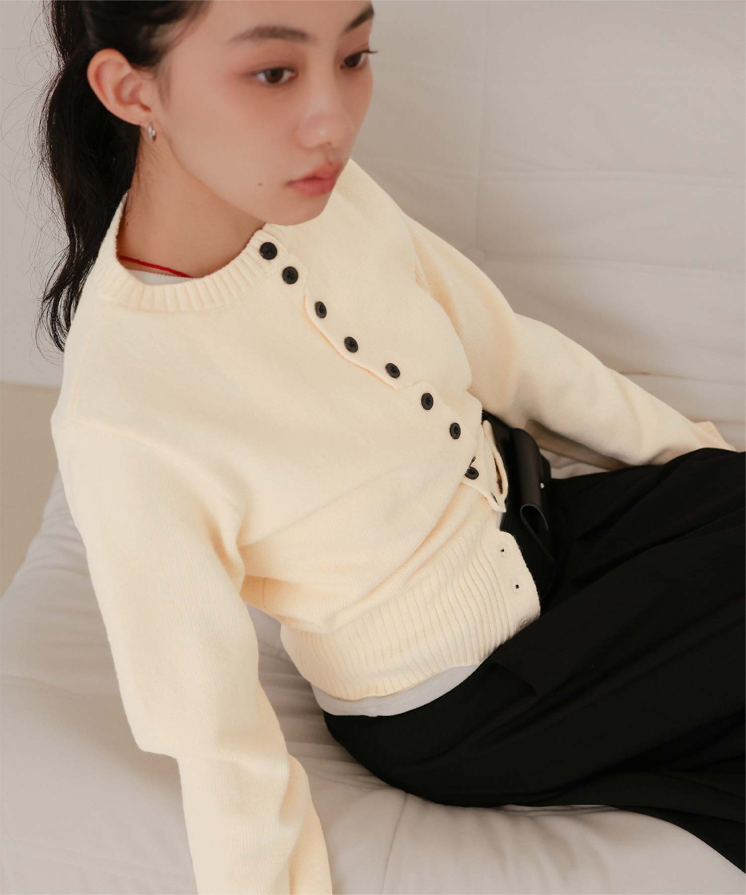 ・配色ボタンの前立てデザインがポイントのニットカーディガン