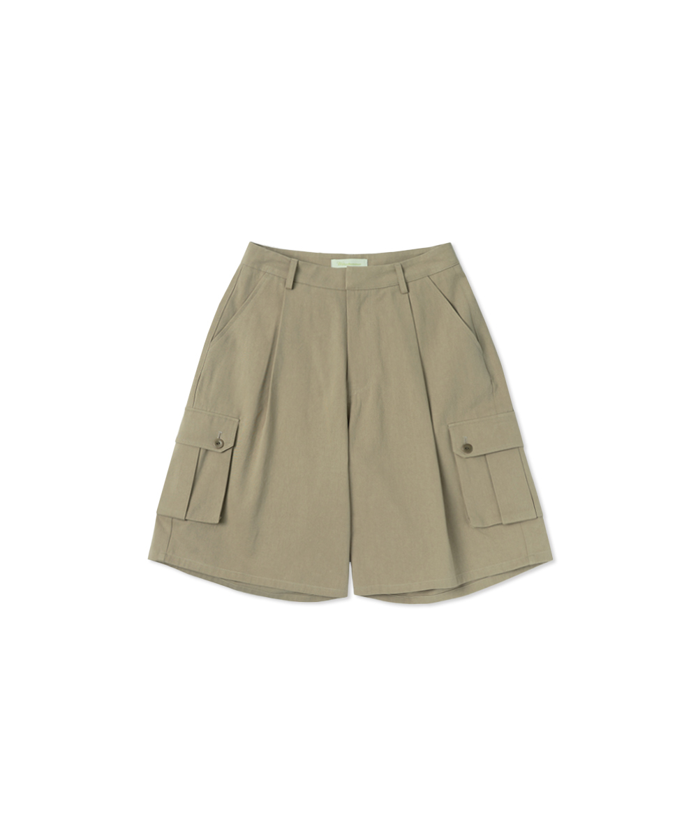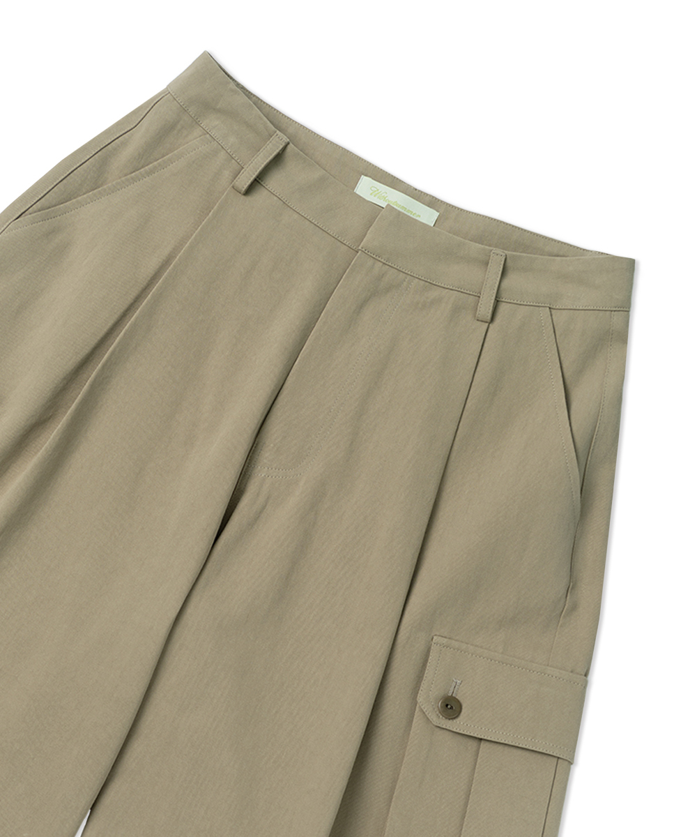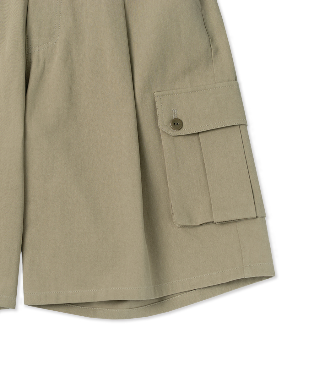 両サイドのカーゴポケットディテールが実用性とともにさりげないアクセントとなり、立体感のあるシルエットを完成させます。