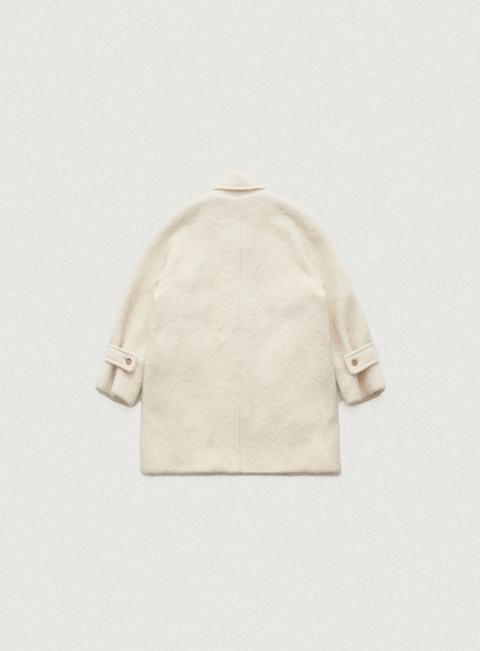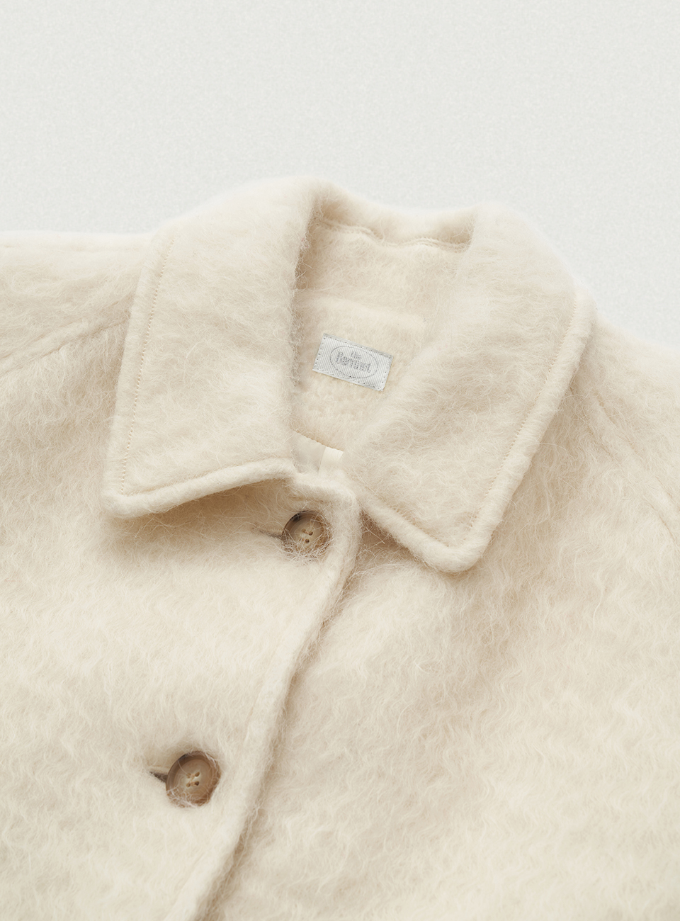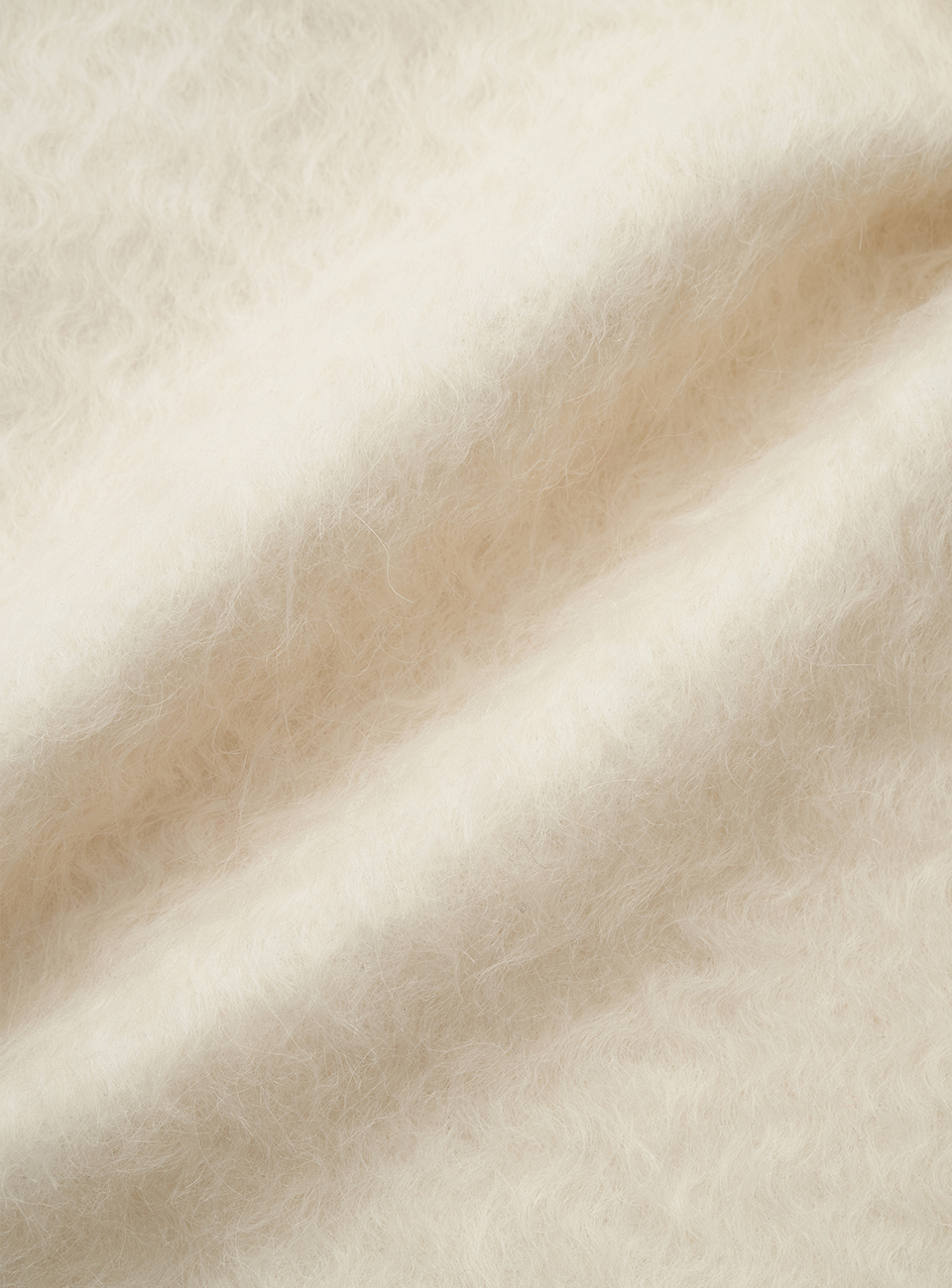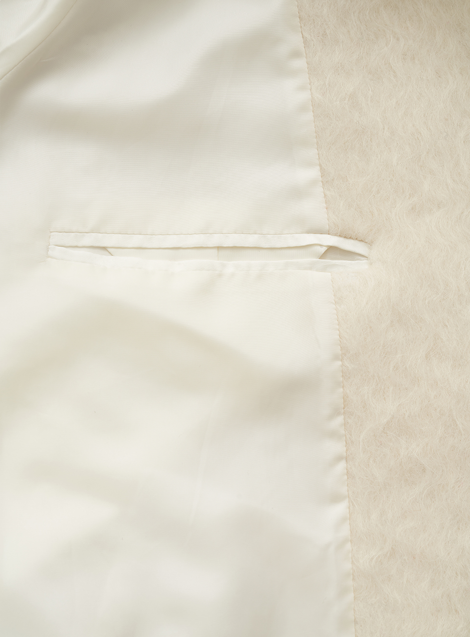 アイボリーカラーの柔らかくヘアリーなテクスチャーが特徴のウール混紡ロングパイルファブリック。