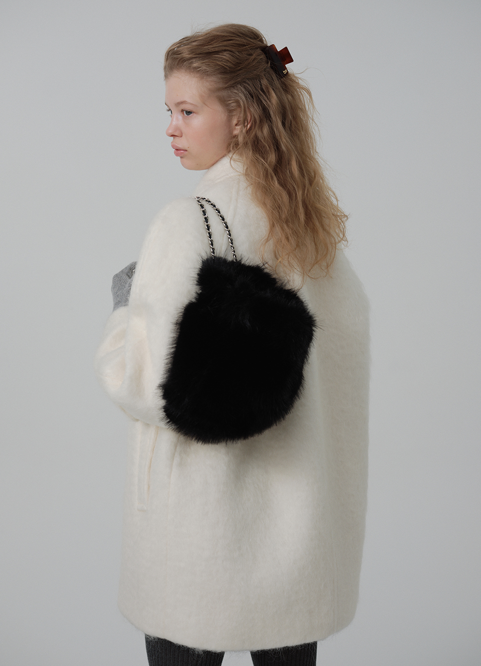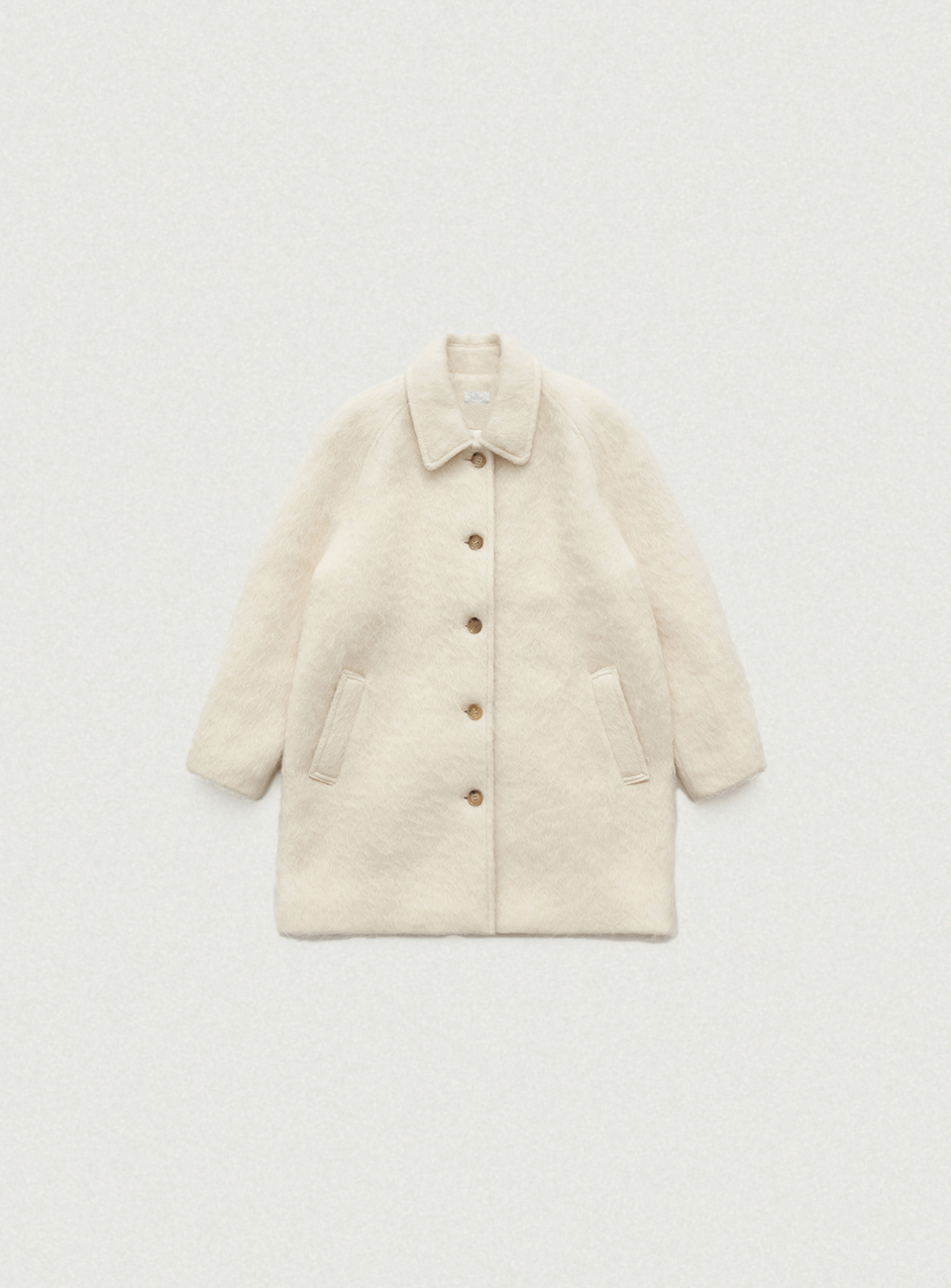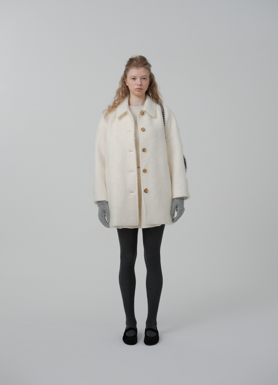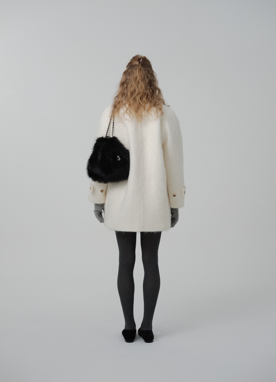 アイボリーカラーの柔らかくヘアリーなテクスチャーが特徴のウール混紡ロングパイルファブリック。