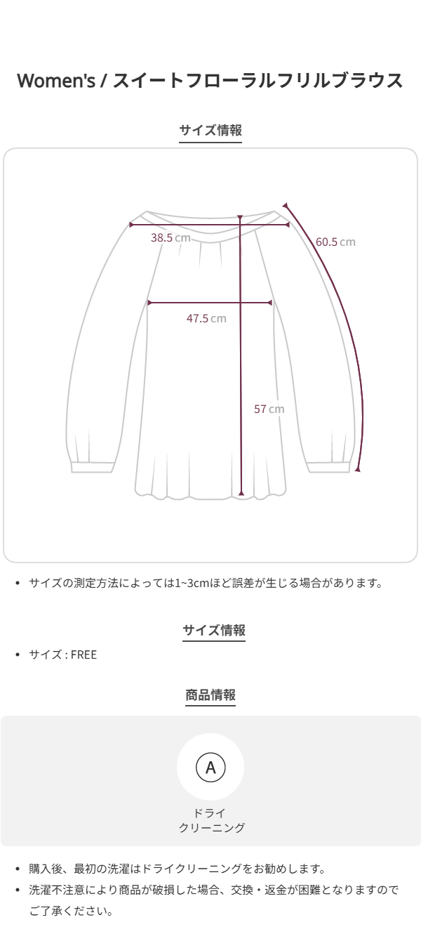 着丈 F:57cm バスト F:95cm 肩幅 F:38.5cm 袖丈 F:60.5cm