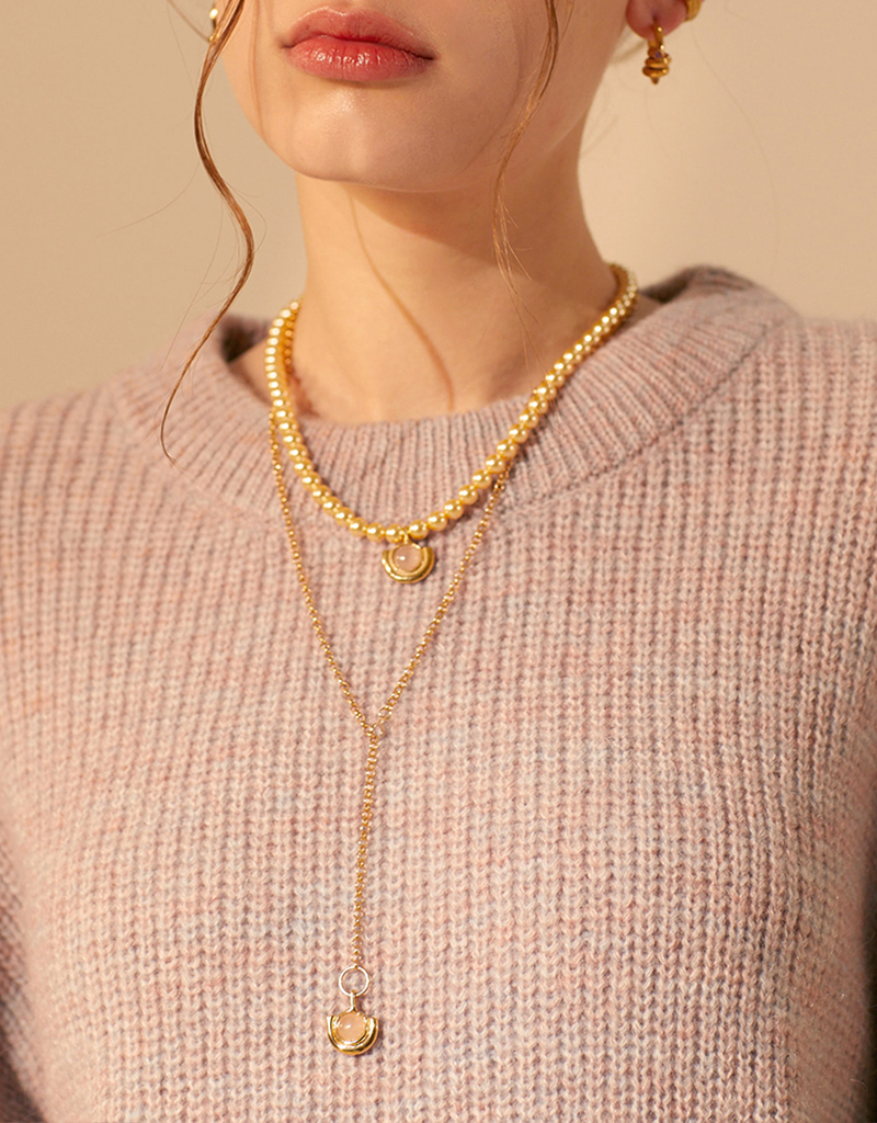 チェーンの先をお好みの位置に留めて、ロングネックレスとしても、短くしてチョーカーとしても着用可能。