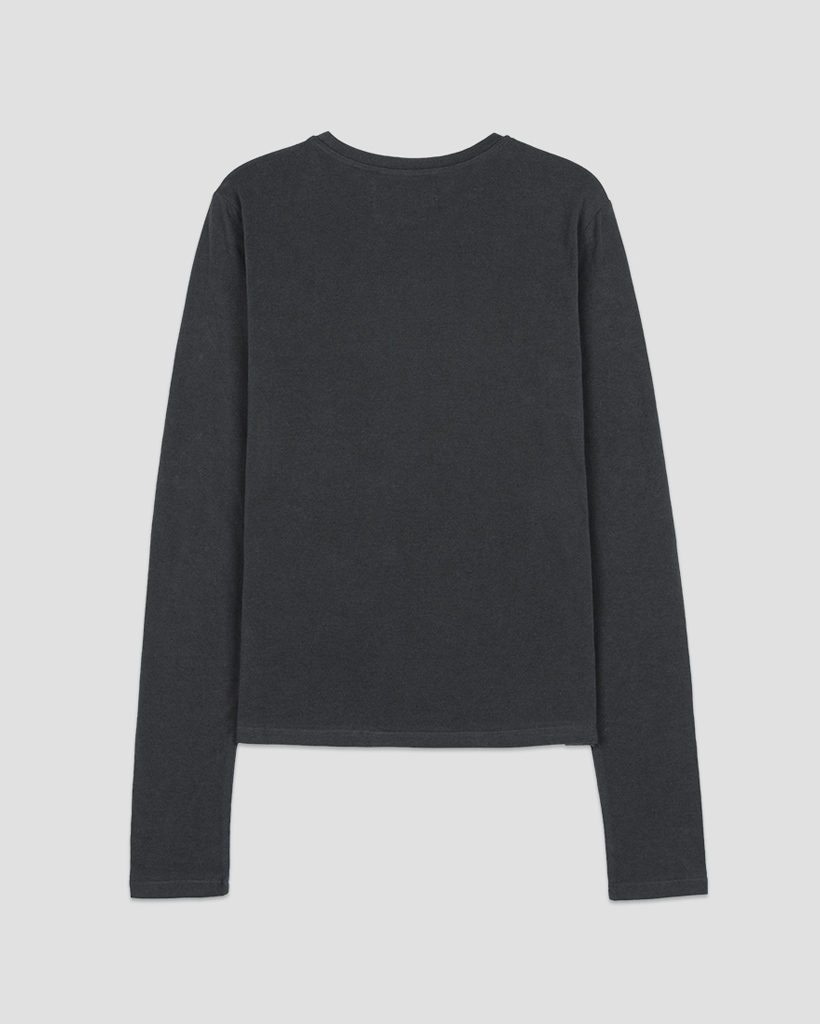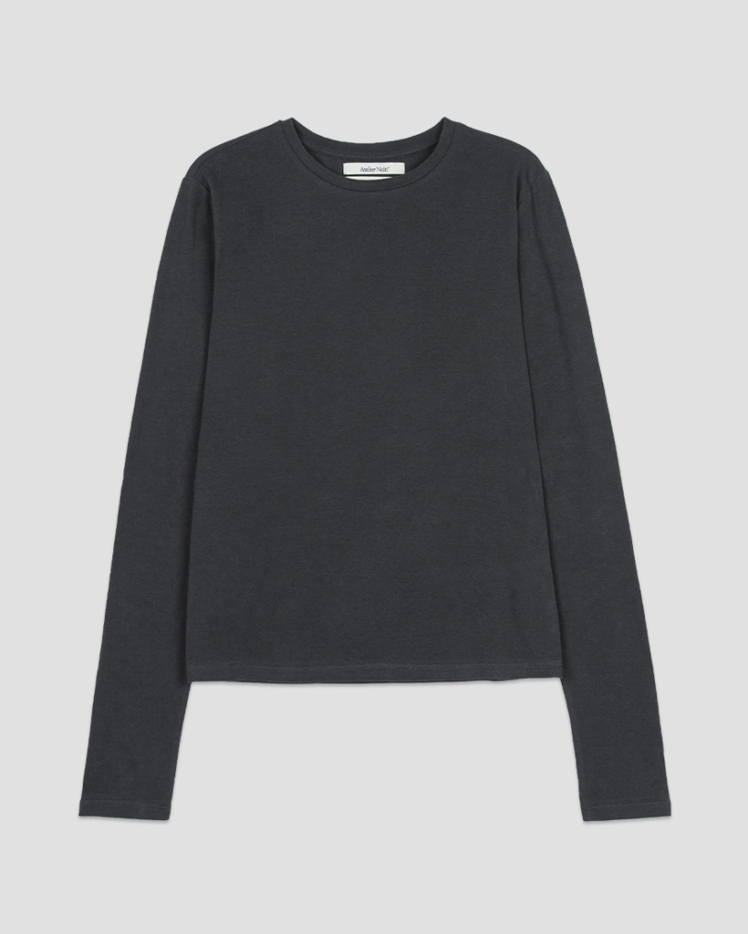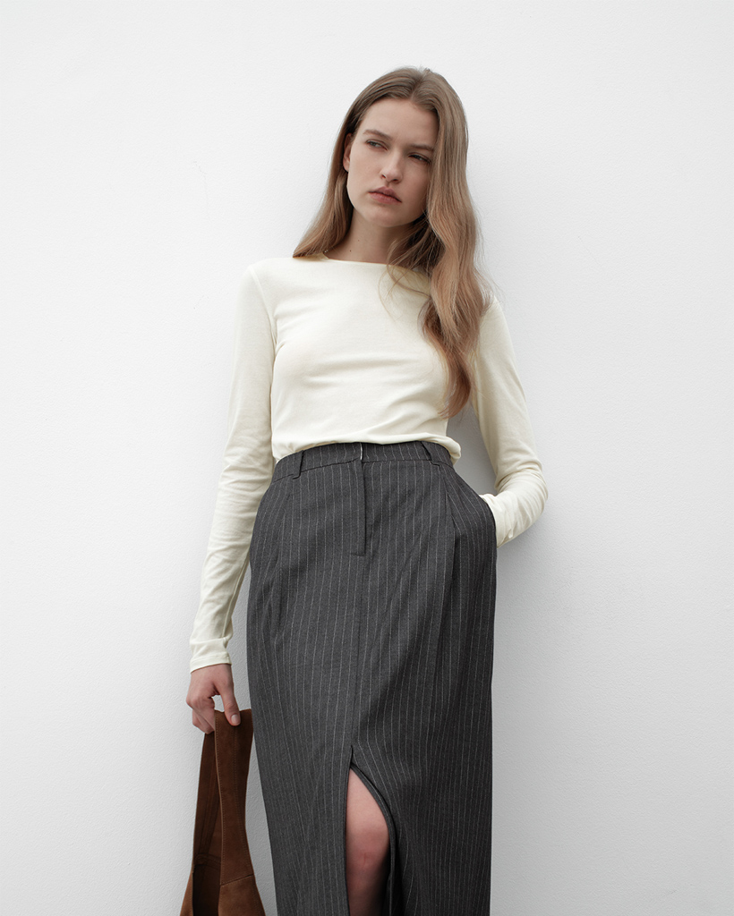 シアーな素材と細めのネックリブ、長めの袖丈がフェミニンな印象を与えるアイテム。