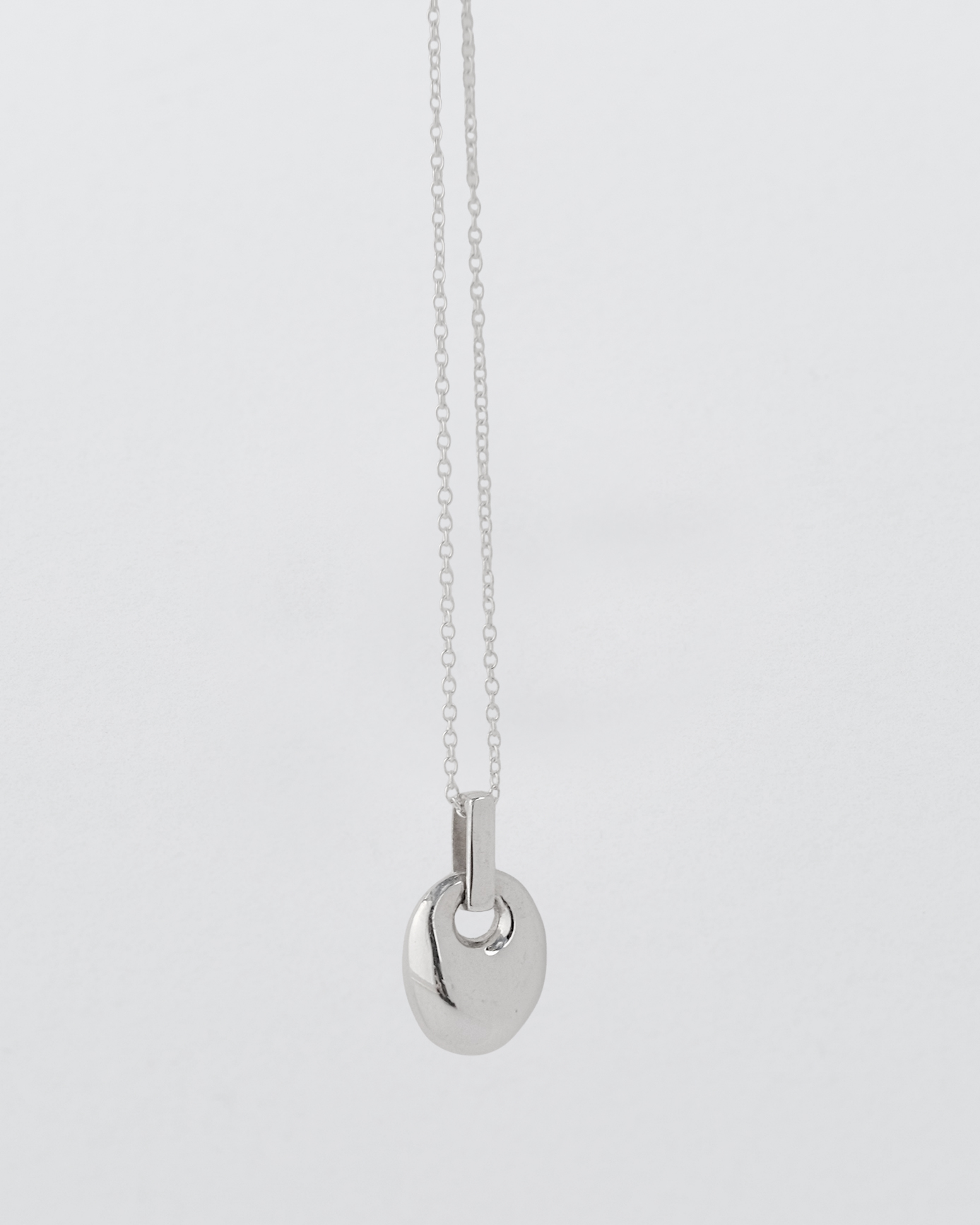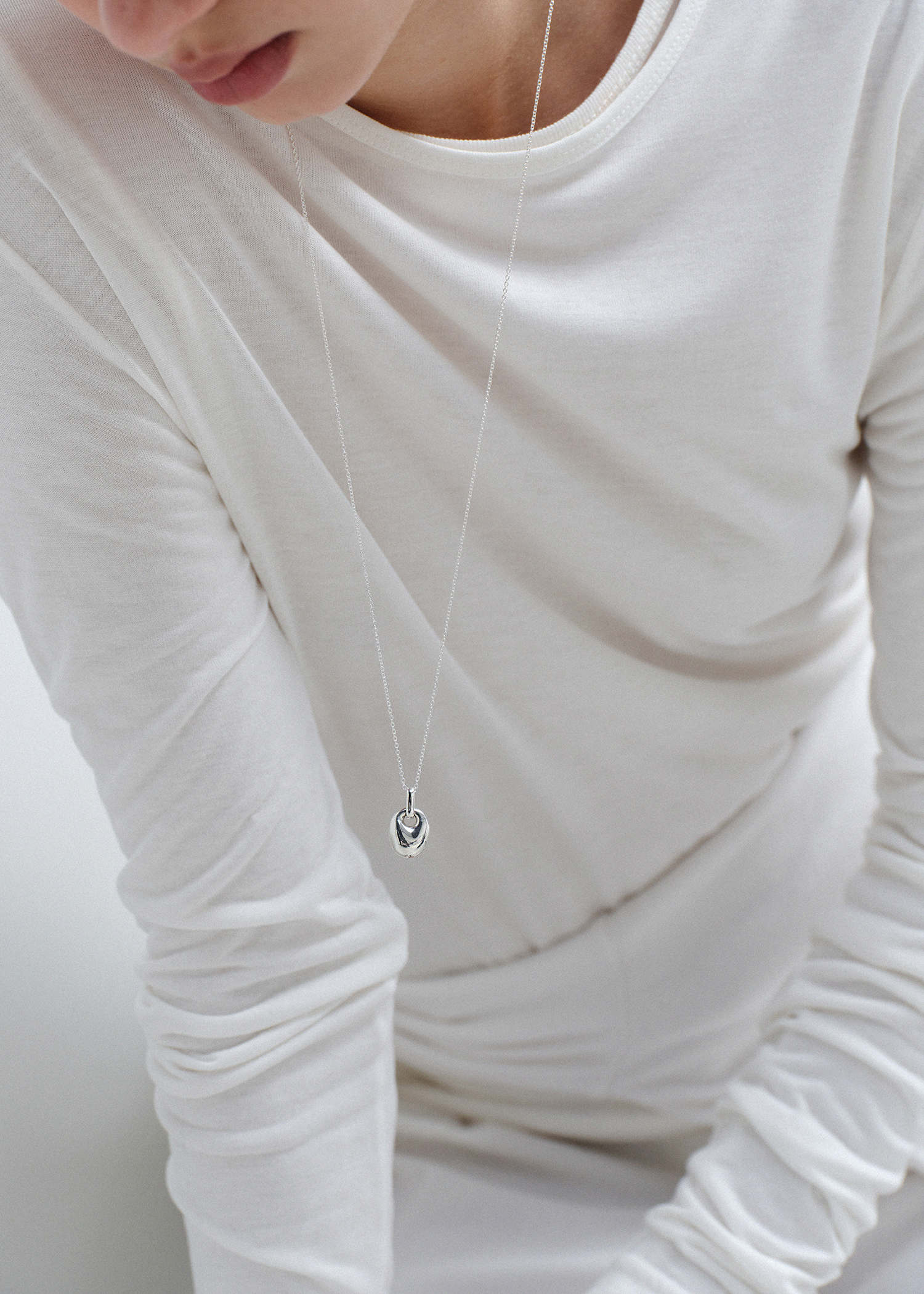 ロングチェーンに、すっきりとしたラインの丸いシェイプのペンダントが際立つネックレスです。