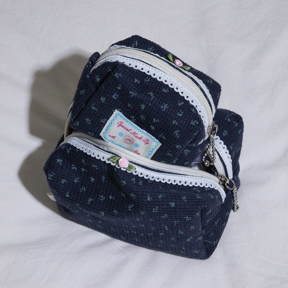 ファブリック スクエア ポーチ フラワー ネイビー L