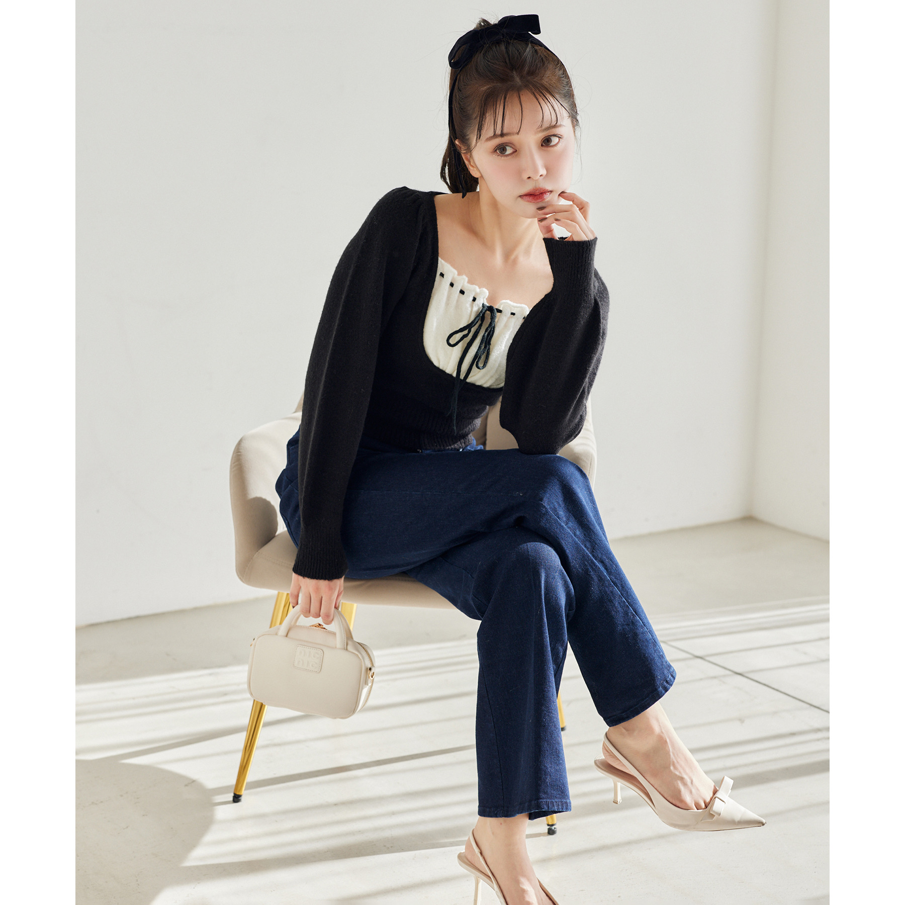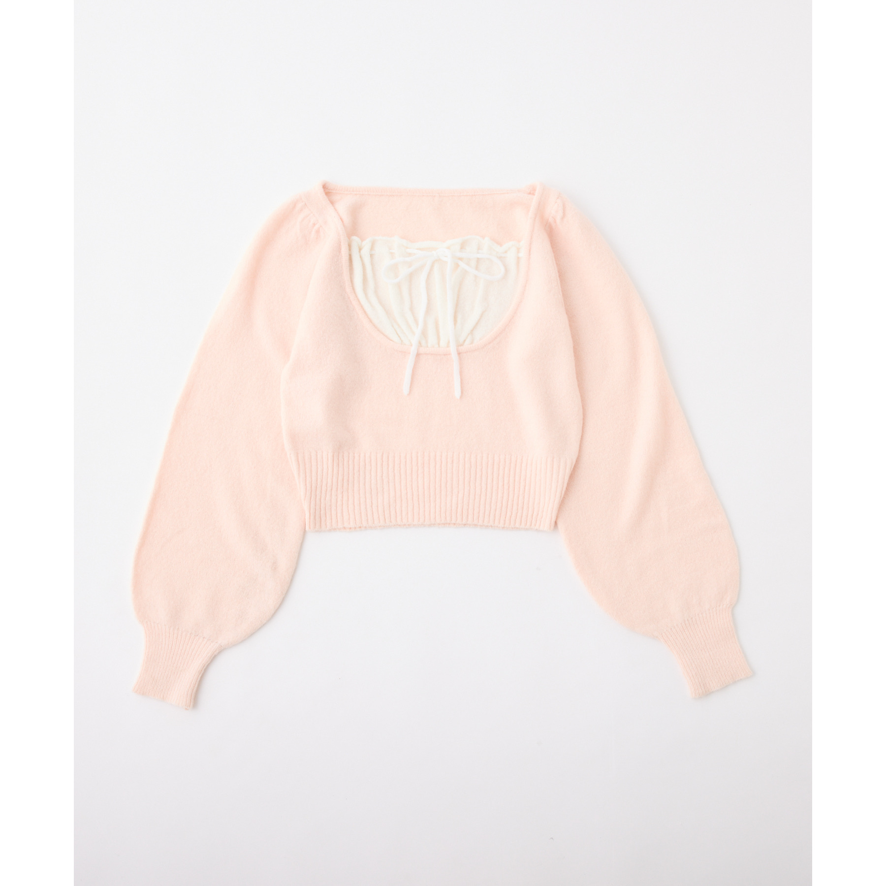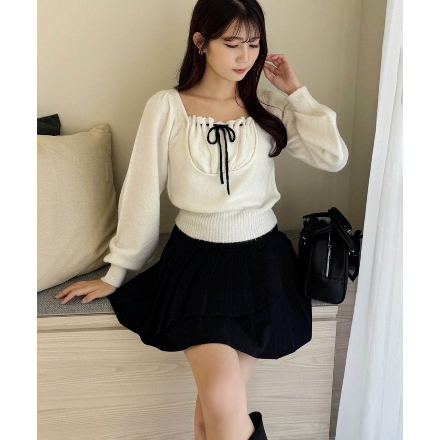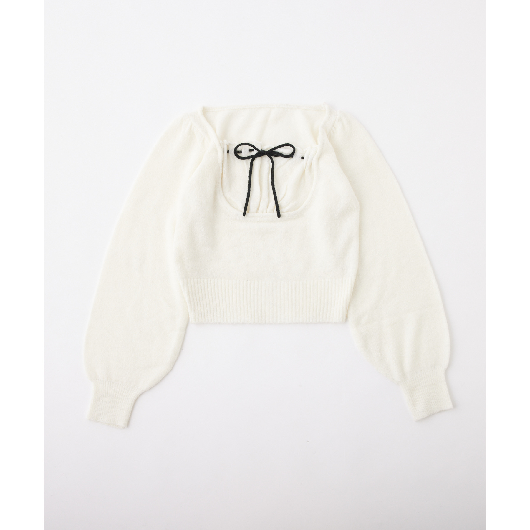 胸元にはリボンを施し、シンプルなデザインの中に甘さもプラスされたアイテムです。