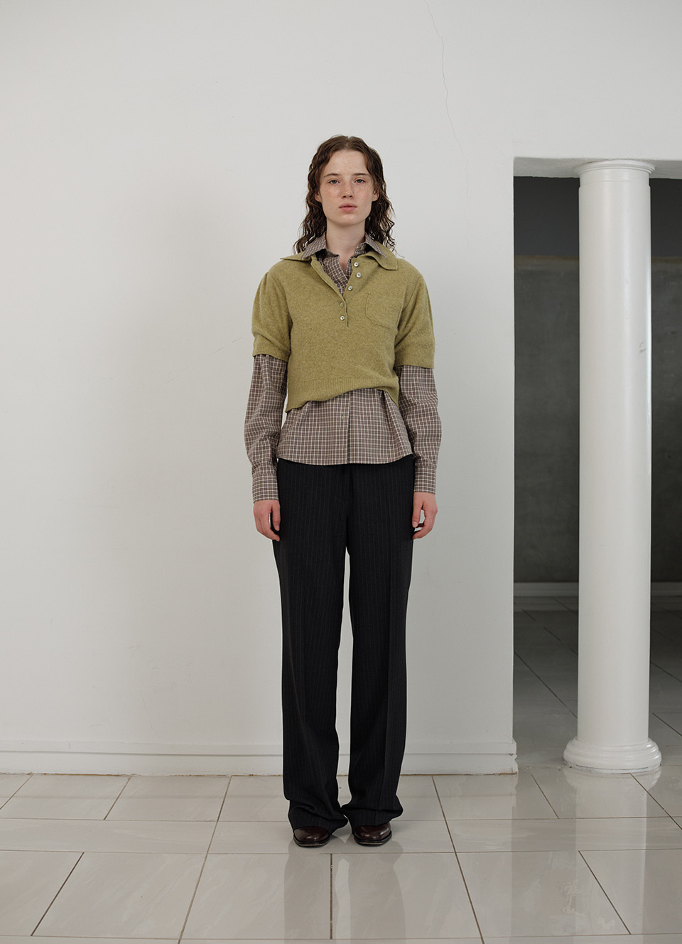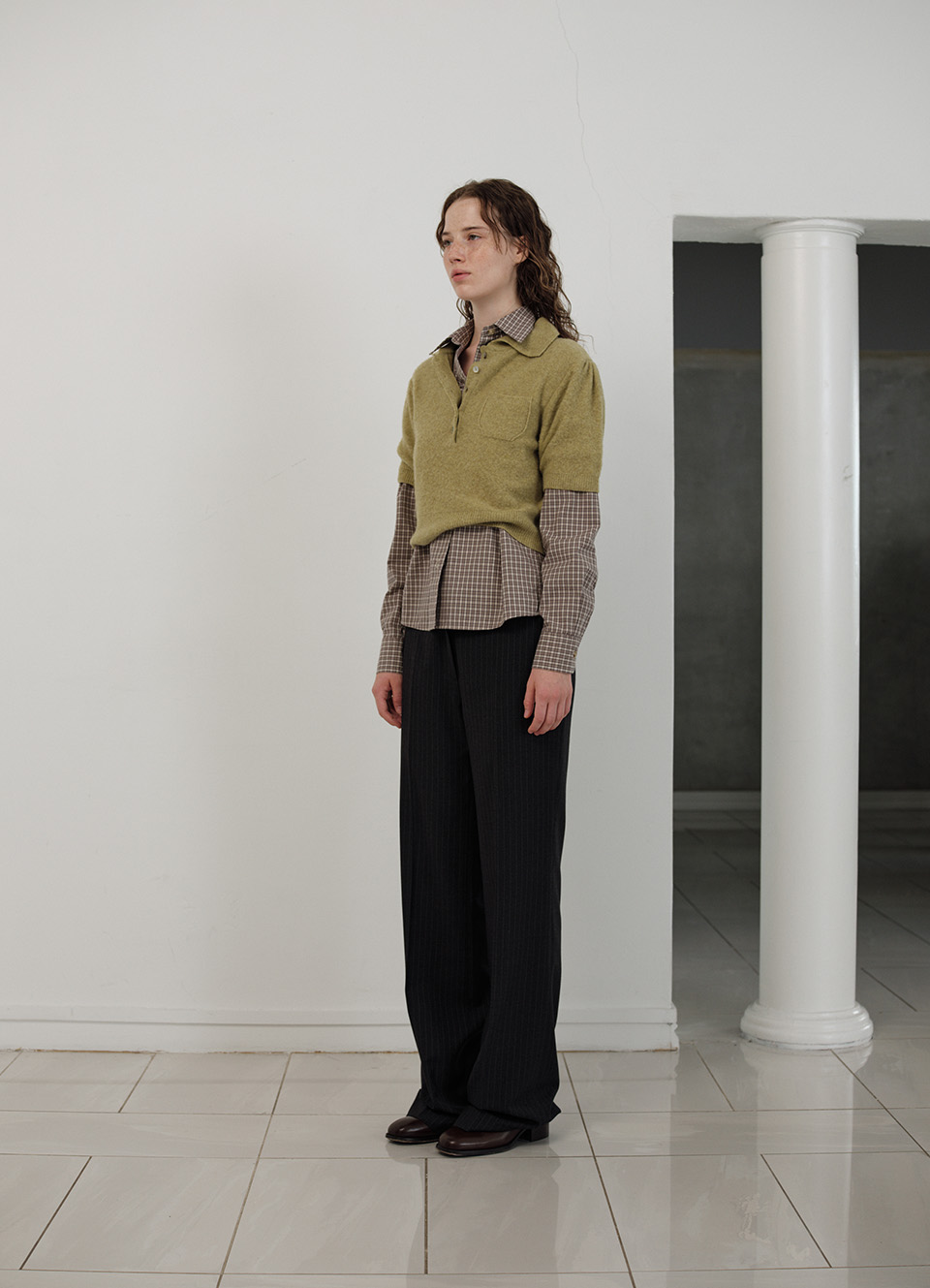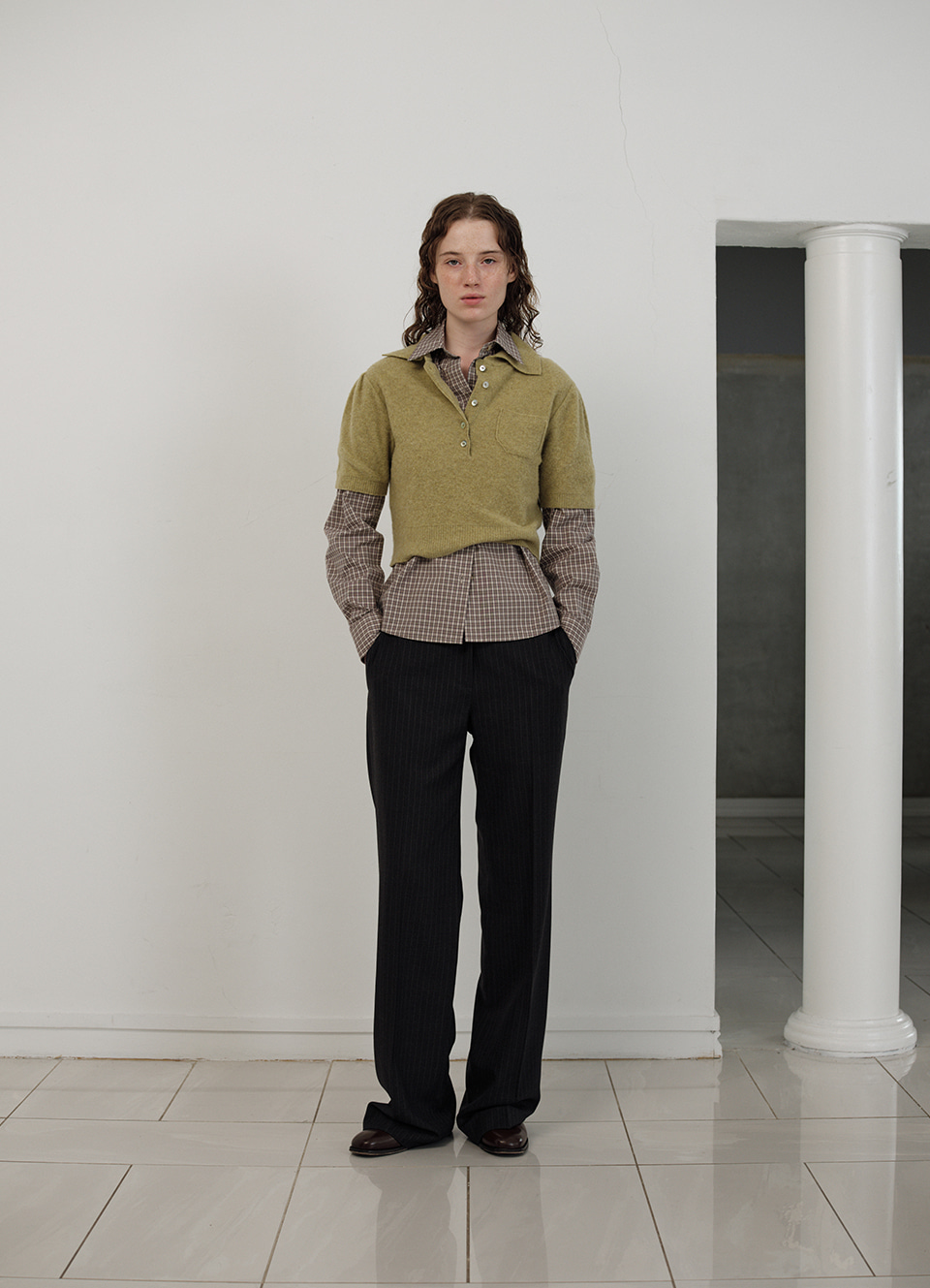 カラーネック、フロントのチェストポケット、そしてハーフスリーブのディテール