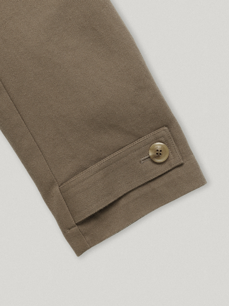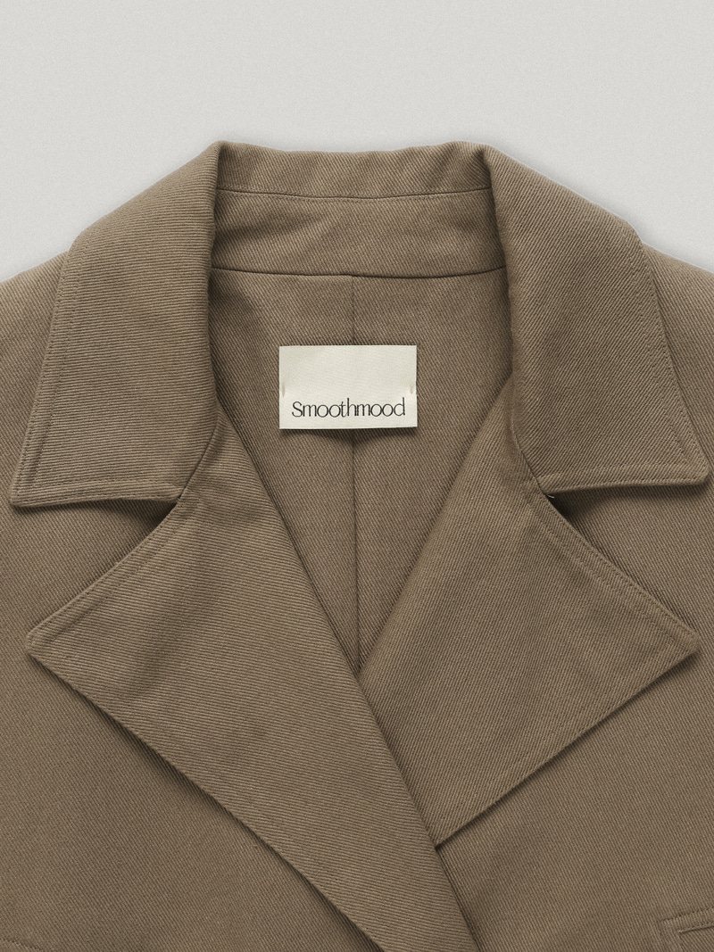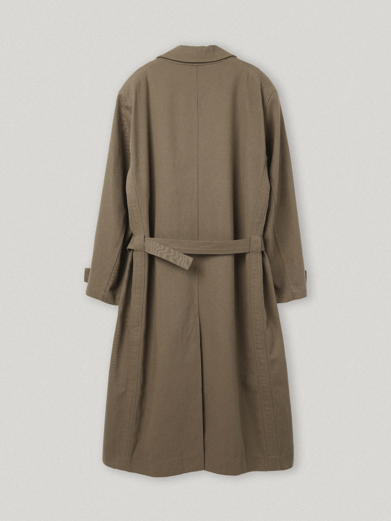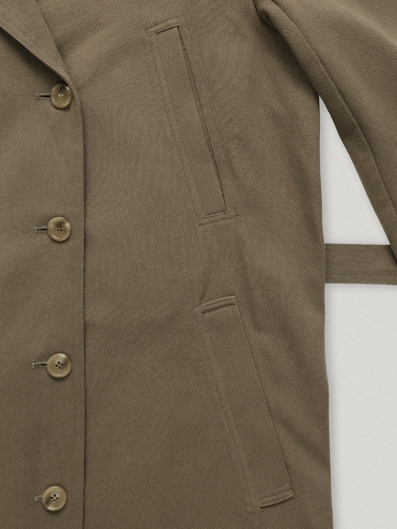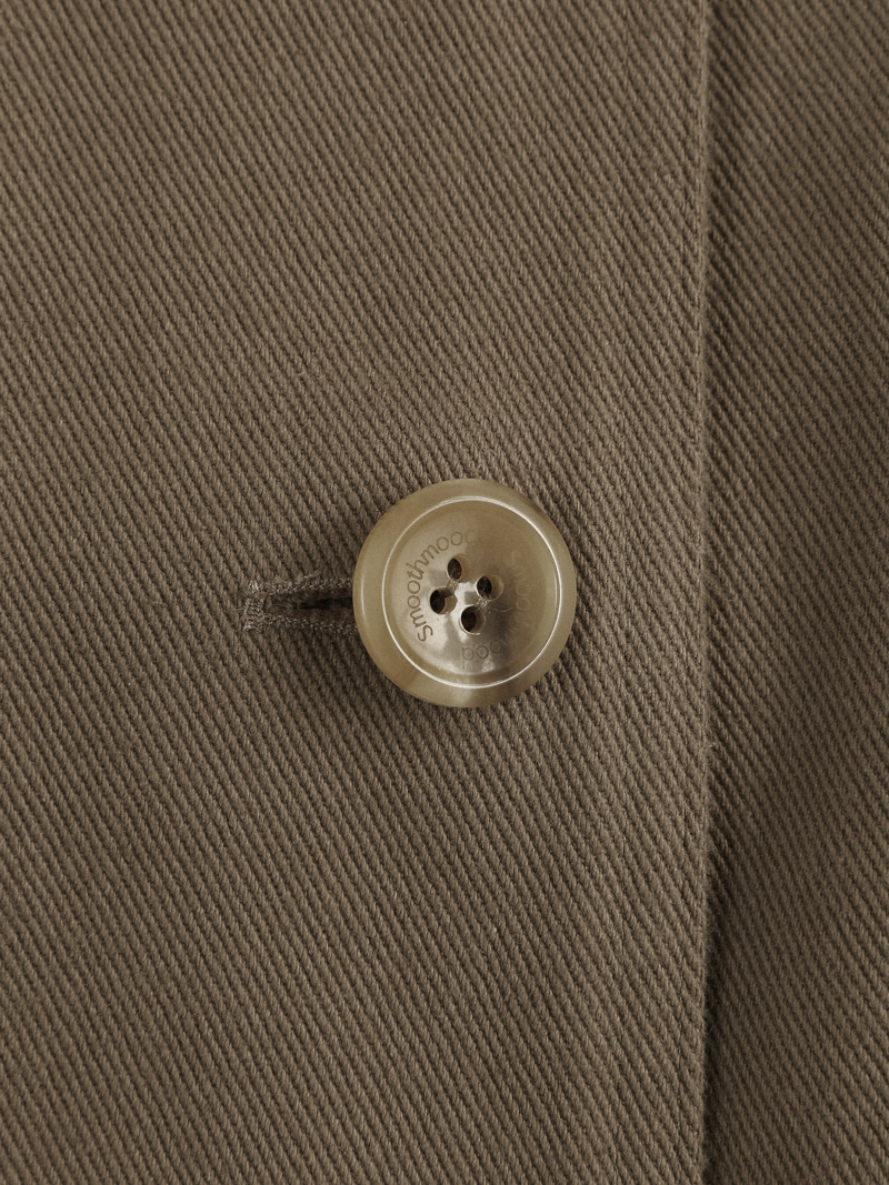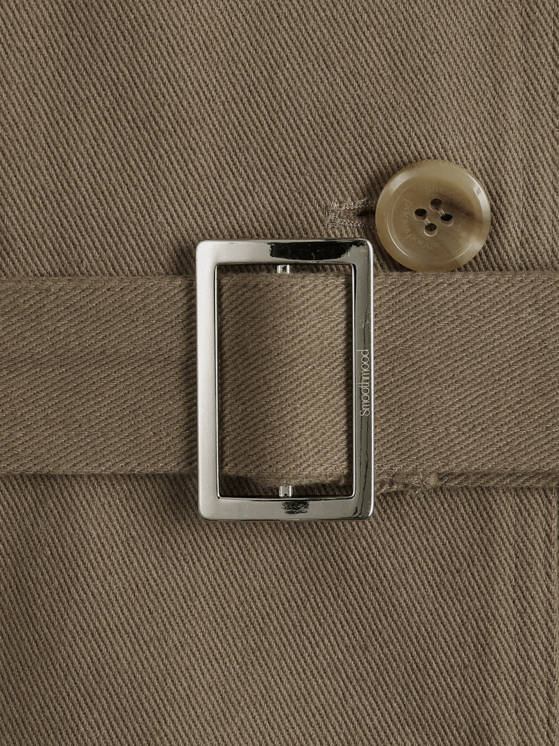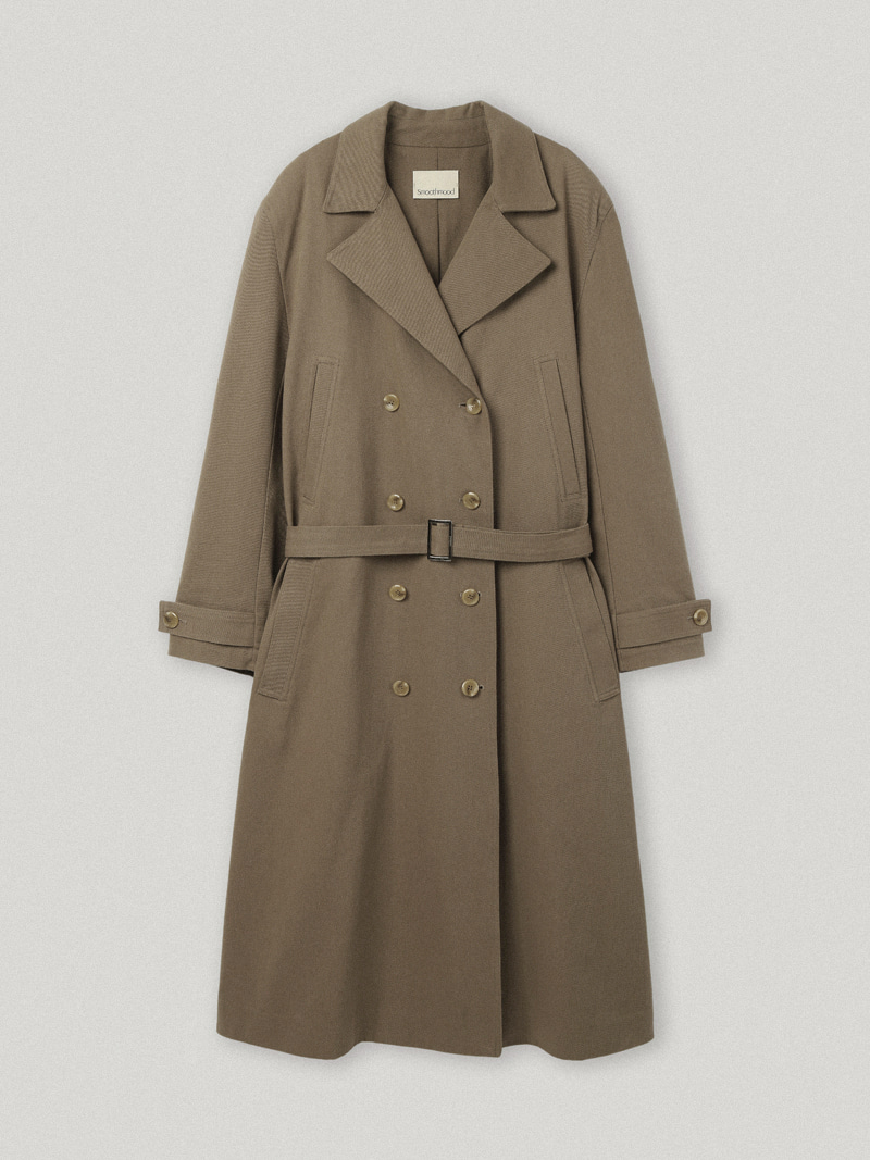 クラシックなトレンチコートを現代的な雰囲気で再解釈したモジュラーダブルトレンチコート。秋のクラシックさを感じられます。落ち着いたベージュトーンにカーキ色のニュアンスが加わったヴィンテージマットな色合いで、100%ツイルコットン素材が同じ厚みと質感に感触があります。しっかりとした丈夫なメイクで作られた、男らしくリラックスしたフィット感で、「クール」という言葉そのもので、クラシックなノッチラペルと自然に落ちる肩のライン、そして軽やかに落ちるニュートラルなシルエットが特徴です。シワが少ない素材でできているため、さらに贅沢です。自由でエレガントに様々な内装アイテムを合わせましょう。コットン100%リラックスフィットのフィットラペル、ダブルブレストサイドダブルポケット、スムームードロゴ入りベルト