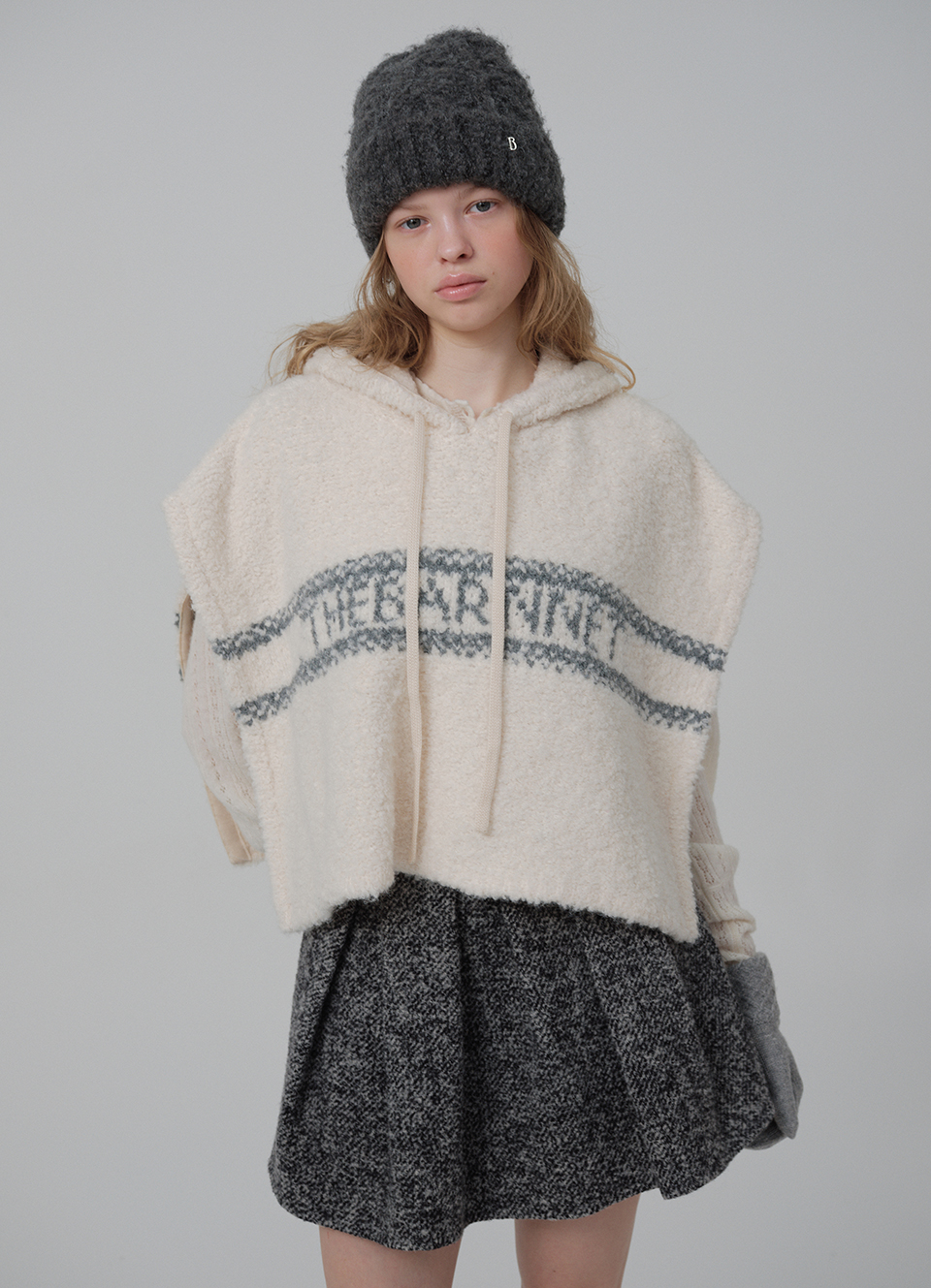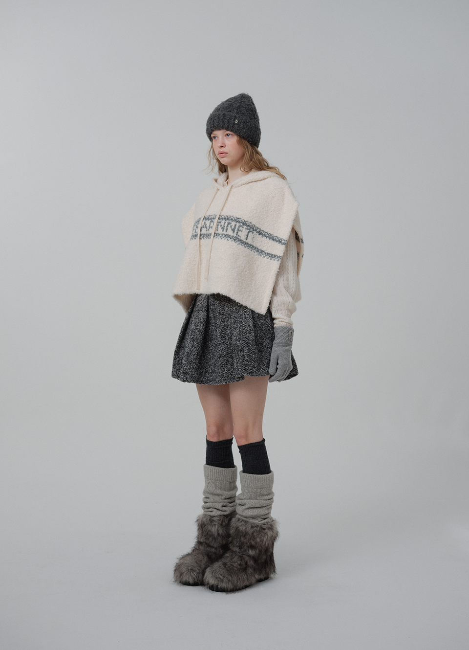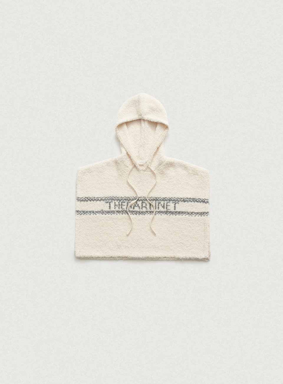 ファブリックカラーと対比するグレーカラーを使用したロゴジャカード編みと、調節可能な紐付きフードディテール。