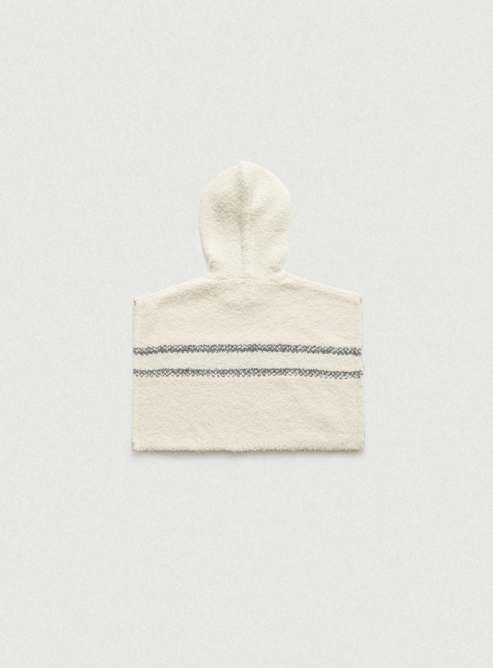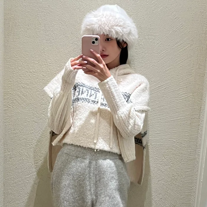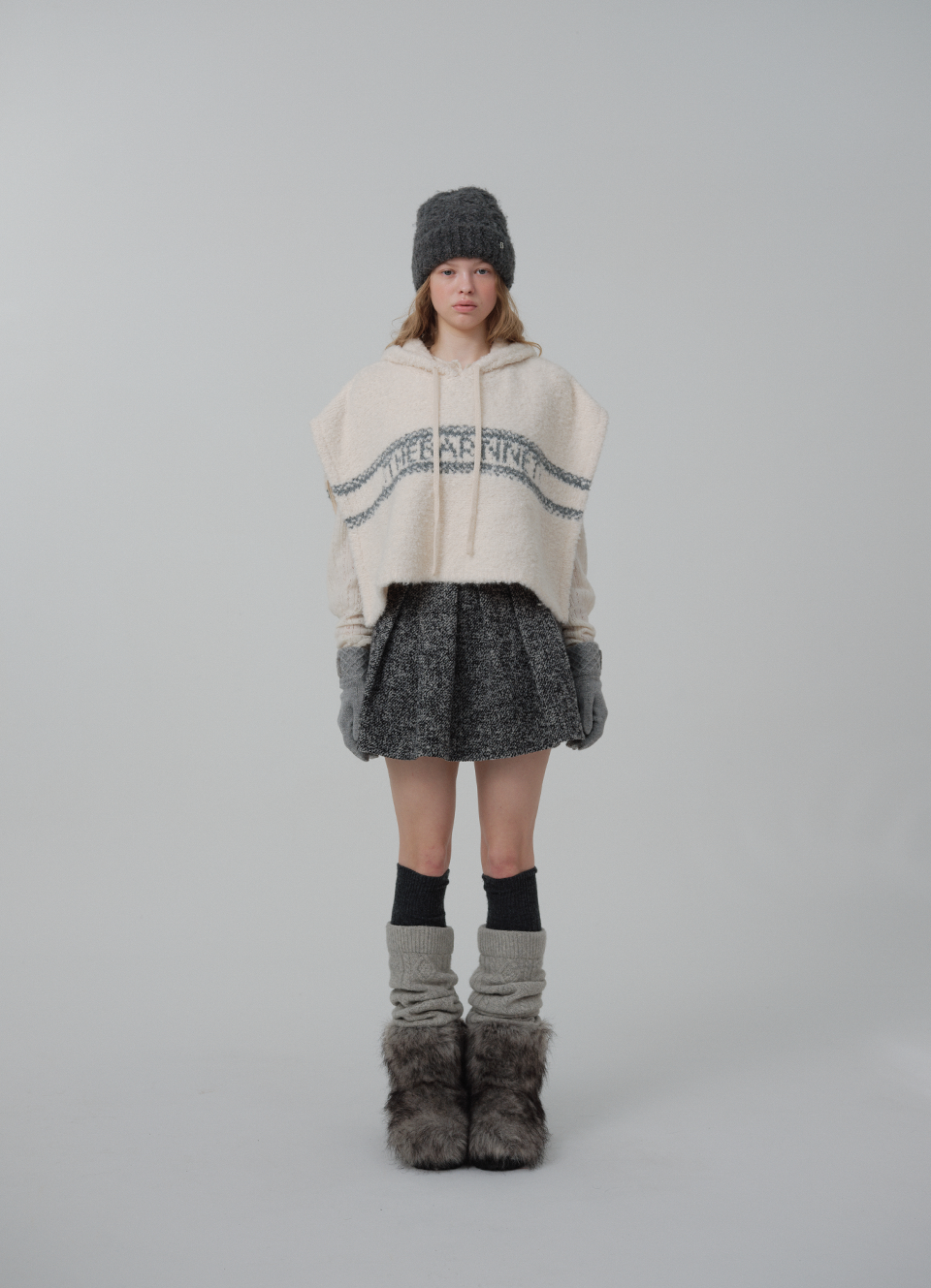 ファブリックカラーと対比するグレーカラーを使用したロゴジャカード編みと、調節可能な紐付きフードディテール。