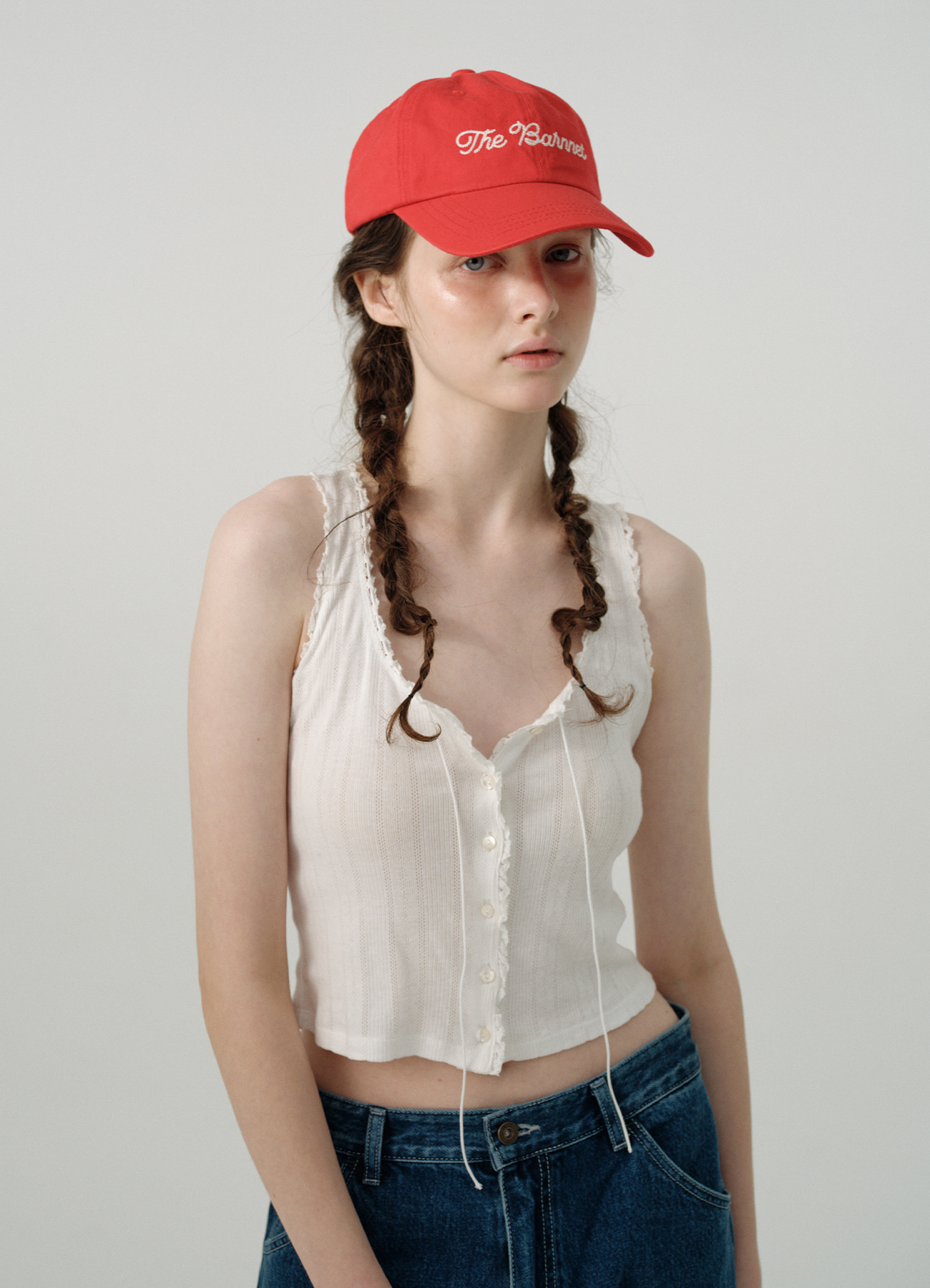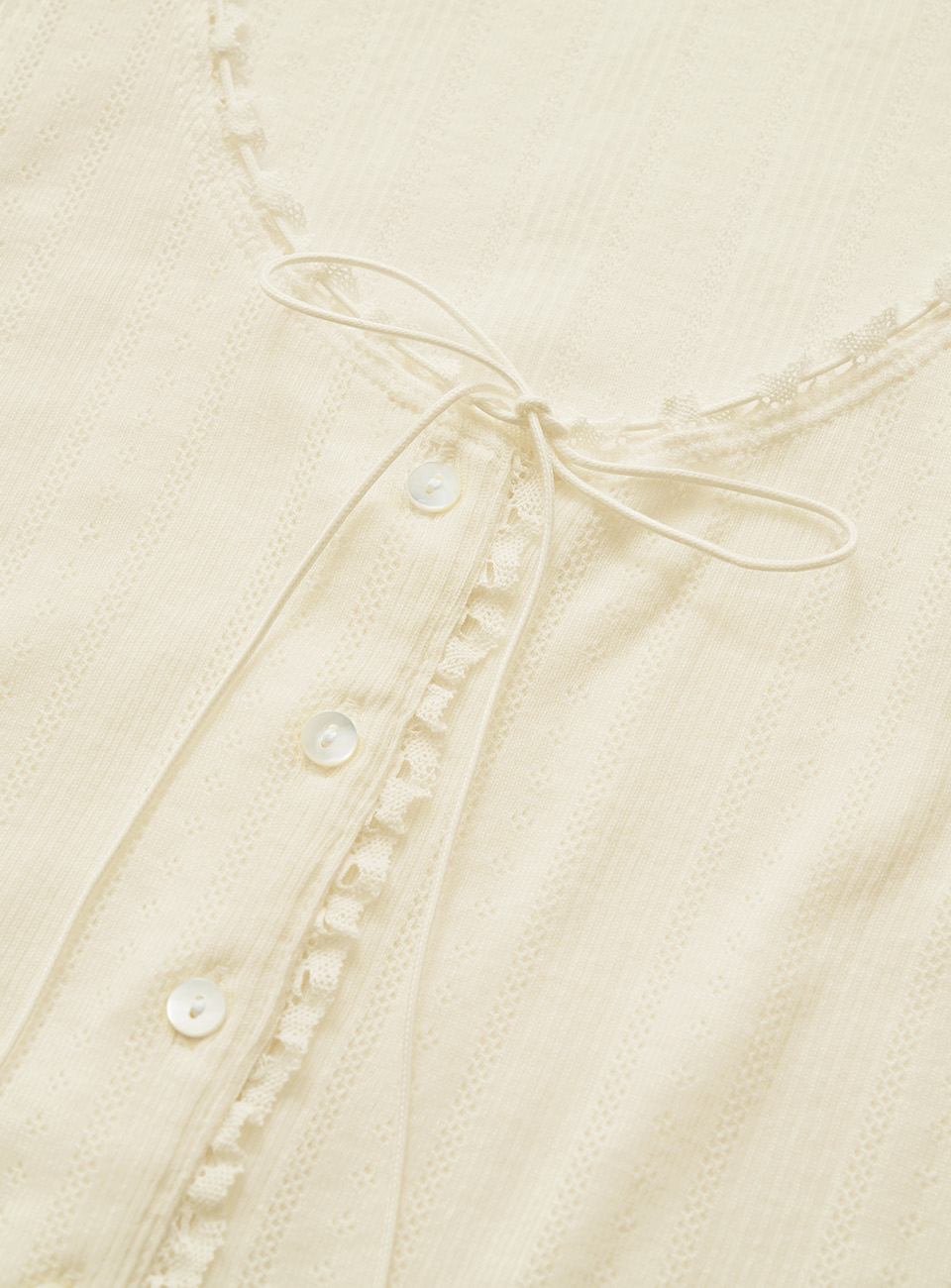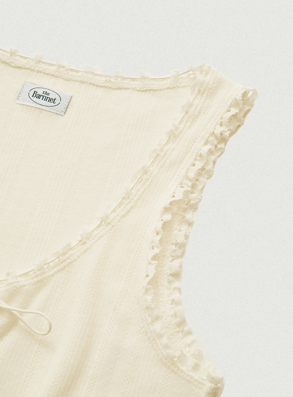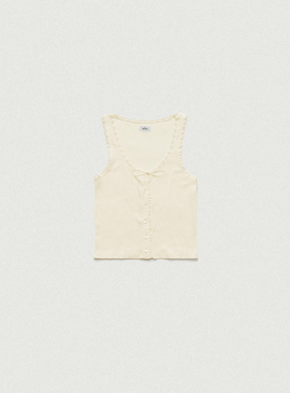 Uネック、ノースリーブ、タイ&ボタン留め仕様のタンクトップタイプ。