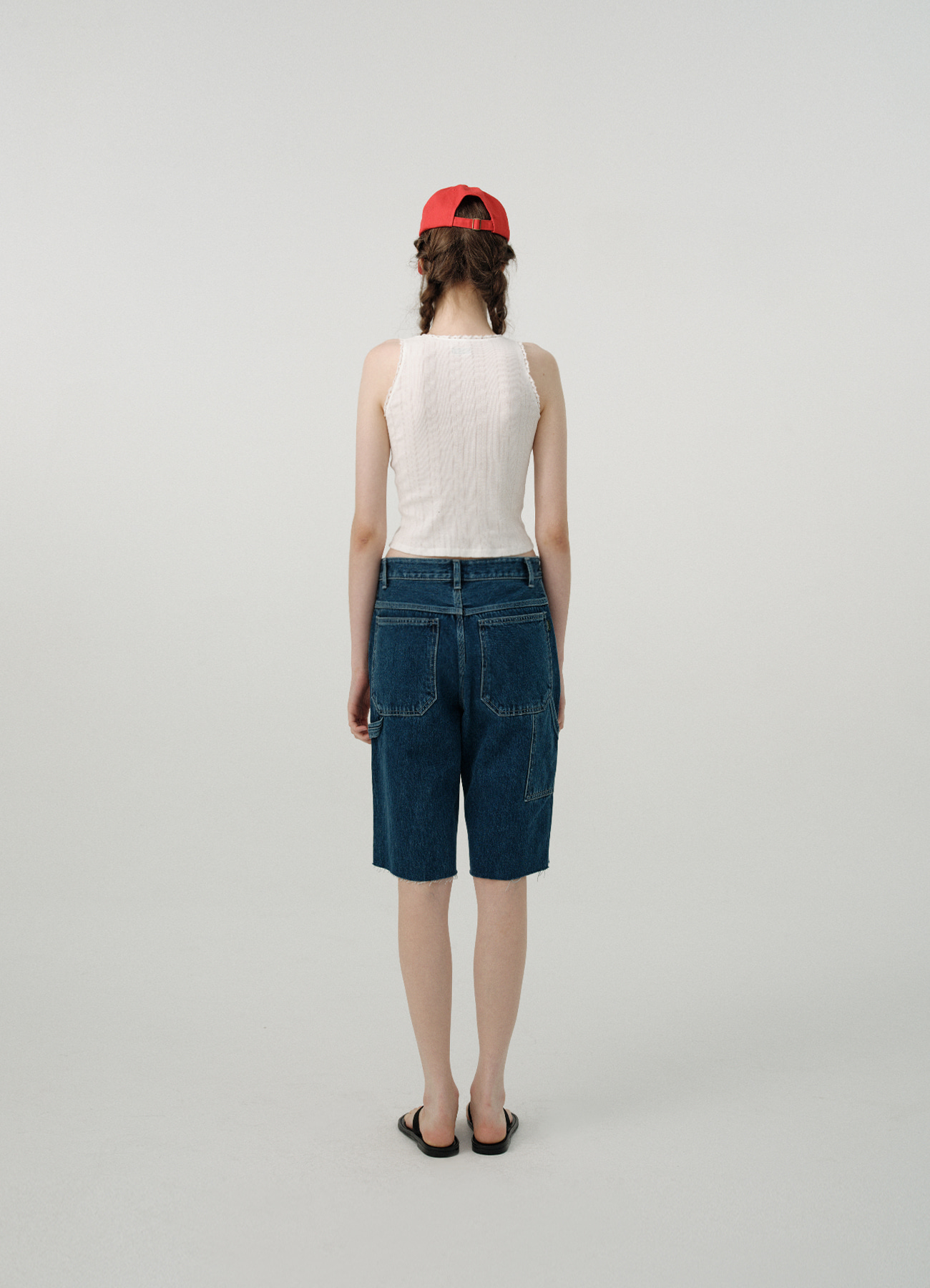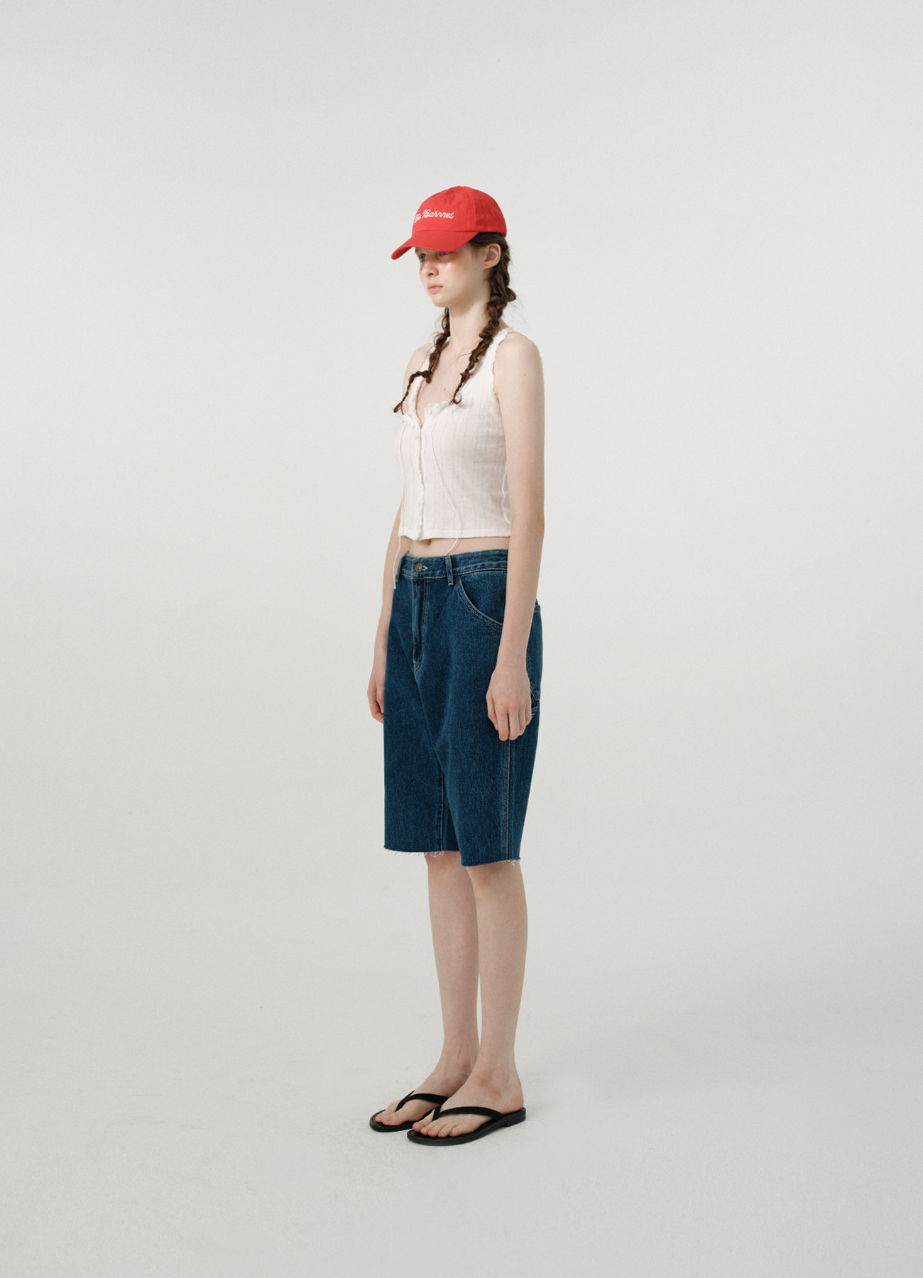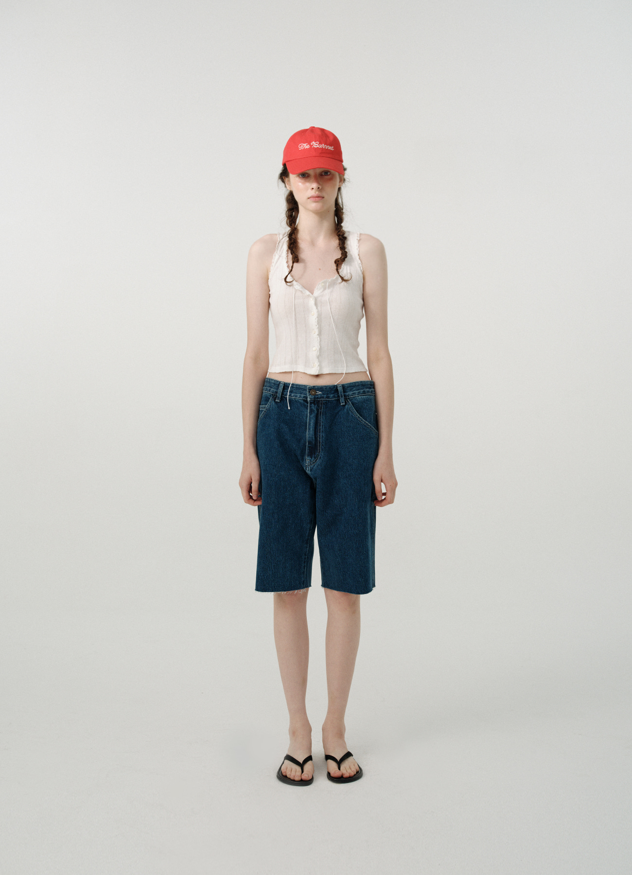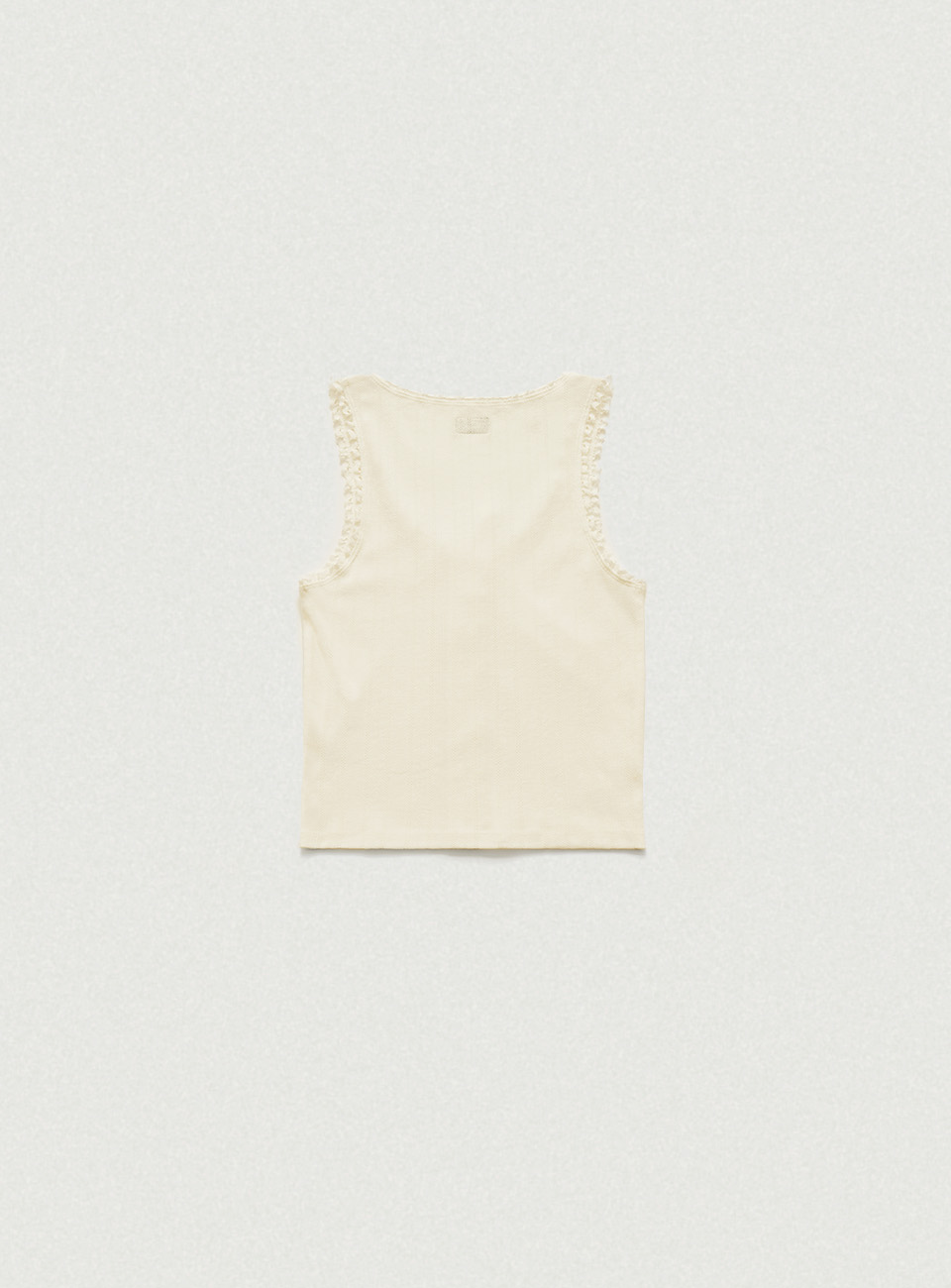 Uネック、ノースリーブ、タイ&ボタン留め仕様のタンクトップタイプ。