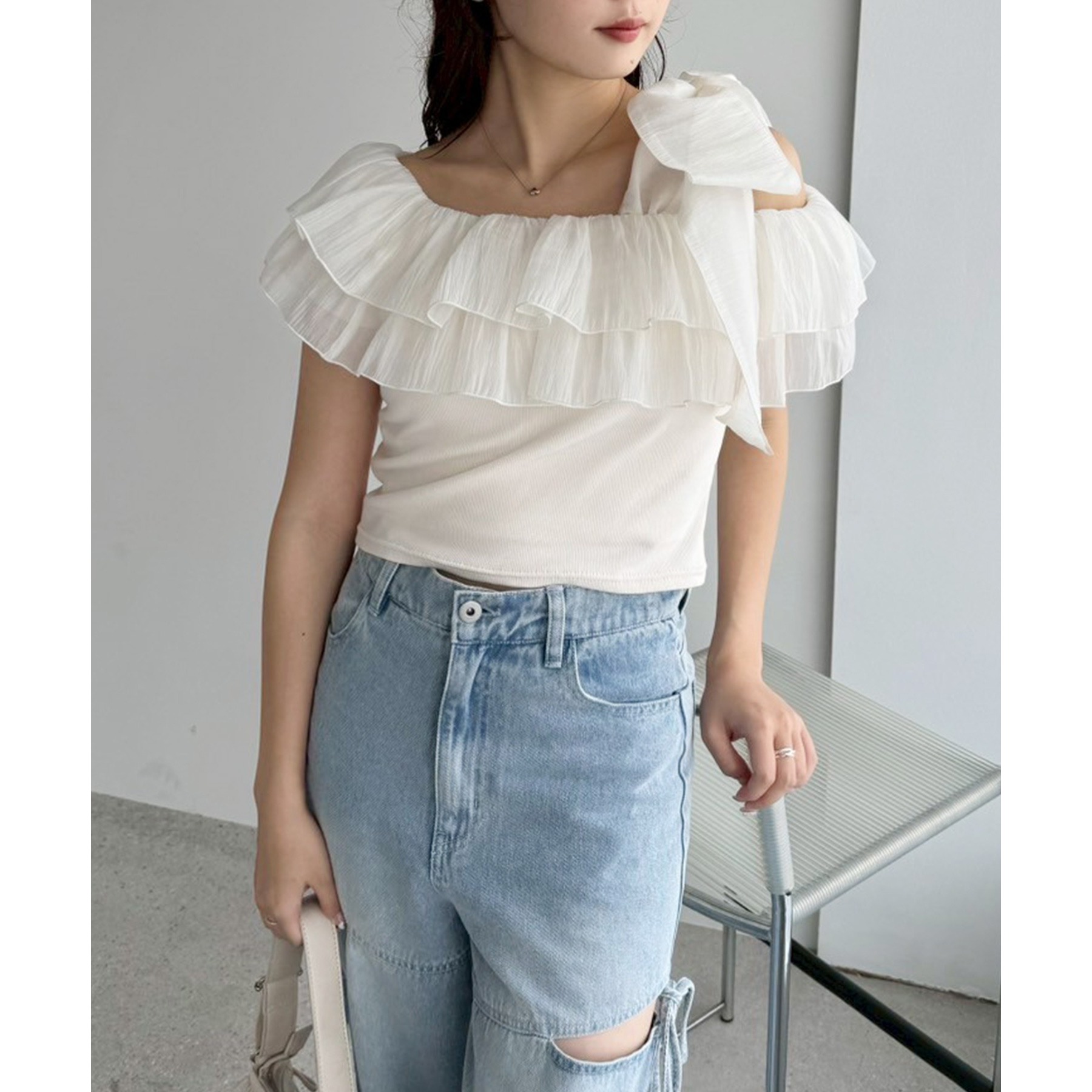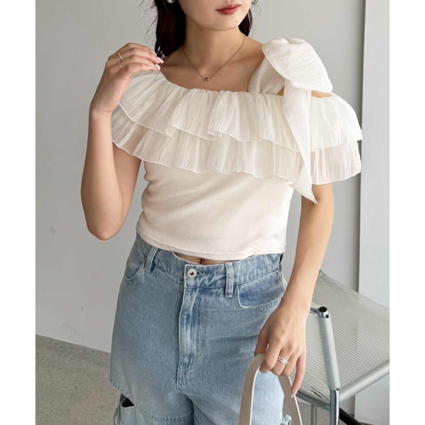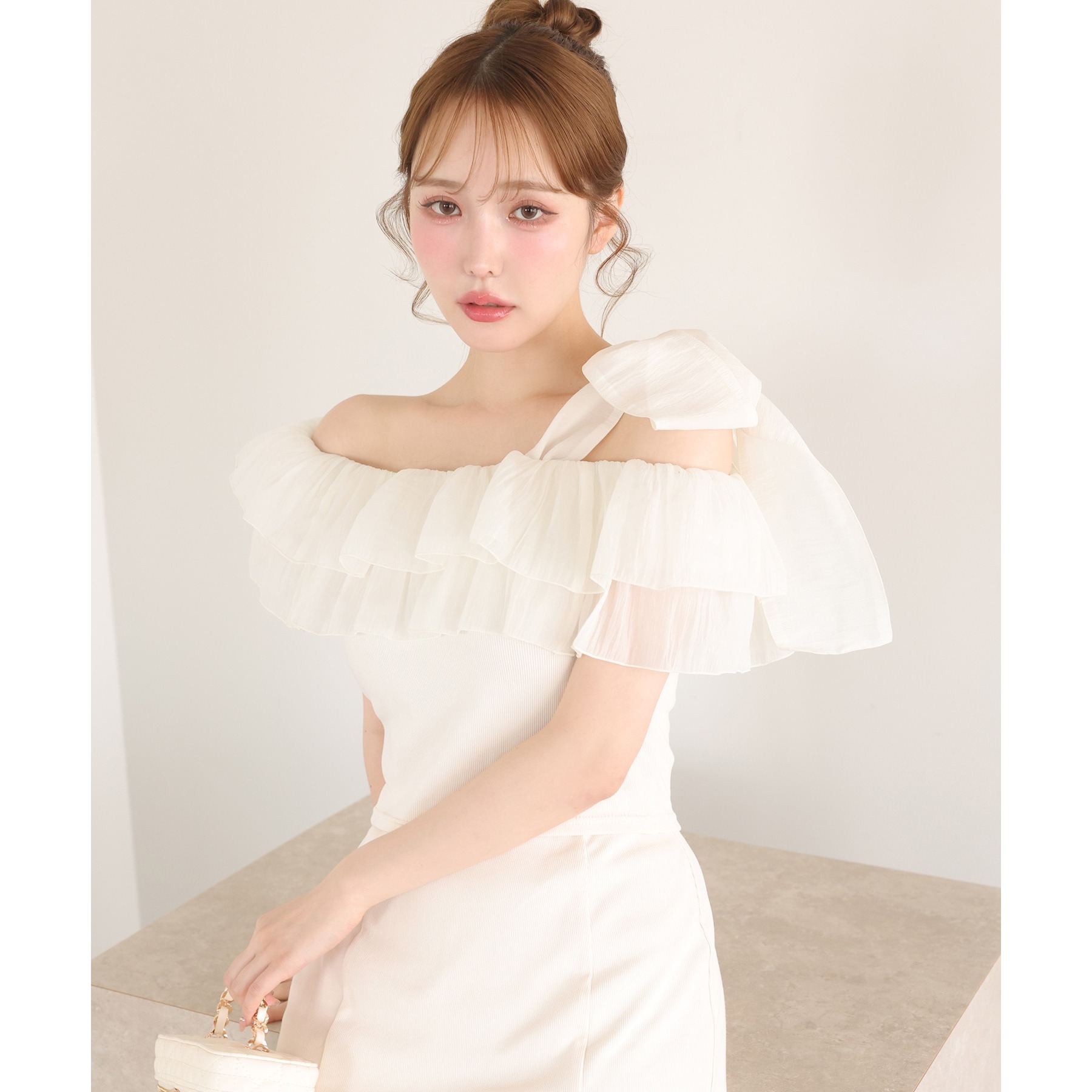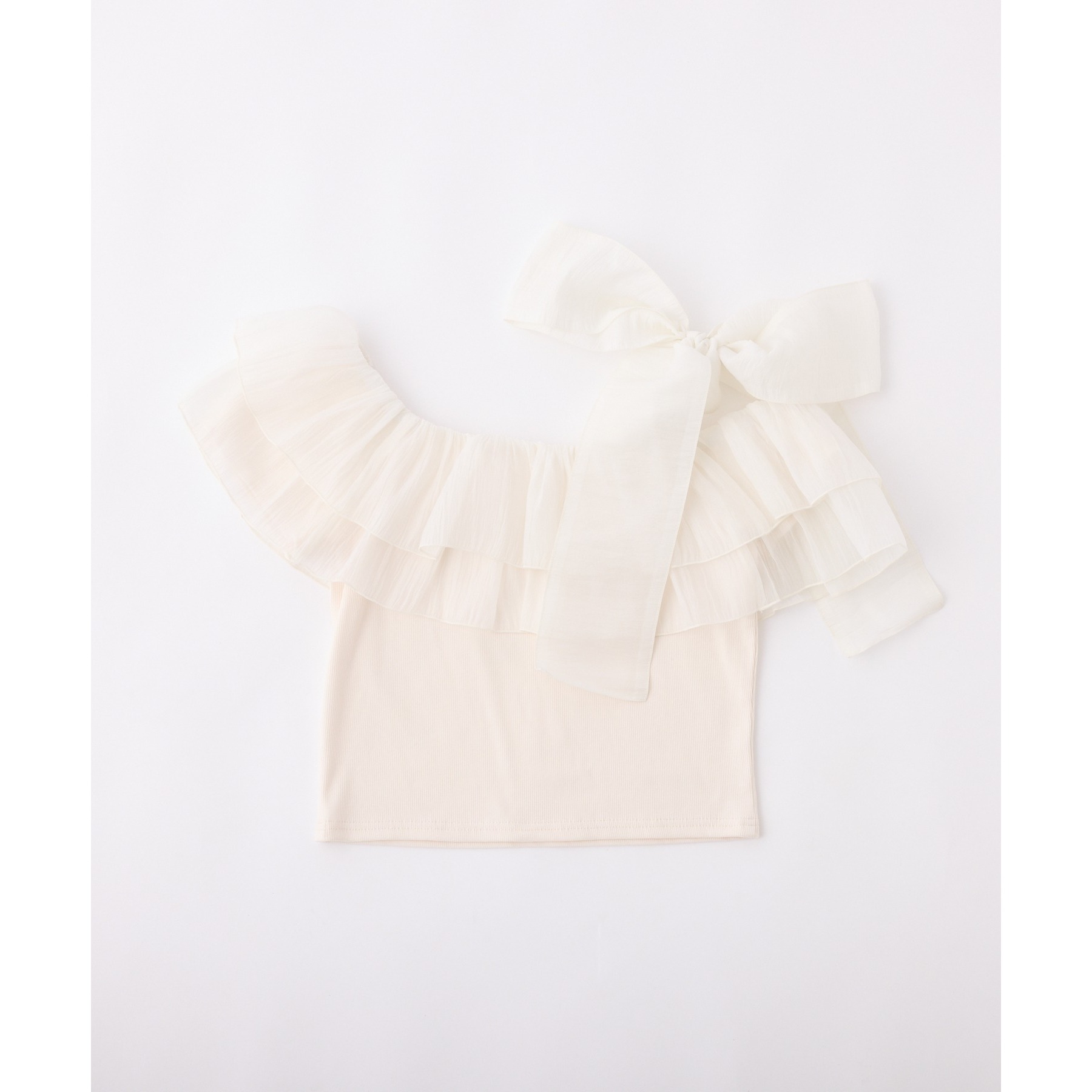 ワンショルダーのシルエットに、たっぷりのフリルと大きめリボンをあしらった主役級トップス。