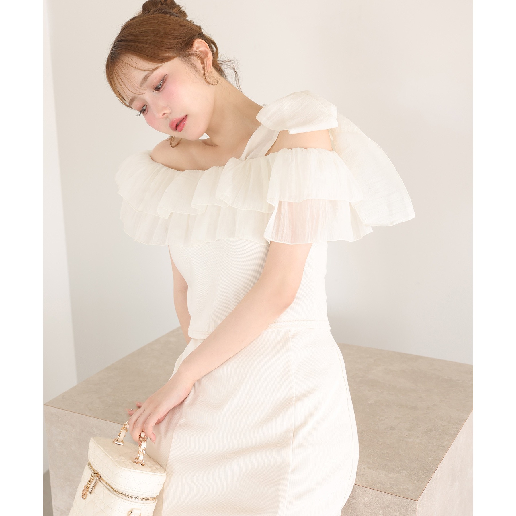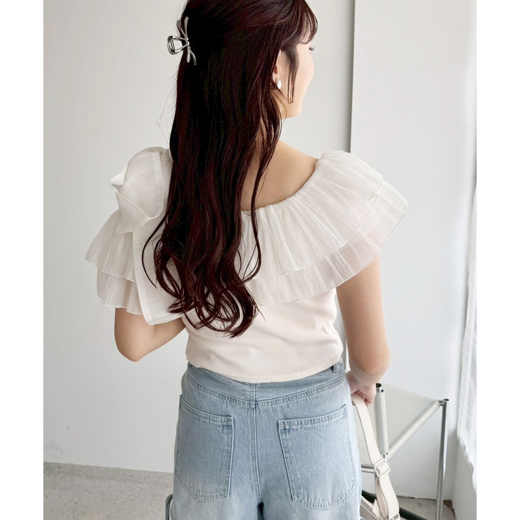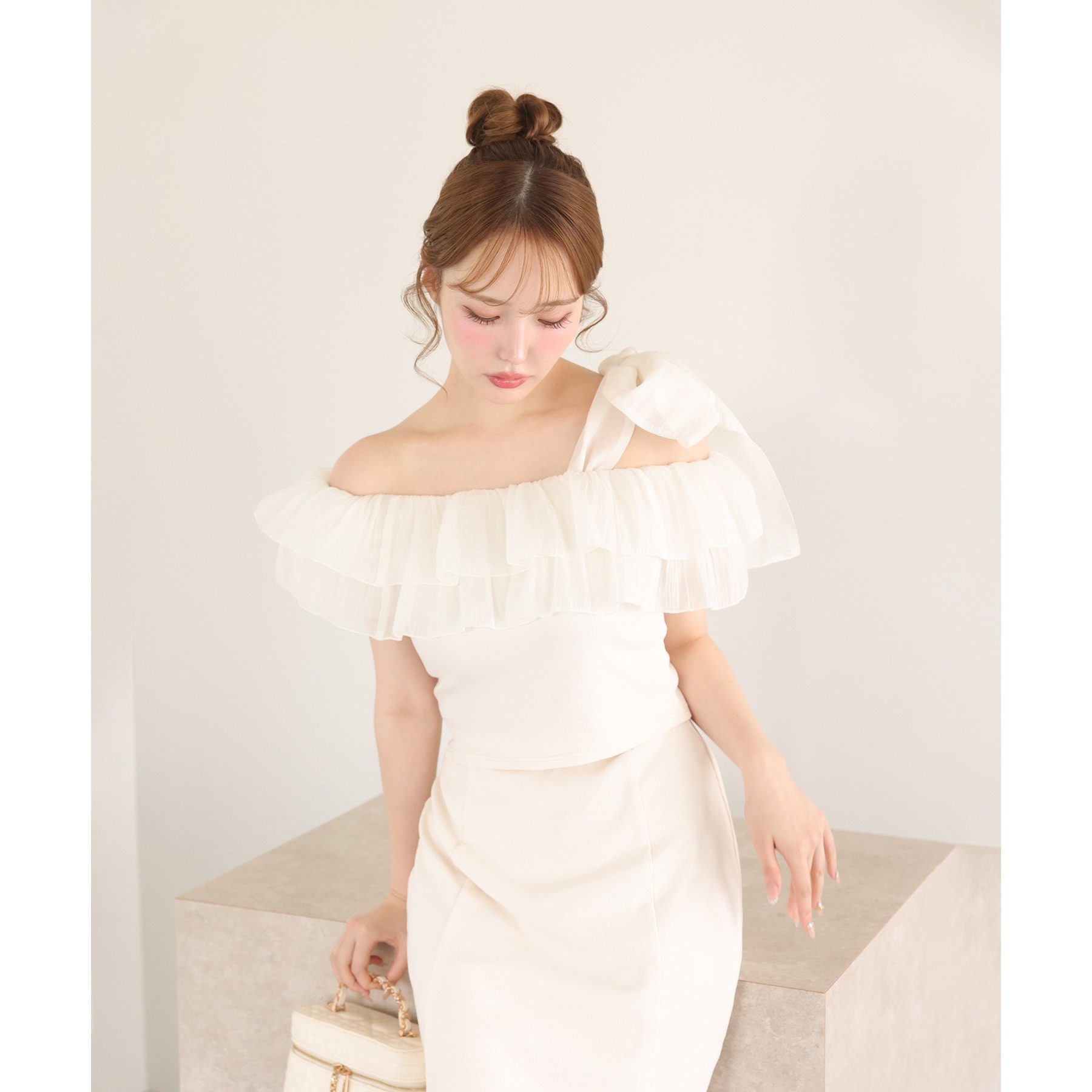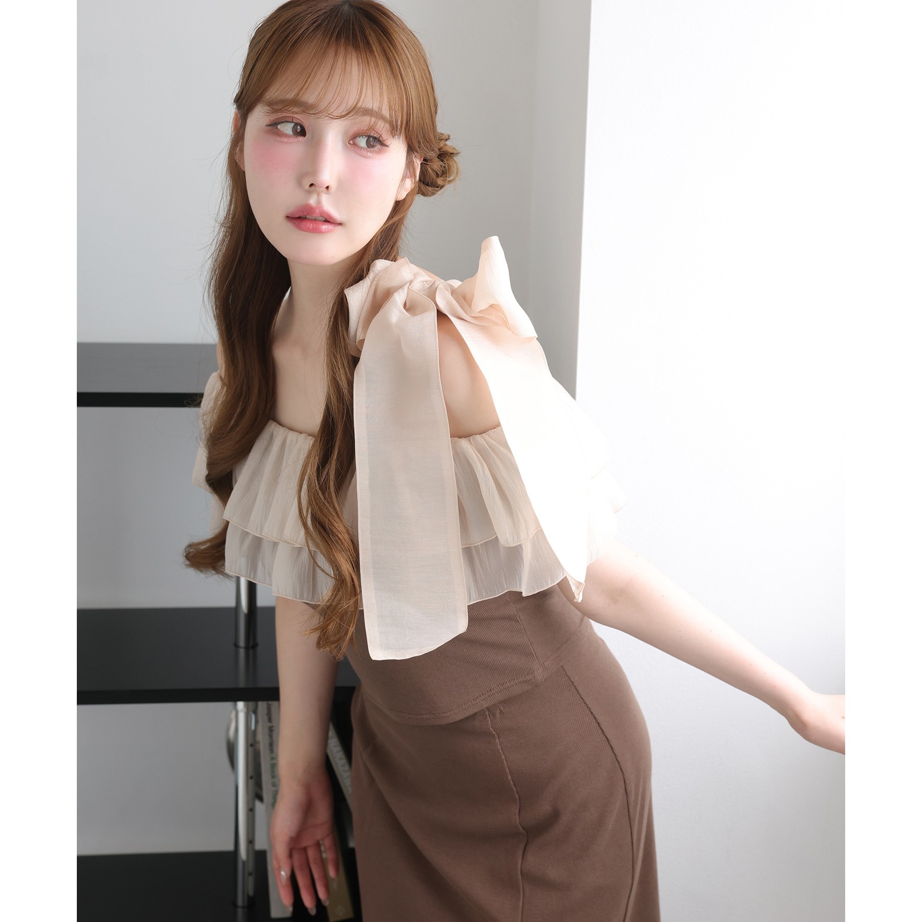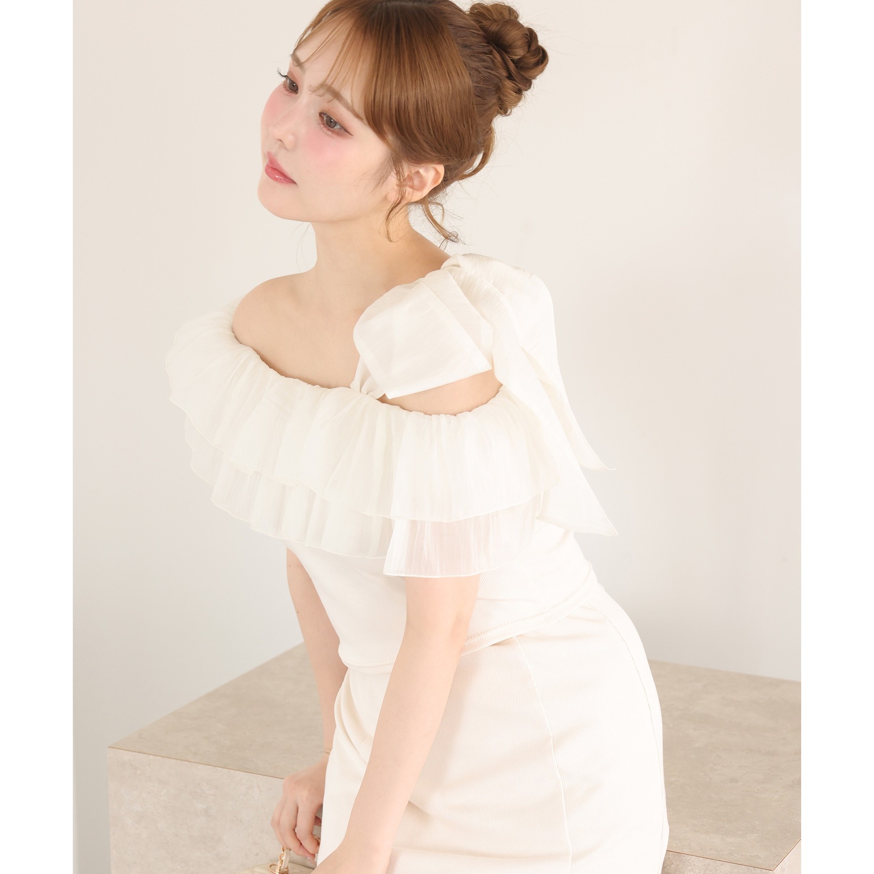 ワンショルダーのシルエットに、たっぷりのフリルと大きめリボンをあしらった主役級トップス。