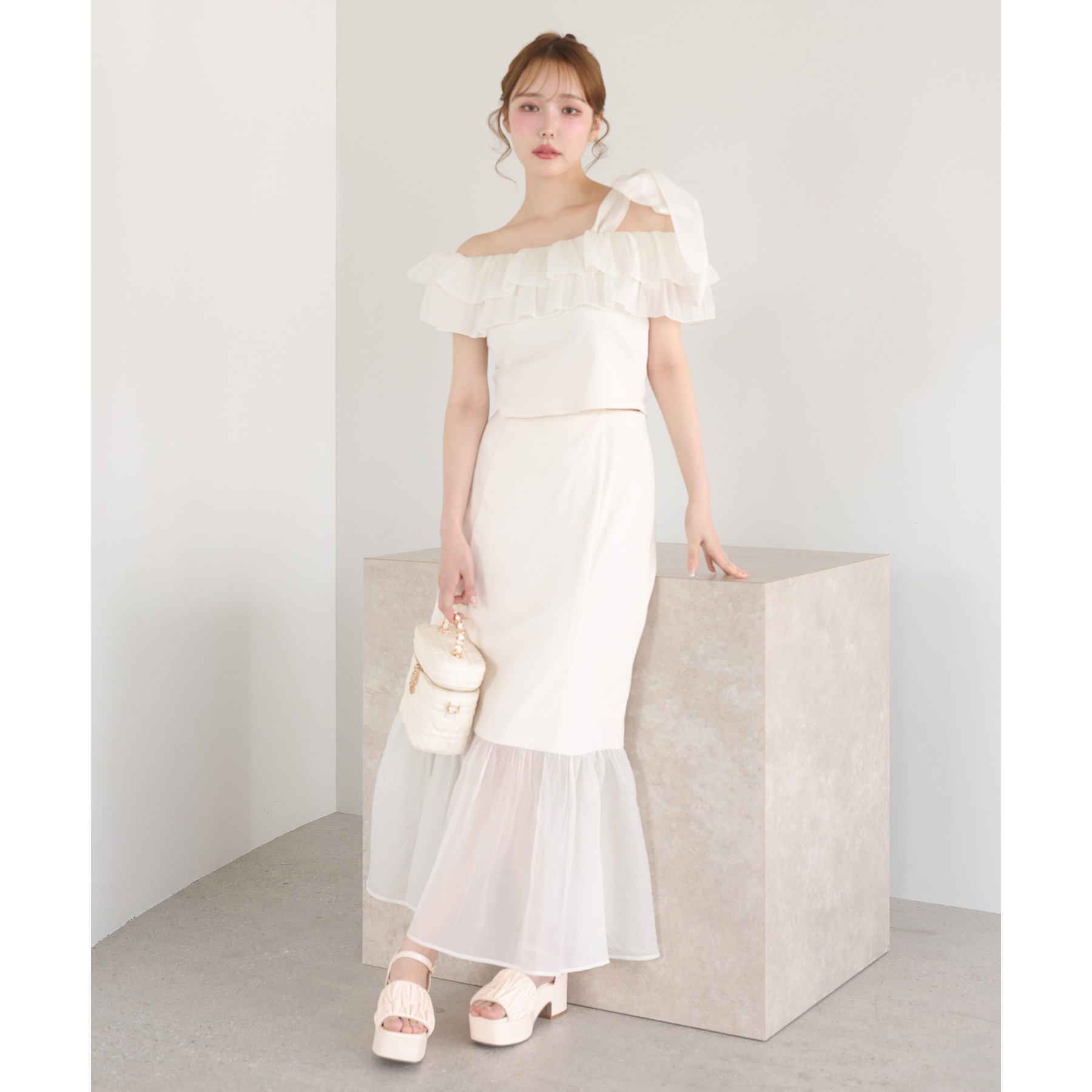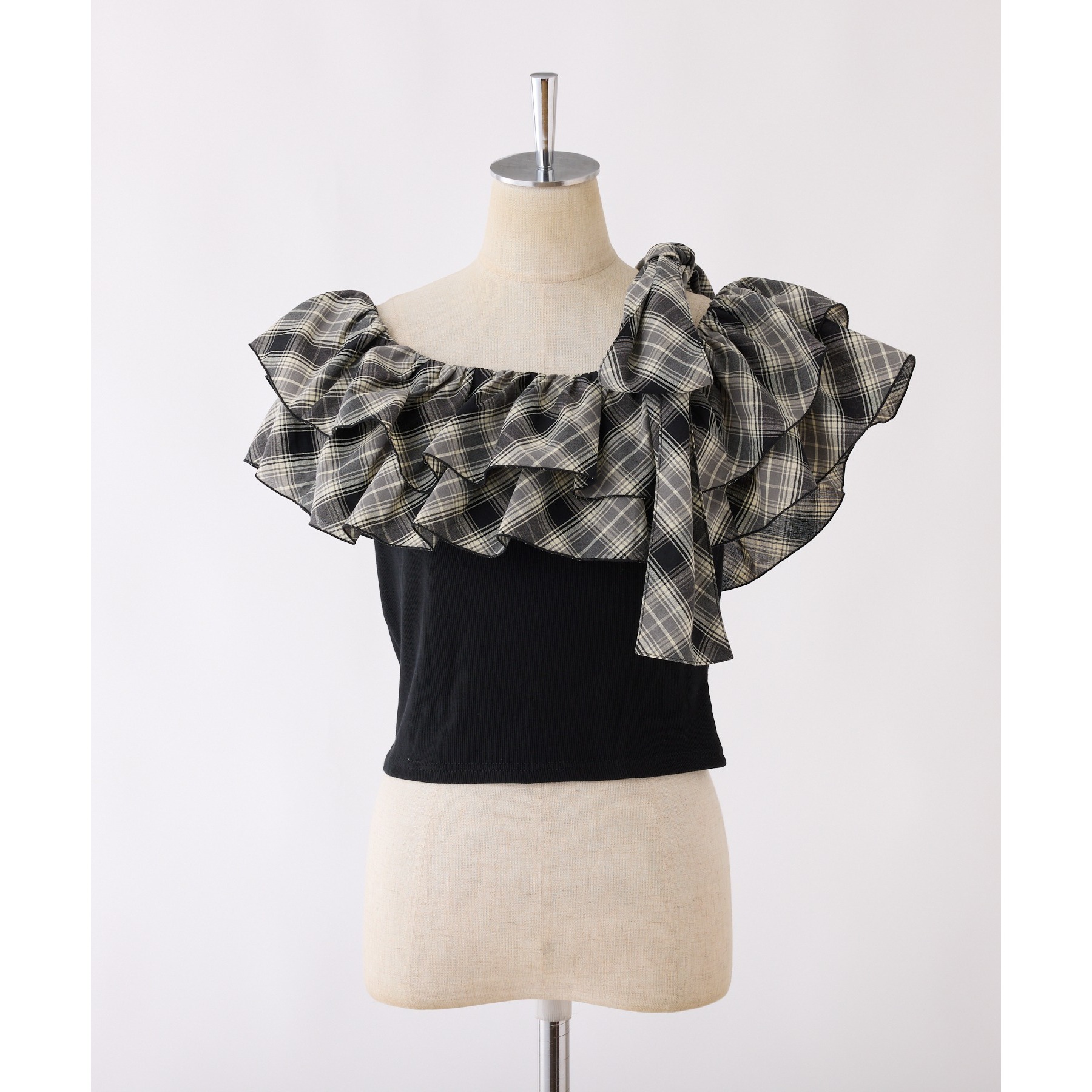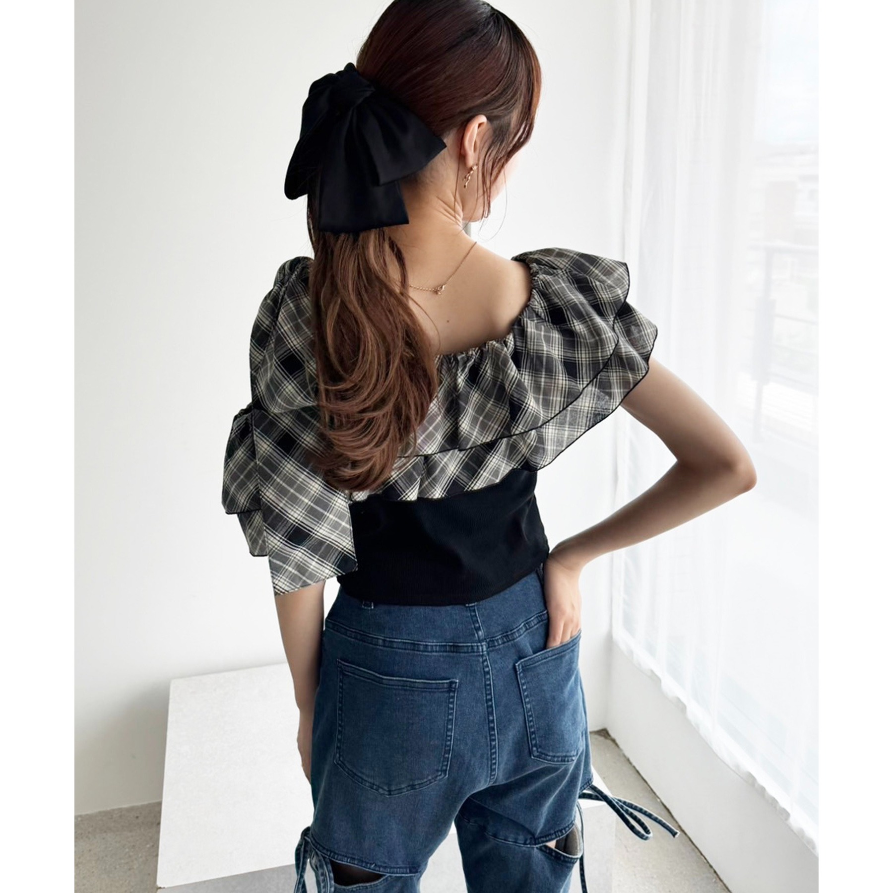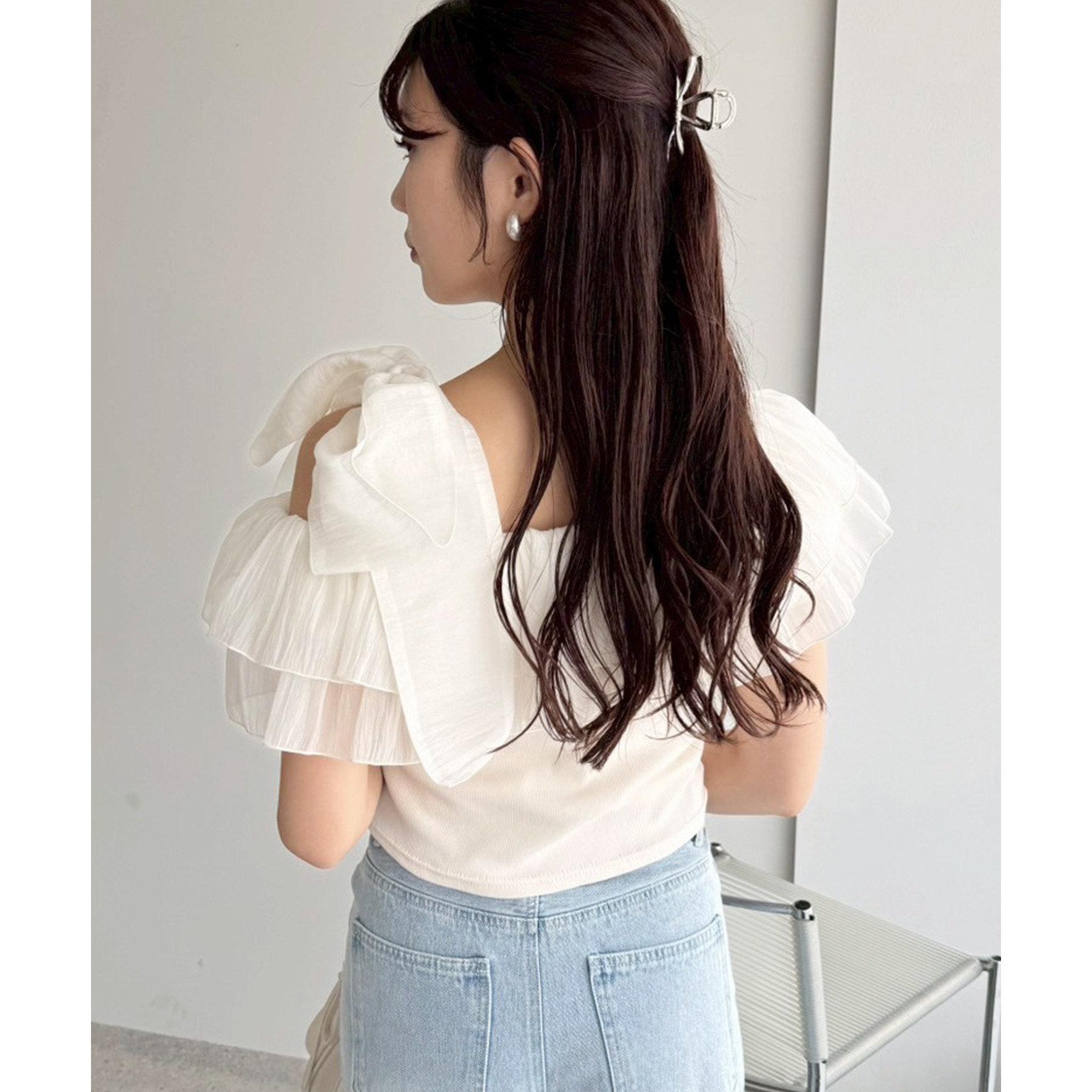 ワンショルダーのシルエットに、たっぷりのフリルと大きめリボンをあしらった主役級トップス。