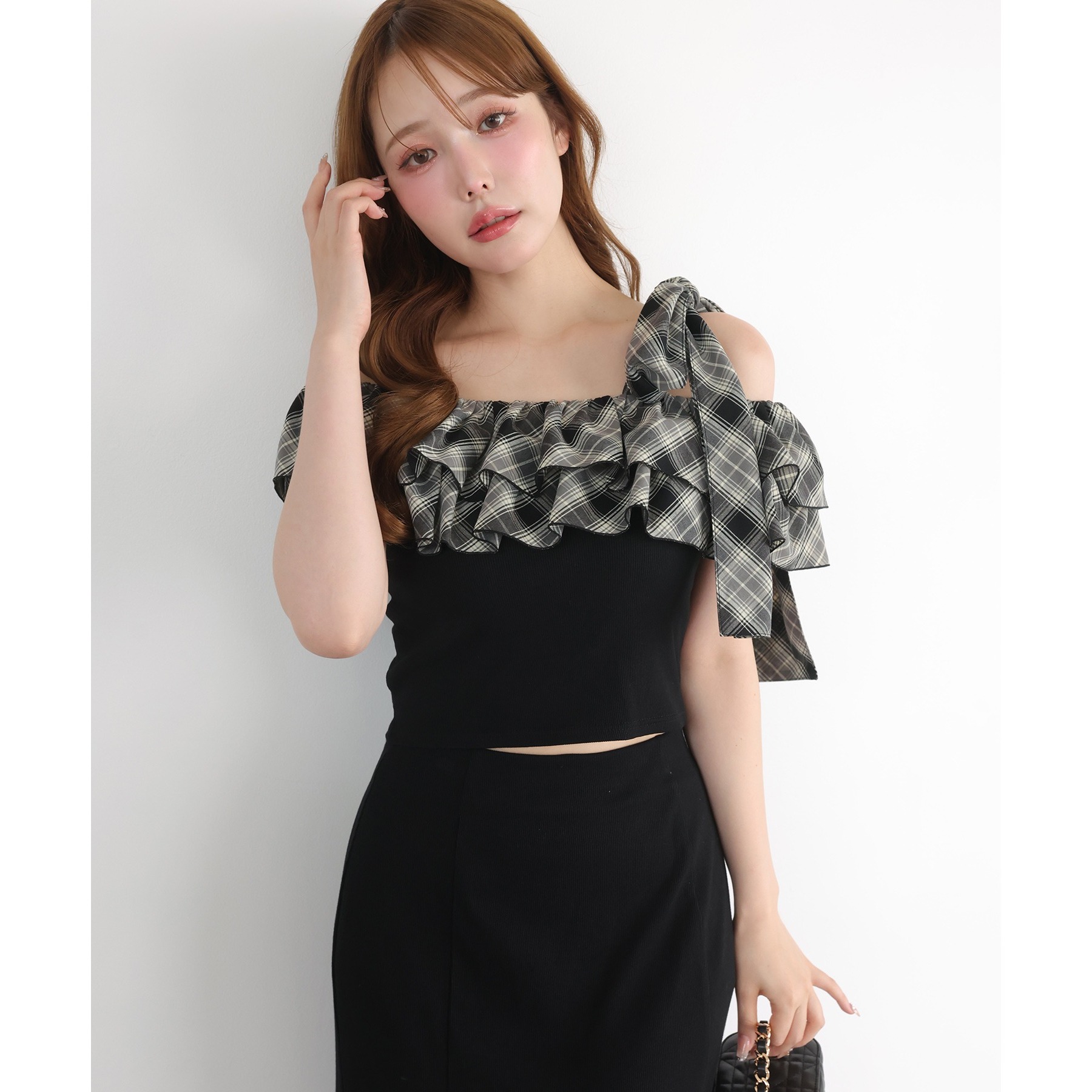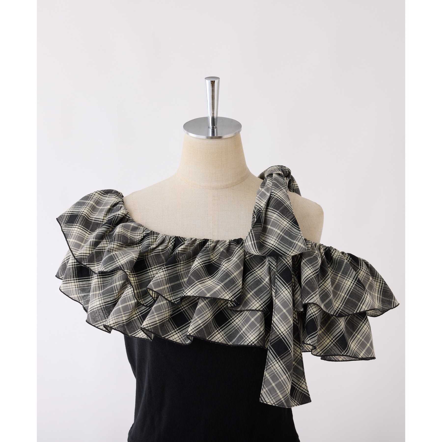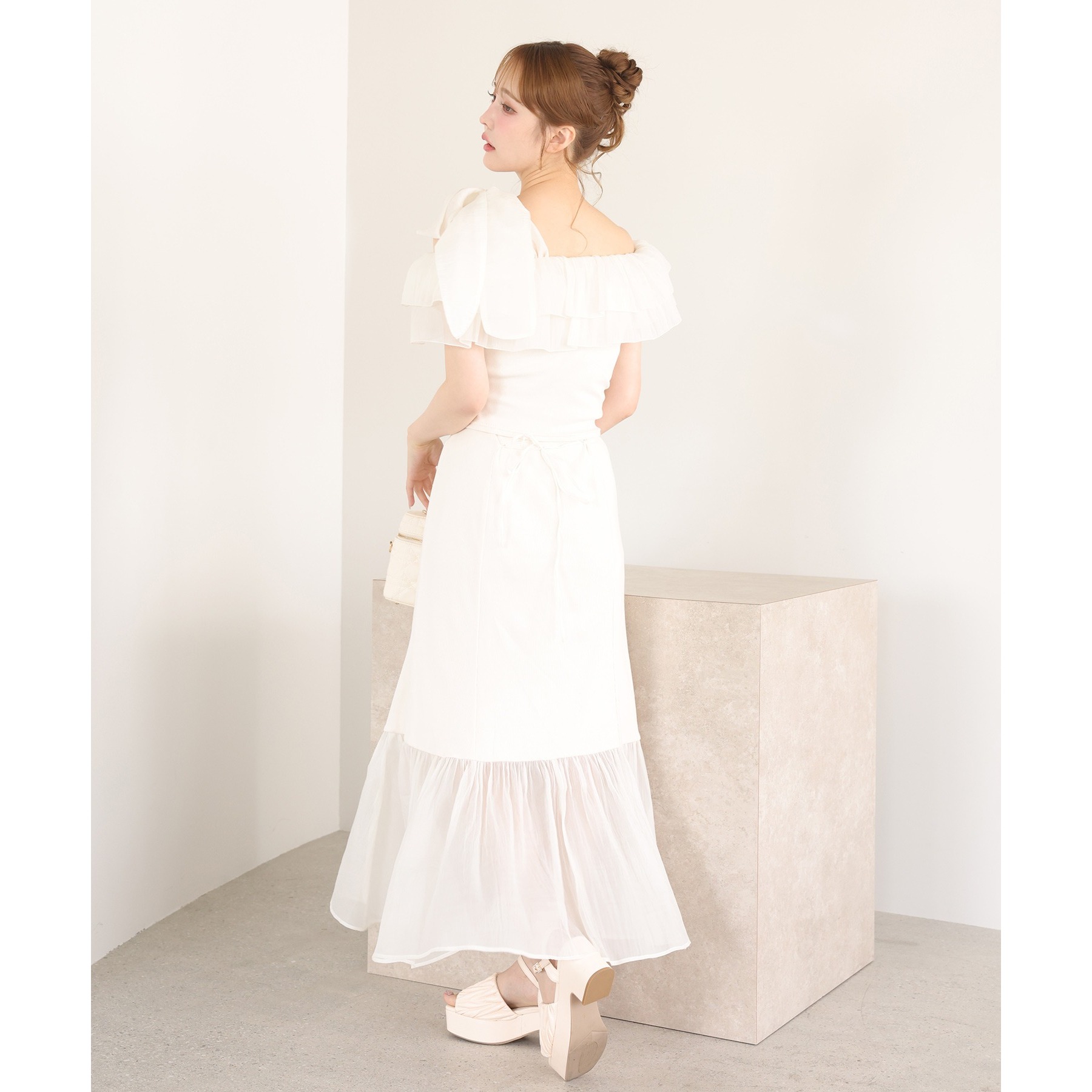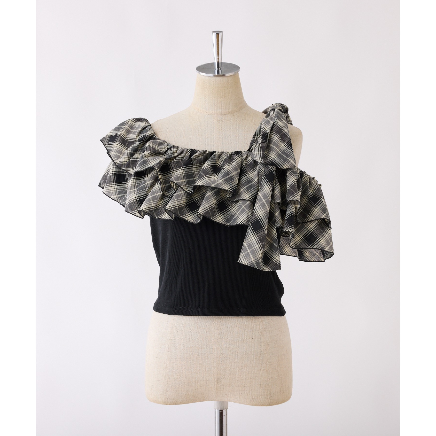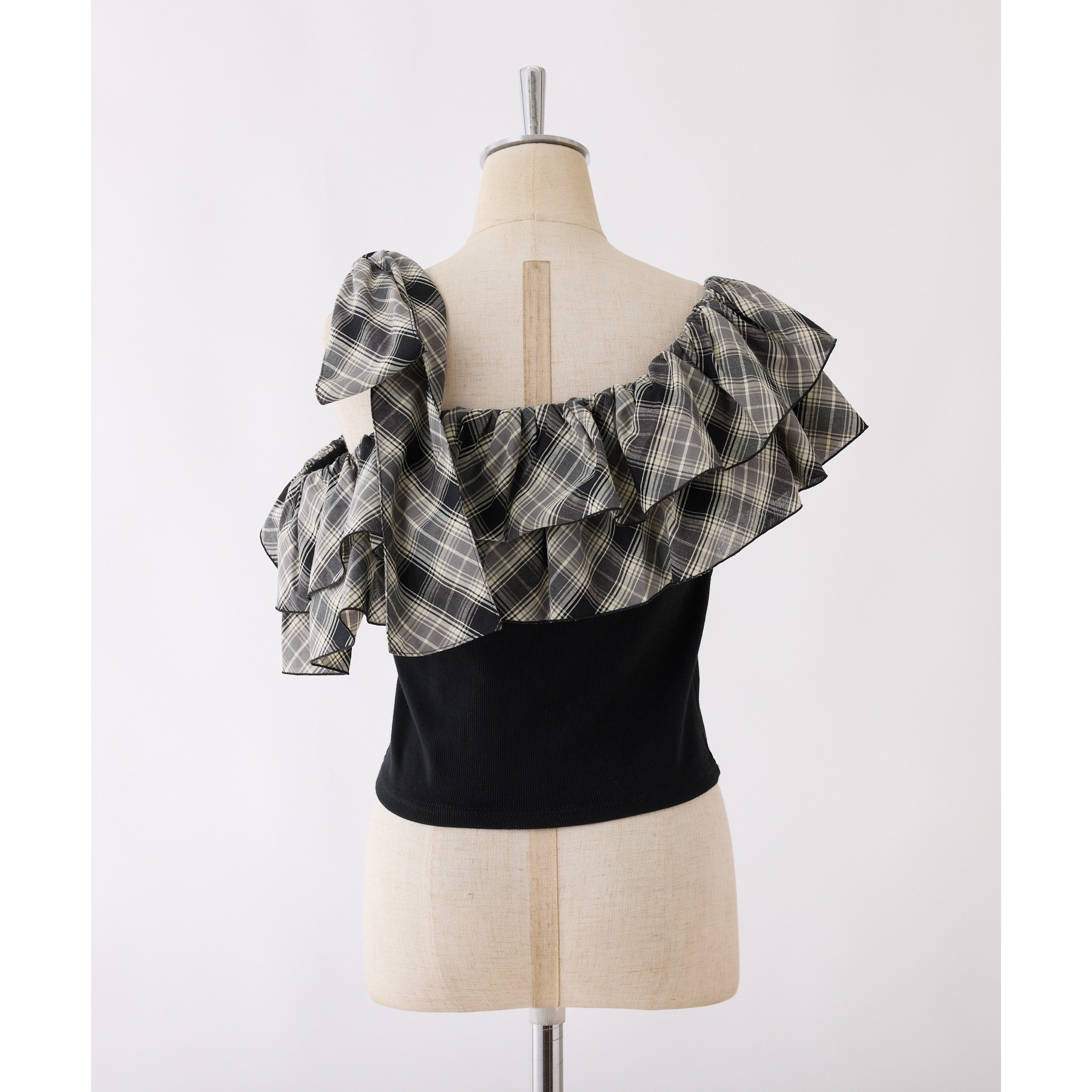 ワンショルダーのシルエットに、たっぷりのフリルと大きめリボンをあしらった主役級トップス。