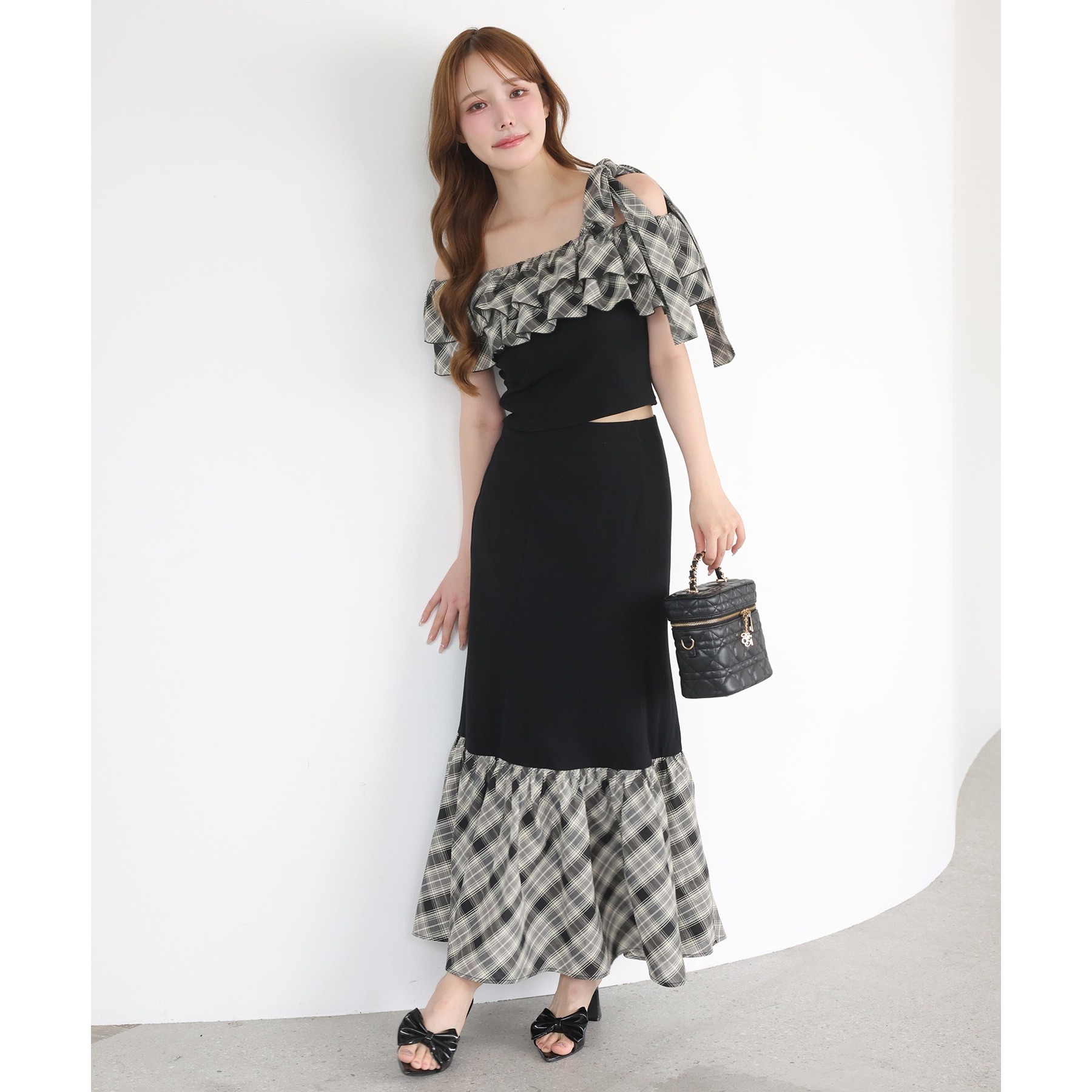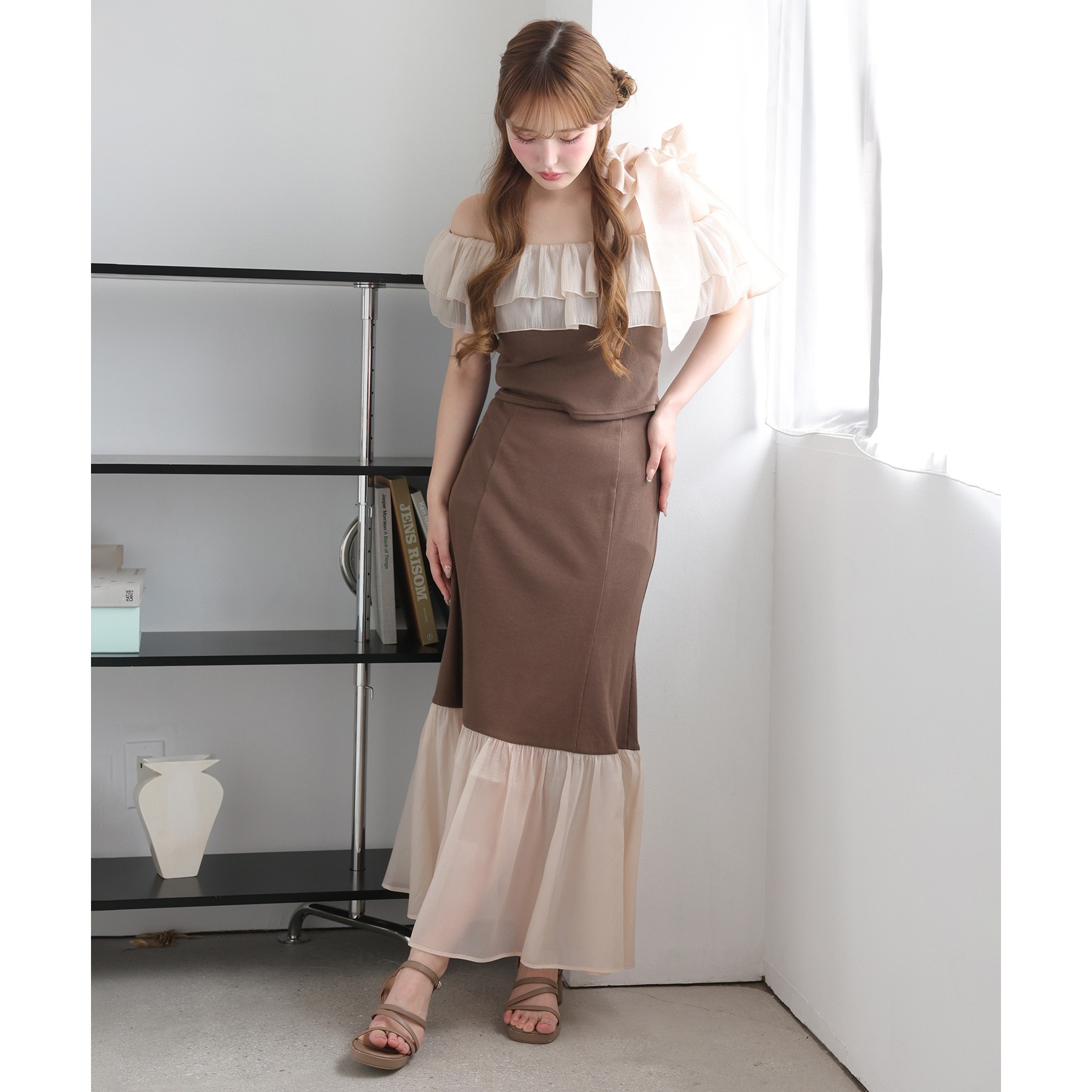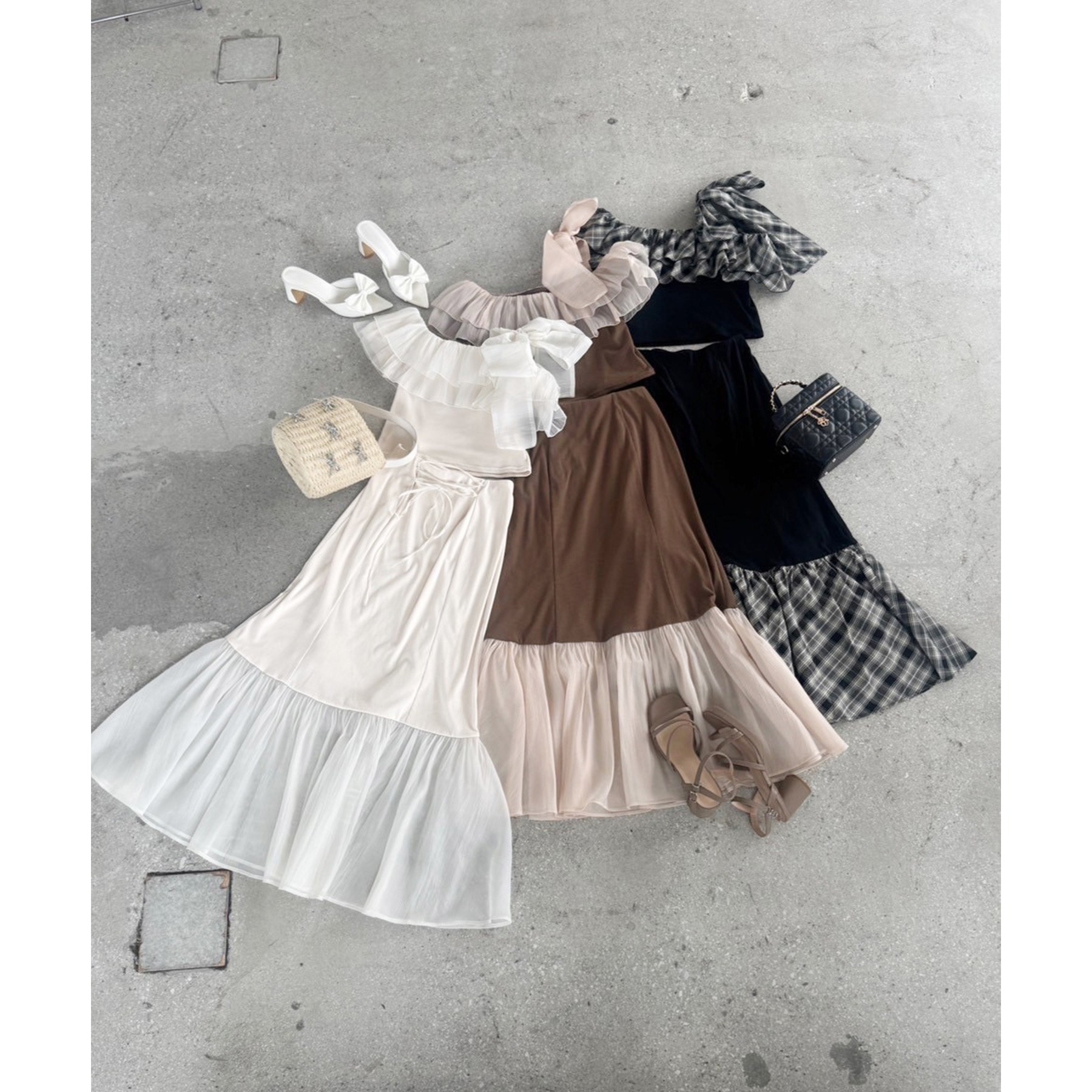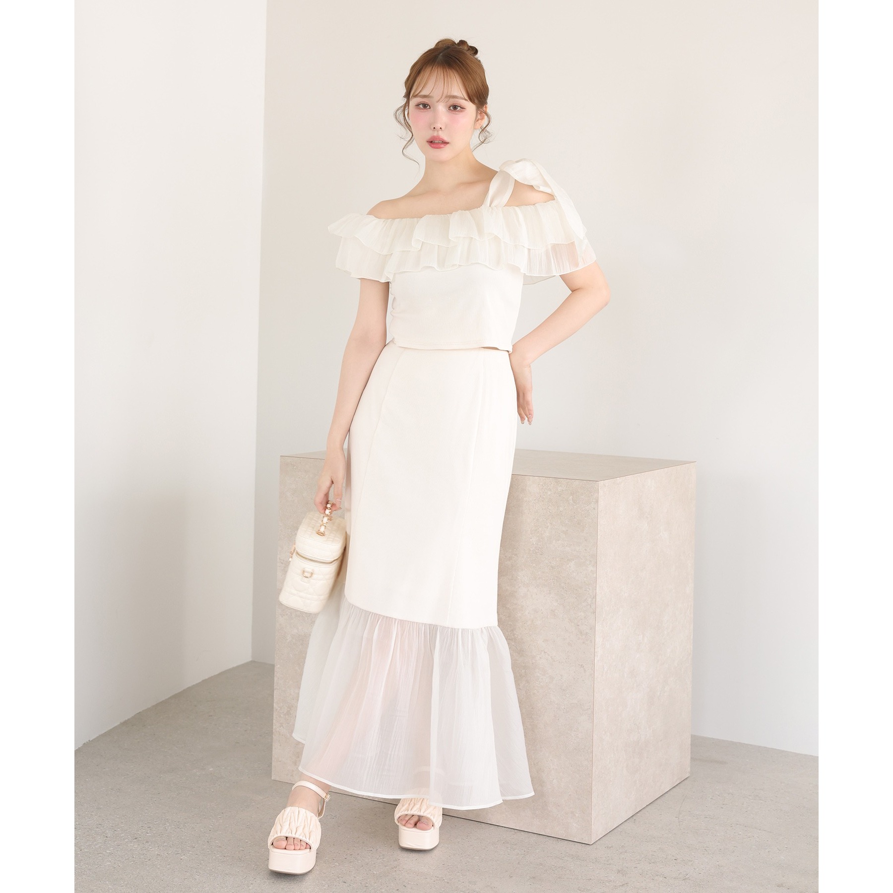ボリュームのあるティアードスカートと合わせて、ロマンティックな着こなしも♡
