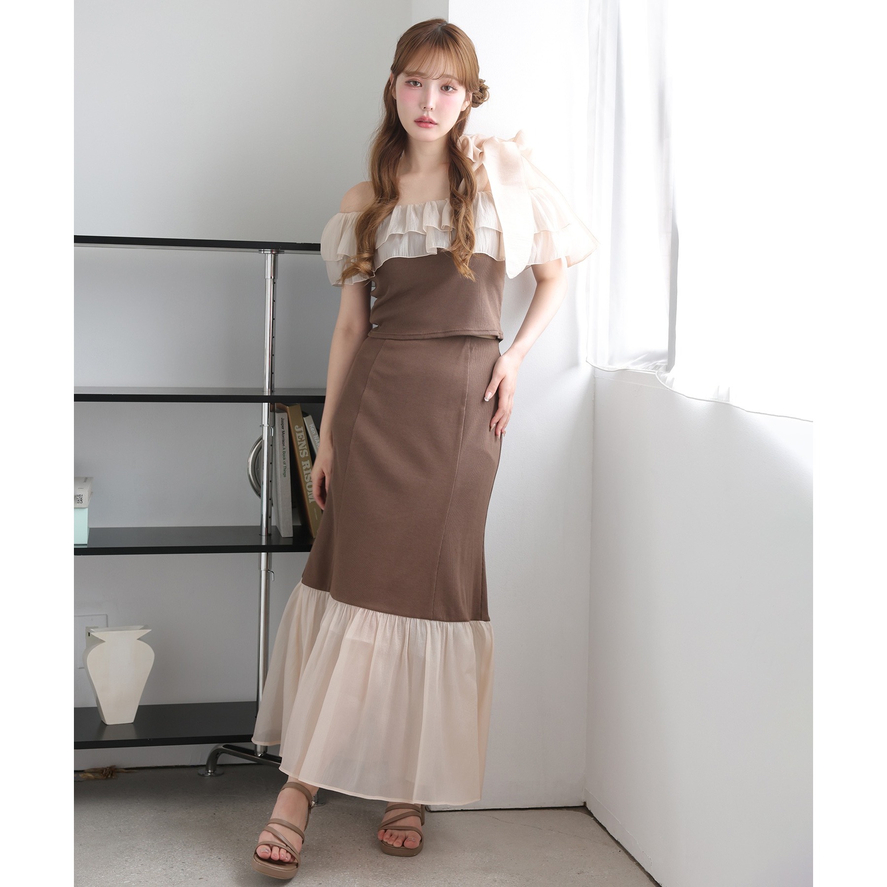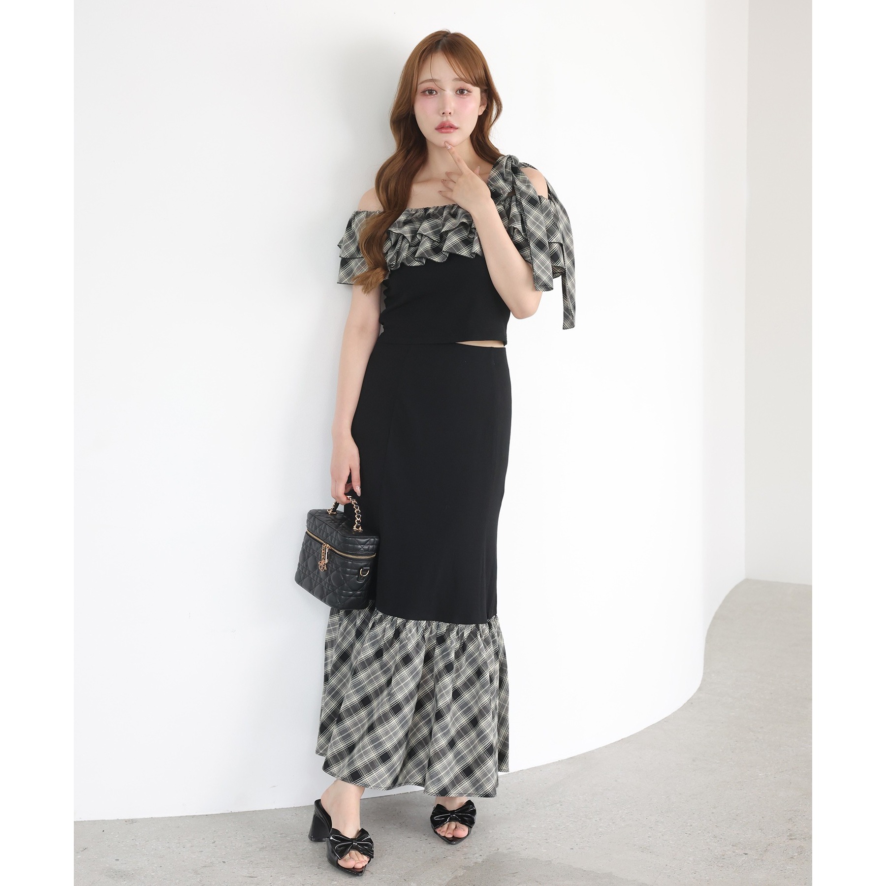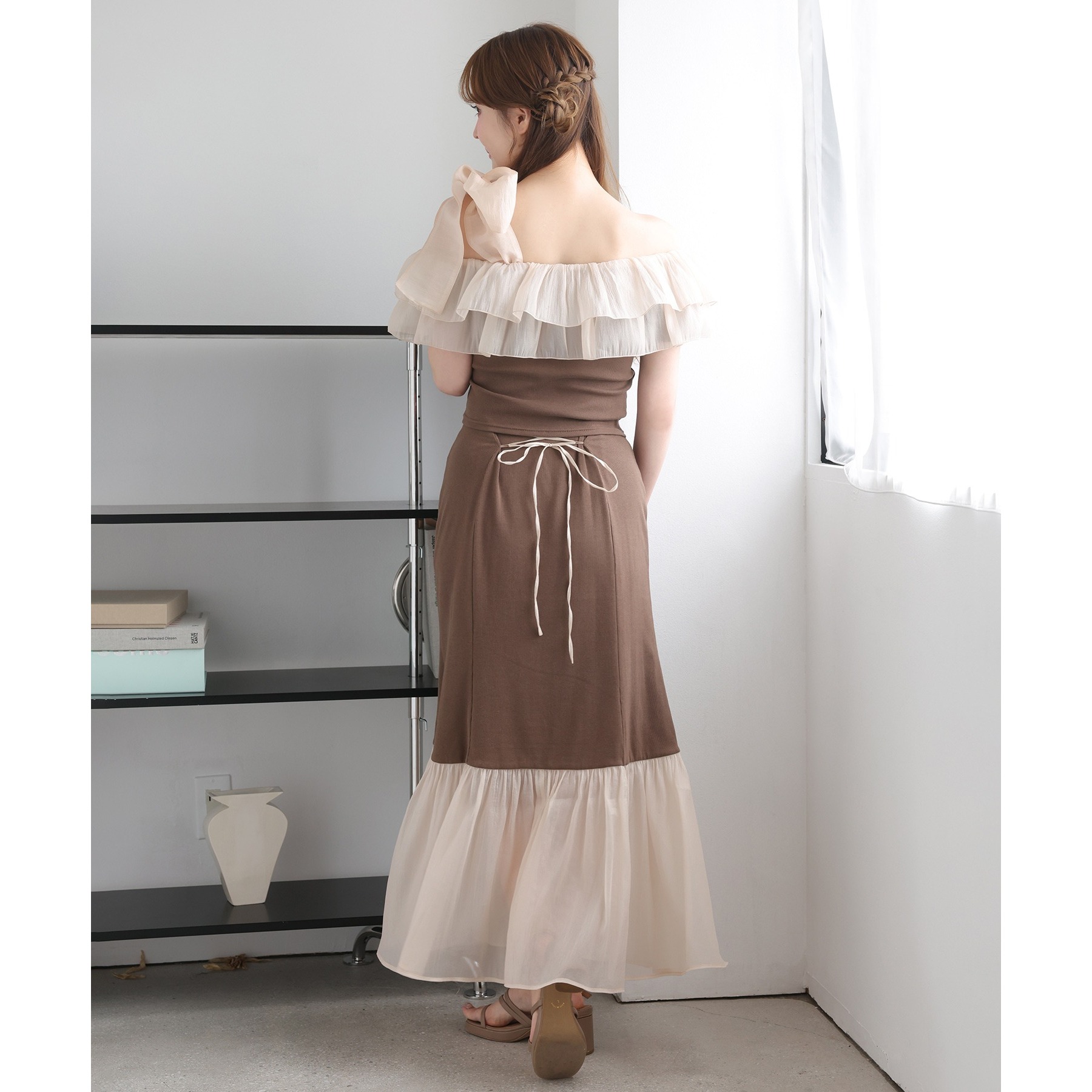 ボリュームのあるティアードスカートと合わせて、ロマンティックな着こなしも♡