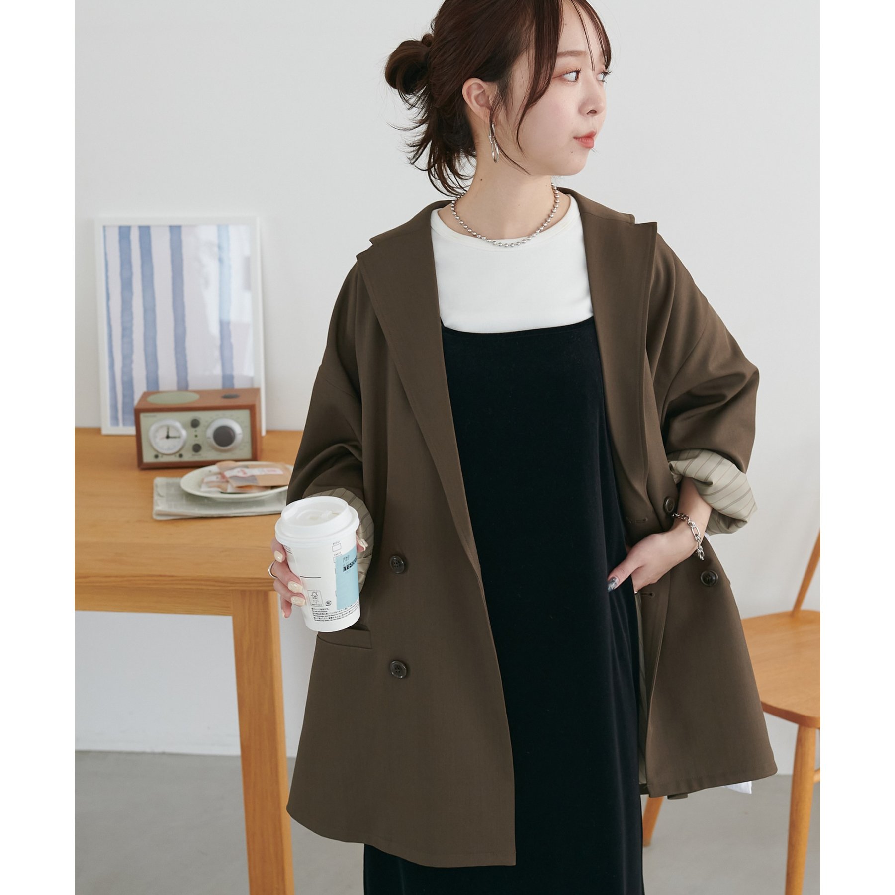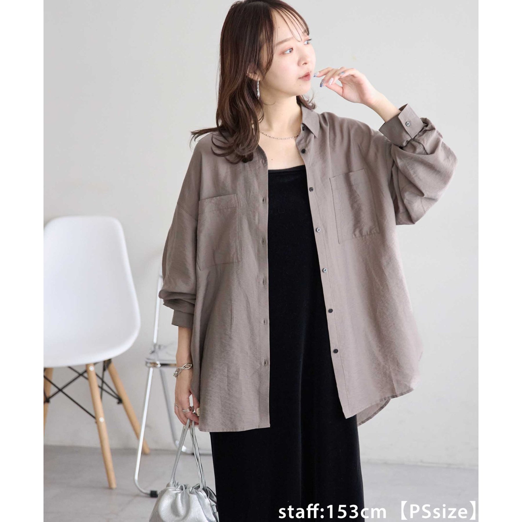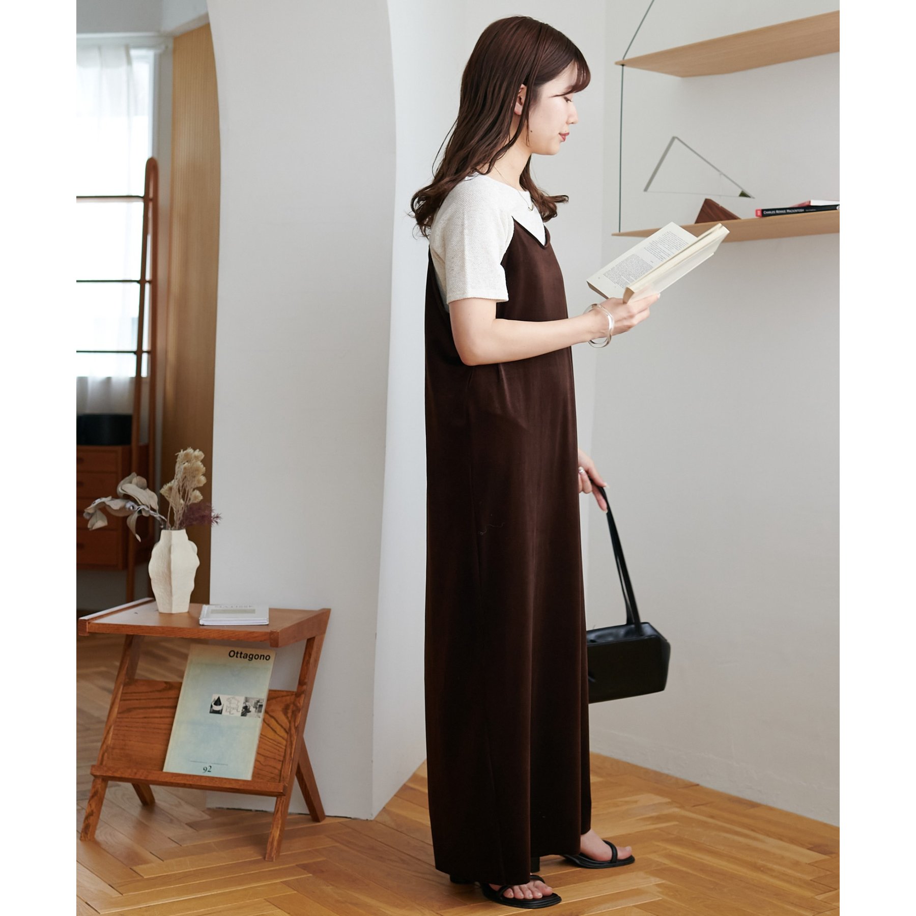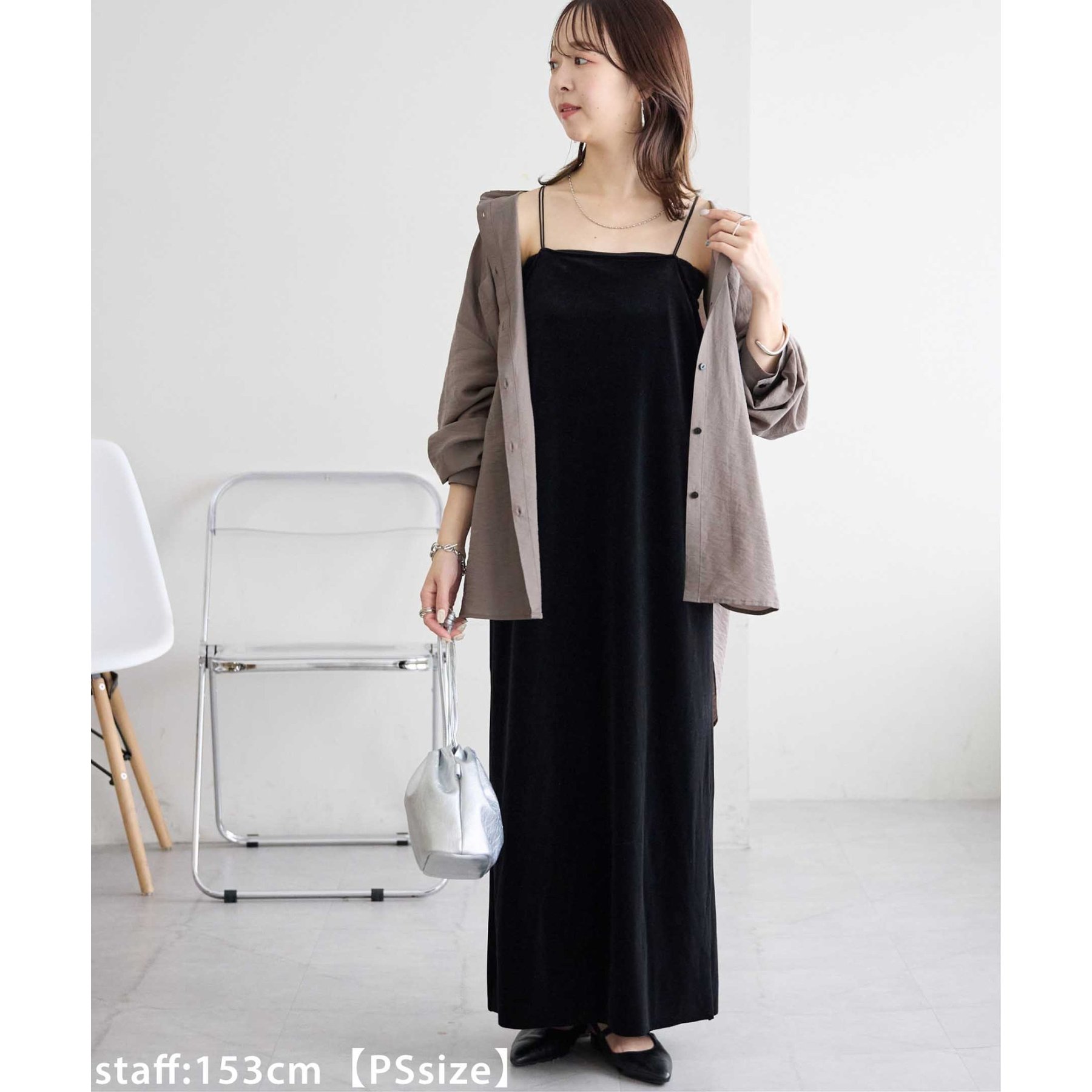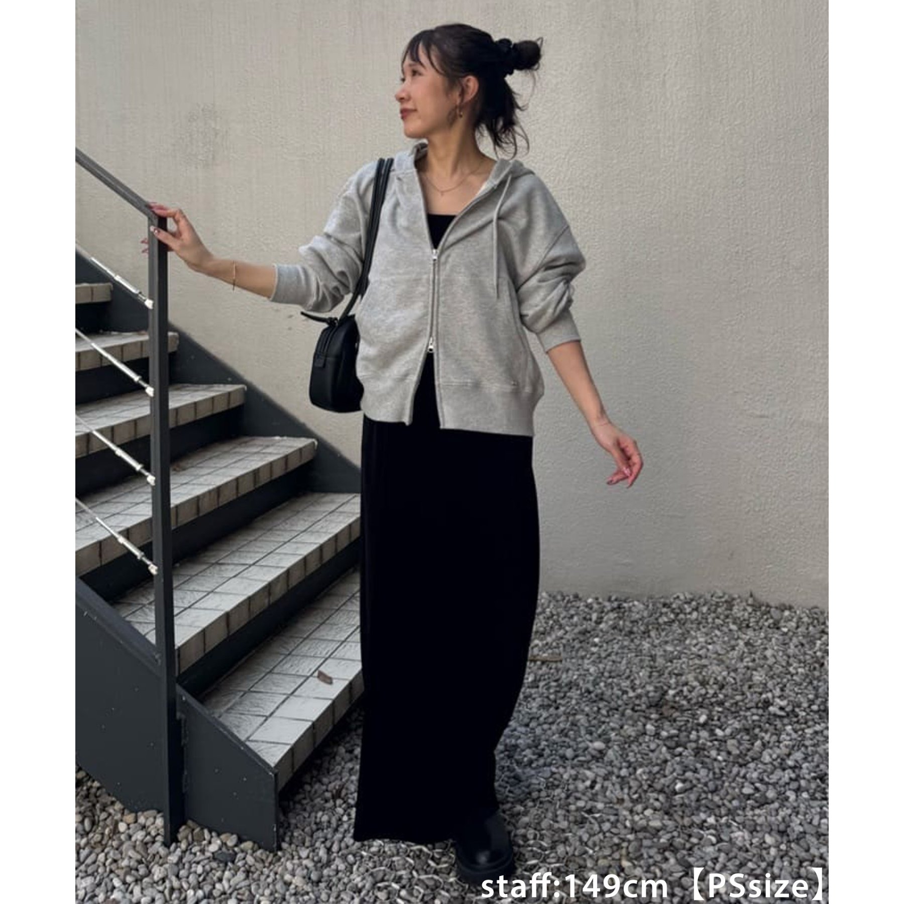 153cmスタッフ(PSサイズ着用):足元までしっかりと長さがありながら、フラットシューズでもバランスよく着られる丈感です。ストンと落ちるシルエットが縦のラインを強調してくれるので、低身長でもすっきりとした印象に。