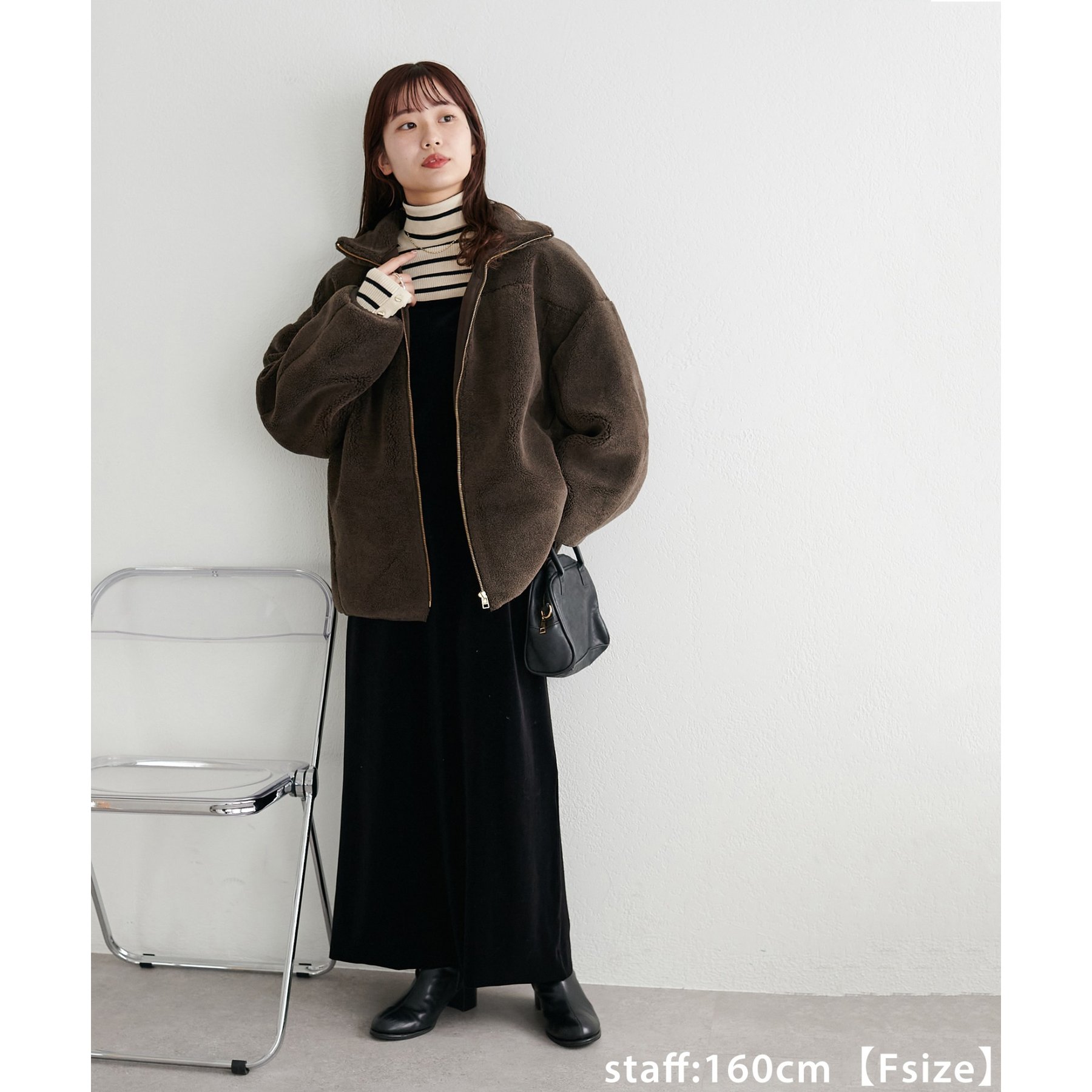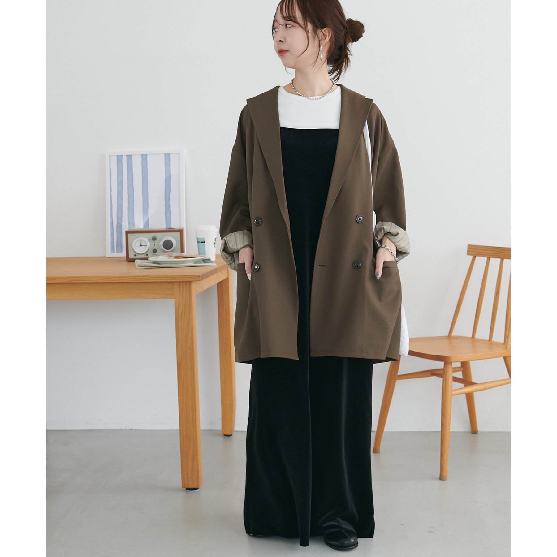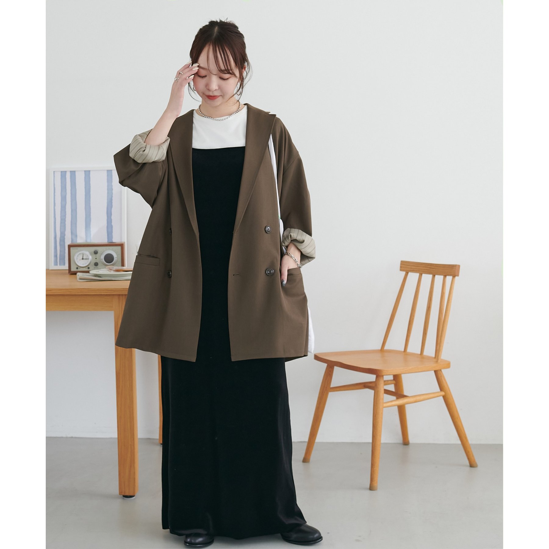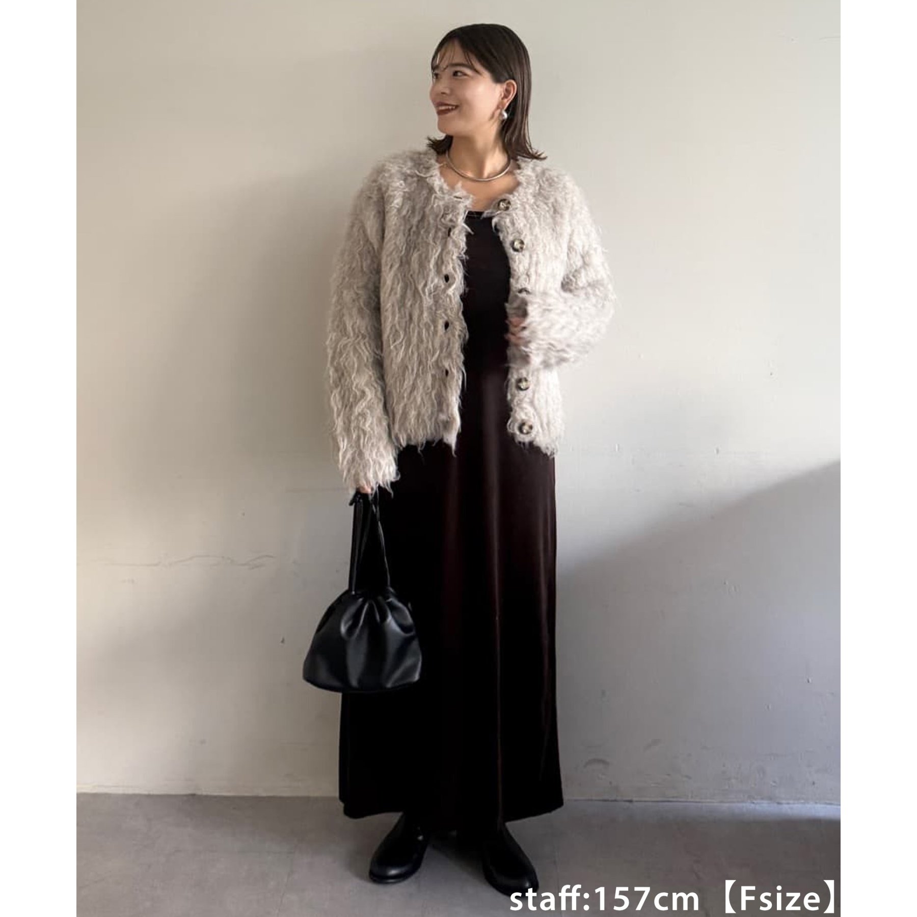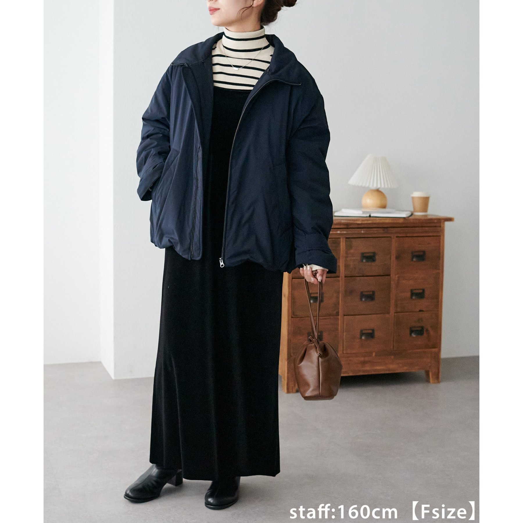 153cmスタッフ(PSサイズ着用):足元までしっかりと長さがありながら、フラットシューズでもバランスよく着られる丈感です。ストンと落ちるシルエットが縦のラインを強調してくれるので、低身長でもすっきりとした印象に。