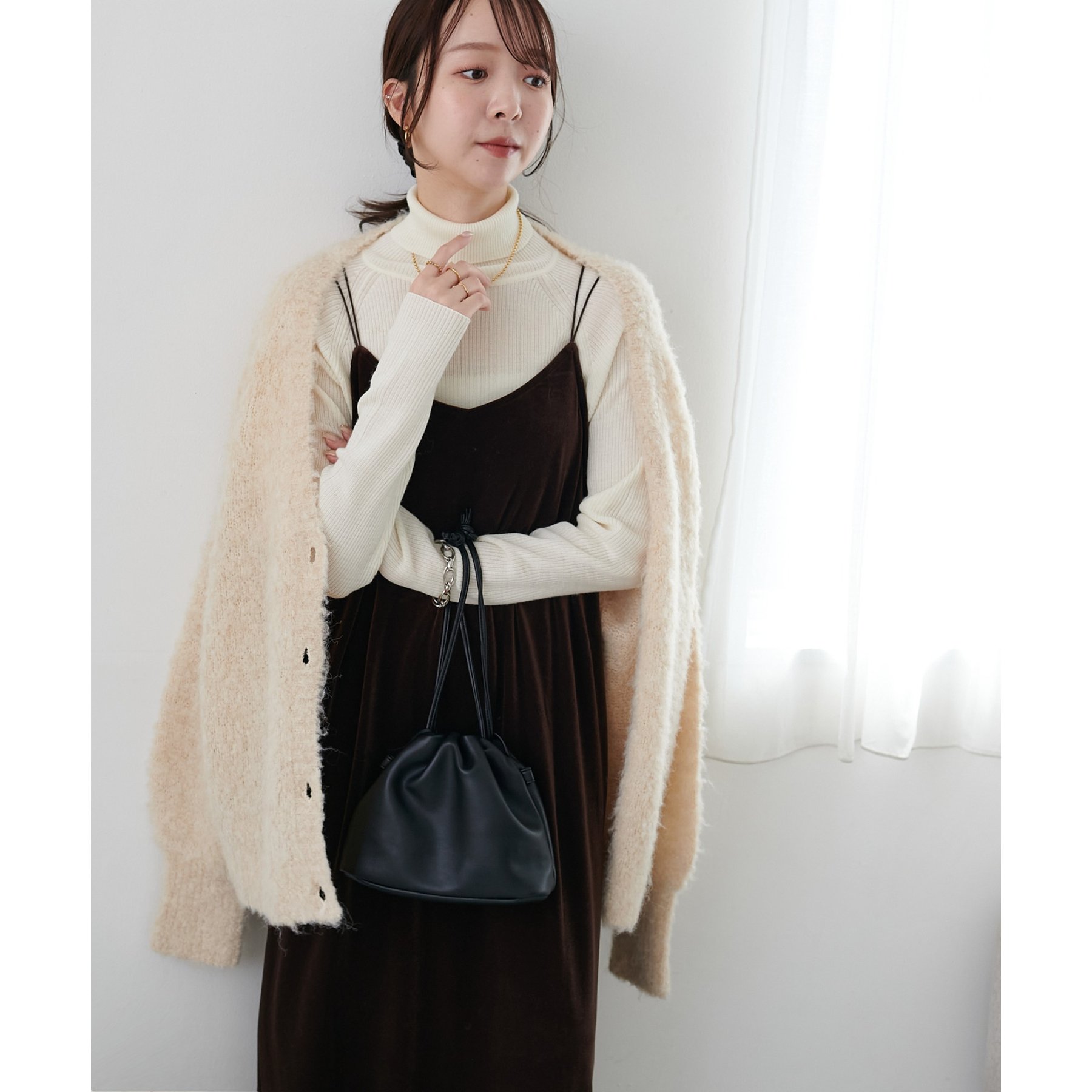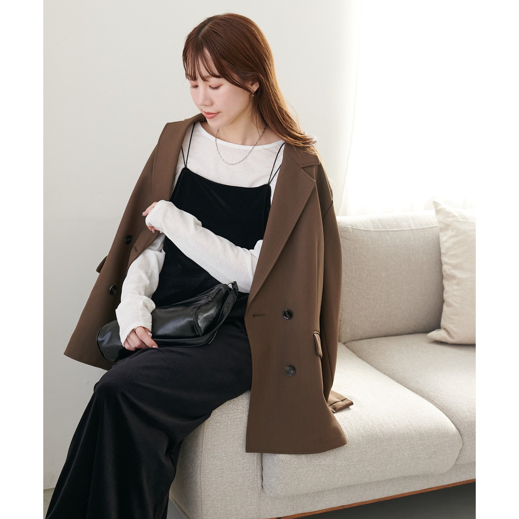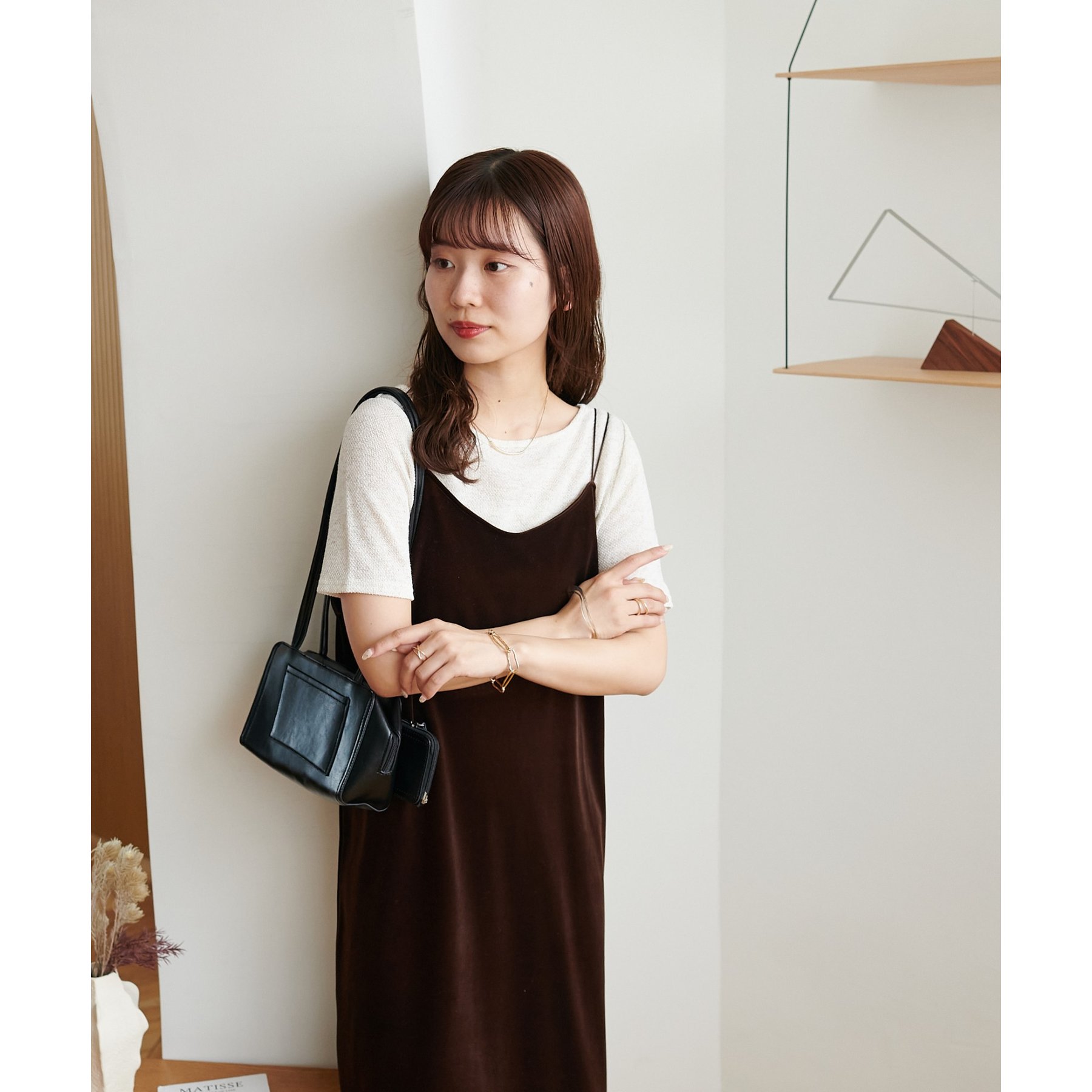 162cmスタッフ(Fサイズ着用):二重の肩紐がさりげないアクセントに!上品な光沢感があり、シンプルなインナーを合わせるだけでも品良くまとまります。