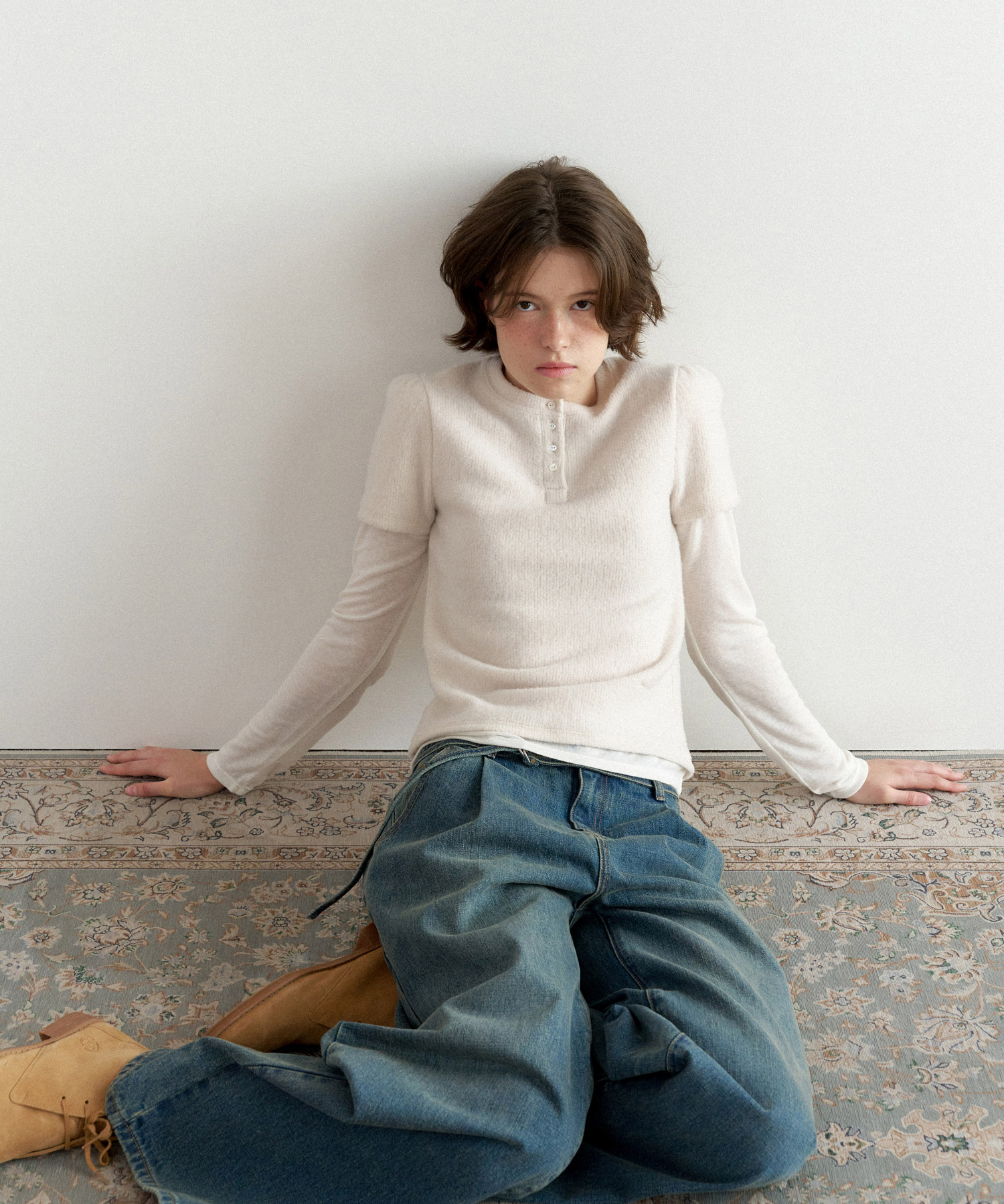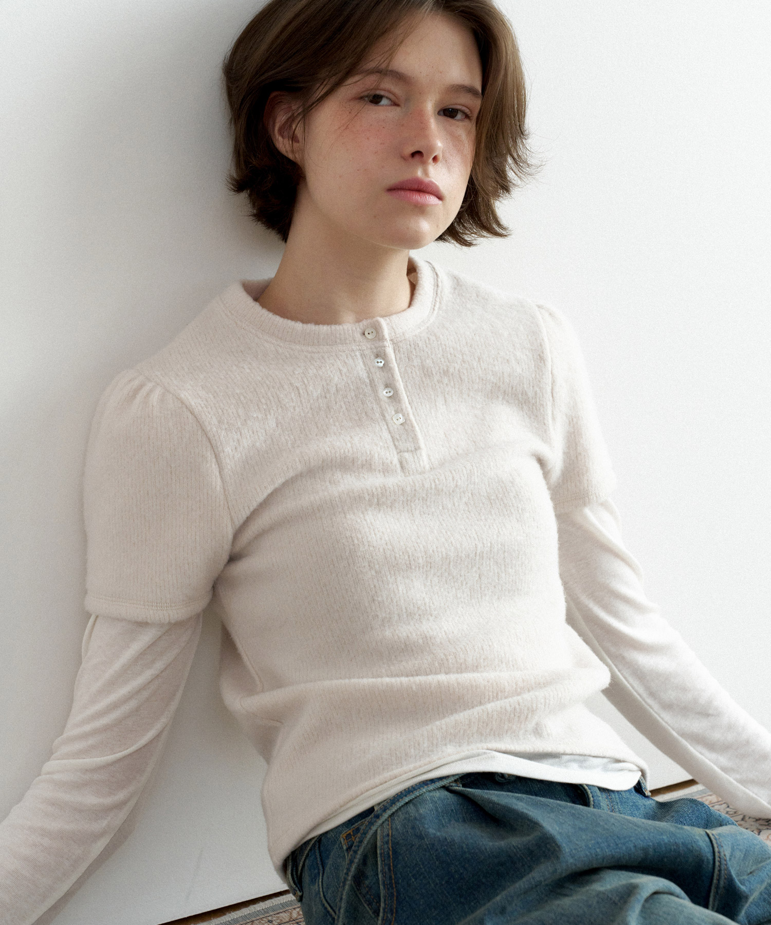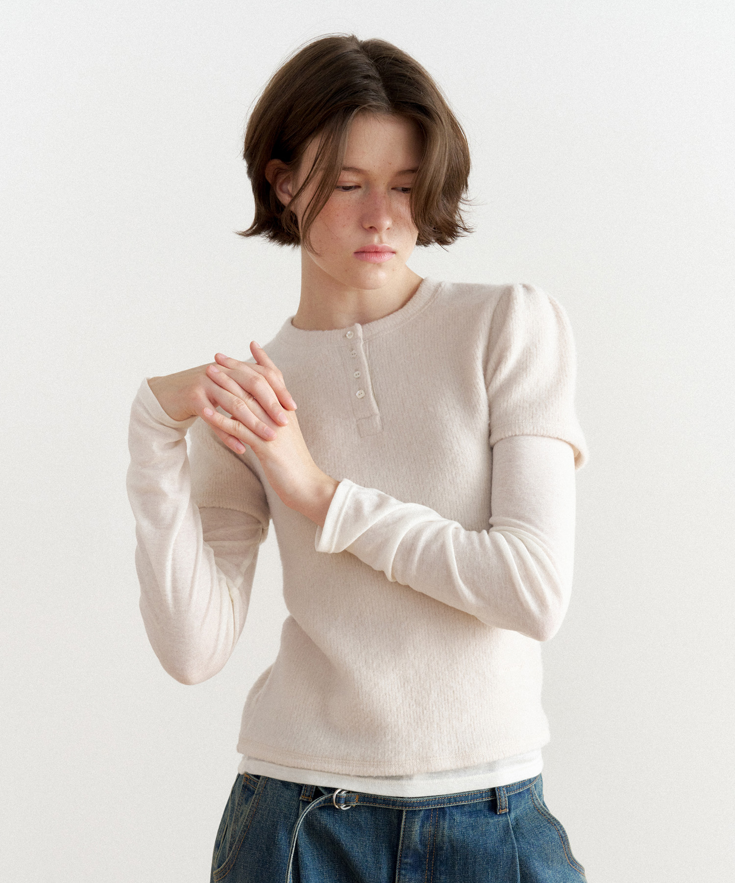 - ショルダーパフとヘンリーネックディテール
