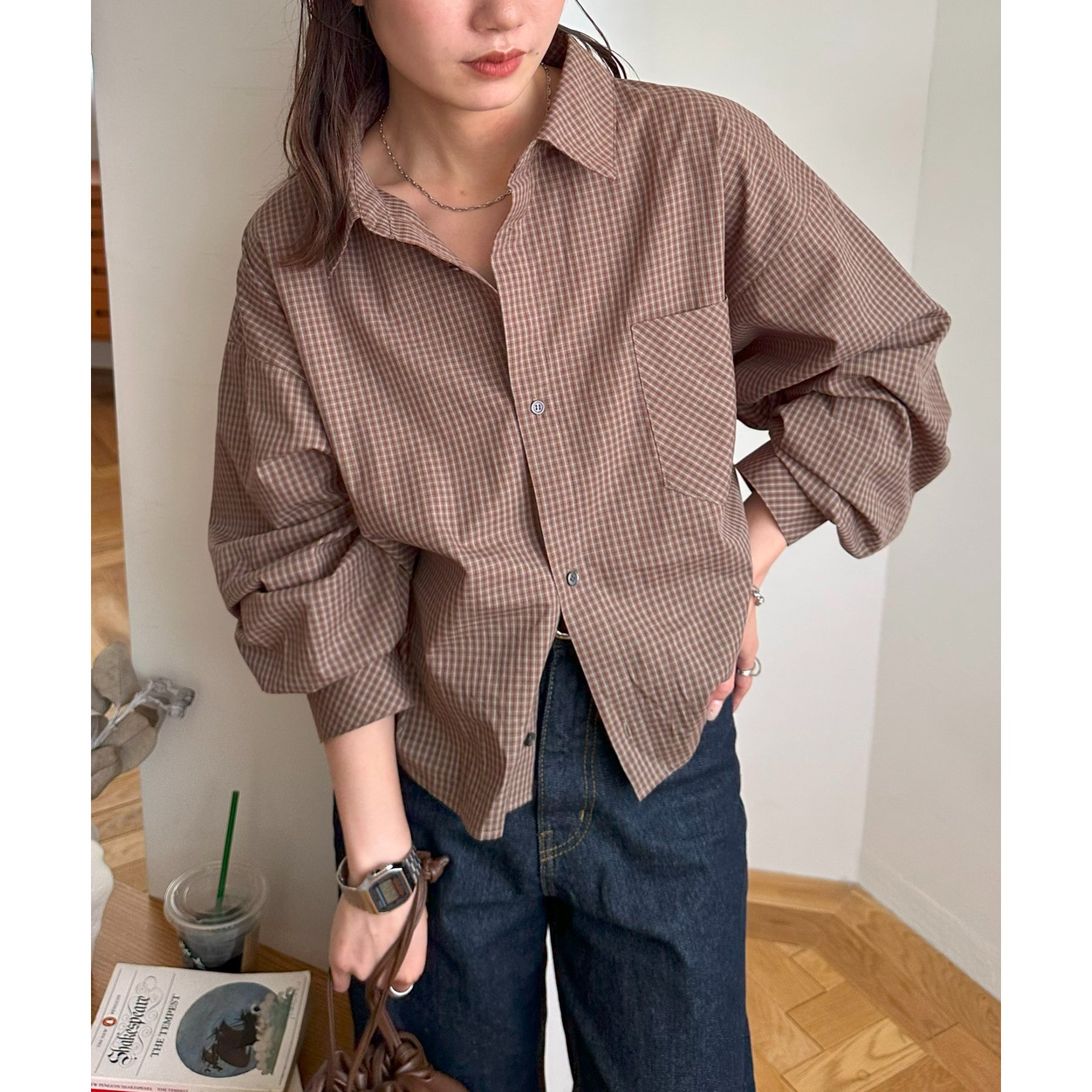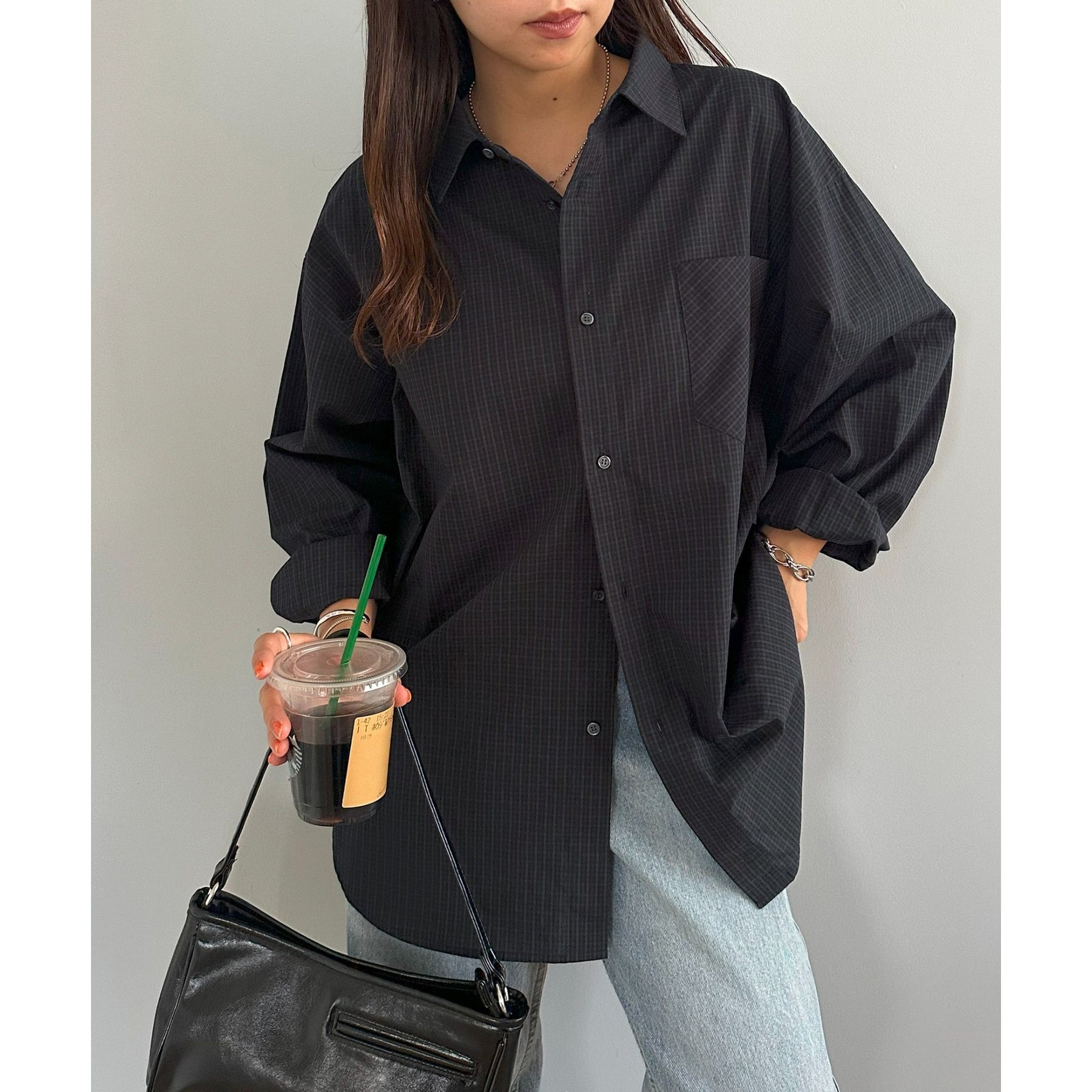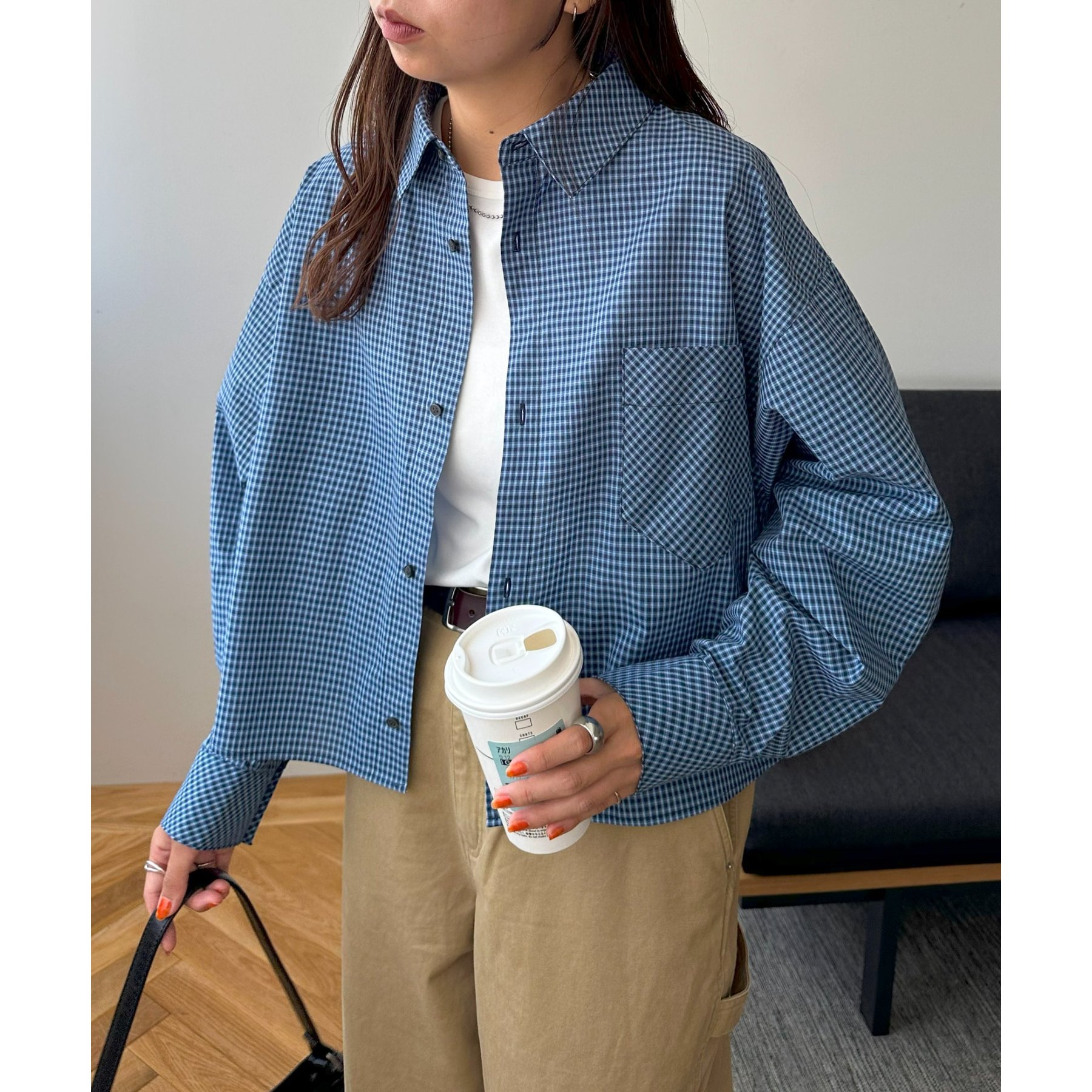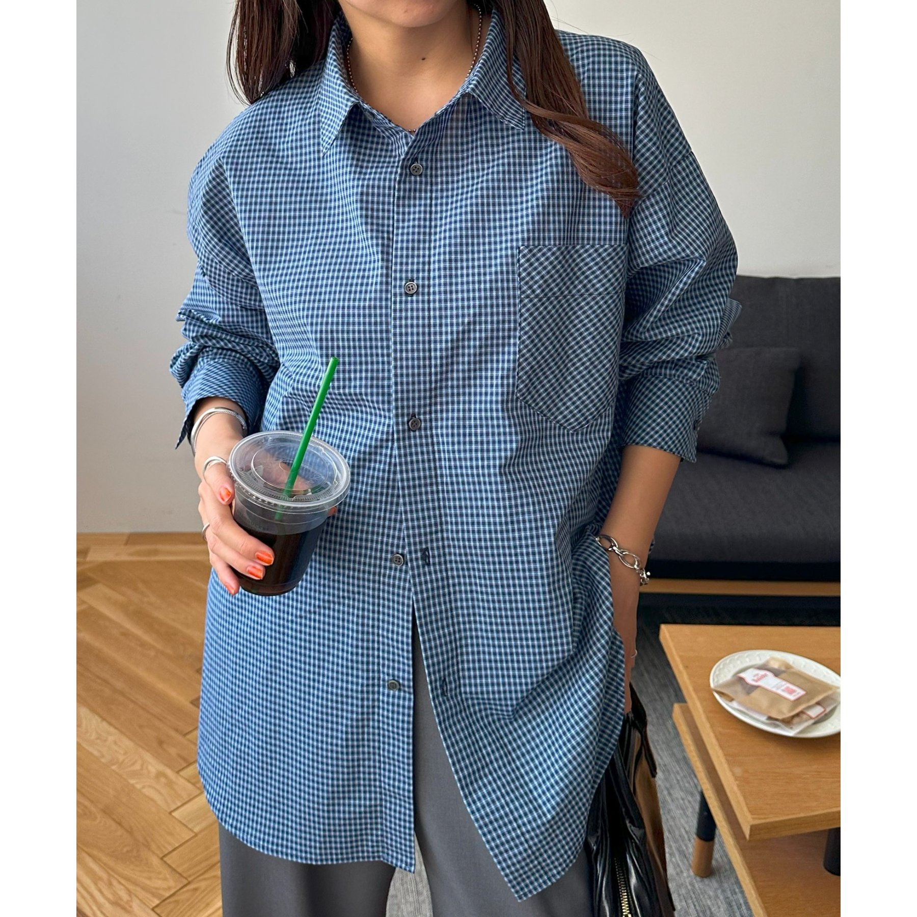 157cmレディーススタッフ(Sサイズ着用):チェック柄でも落ち着いた配色なので、大人っぽく着こなせます。ボタンを何個か開けて着ると、抜け感がプラスされます!