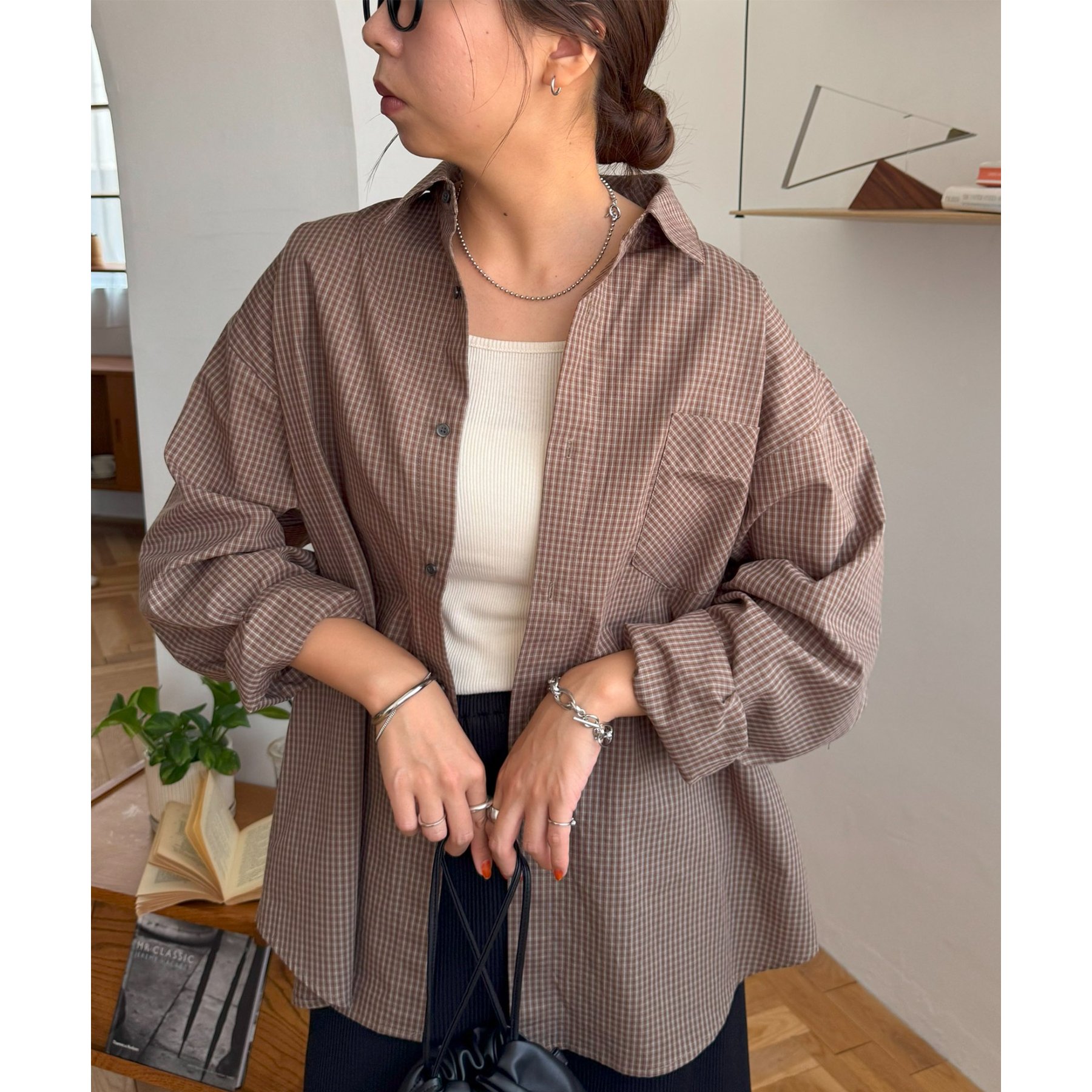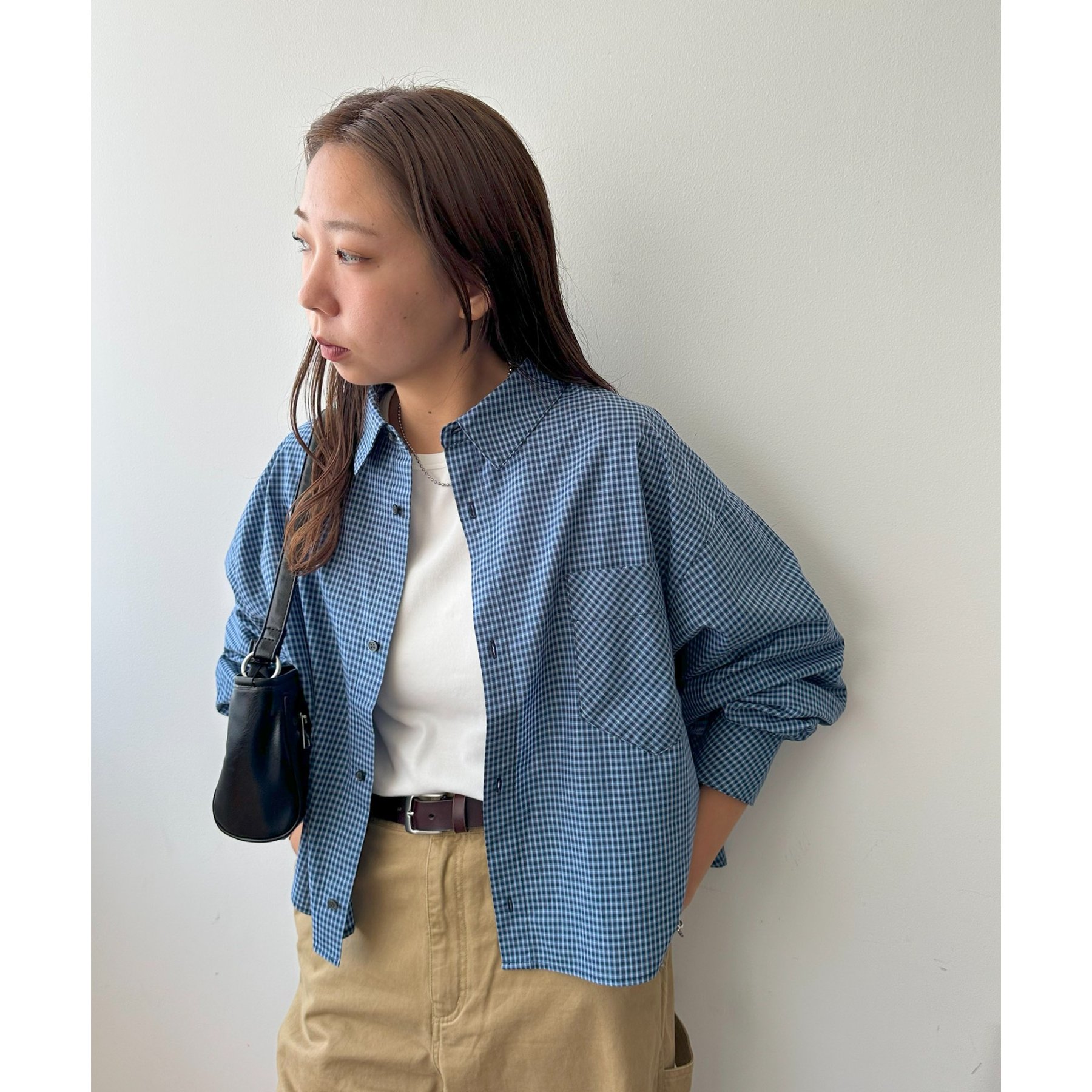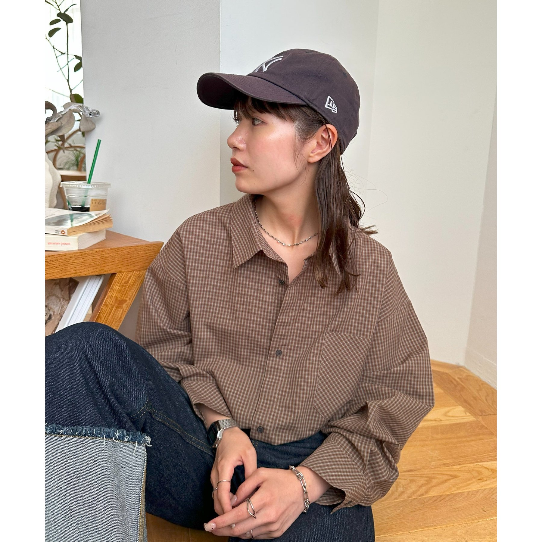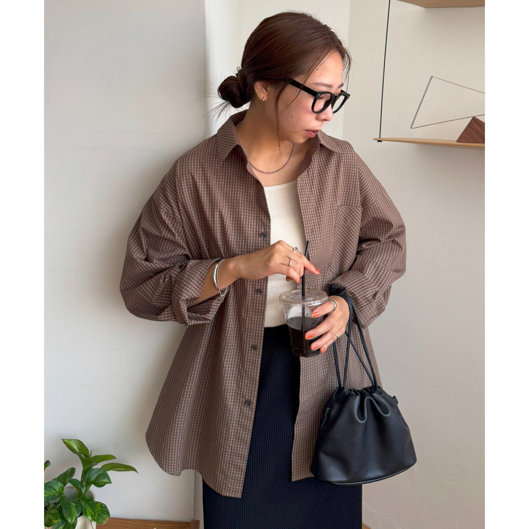 157cmレディーススタッフ(Sサイズ着用):チェック柄でも落ち着いた配色なので、大人っぽく着こなせます。ボタンを何個か開けて着ると、抜け感がプラスされます!