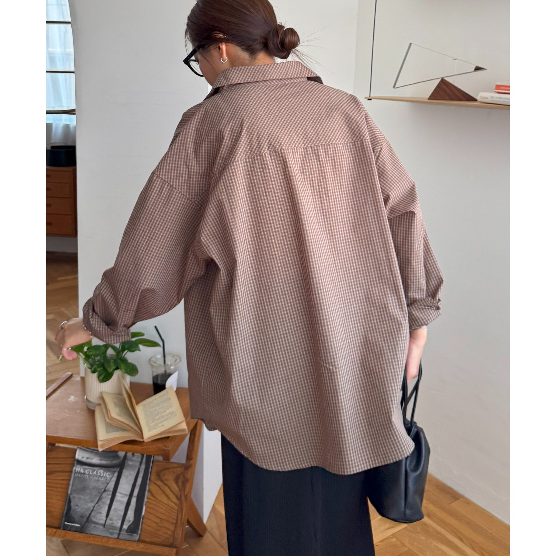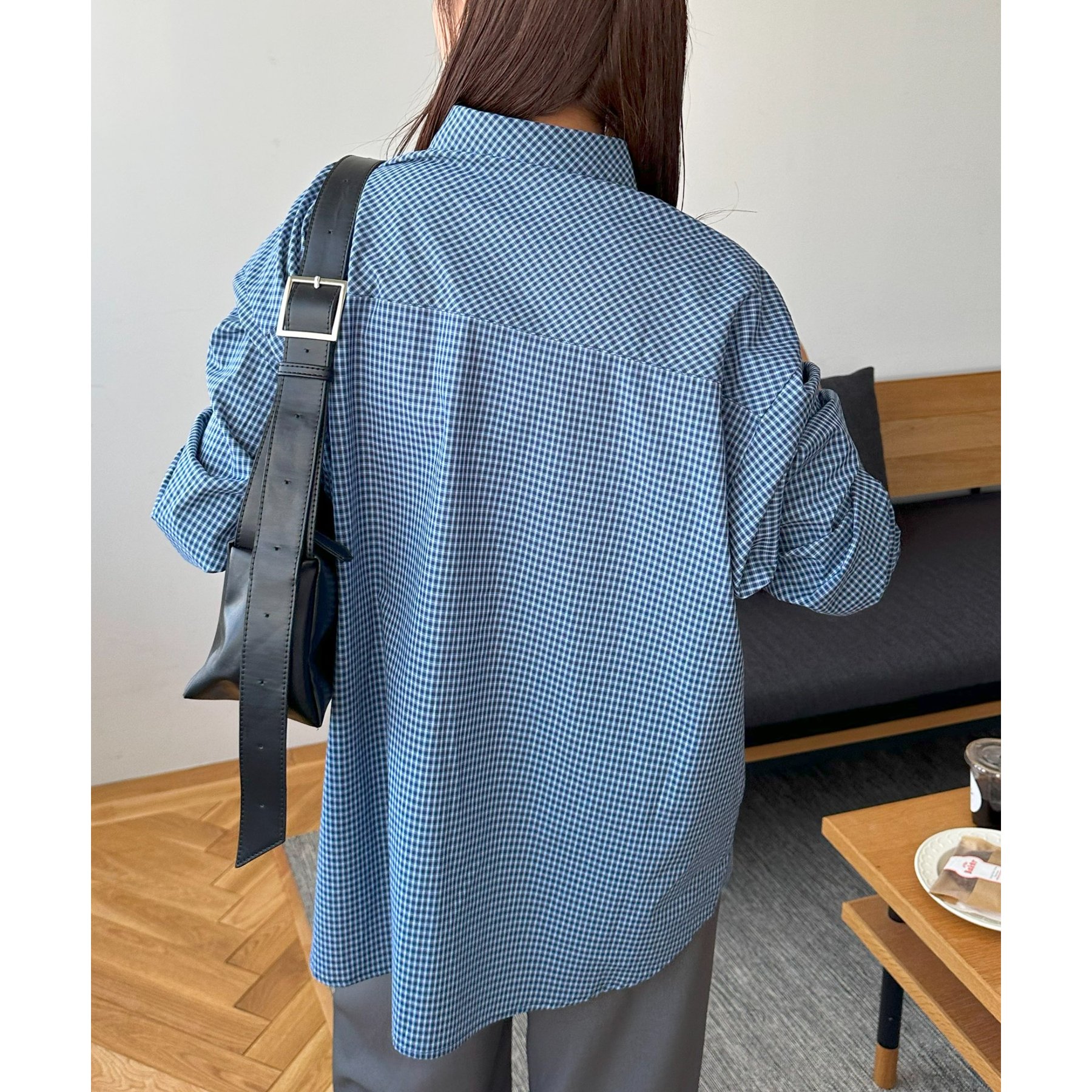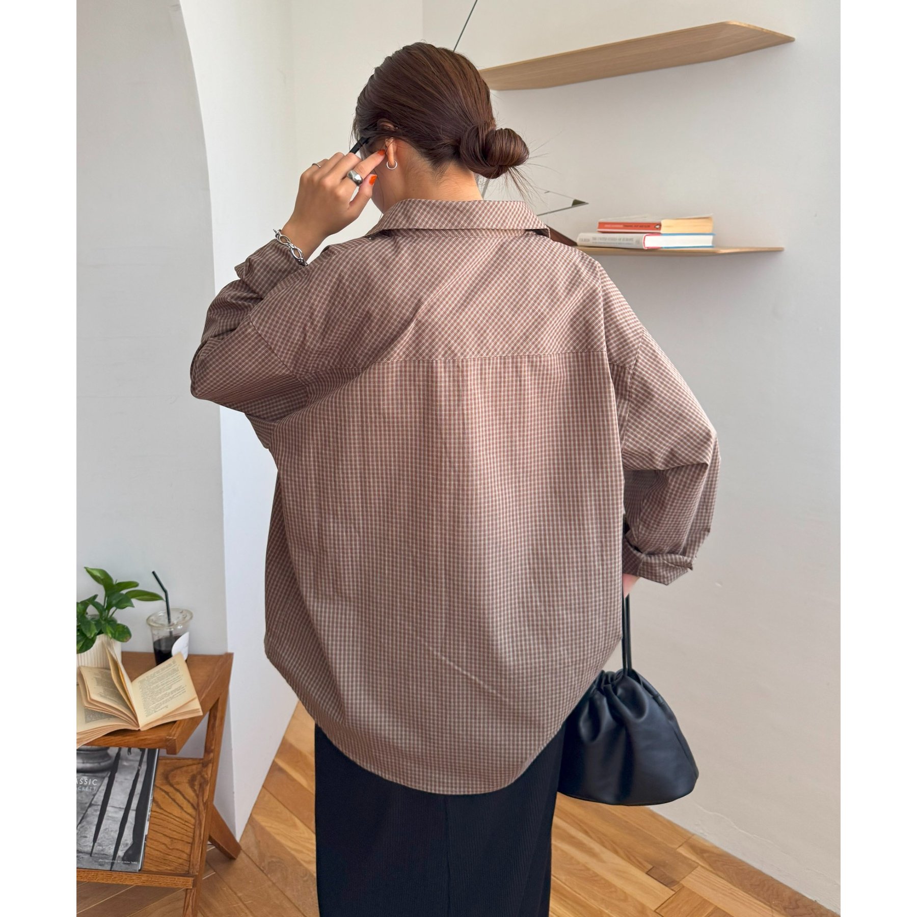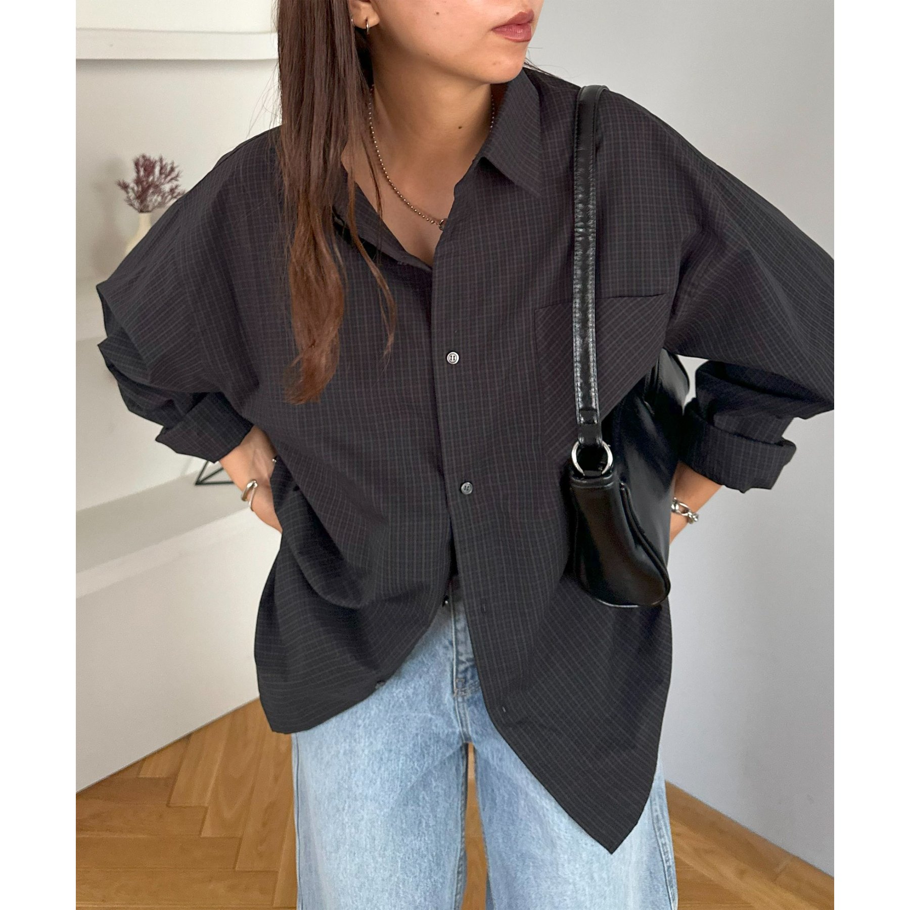 157cmレディーススタッフ(Sサイズ着用):チェック柄でも落ち着いた配色なので、大人っぽく着こなせます。ボタンを何個か開けて着ると、抜け感がプラスされます!