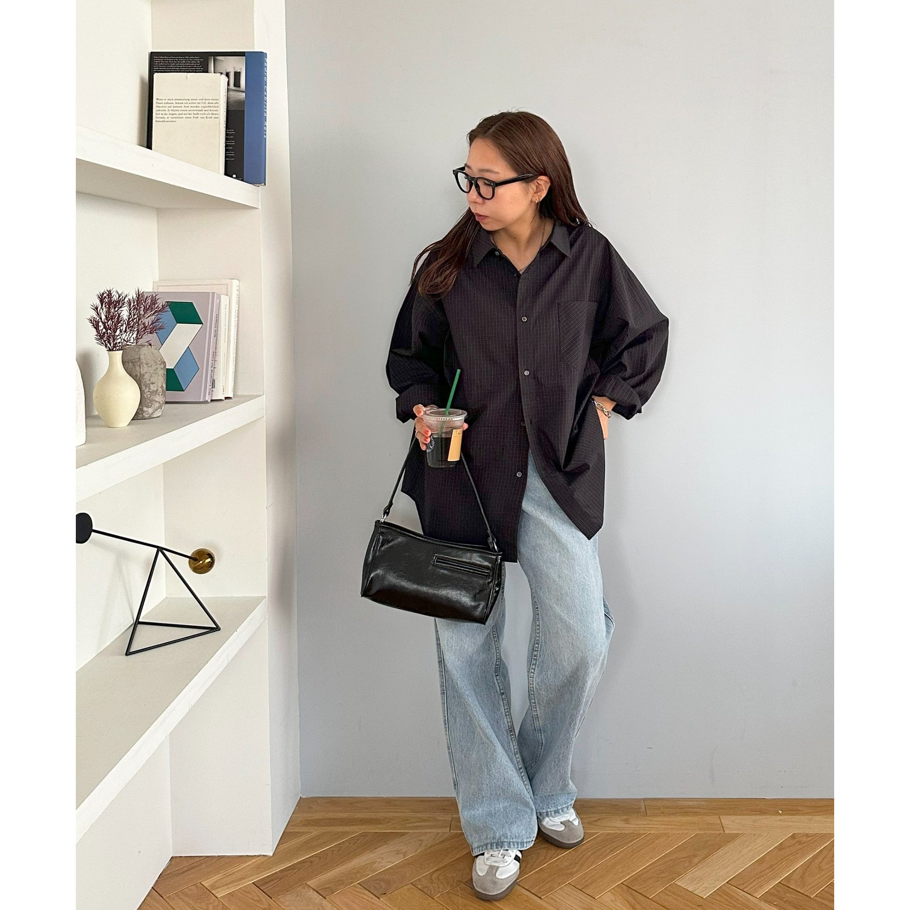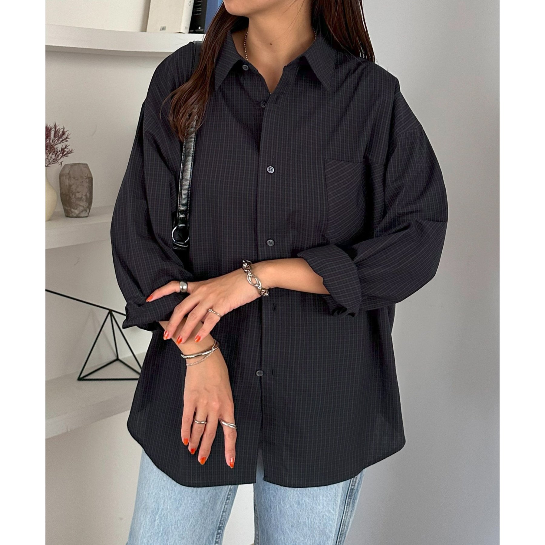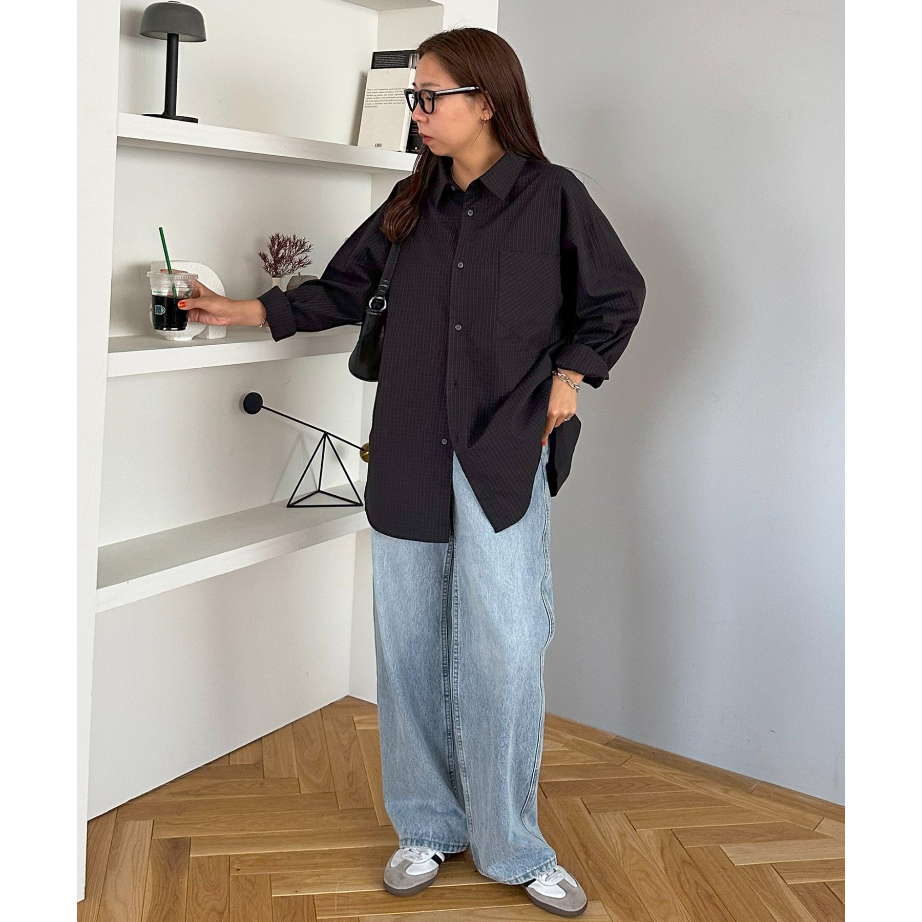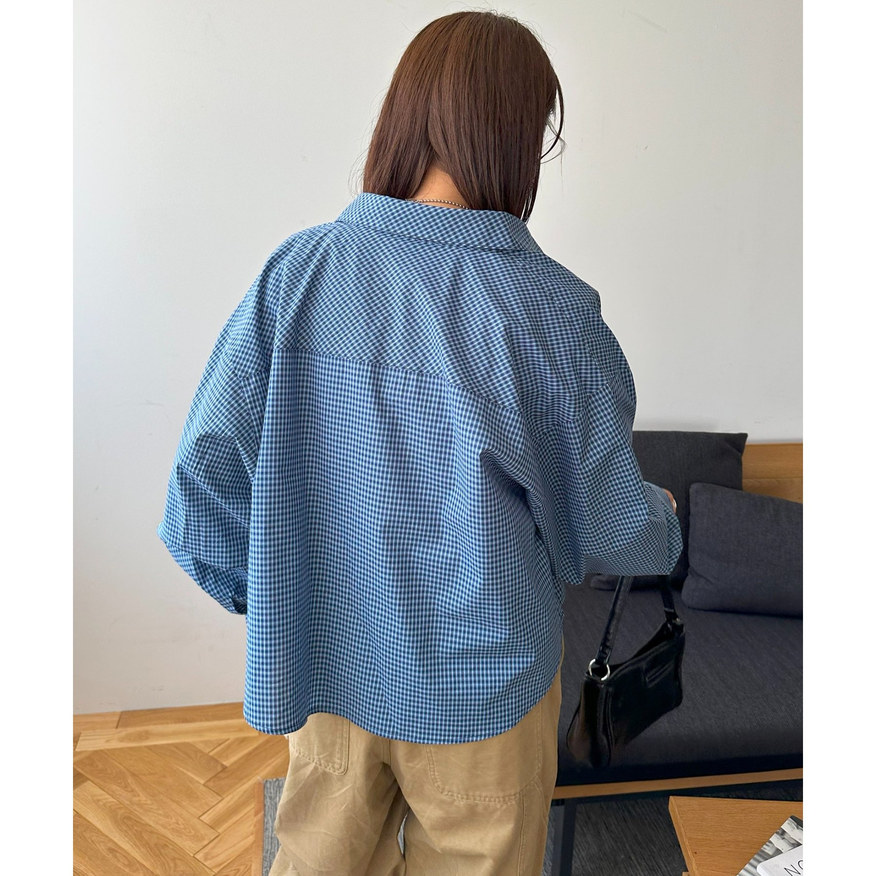 157cmレディーススタッフ(Sサイズ着用):チェック柄でも落ち着いた配色なので、大人っぽく着こなせます。ボタンを何個か開けて着ると、抜け感がプラスされます!